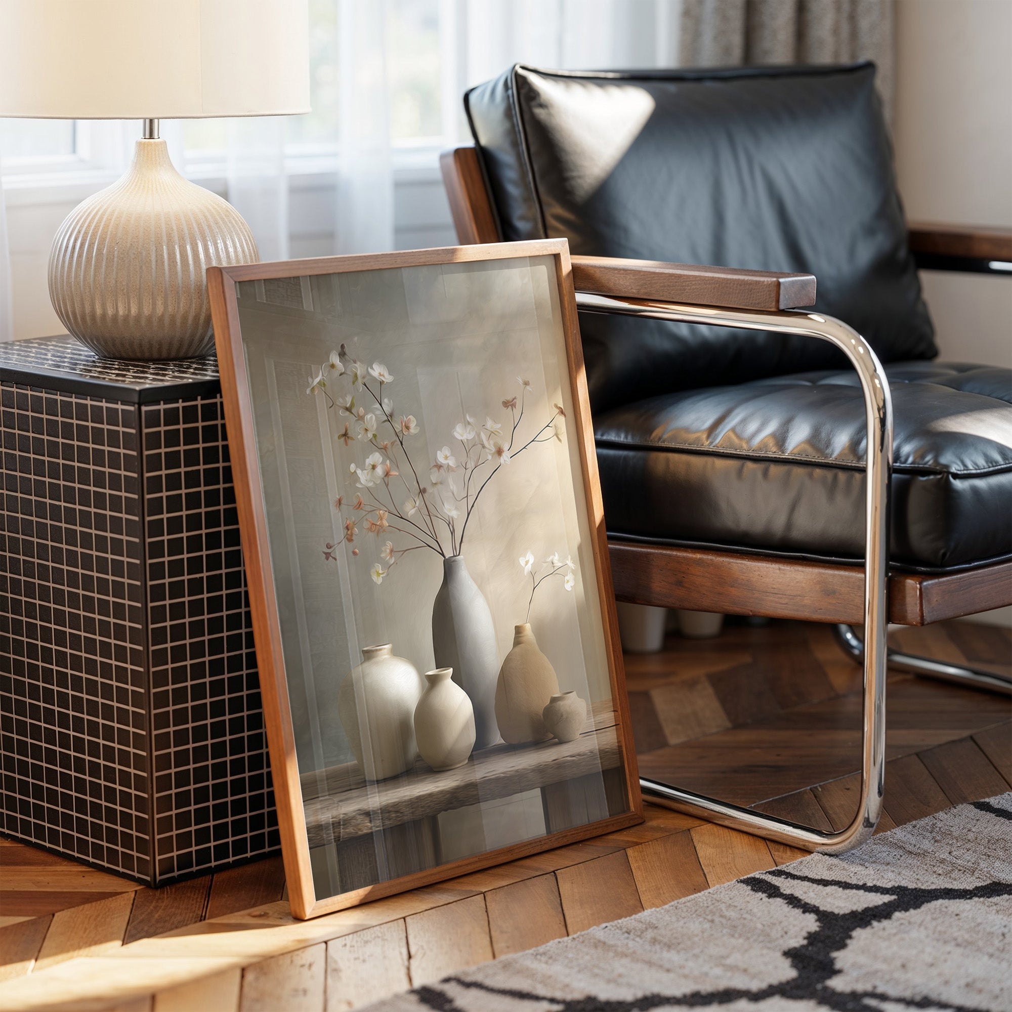 Soft morning light filters through sheer curtains, illuminating a serene vignette of cream-colored vessels and ethereal white blossoms. The composition balances organic florals against clean ceramic forms, creating a dialogue between nature and modern design. A sophisticated leather chair and geometric side table frame the scene, grounding the ethereal arrangement in contemporary living. This piece would elevate any modern living space, particularly suited for a minimalist home office or sophisticated reading nook where its quiet elegance can be fully appreciated.
