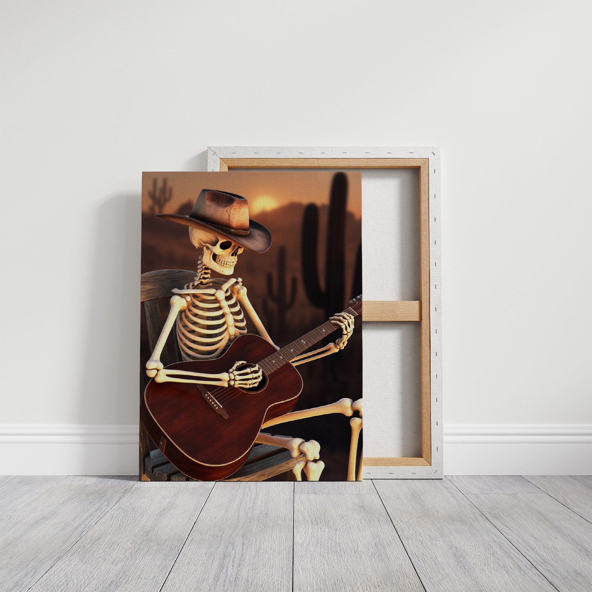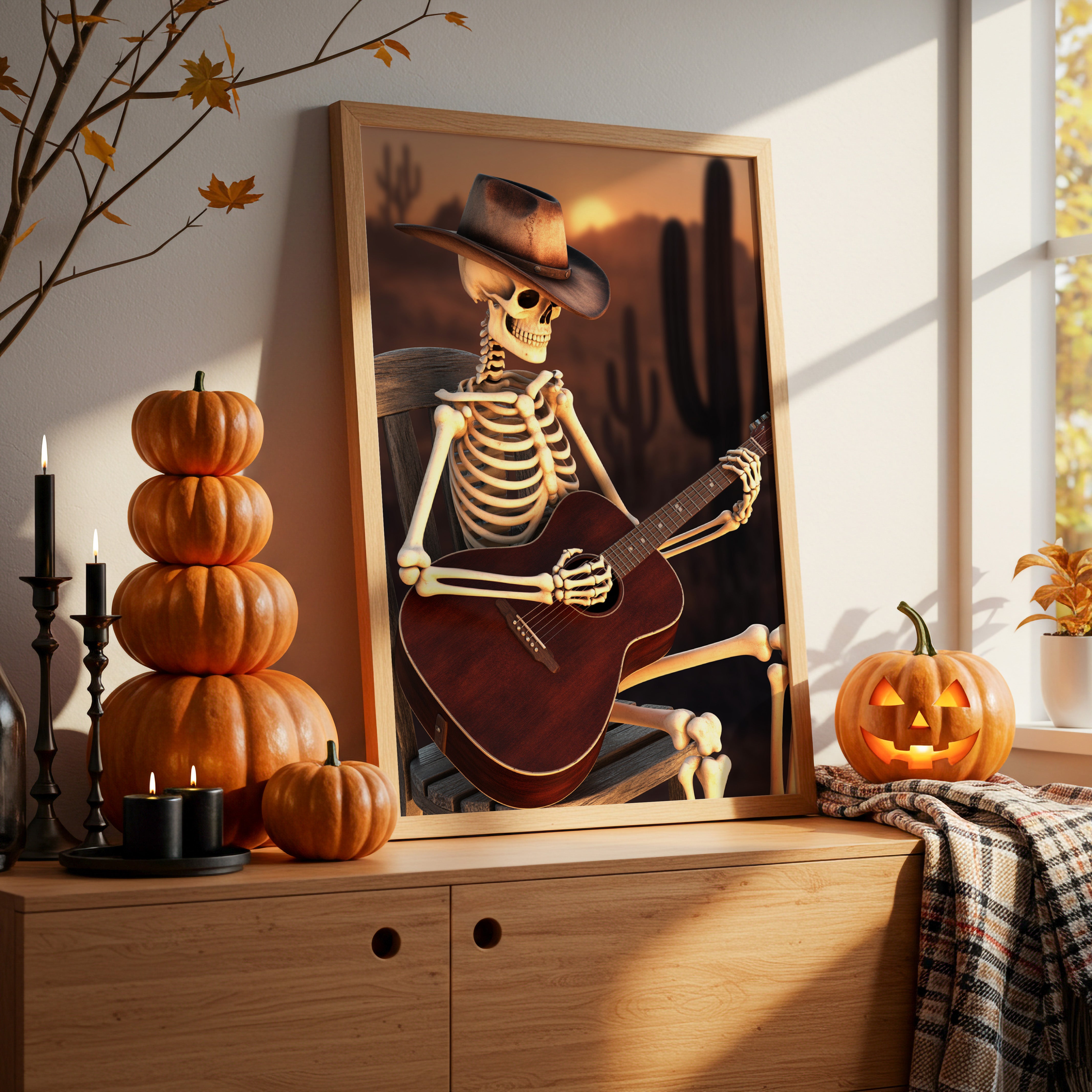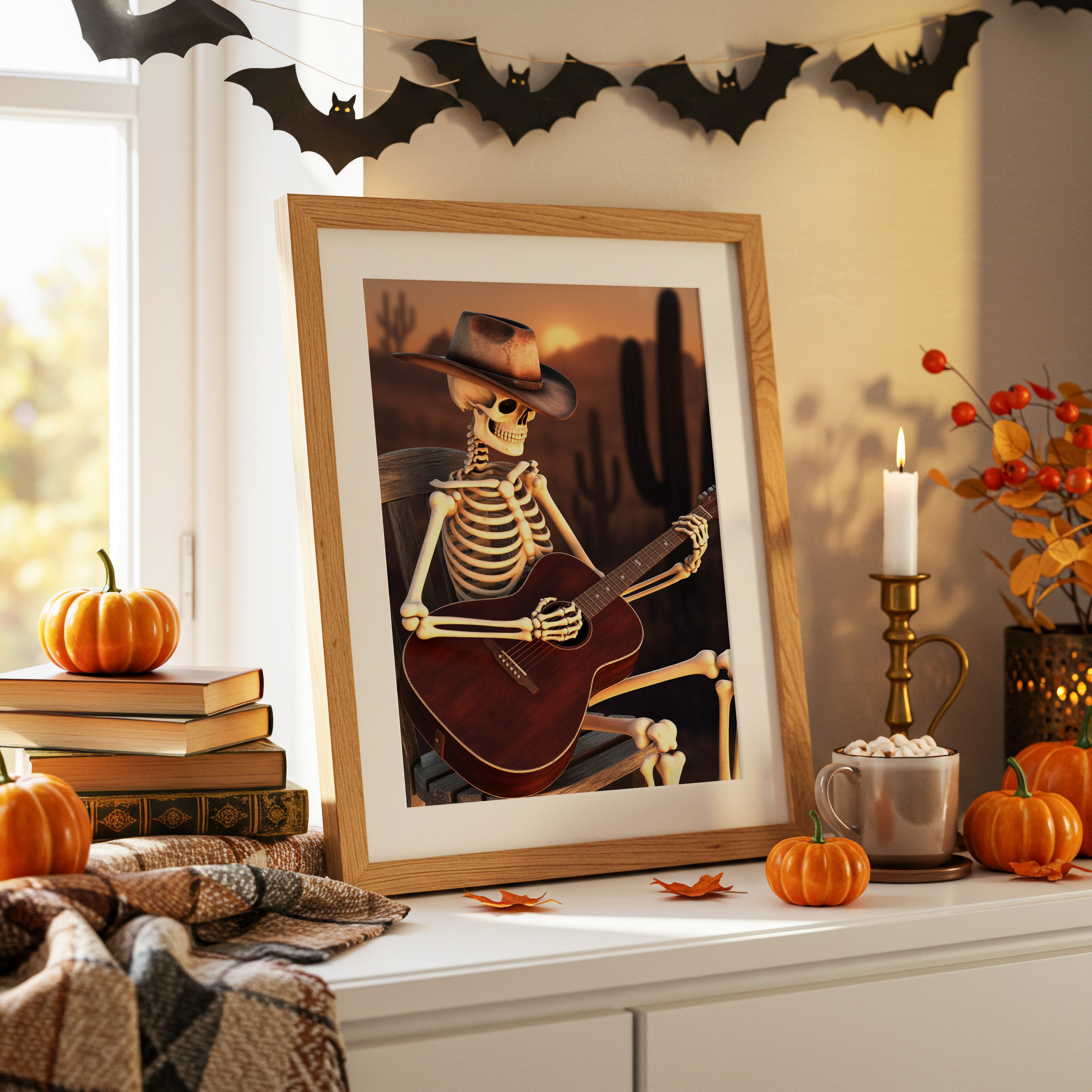 Twilight bathes the desert in amber glow as a weathered skeleton strums chords that float across the sand. The contrast between the warm mahogany guitar and bleached bones tells a story of music that outlasts flesh, with saguaro cacti standing sentinel against the setting sun. This haunting scene captures the eternal spirit of western folklore, where melodies continue long after their creators have passed.