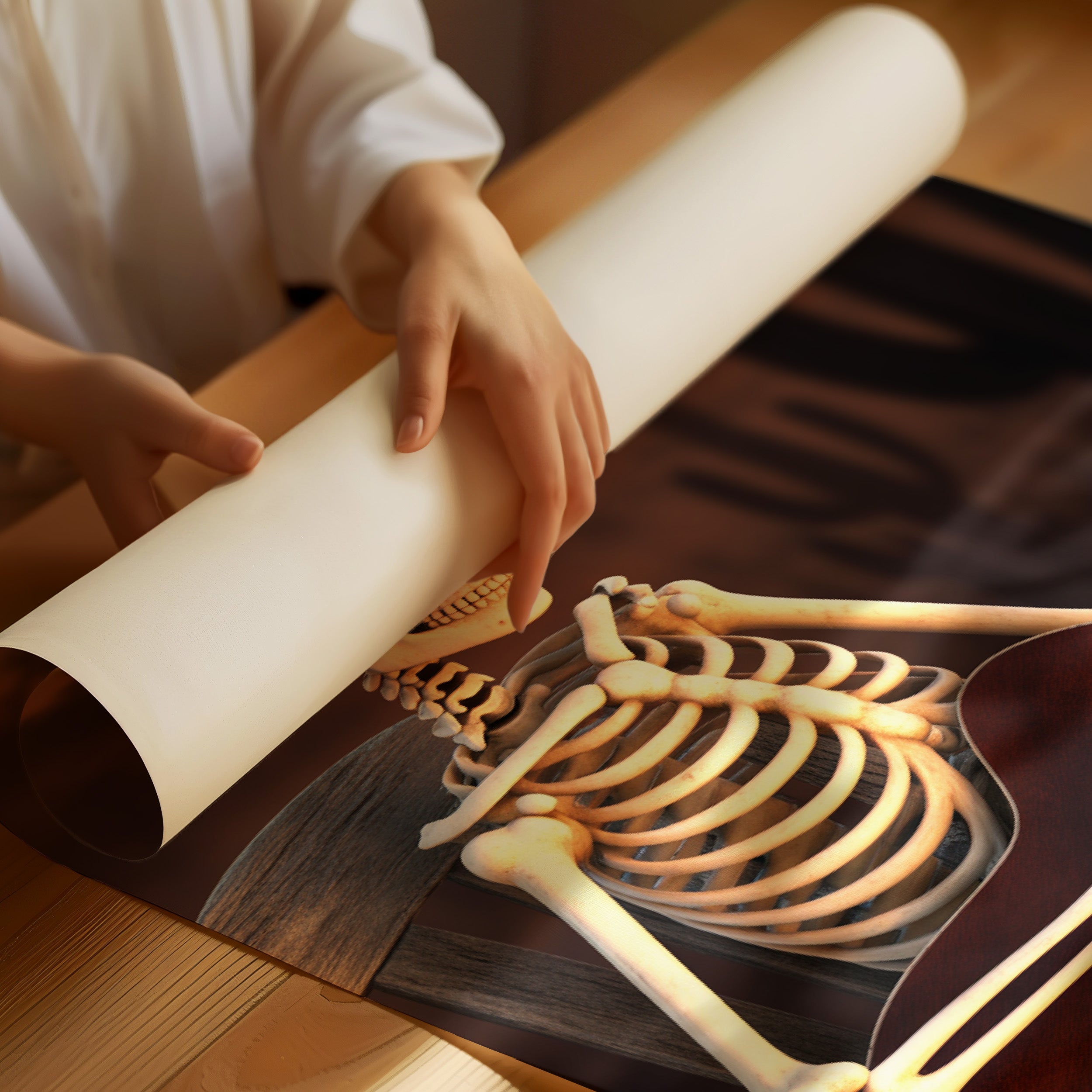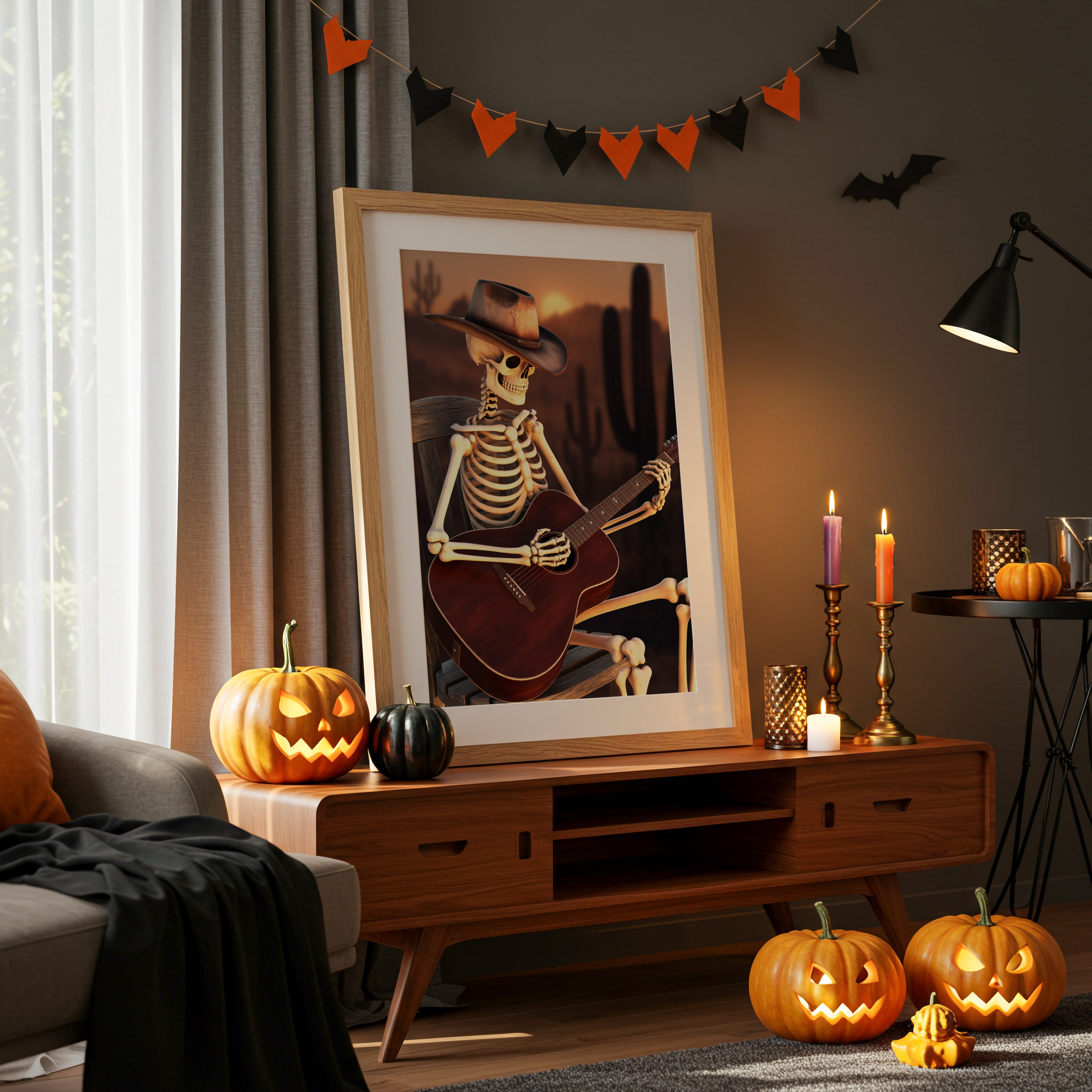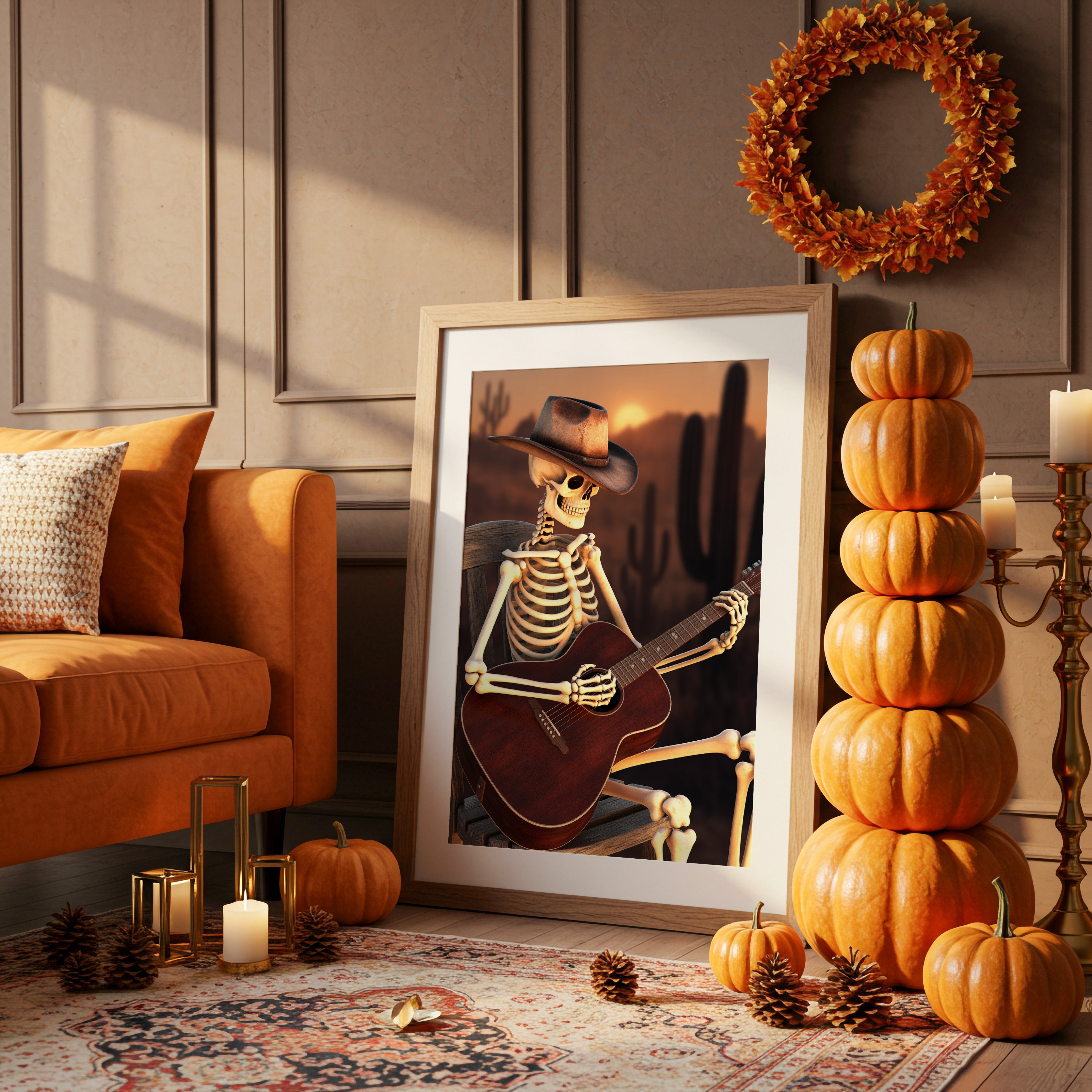 Twilight bathes the desert in amber glow as a weathered skeleton strums chords that float across the sand. The contrast between the warm mahogany guitar and bleached bones tells a story of music that outlasts flesh, with saguaro cacti standing sentinel against the setting sun. This haunting scene captures the eternal spirit of western folklore, where melodies continue long after their creators have passed.