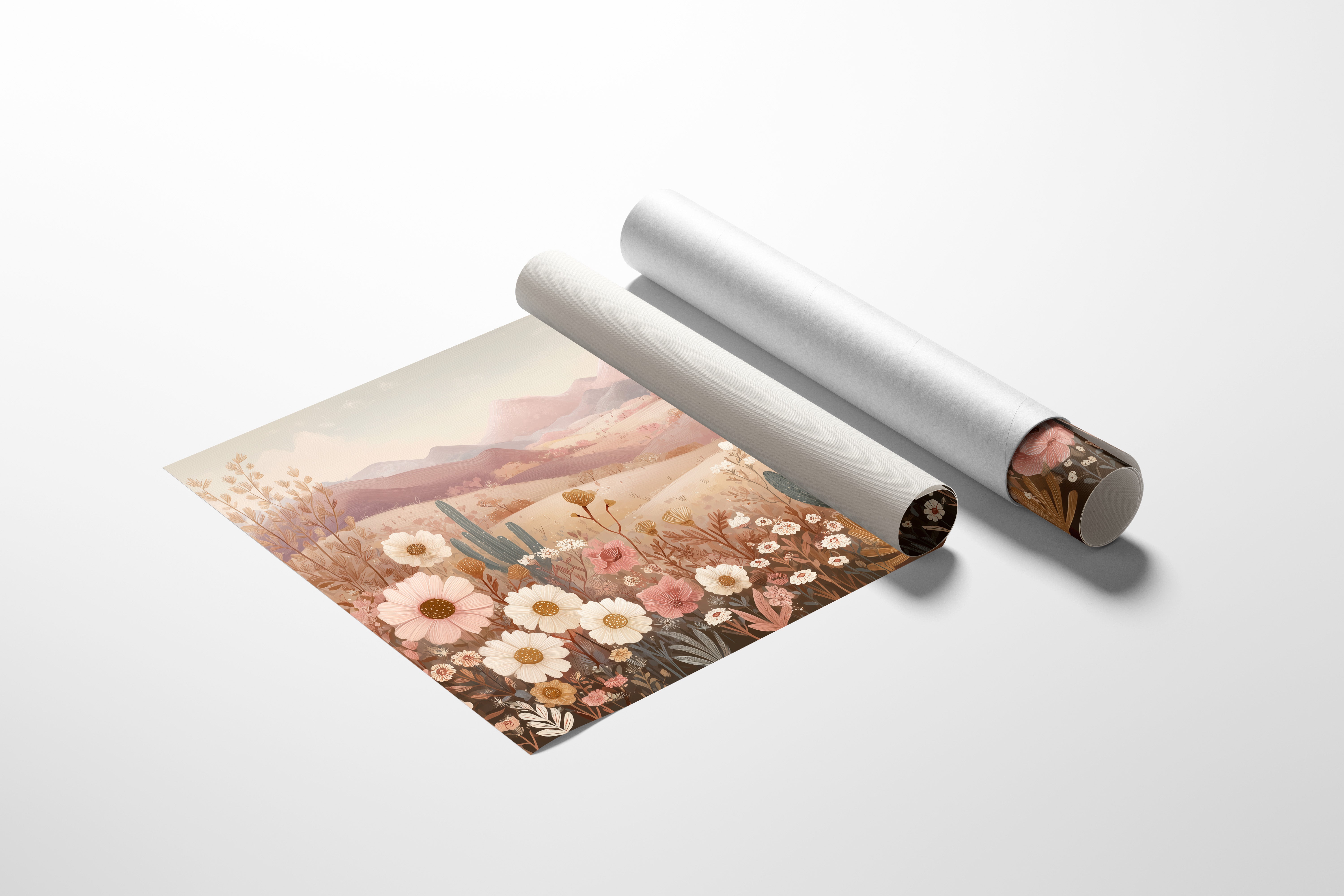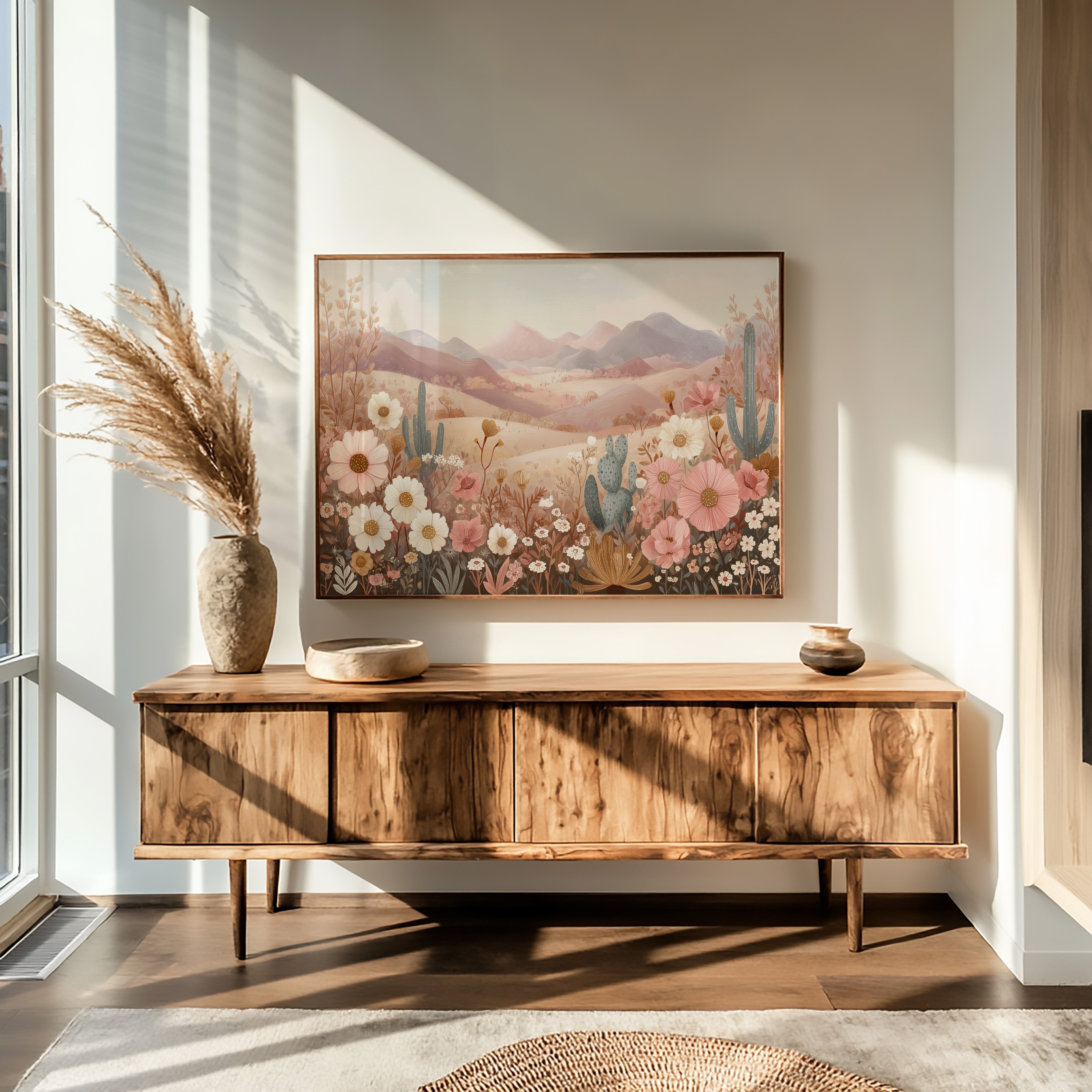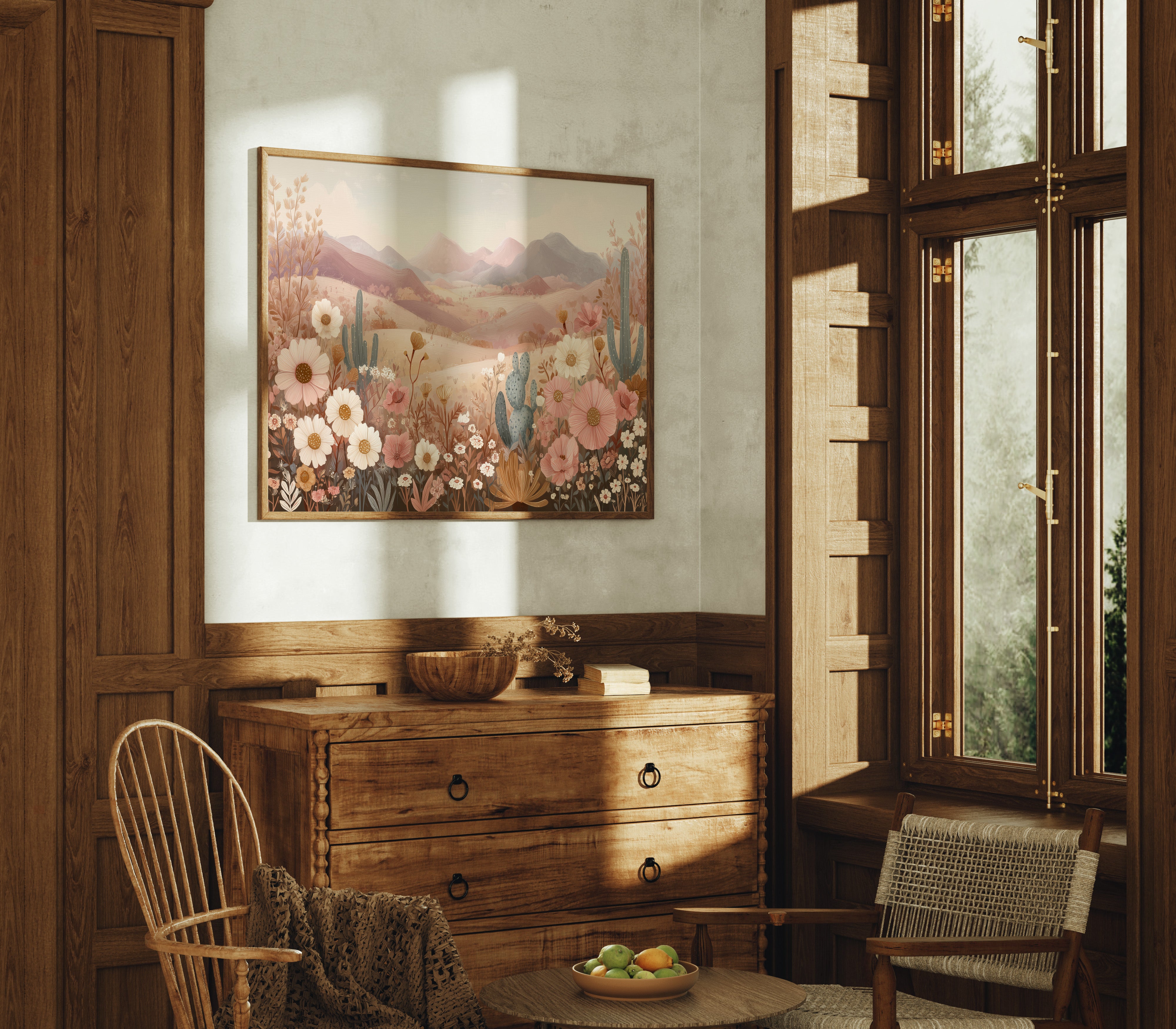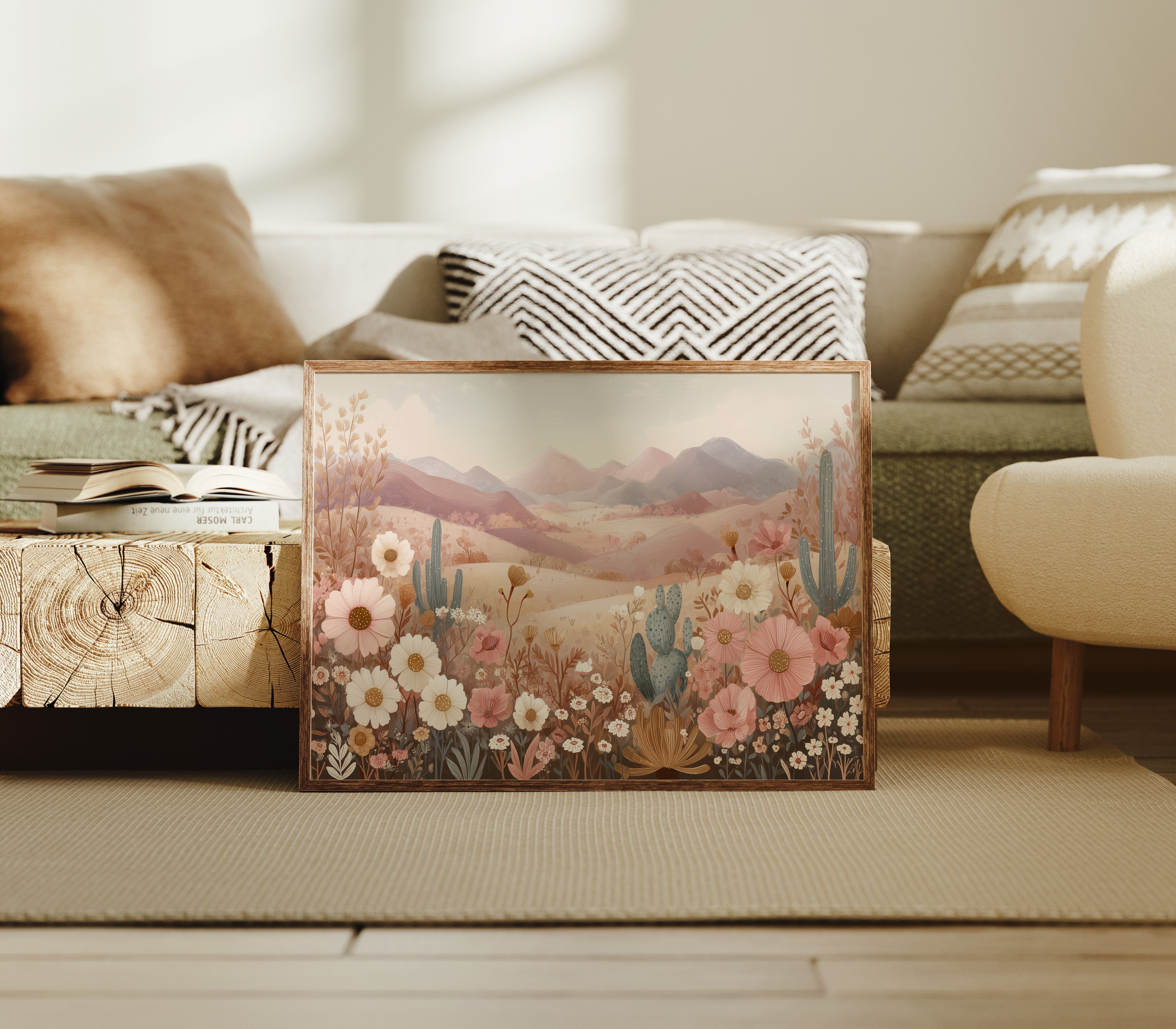 Gentle pink cosmos and cream-colored daisies sway beneath a rose-tinted sky, creating a dreamy desert garden oasis. Statuesque saguaros stand sentinel among delicate wildflowers, while rolling mauve mountains fade into the distance like watercolor brushstrokes. The palette of dusty pinks, sage greens, and warm earth tones weaves together a tapestry of Southwestern serenity. Perfect for bringing a touch of desert romance to a bedroom, living room, or any space seeking the peaceful energy of wild botanical beauty.