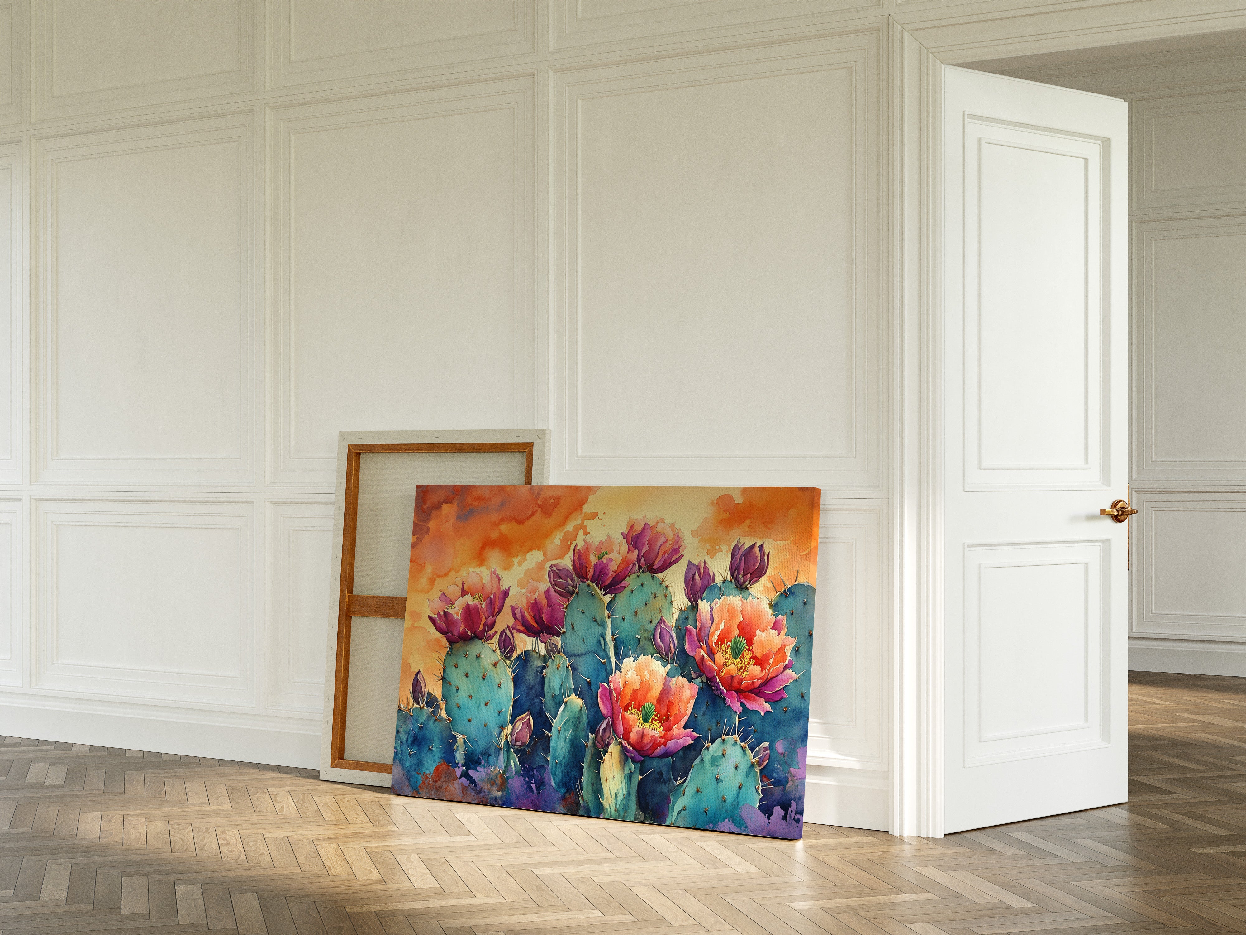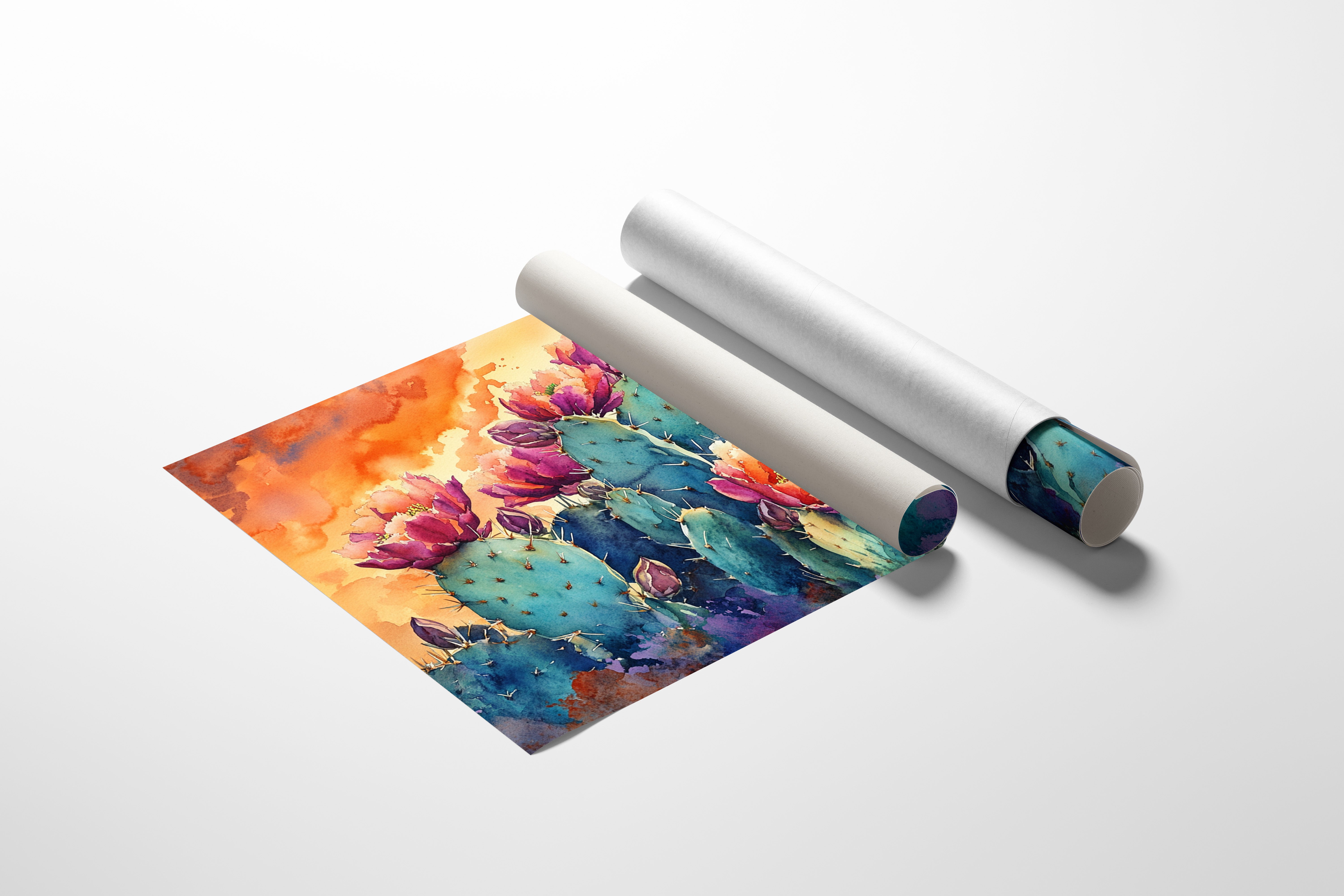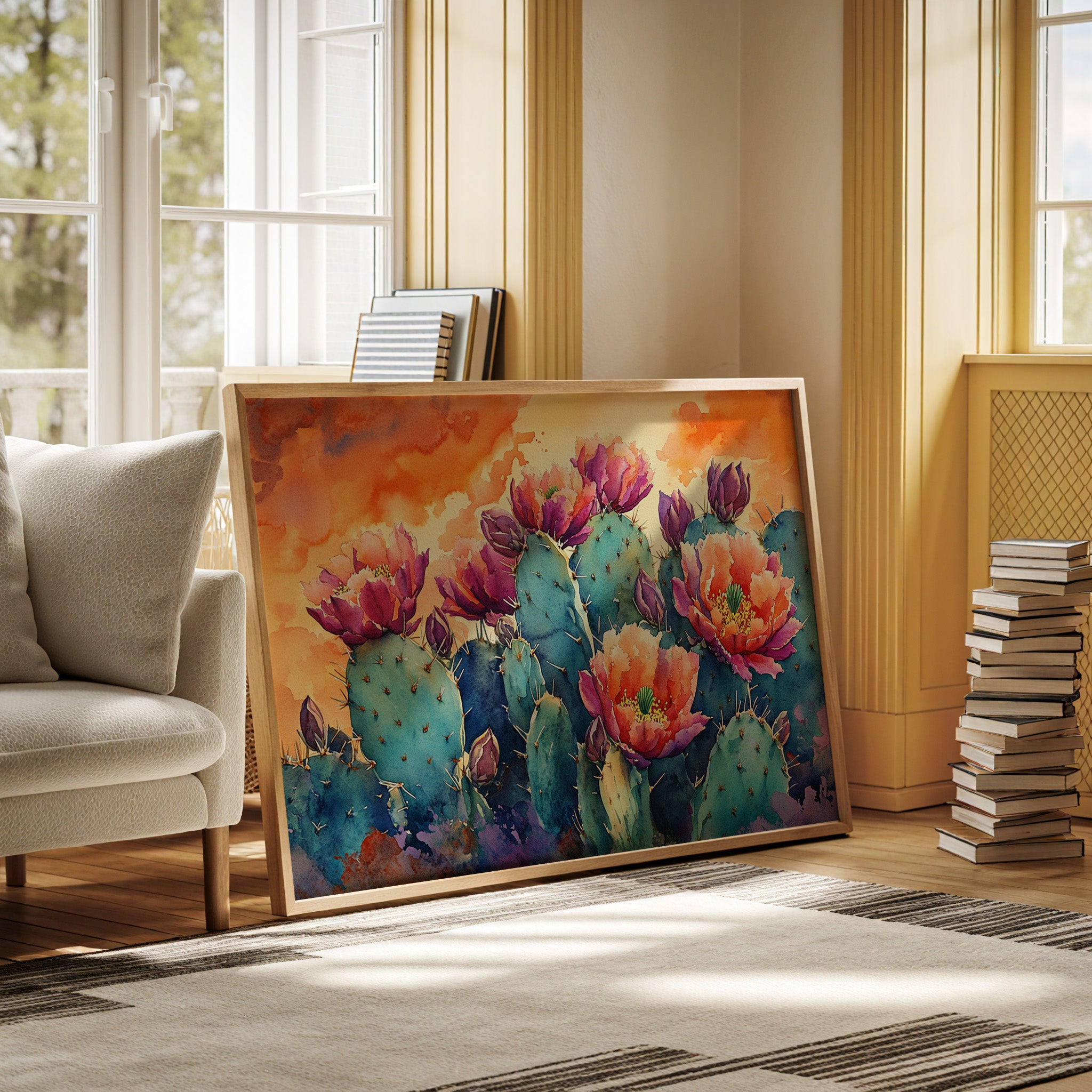 Vibrant cactus flowers burst forth against a blazing sunset, their coral and purple petals unfurling like nature's fireworks. The prickly pear cacti stand in various shades of turquoise and indigo, their spiny surfaces creating a striking contrast with their delicate blooms. Watercolor techniques bring this desert scene to life, allowing colors to blend and flow organically, capturing the magical moment when harsh desert elements yield extraordinary beauty. This piece would create a stunning focal point in a modern southwestern interior, bringing warmth and color to a dining room or entryway.