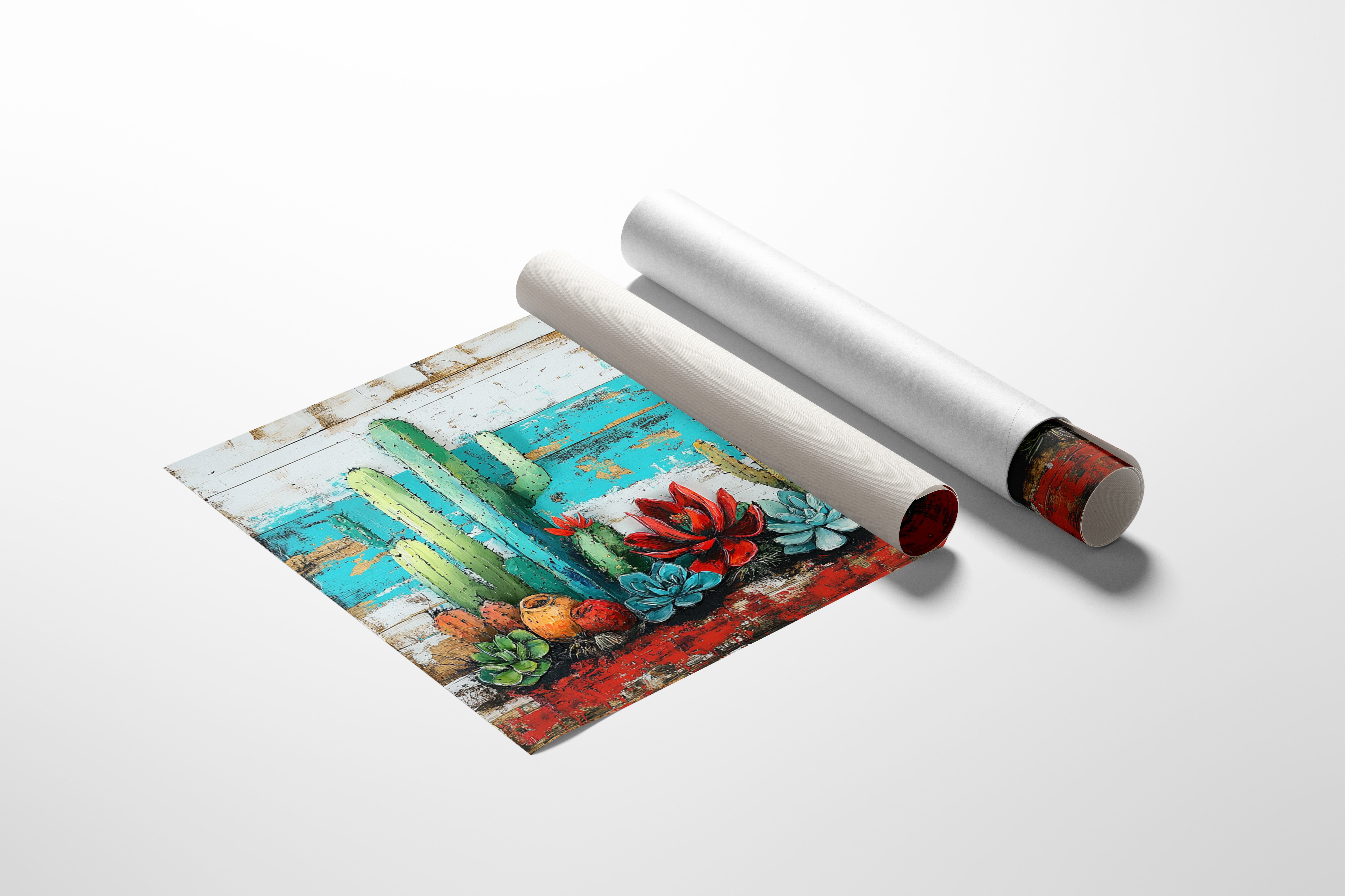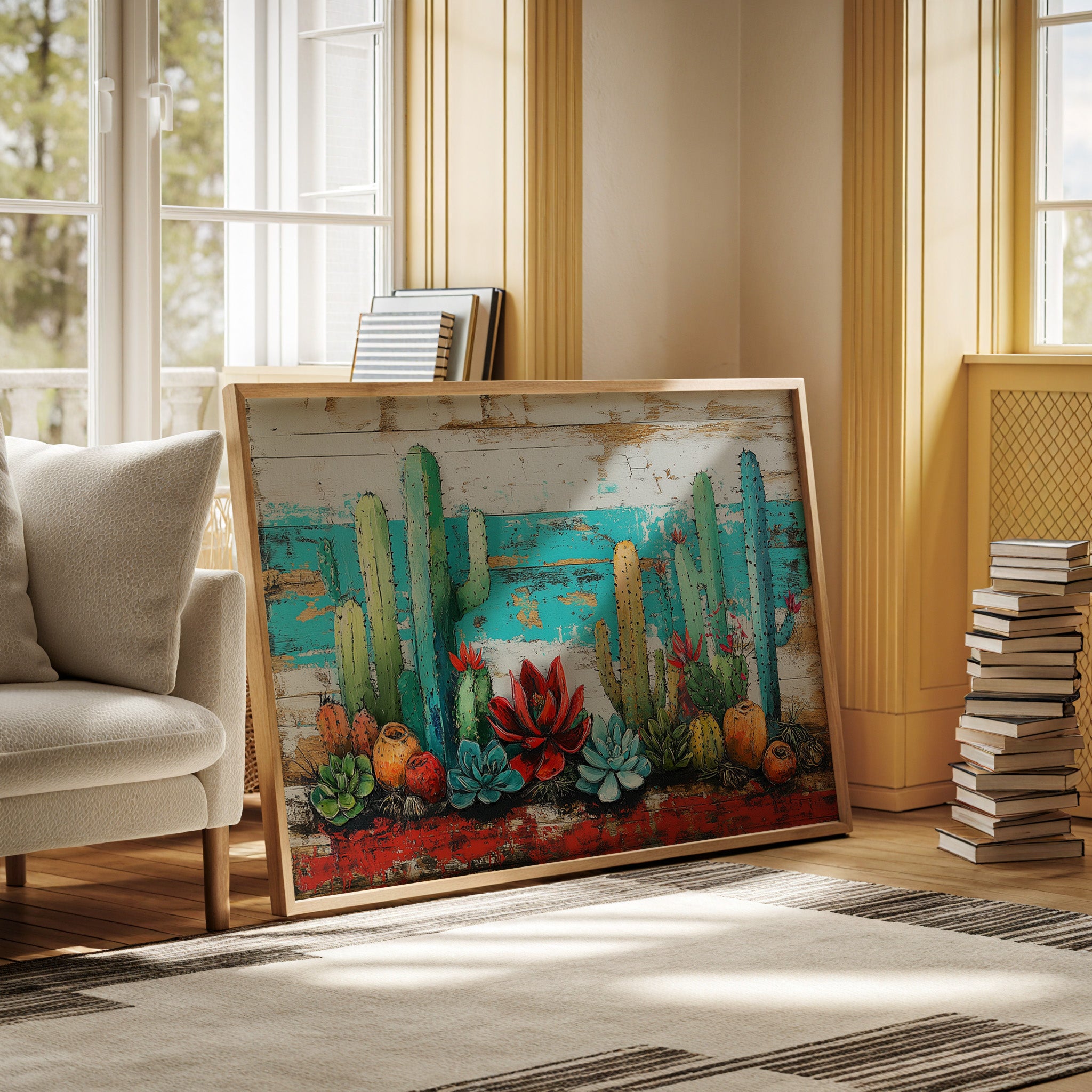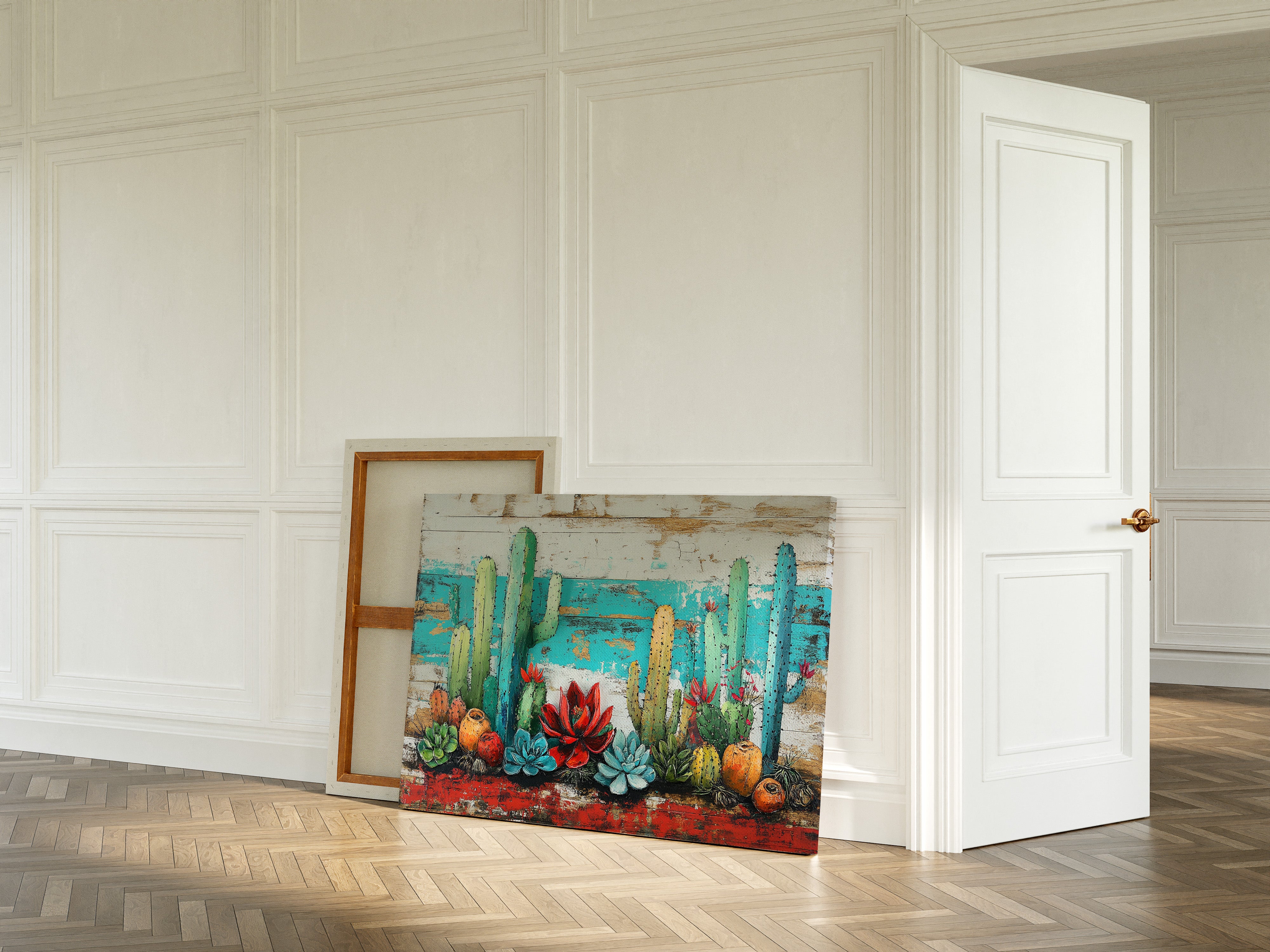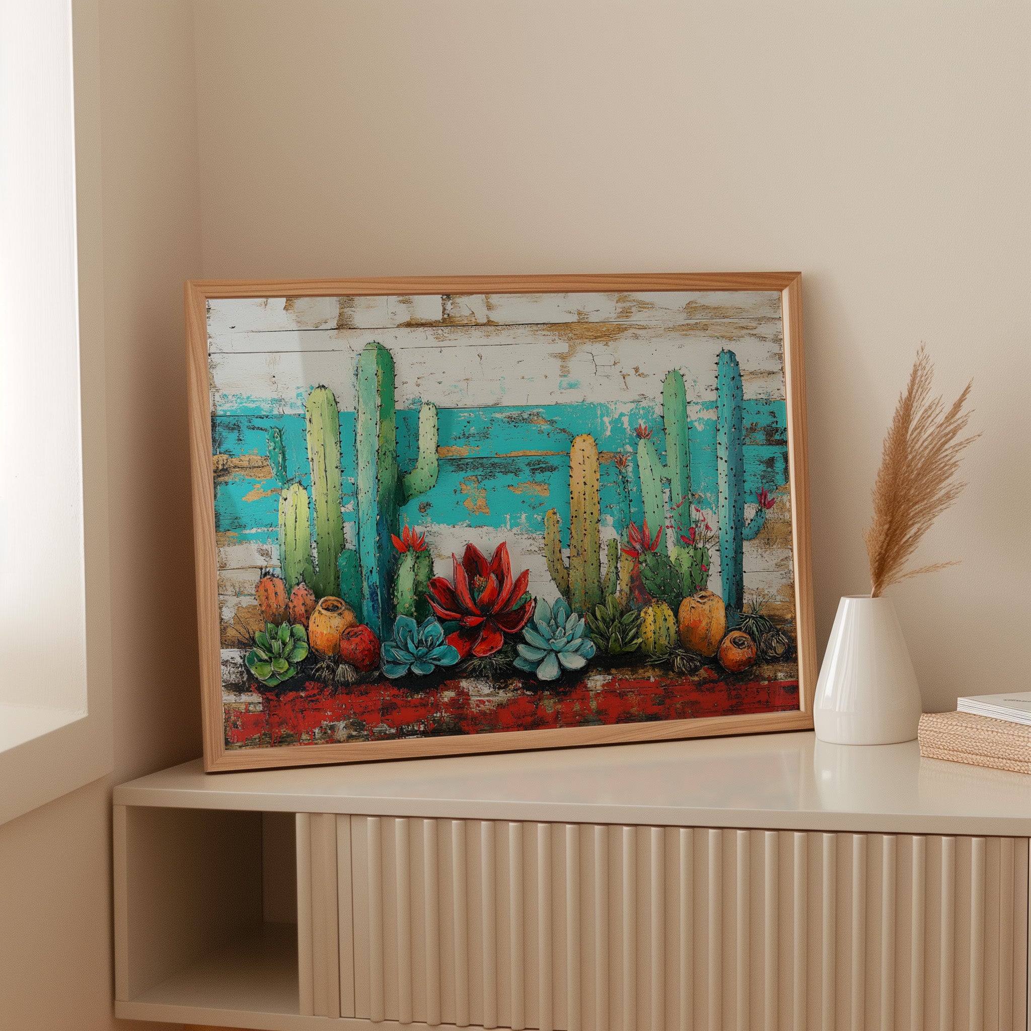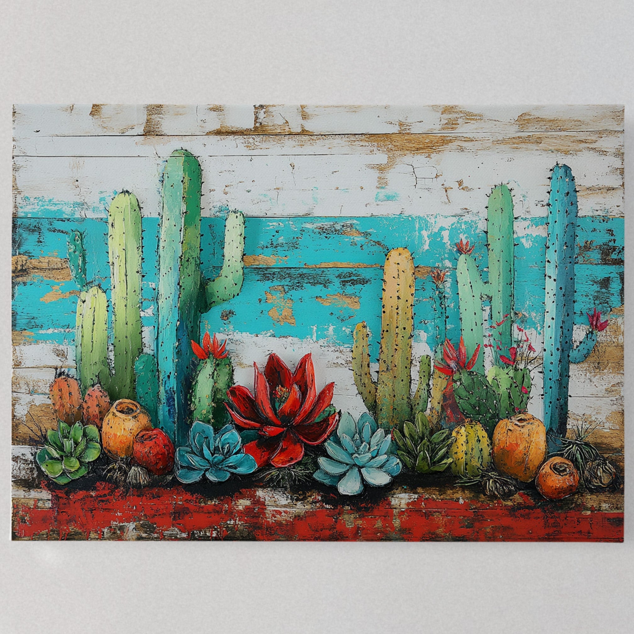 A vibrant celebration of Southwestern flora comes alive against weathered wooden planks. Tall saguaros in varying shades of mint and turquoise stand sentinel over a garden of crimson lotus blooms and azure succulents. The distressed turquoise background and rustic red base create a striking canvas for this desert narrative, while terra cotta pots add warmth and authenticity to the scene. This piece captures the resilient beauty of desert life, where even the most delicate flowers find their place among the sturdy cacti. Perfect for bringing southwestern charm to a sun-filled kitchen or adding a burst of desert-inspired color to a modern living space.