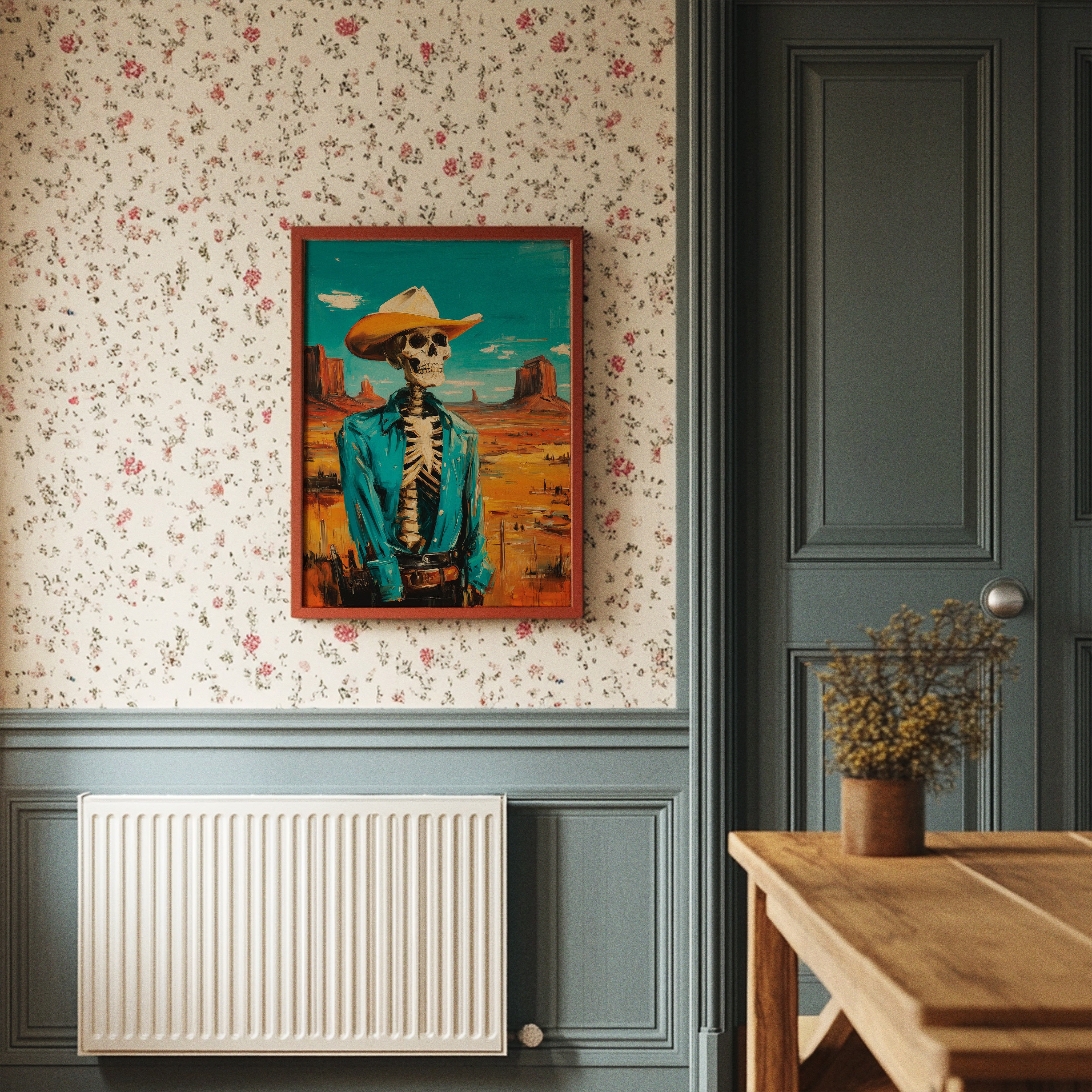 Against a burning desert sky, a skeletal cowboy stands eternal in his turquoise best, commanding the vast landscape with timeless presence. This striking piece from our Contemporary collection reimagines the American Southwest through a bold, surrealist lens. Rich terracotta mesas rise like ancient guardians behind the figure, while his turquoise shirt catches the endless light of an Arizona afternoon. The interplay of warm earth tones and cool teals creates a haunting meditation on mortality and endurance in the untamed West. This statement piece demands attention as a focal point in a modern living room or as an unexpected addition to a sophisticated home office. Its blend of whimsy and Western gravitas sparks conversation while grounding the space in southwestern mystique.
