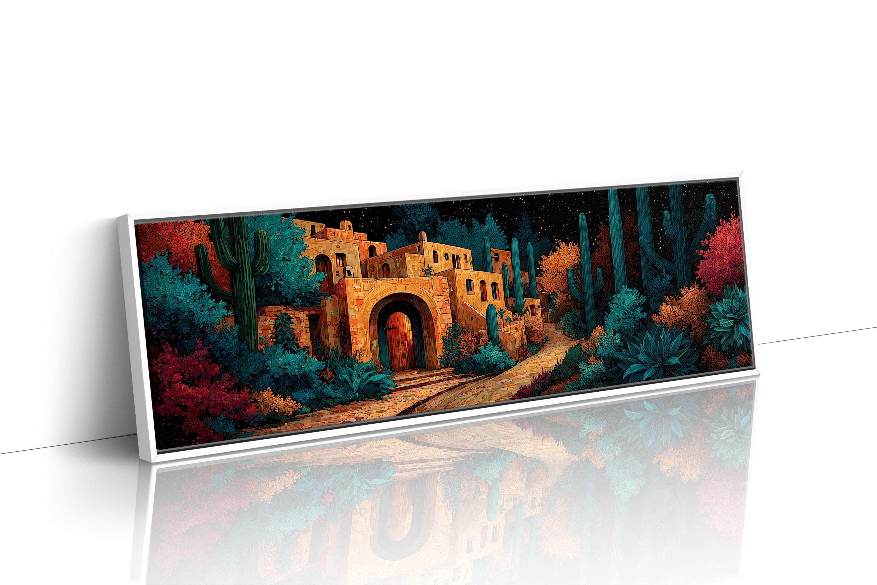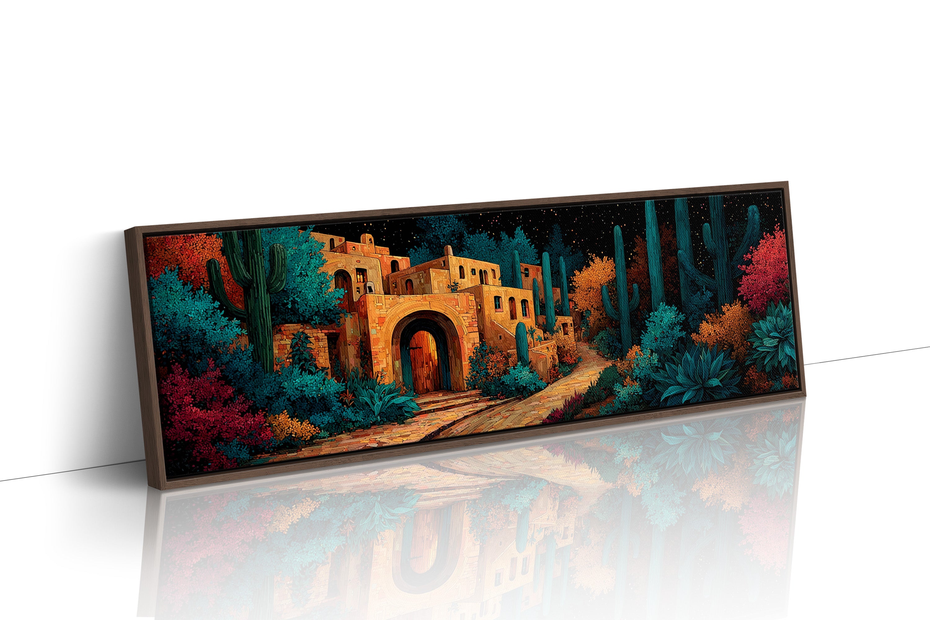 Warm lantern light spills from a stone archway as towering cacti stand watch beneath a sky scattered with stars. Jewel-toned foliage and winding pathways frame the quiet adobe walls, creating a scene that feels both hidden and inviting. Part of our Southwestern Nights collection, this piece blends desert architecture with rich, storybook color and intricate detail. A captivating choice for living rooms, entryways, or eclectic spaces, it brings warmth, wanderlust, and a touch of midnight magic indoors.
