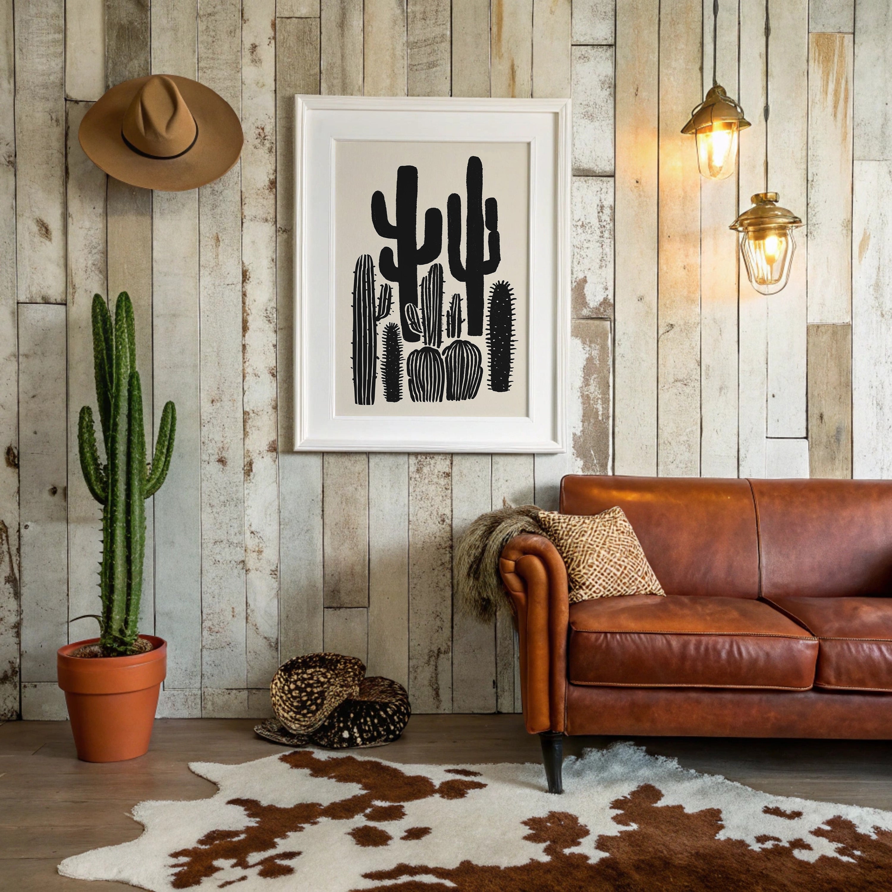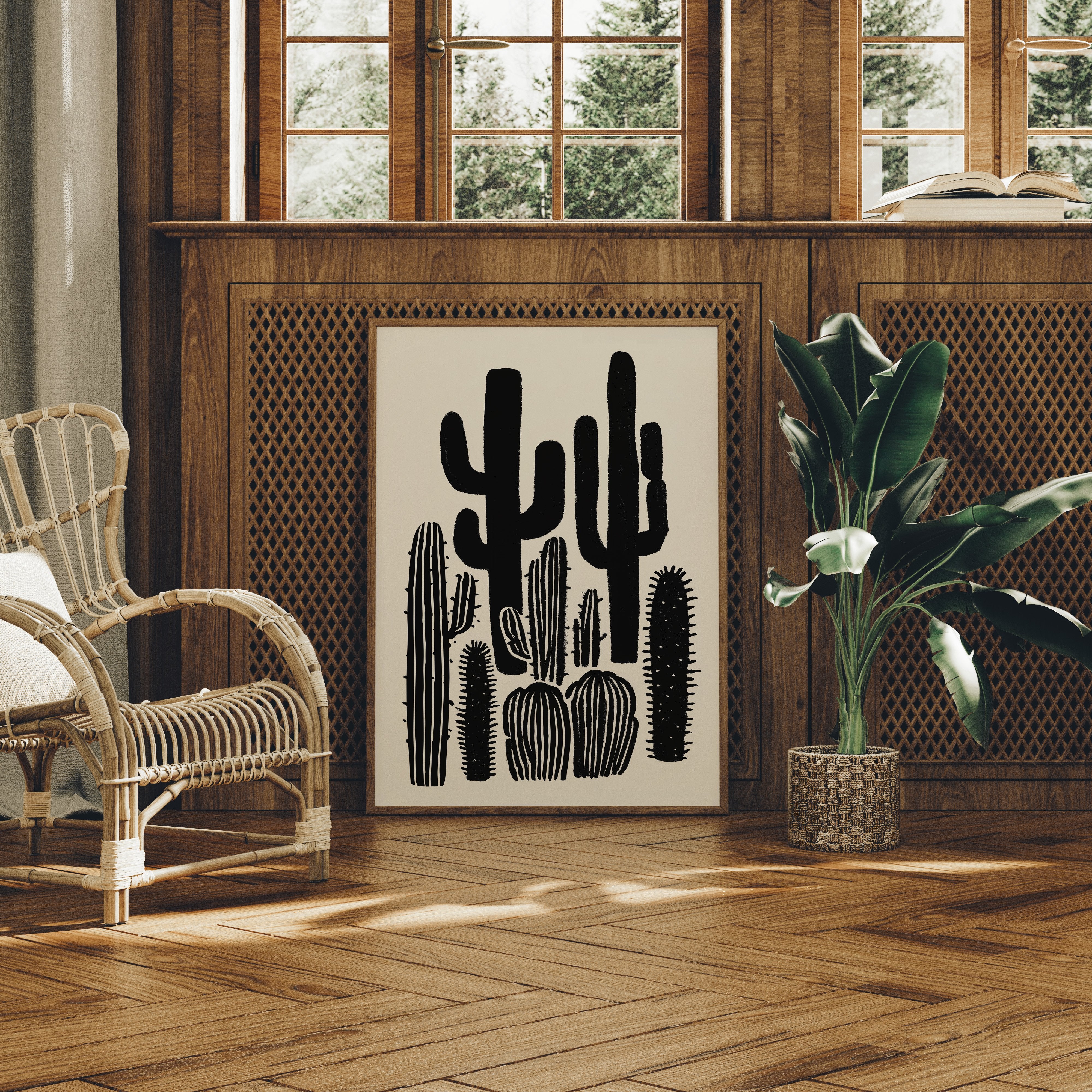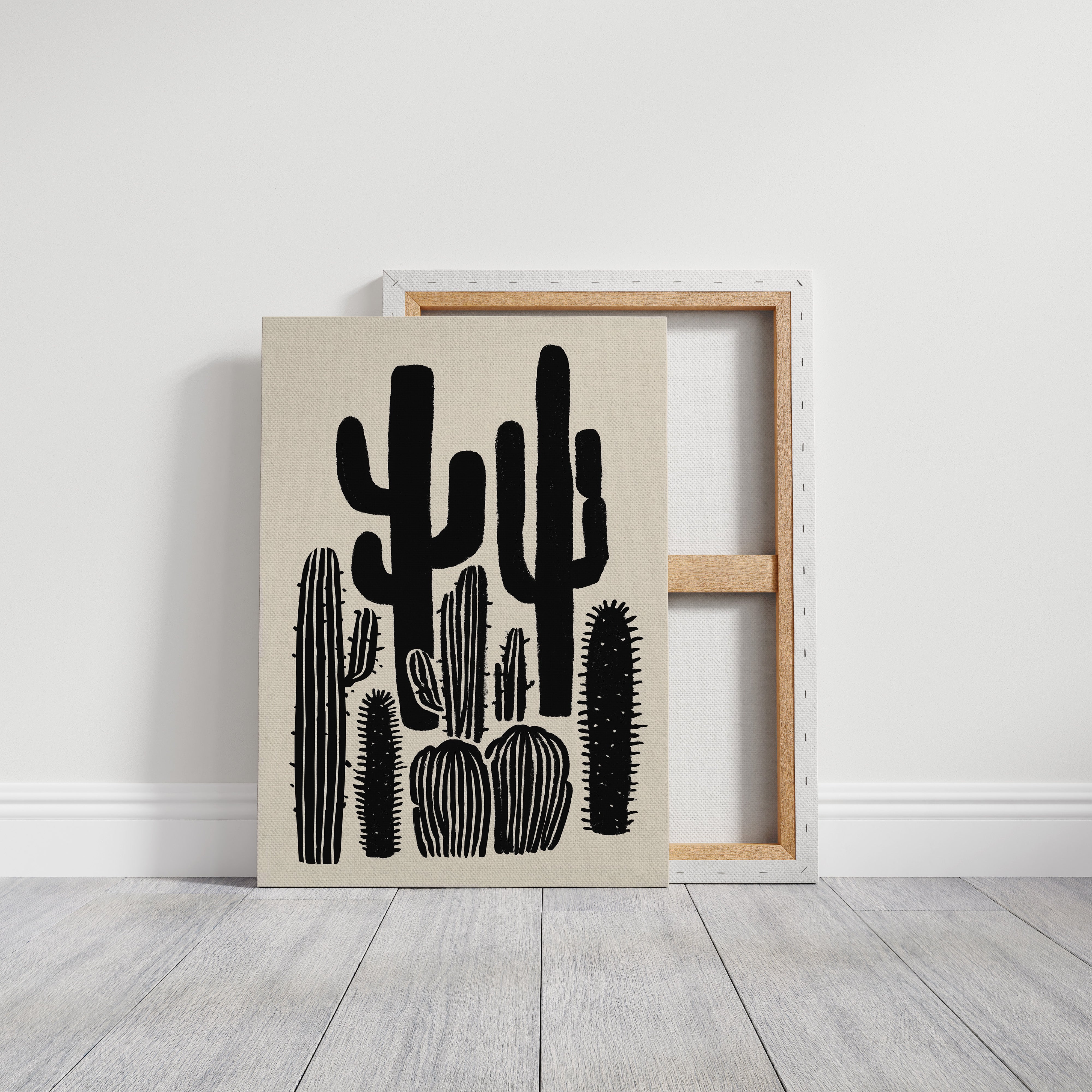Stark silhouettes pierce the horizon, their forms bold and unapologetic against a pristine backdrop. This piece from our Contemporary collection celebrates the raw beauty of desert flora through minimalist interpretation. The saguaros and barrel cacti stand like sentinels in various poses, their shapes creating a natural rhythm across the composition. Bold black strokes capture both strength and elegance, while negative space speaks volumes about the desert's expansive nature. This striking piece brings sophisticated desert charm to modern interiors, perfect for adding dramatic contrast to a dining room or creating a focal point in a minimalist living space. Each cactus seems to tell its own story of survival and grace.
