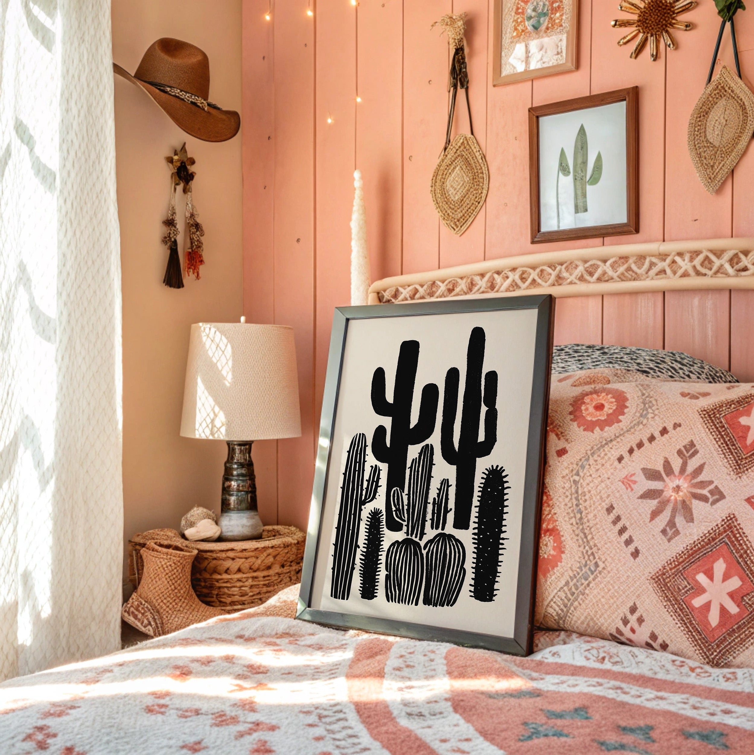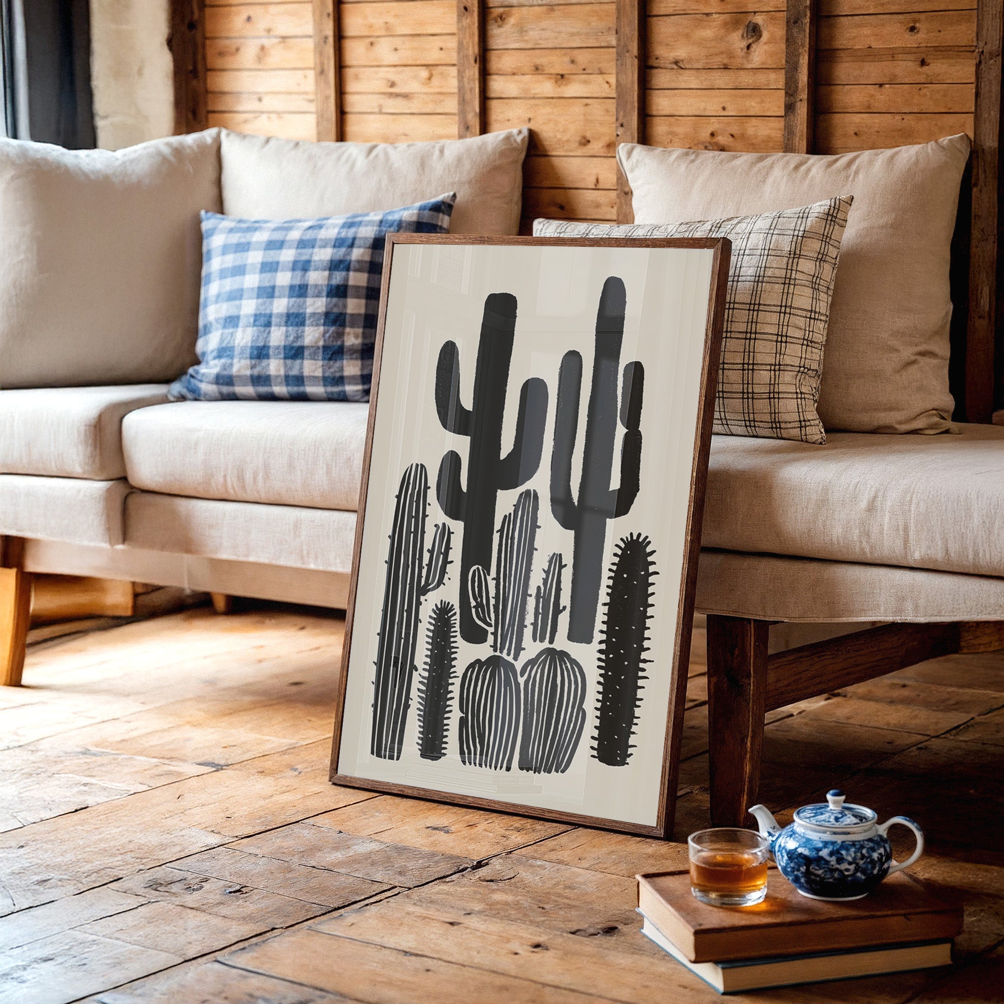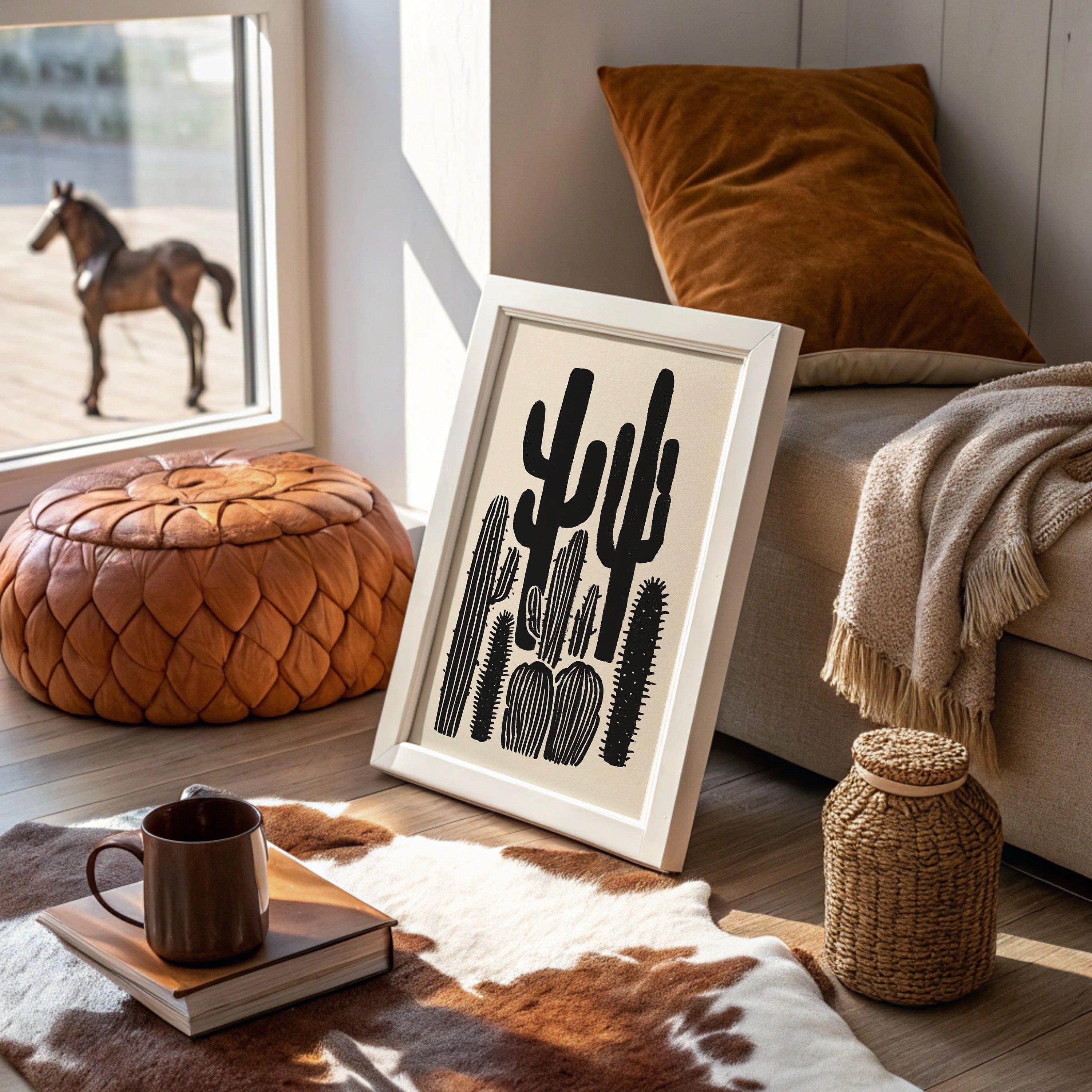 Stark silhouettes pierce the horizon, their forms bold and unapologetic against a pristine backdrop. This piece from our Contemporary collection celebrates the raw beauty of desert flora through minimalist interpretation. The saguaros and barrel cacti stand like sentinels in various poses, their shapes creating a natural rhythm across the composition. Bold black strokes capture both strength and elegance, while negative space speaks volumes about the desert's expansive nature. This striking piece brings sophisticated desert charm to modern interiors, perfect for adding dramatic contrast to a dining room or creating a focal point in a minimalist living space. Each cactus seems to tell its own story of survival and grace.