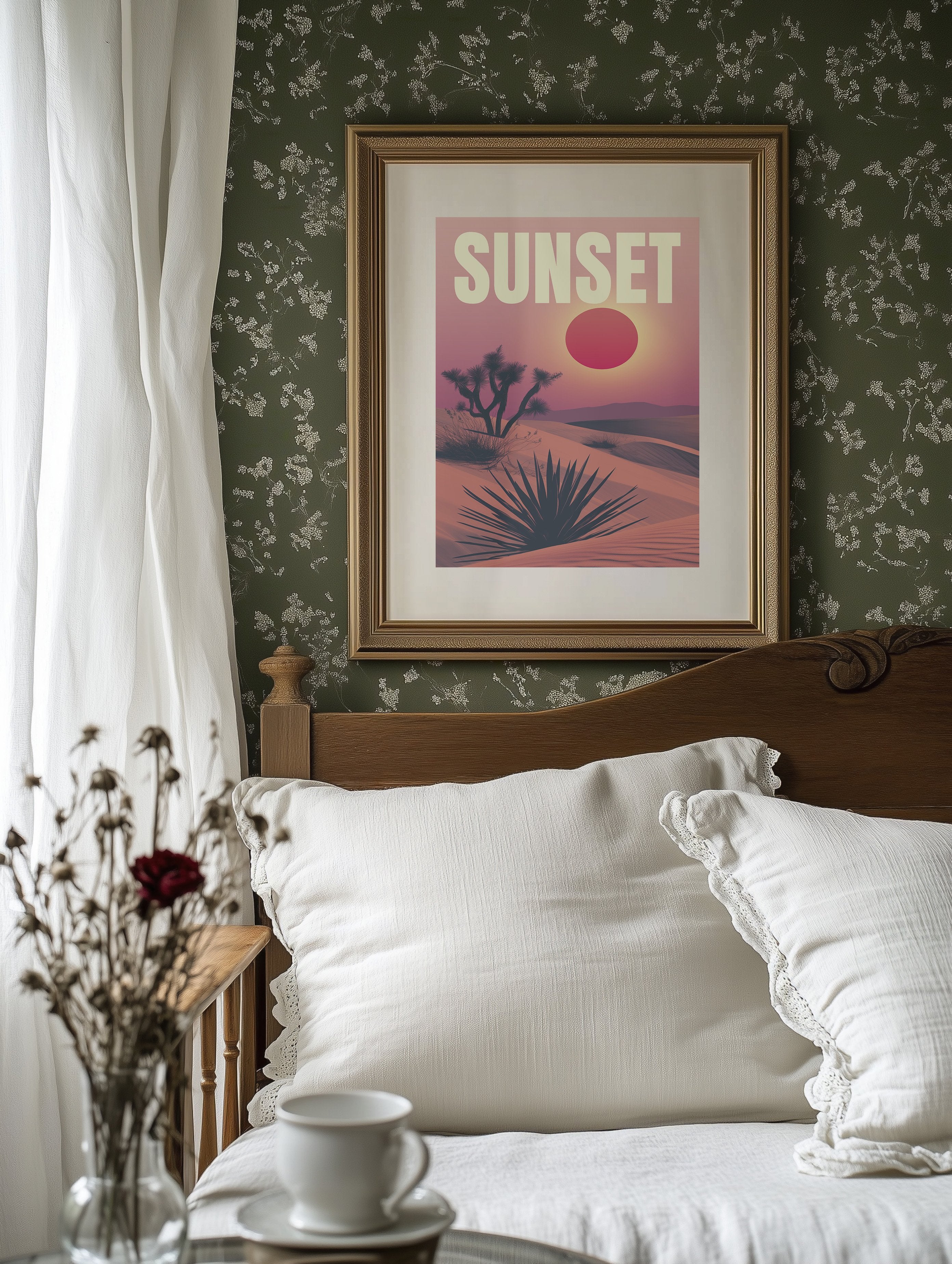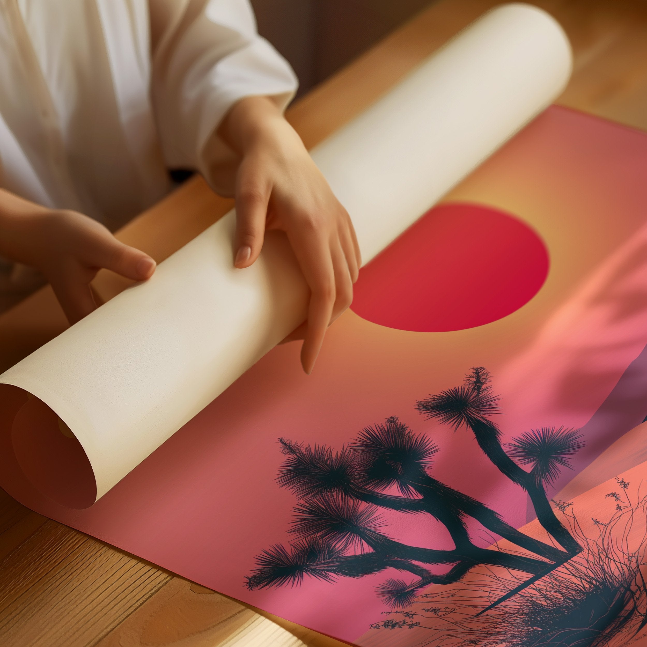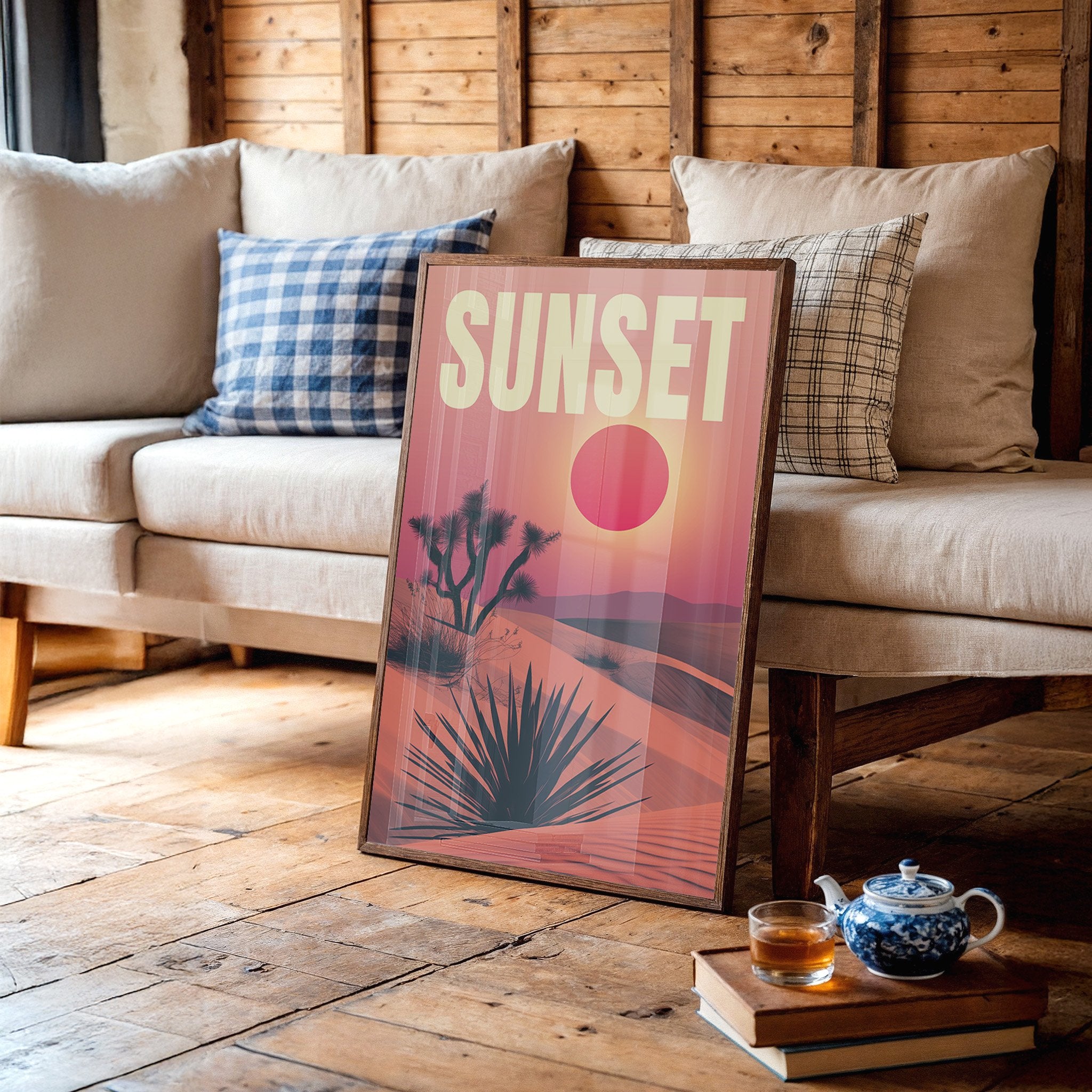 The crimson sun hangs suspended above an endless horizon, painting the desert in shades of coral and rose. Joshua trees and yucca plants stand silhouetted against the vibrant backdrop, their distinctive shapes creating a perfect harmony with the rolling dunes. This retro-inspired desert landscape captures the magical moment when day surrenders to evening, inviting quiet contemplation and adventure. Perfect for bringing southwestern warmth to living rooms, home offices, or entryways where its sunset palette can tie together rustic and contemporary elements.