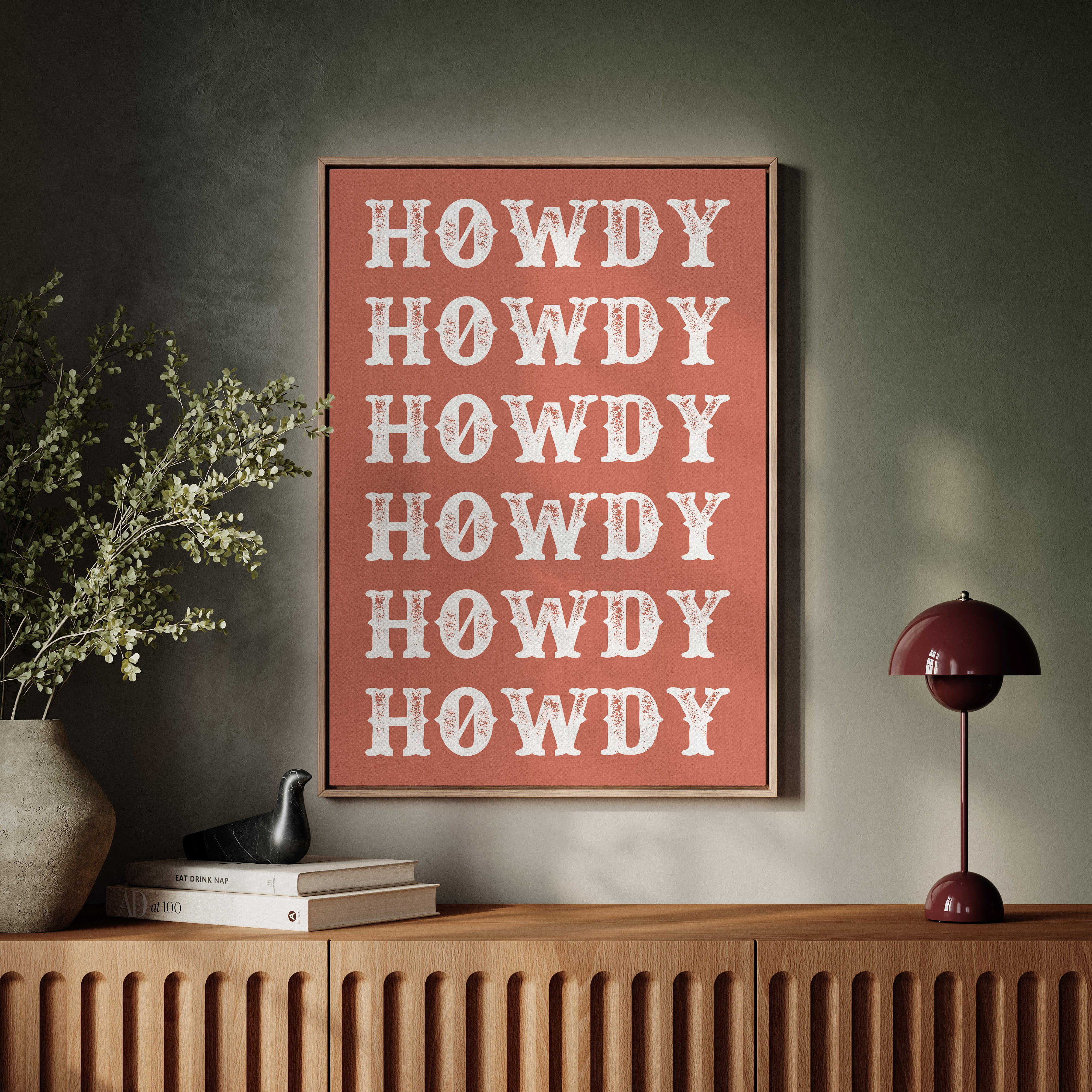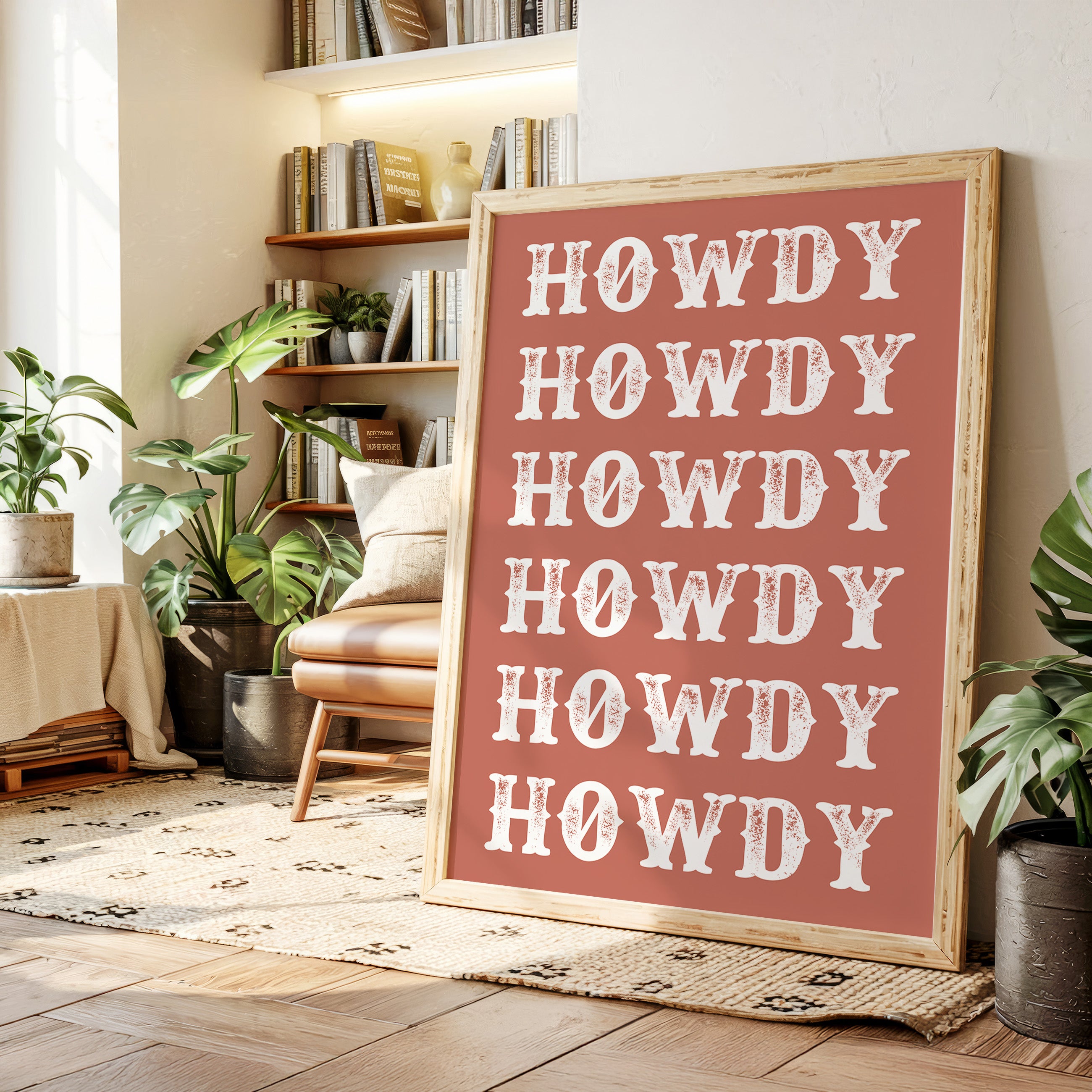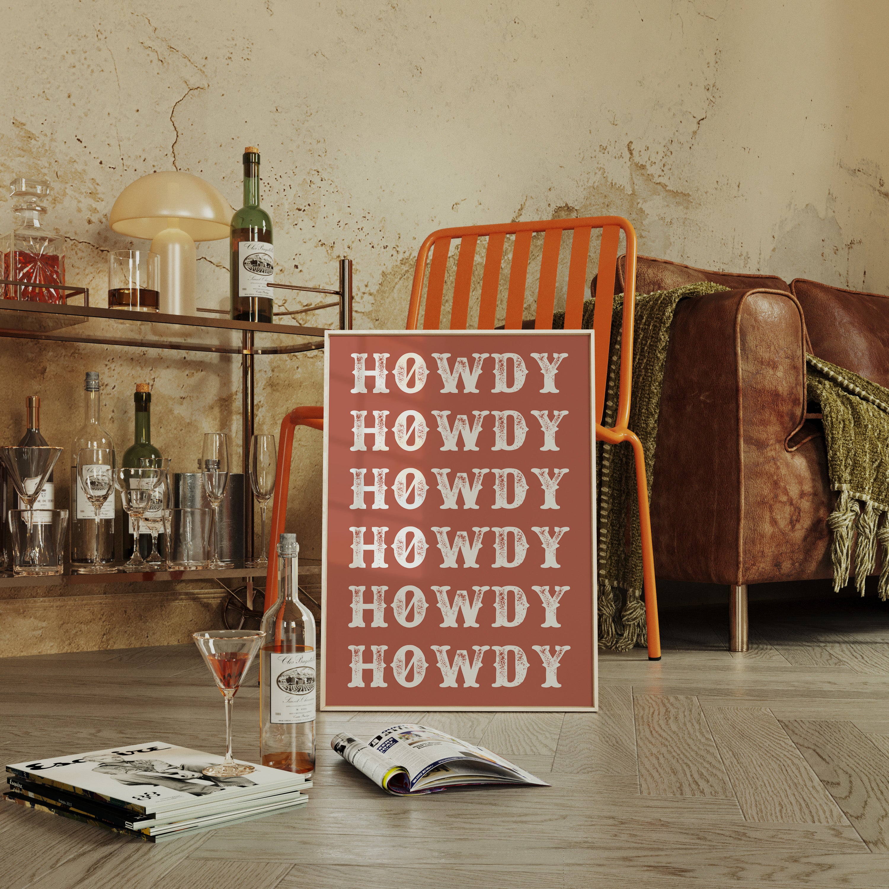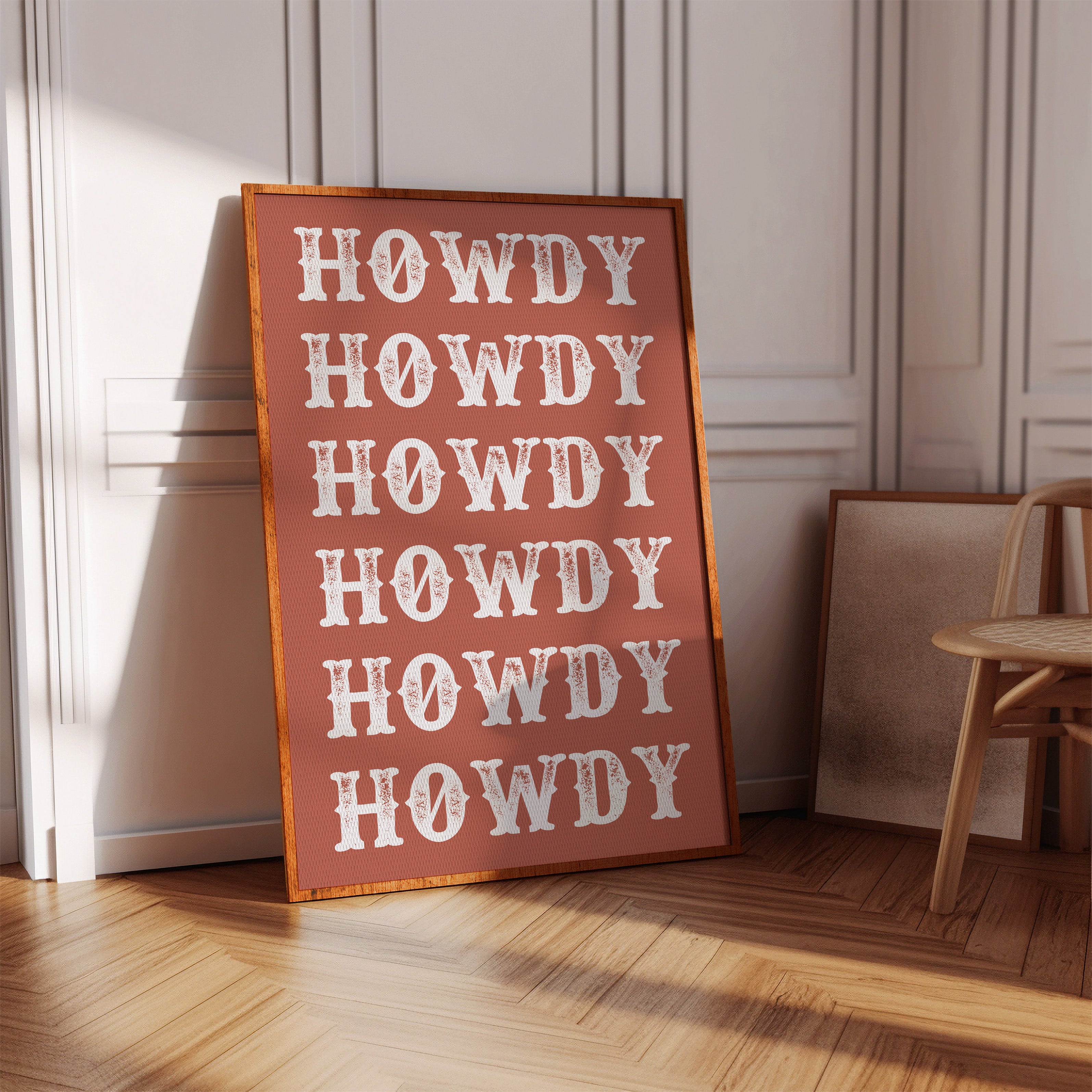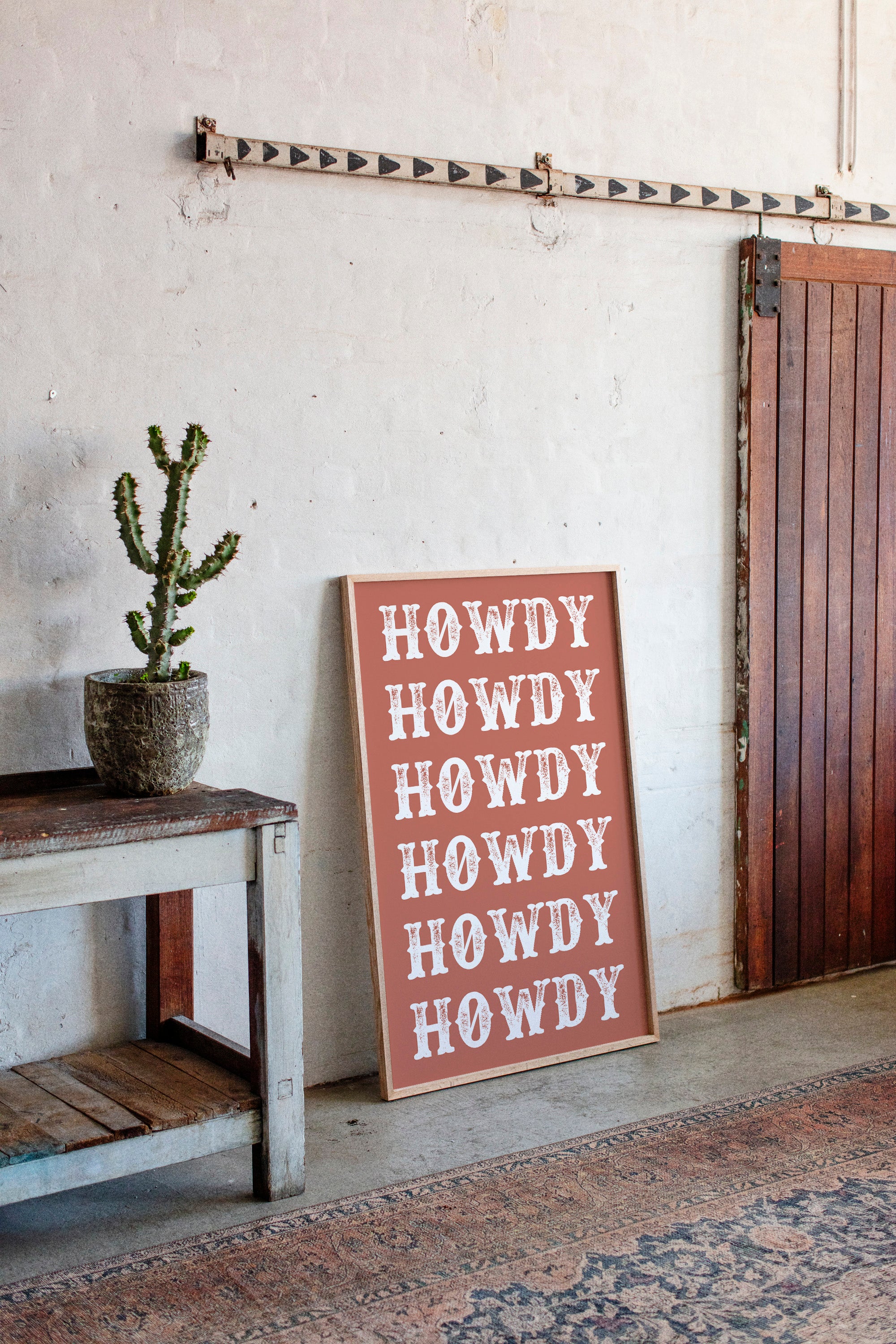 A playful repetition of western warmth meets minimalist charm in this striking composition. This piece from our Contemporary collection marries modern typography with classic southwestern spirit. Against a terra cotta backdrop, bold white letters dance with vintage character, while a lone cactus stands sentinel nearby, creating a perfect balance of whimsy and desert sophistication. The weathered wooden bench and textured wall provide an authentic backdrop that grounds the modern design in timeless appeal. Perfect for bringing personality to a modern farmhouse kitchen, casual dining space, or anywhere that needs a touch of western hospitality. Each viewing invites guests to feel instantly at home with its cheerful, repeated welcome.