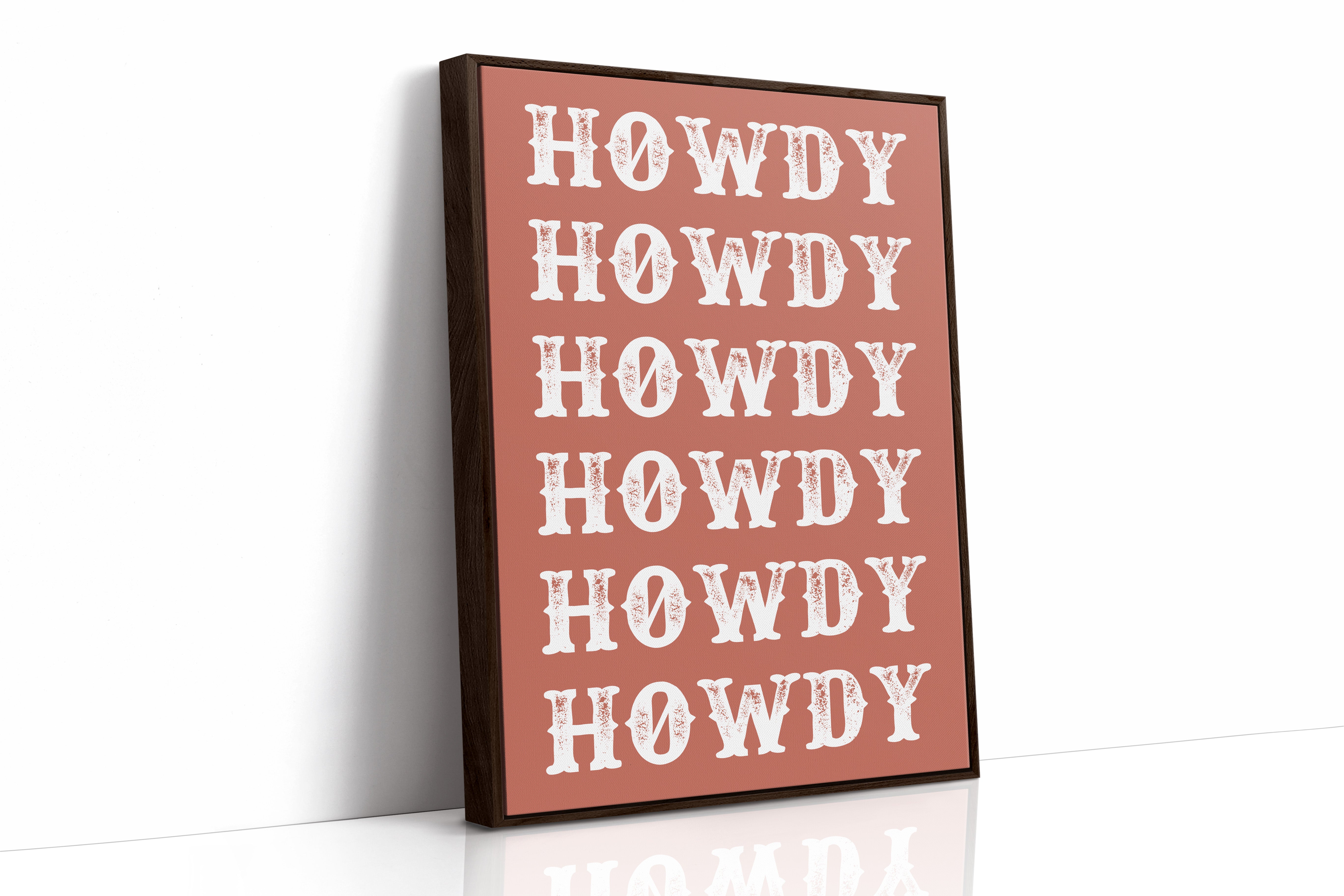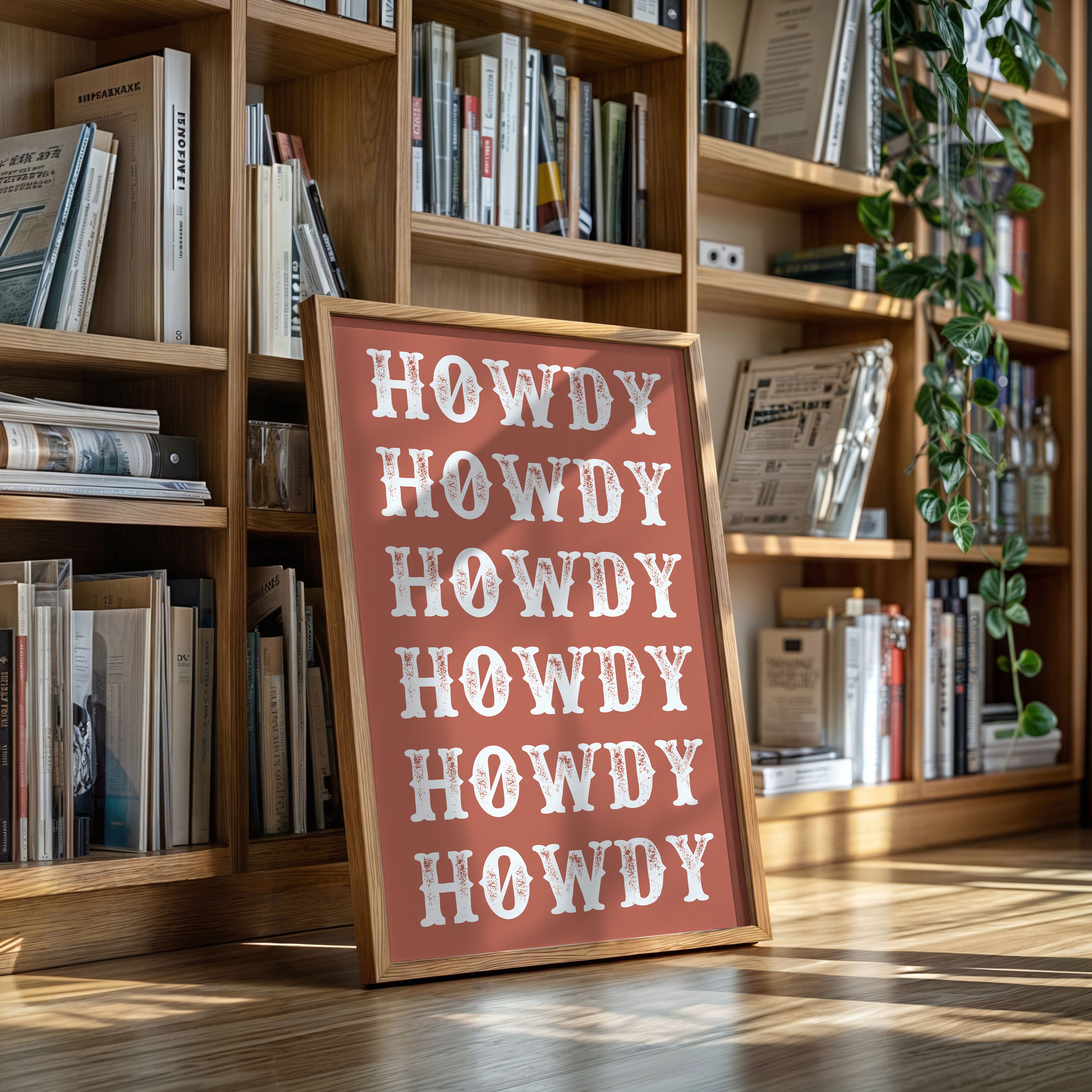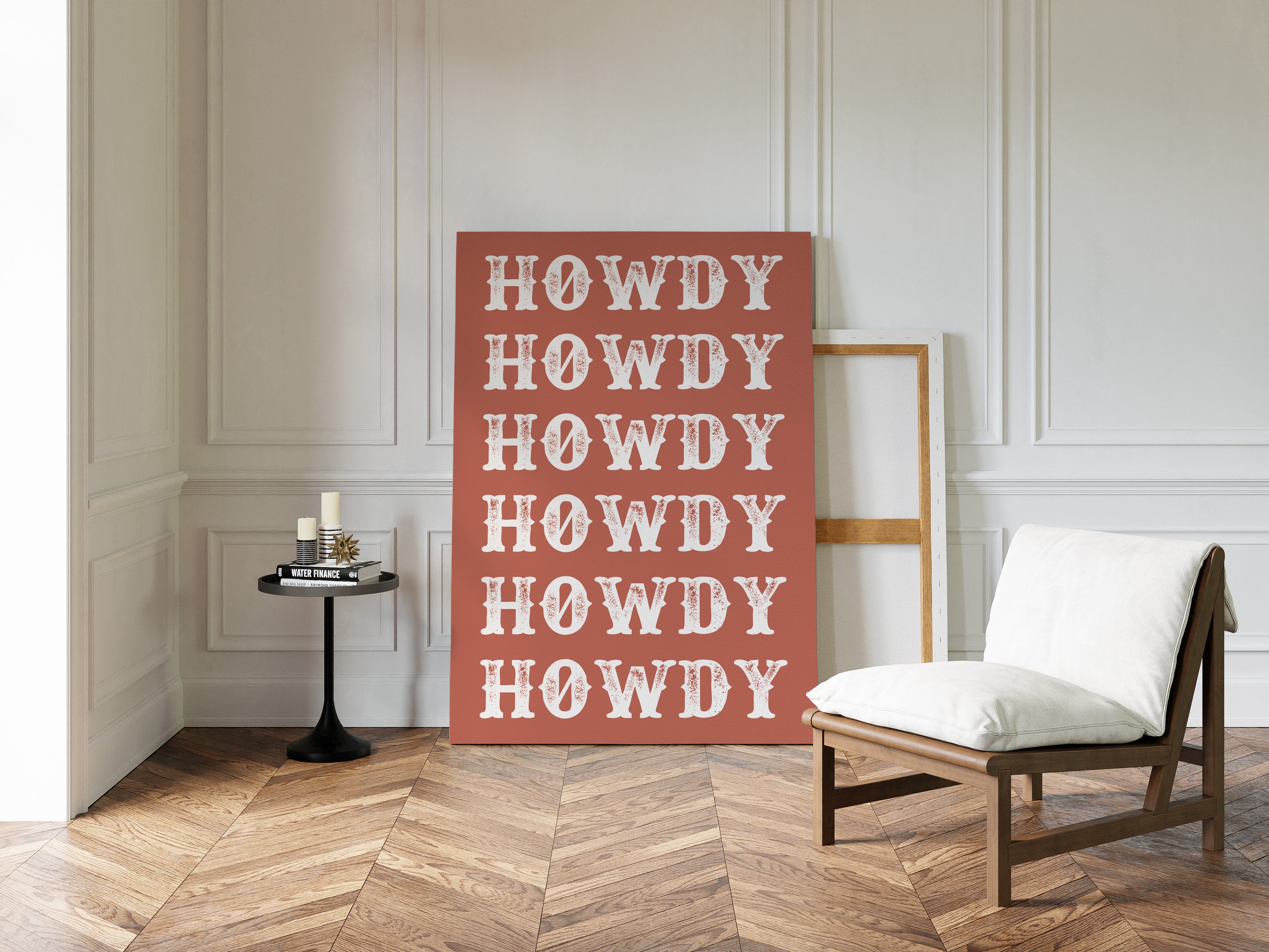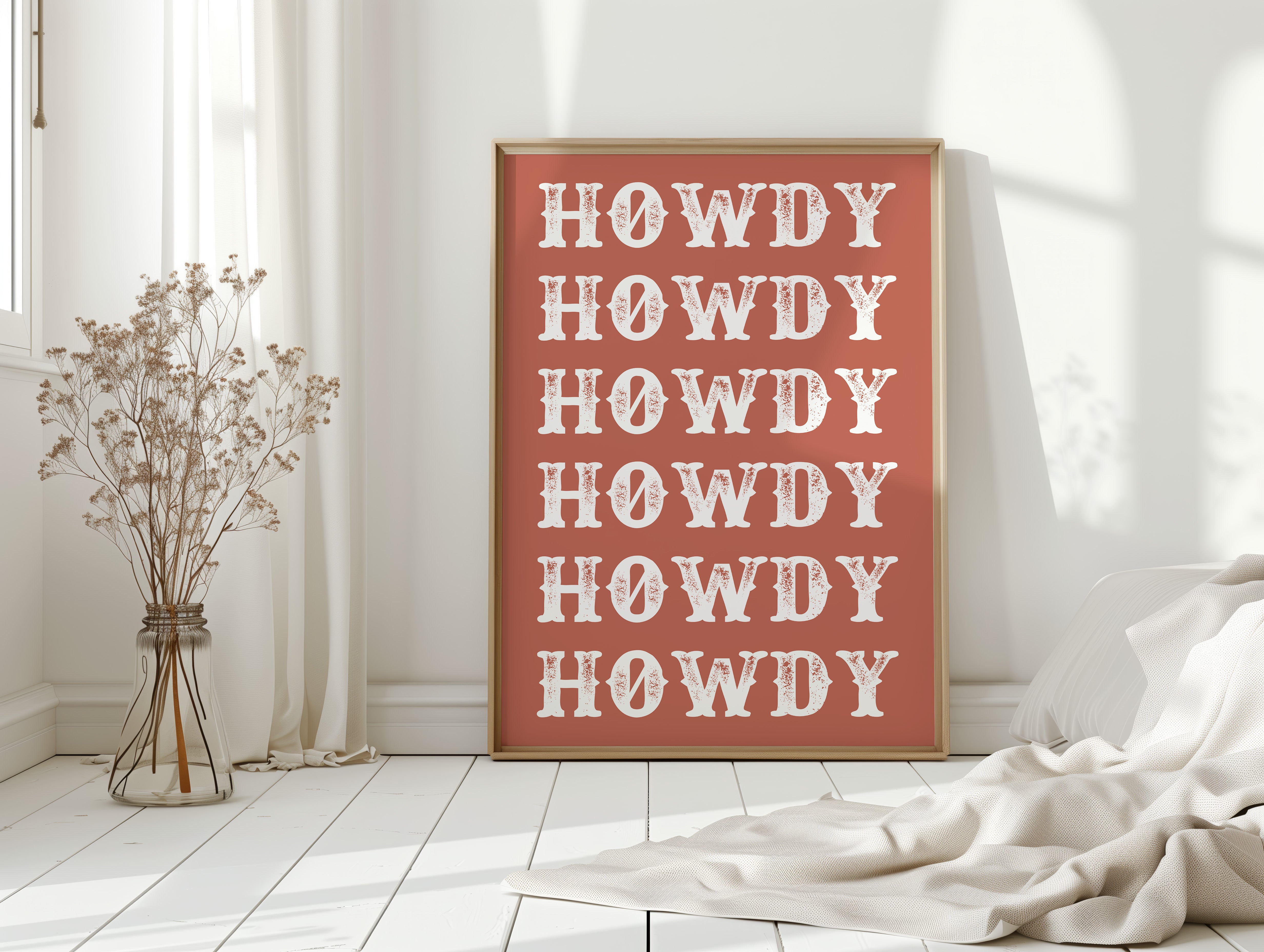 A playful repetition of western warmth meets minimalist charm in this striking composition. This piece from our Contemporary collection marries modern typography with classic southwestern spirit. Against a terra cotta backdrop, bold white letters dance with vintage character, while a lone cactus stands sentinel nearby, creating a perfect balance of whimsy and desert sophistication. The weathered wooden bench and textured wall provide an authentic backdrop that grounds the modern design in timeless appeal. Perfect for bringing personality to a modern farmhouse kitchen, casual dining space, or anywhere that needs a touch of western hospitality. Each viewing invites guests to feel instantly at home with its cheerful, repeated welcome.