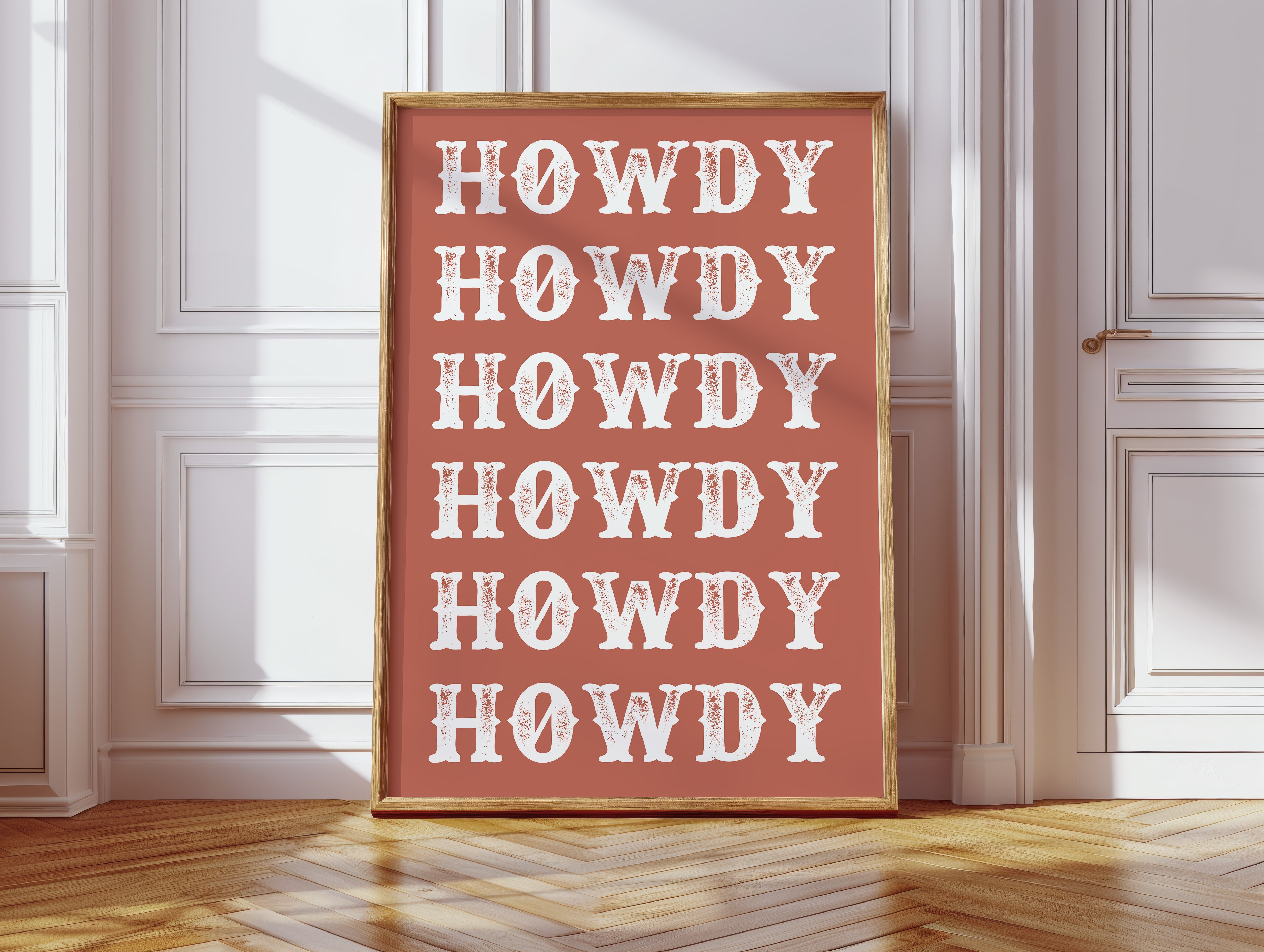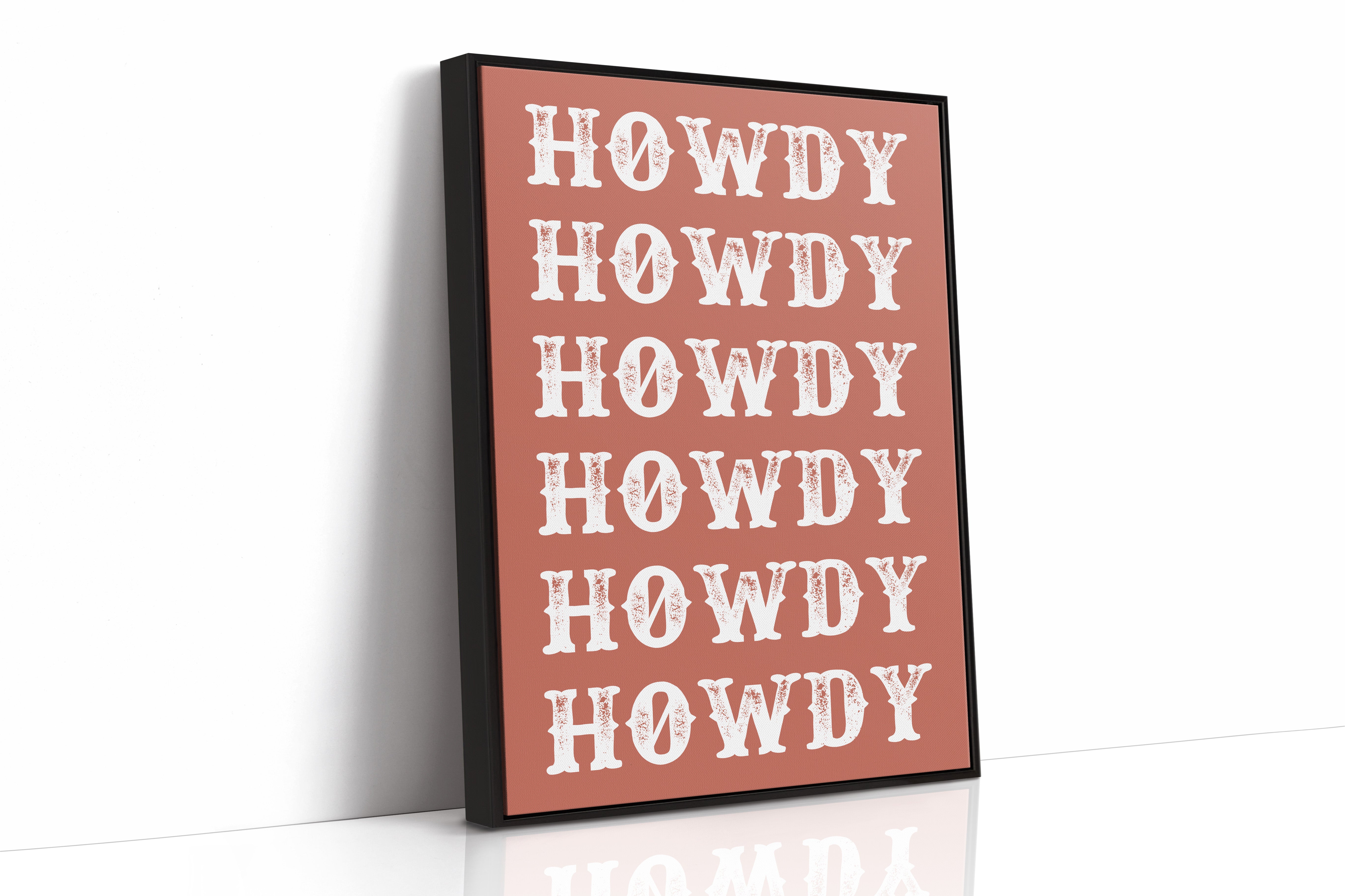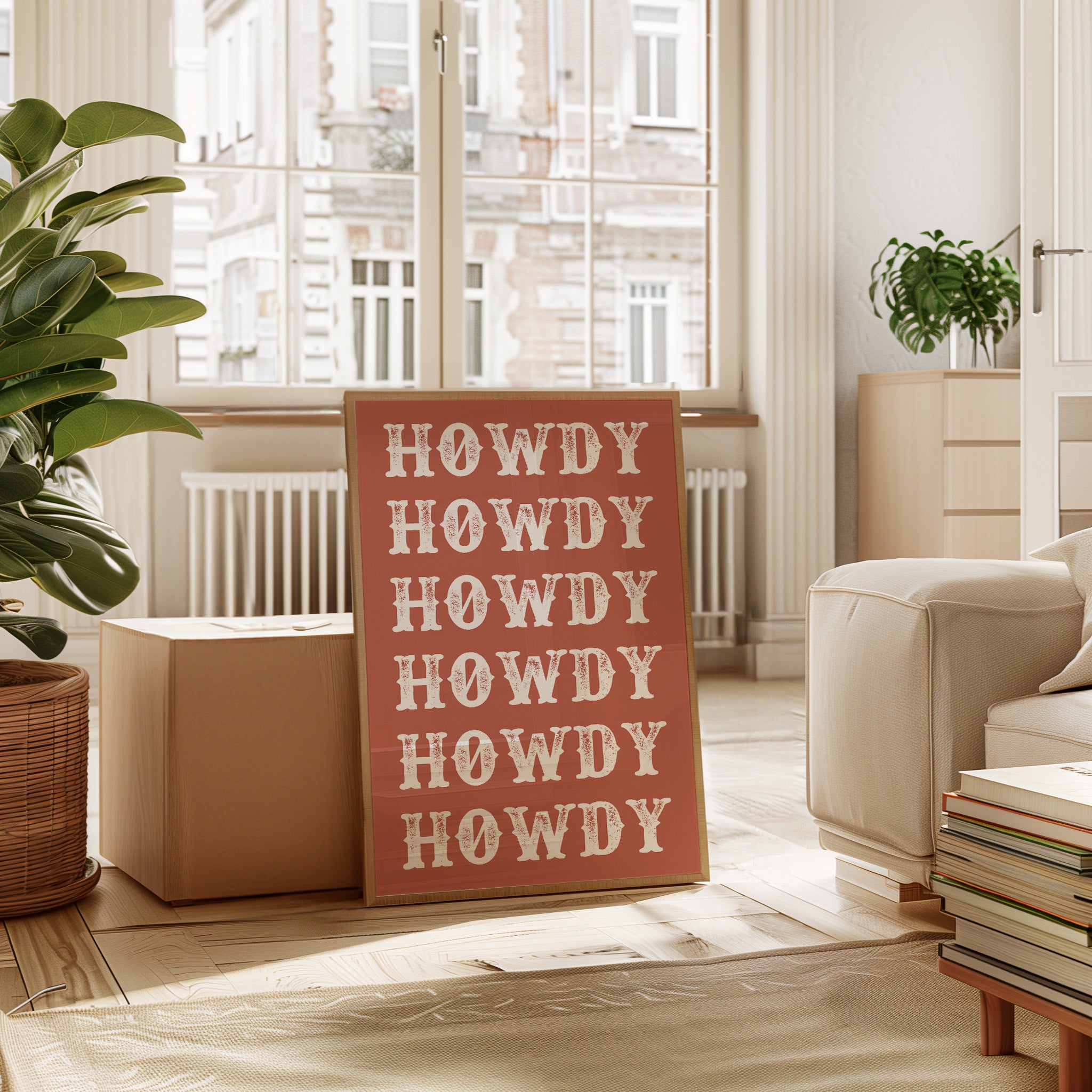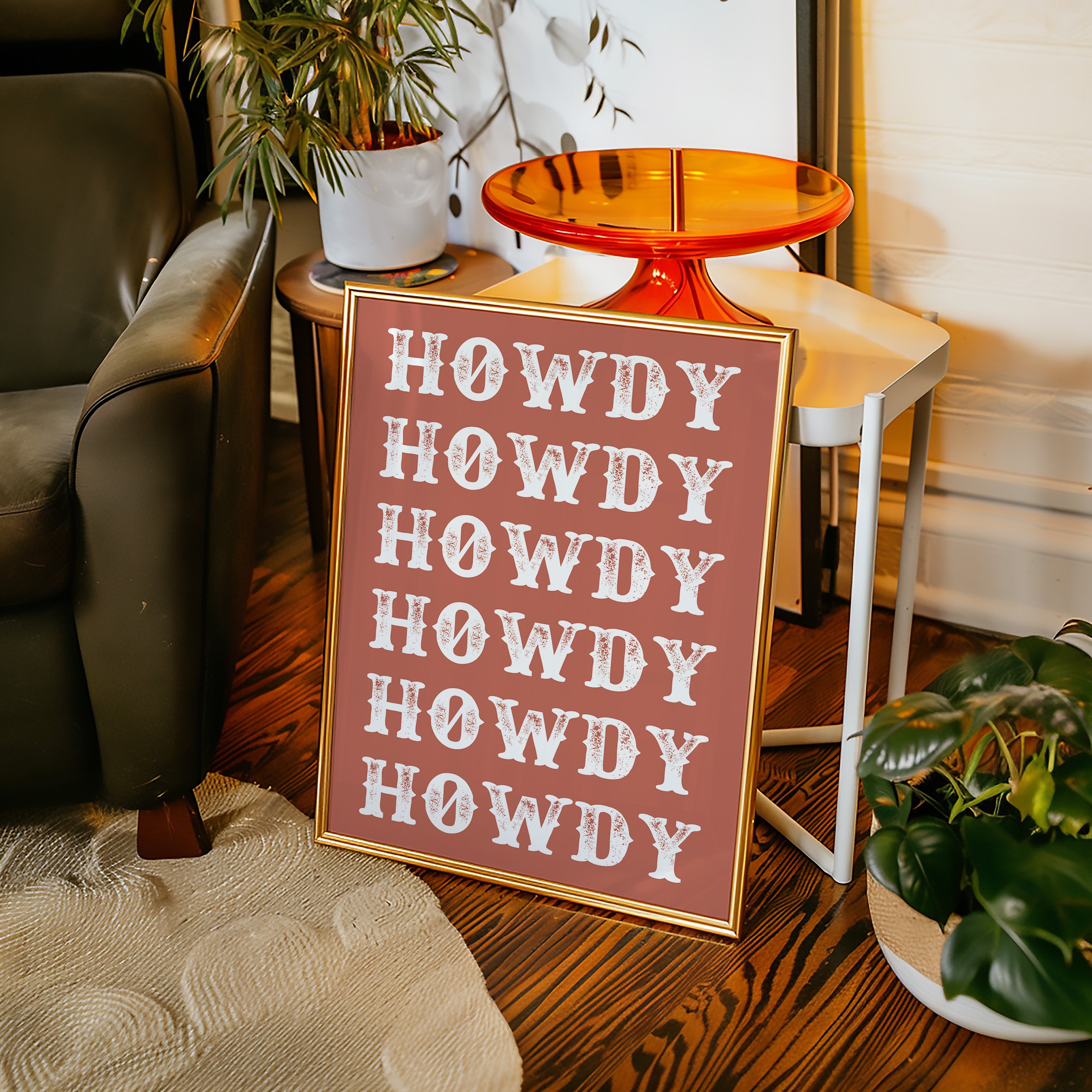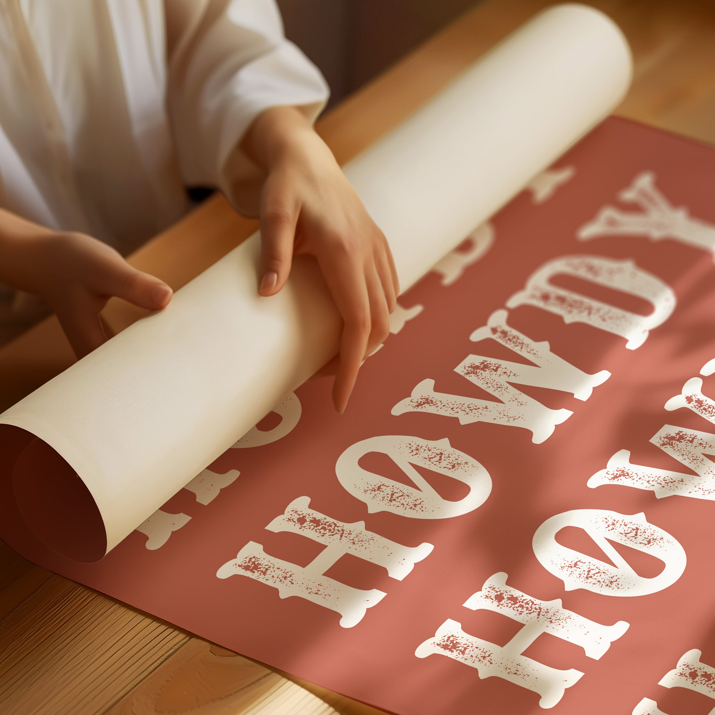 A playful repetition of western warmth meets minimalist charm in this striking composition. This piece from our Contemporary collection marries modern typography with classic southwestern spirit. Against a terra cotta backdrop, bold white letters dance with vintage character, while a lone cactus stands sentinel nearby, creating a perfect balance of whimsy and desert sophistication. The weathered wooden bench and textured wall provide an authentic backdrop that grounds the modern design in timeless appeal. Perfect for bringing personality to a modern farmhouse kitchen, casual dining space, or anywhere that needs a touch of western hospitality. Each viewing invites guests to feel instantly at home with its cheerful, repeated welcome.