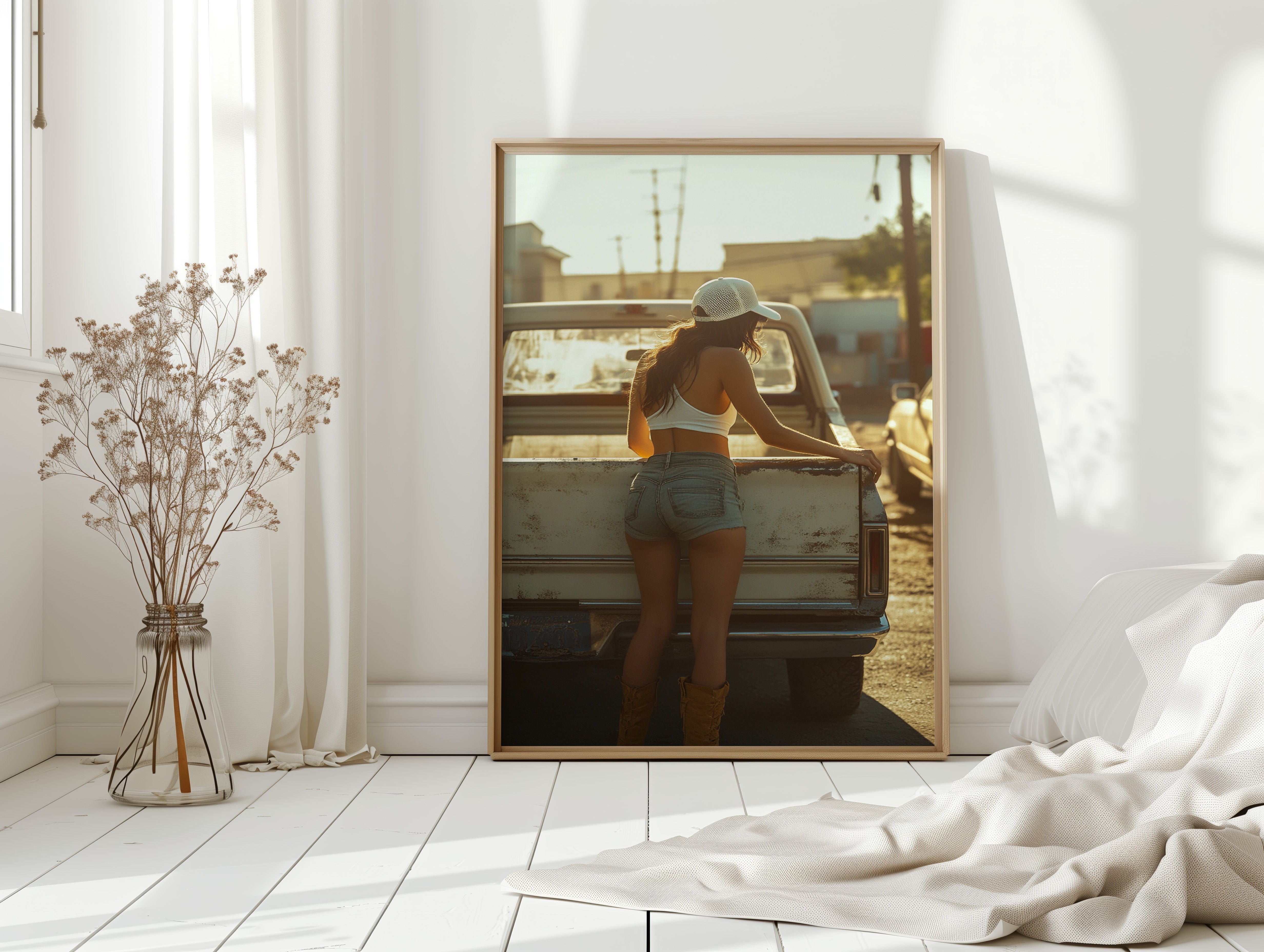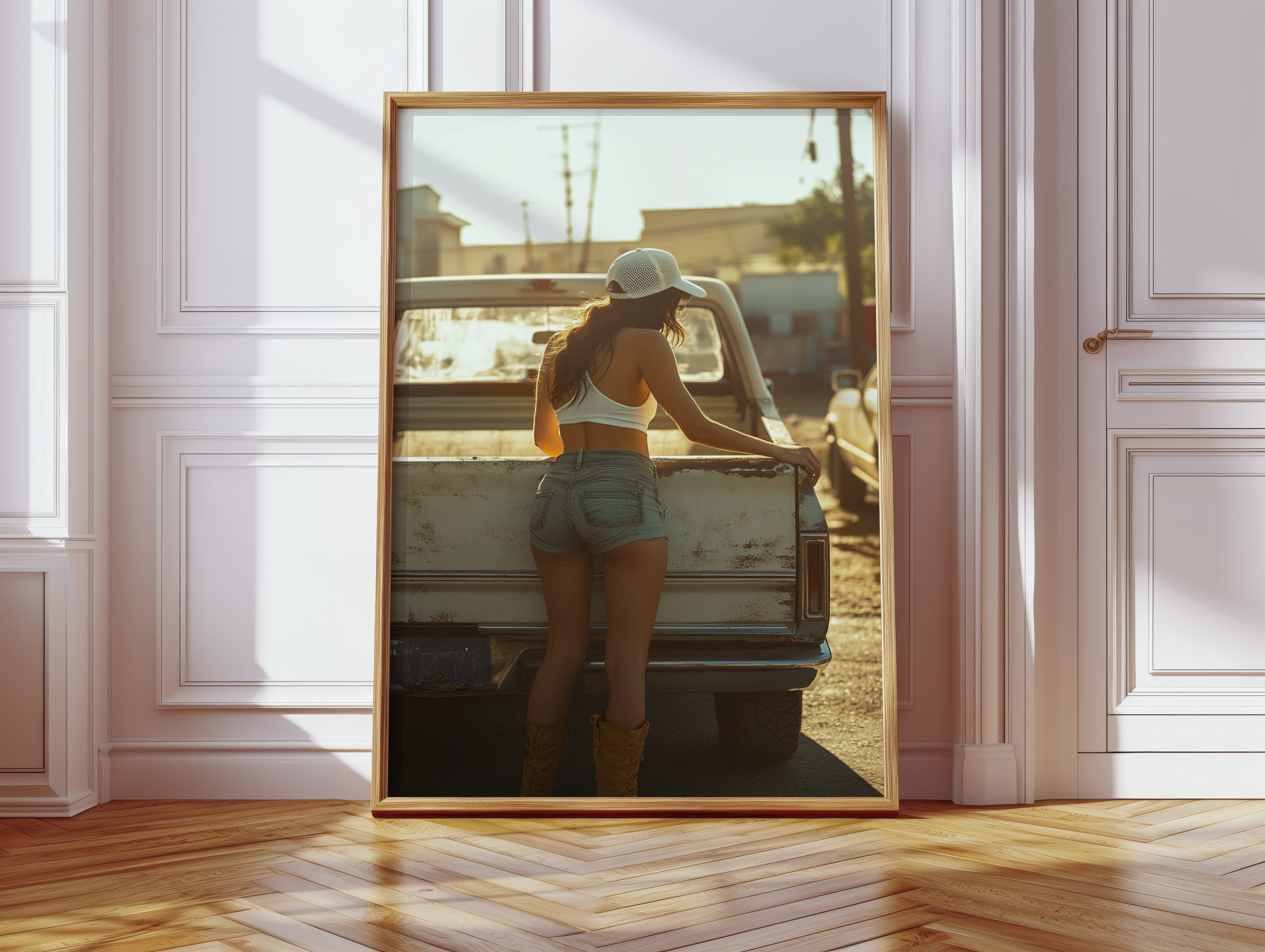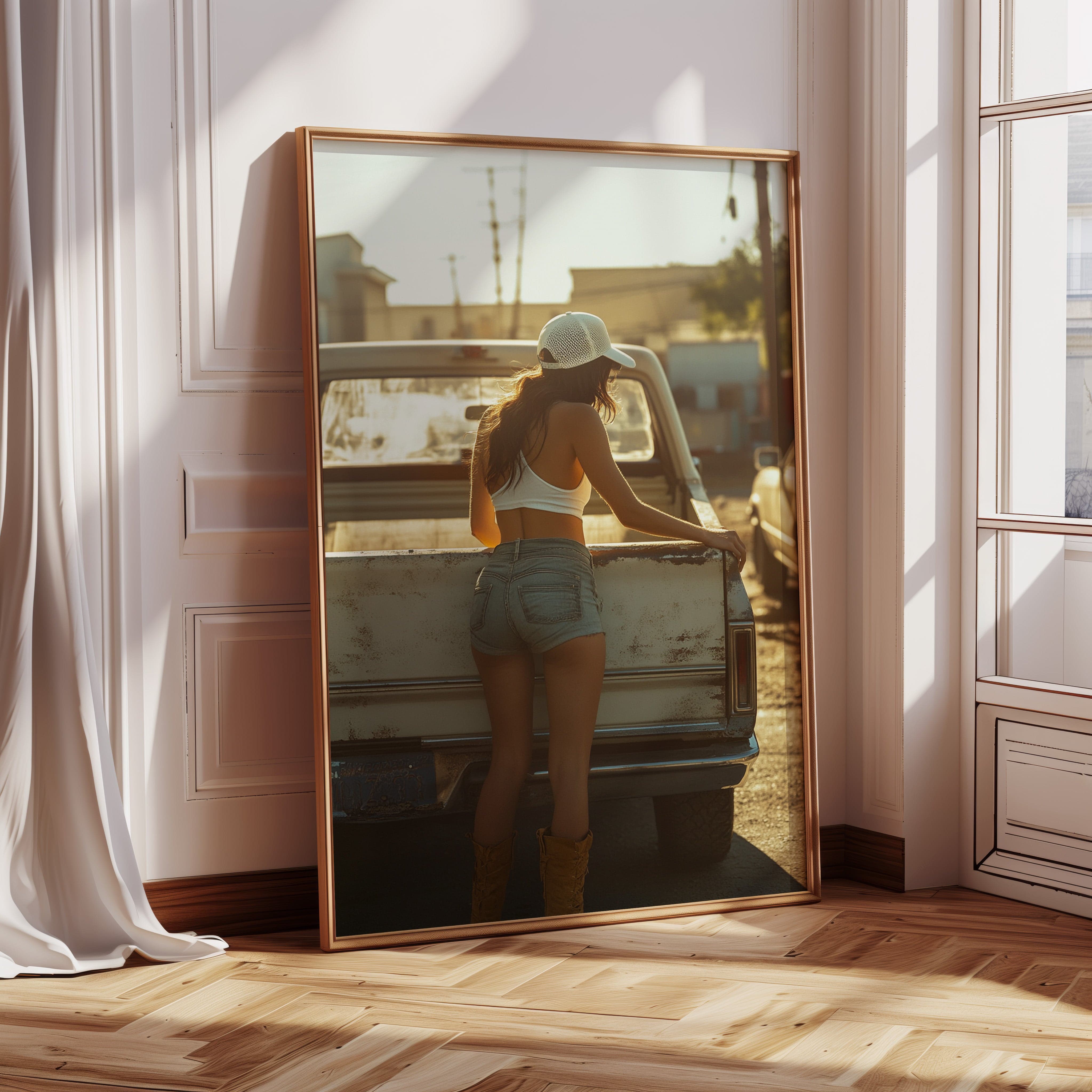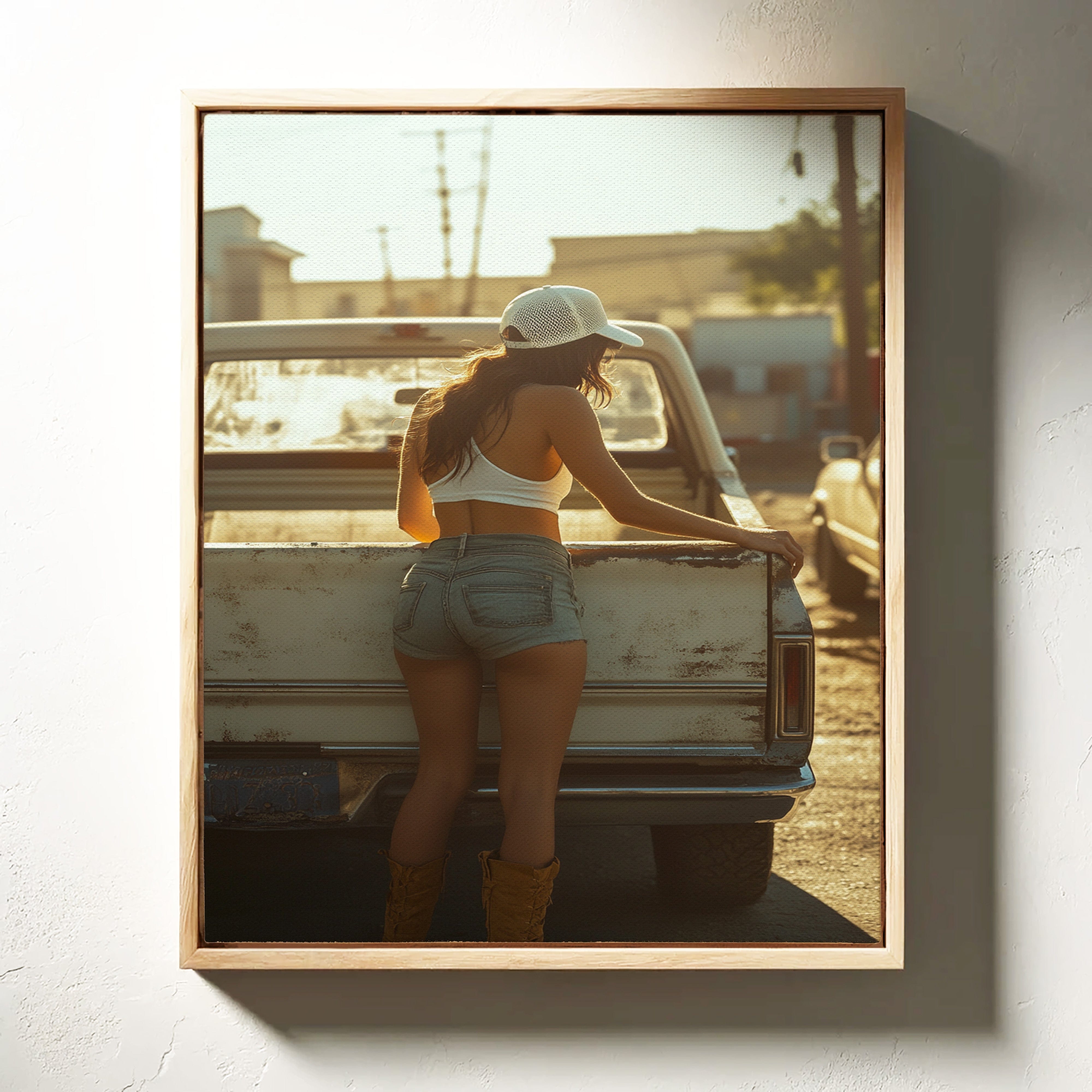 Radiating golden hour vibes and vintage attitude, this evocative photo captures the spirit of modern Americana. A confident woman leans against an old pickup truck in cutoff shorts, boots, and a crop top, her figure bathed in warm desert sunlight. The dusty truck, glowing light, and casual pose evoke summer heat, small-town stories, and a retro Western feel — perfect for lovers of rustic charm and vintage glam.