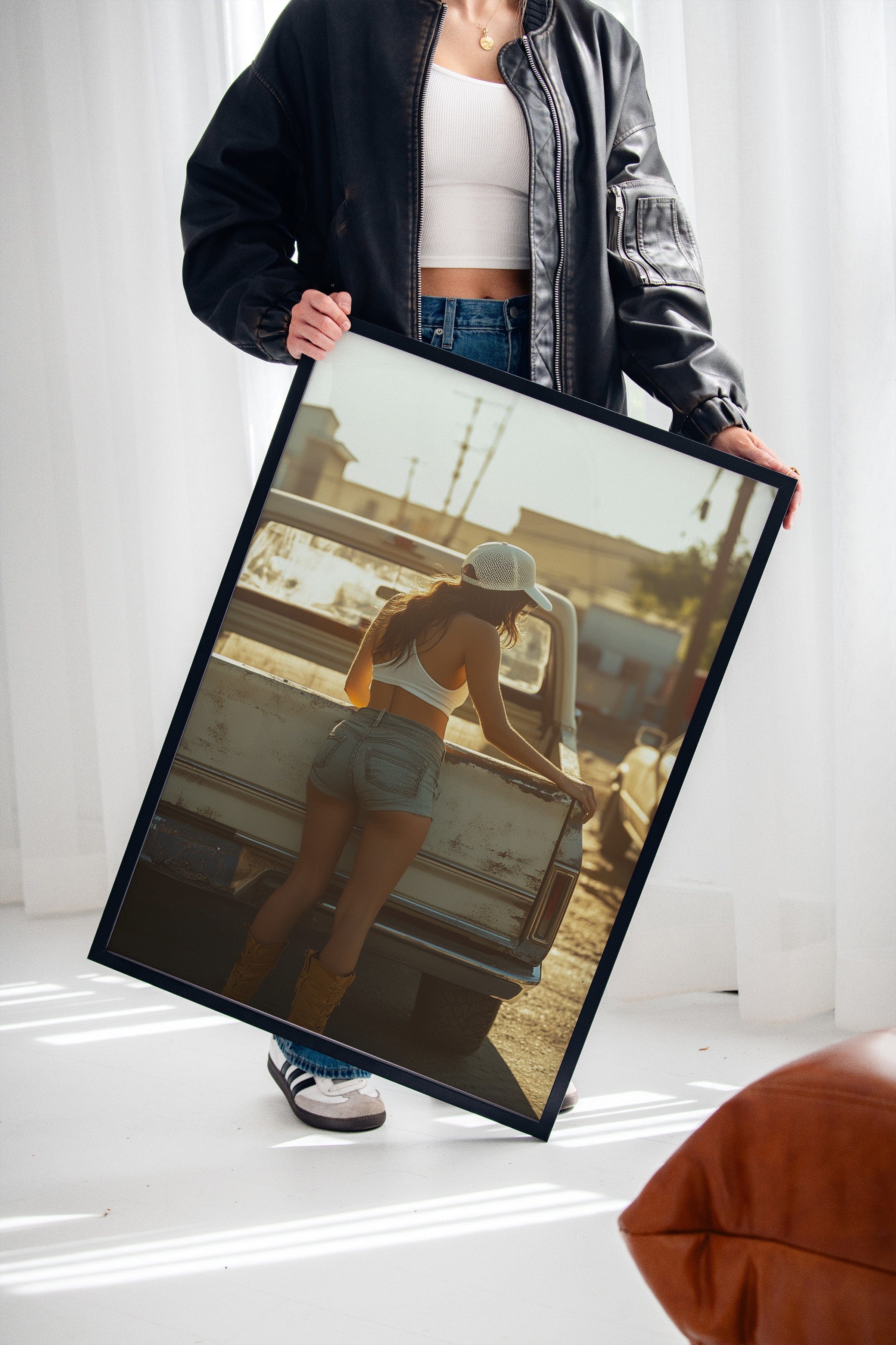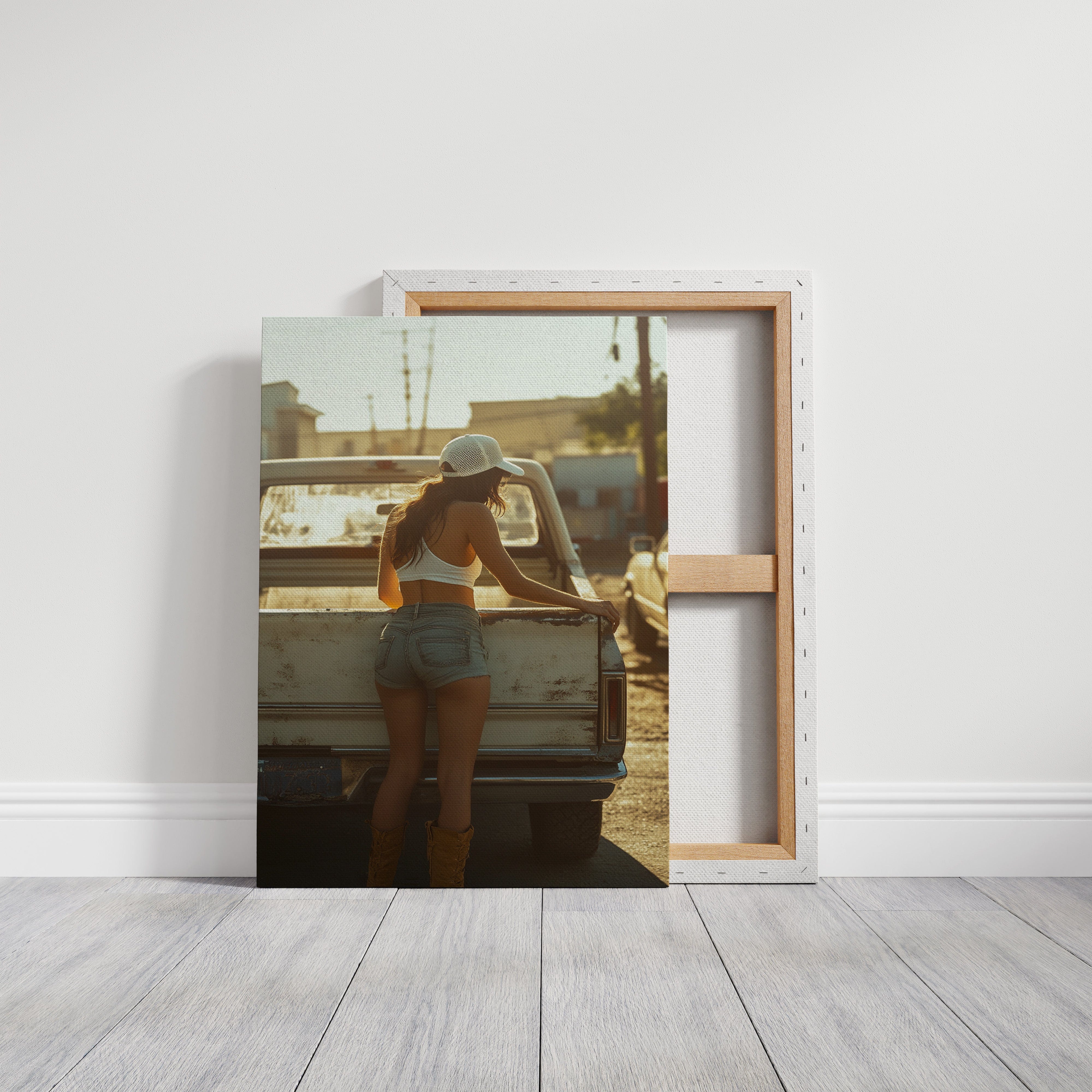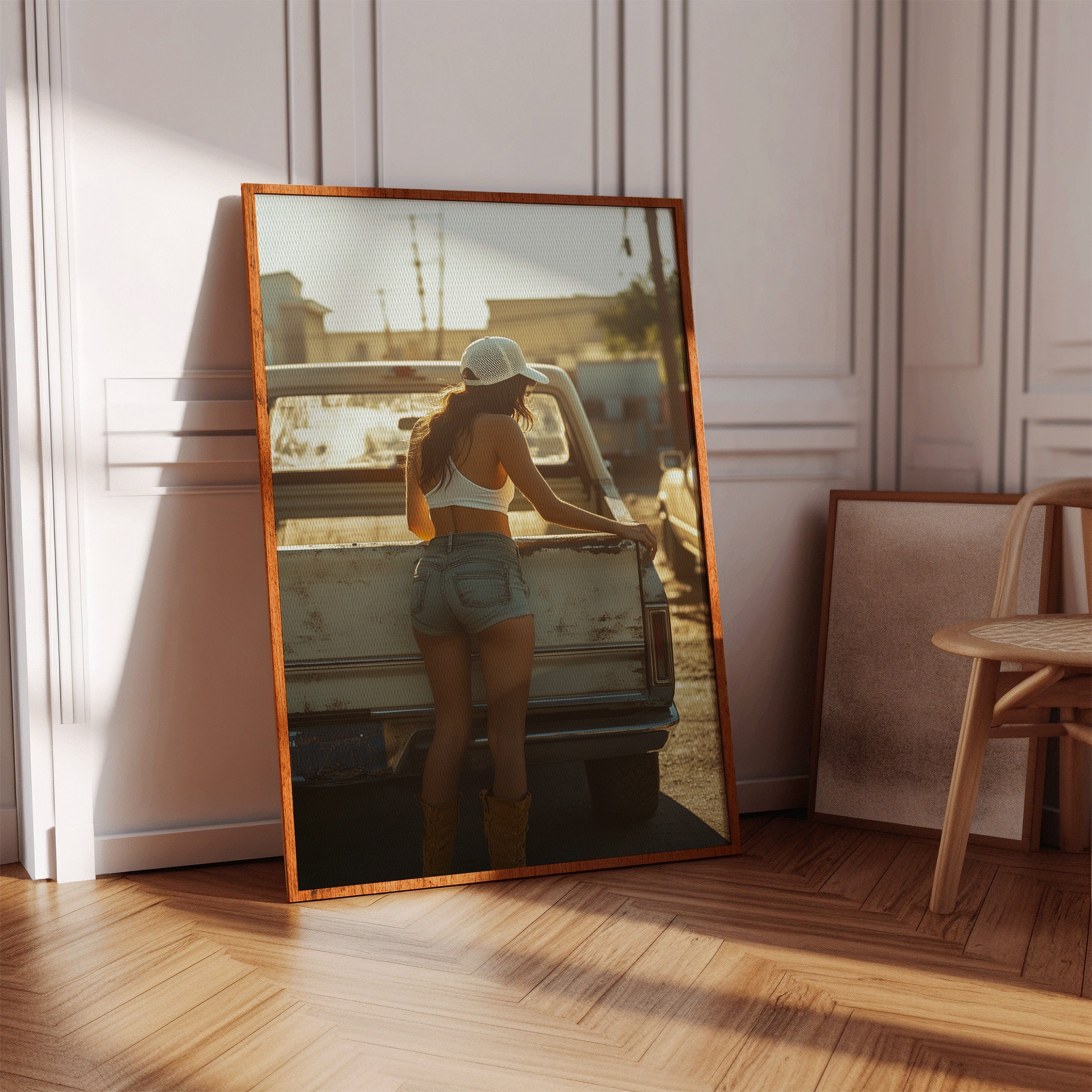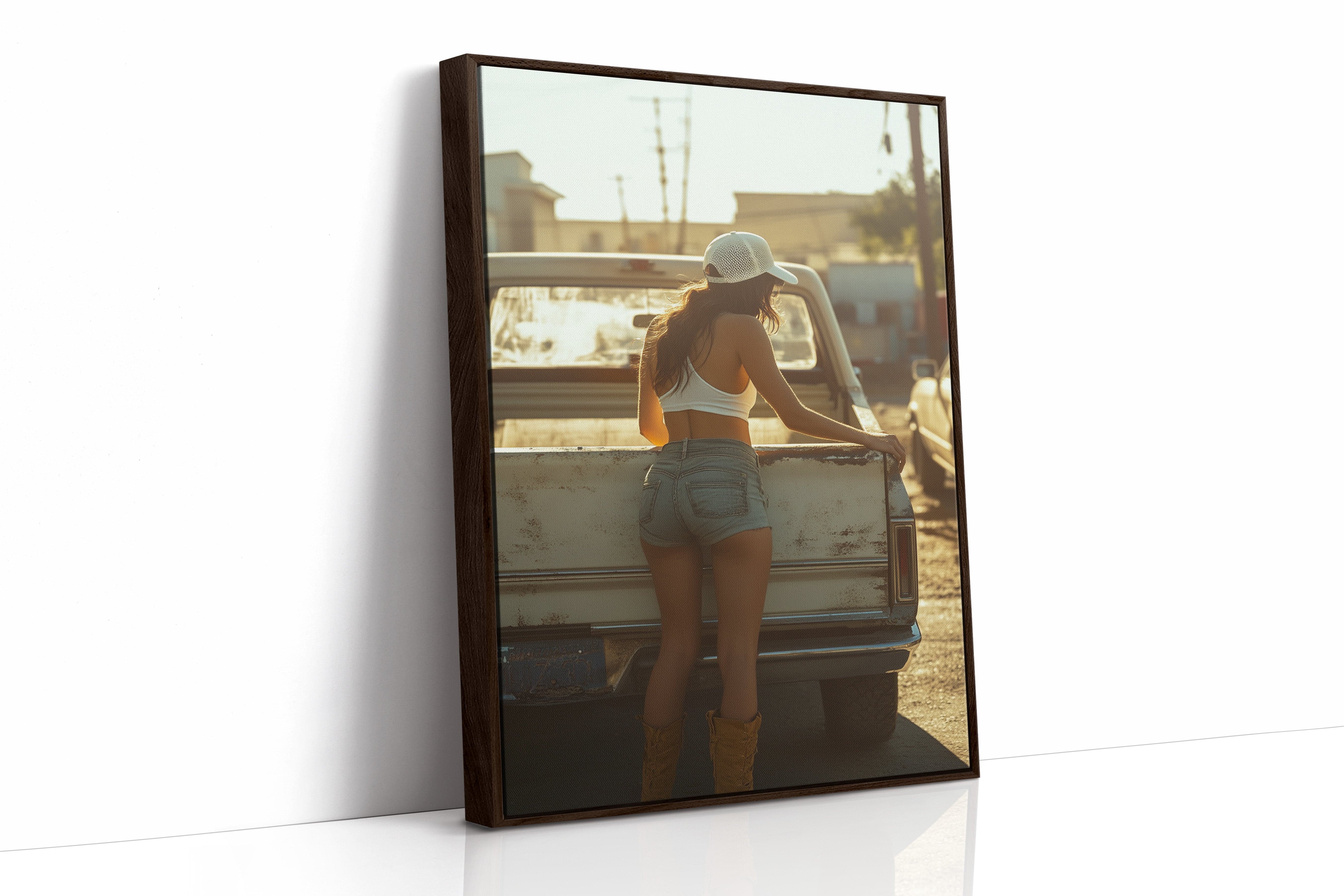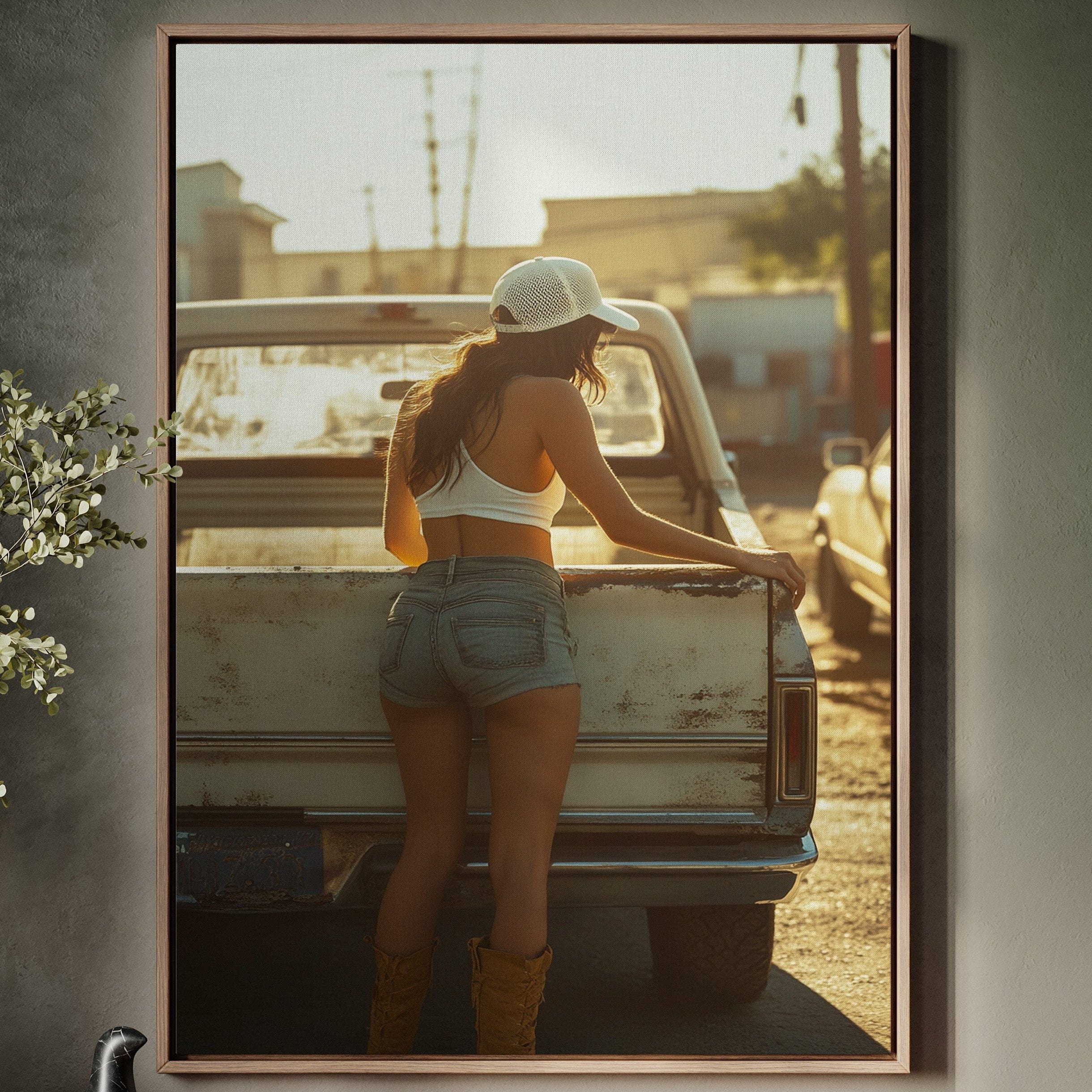 Radiating golden hour vibes and vintage attitude, this evocative photo captures the spirit of modern Americana. A confident woman leans against an old pickup truck in cutoff shorts, boots, and a crop top, her figure bathed in warm desert sunlight. The dusty truck, glowing light, and casual pose evoke summer heat, small-town stories, and a retro Western feel — perfect for lovers of rustic charm and vintage glam.