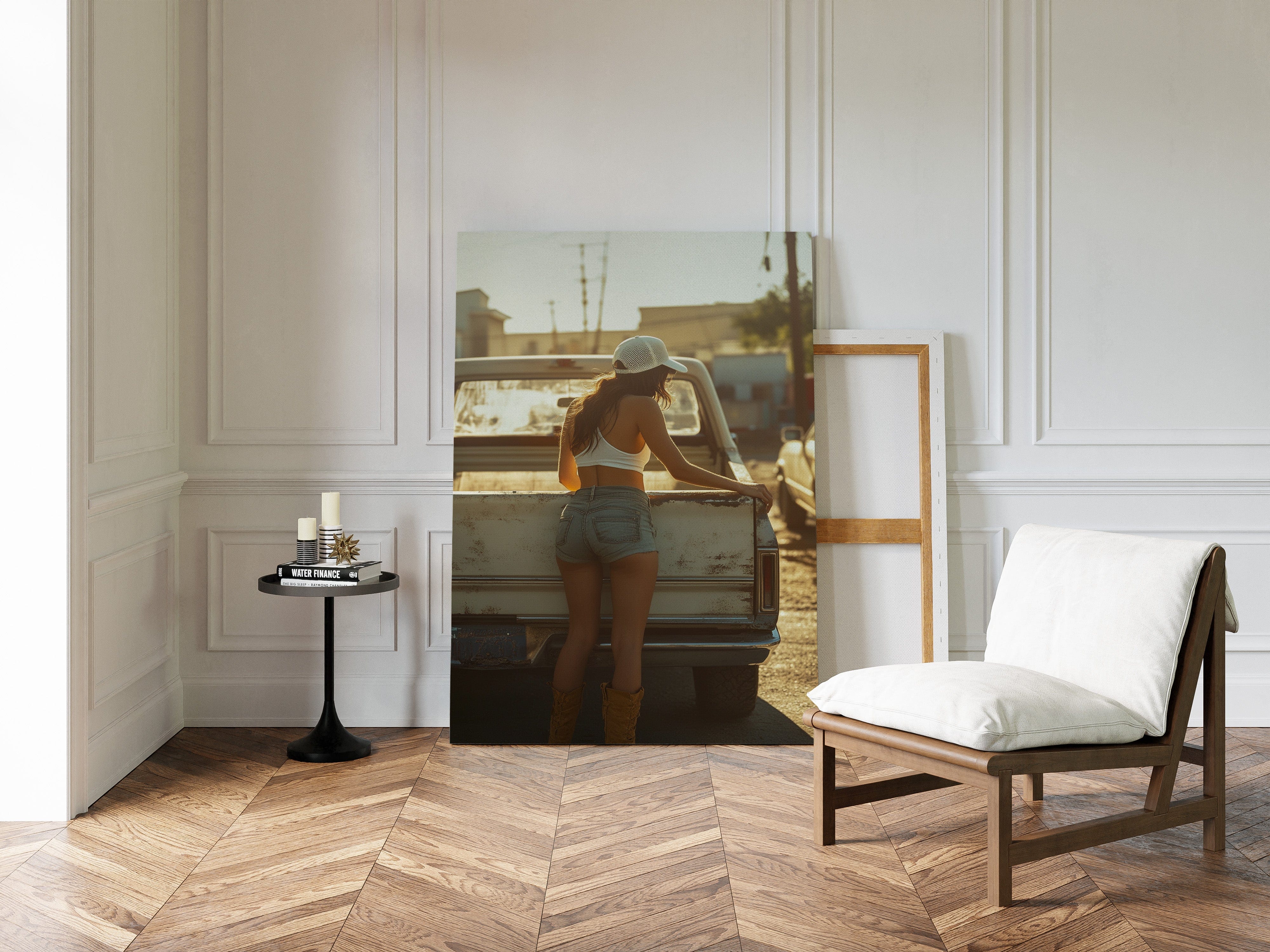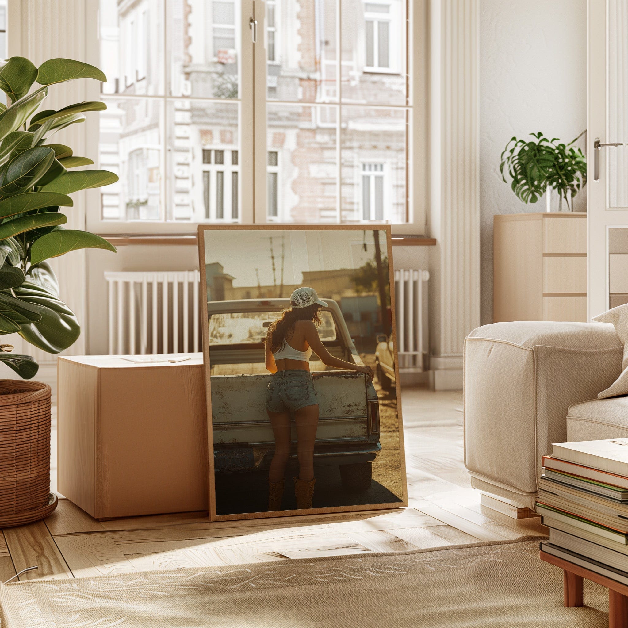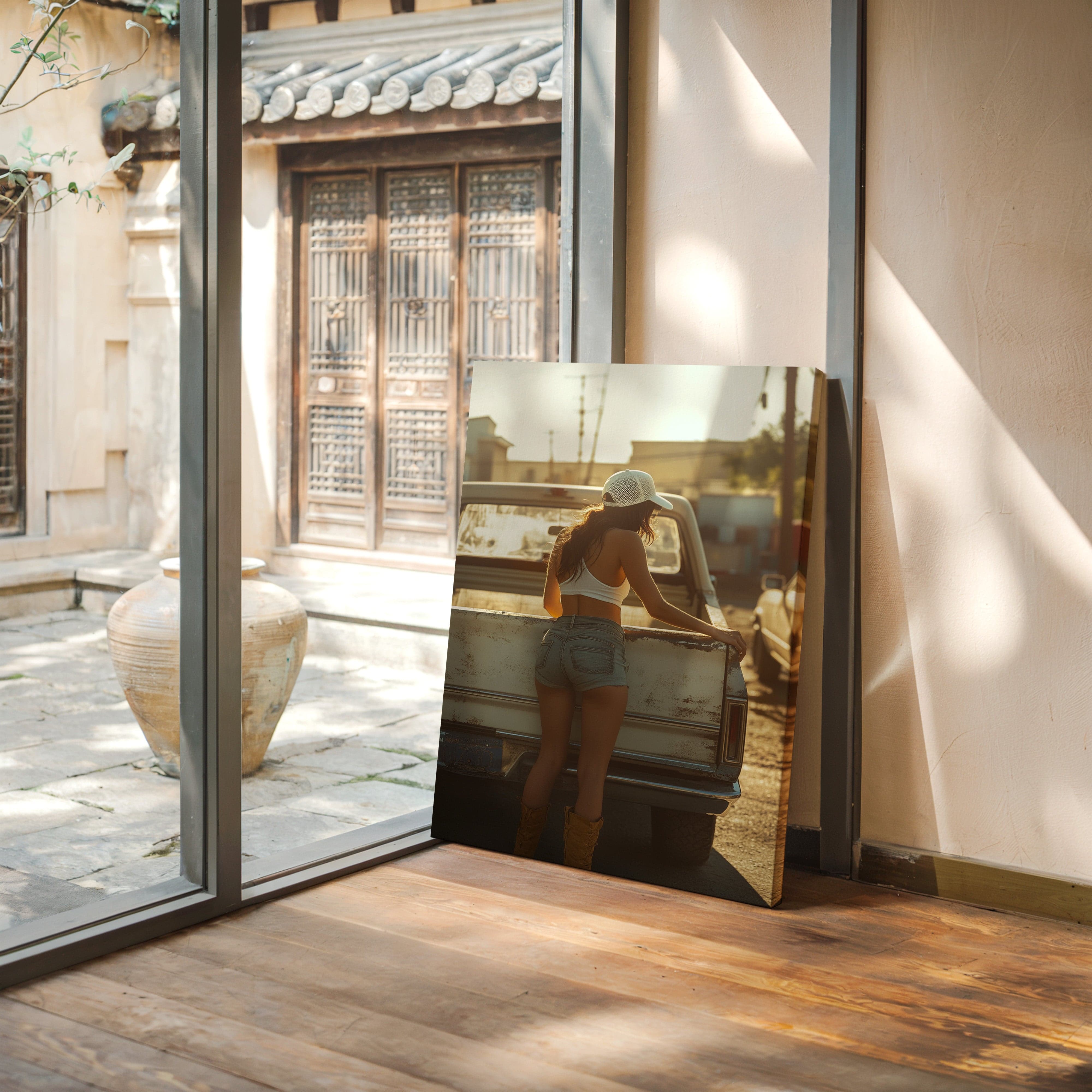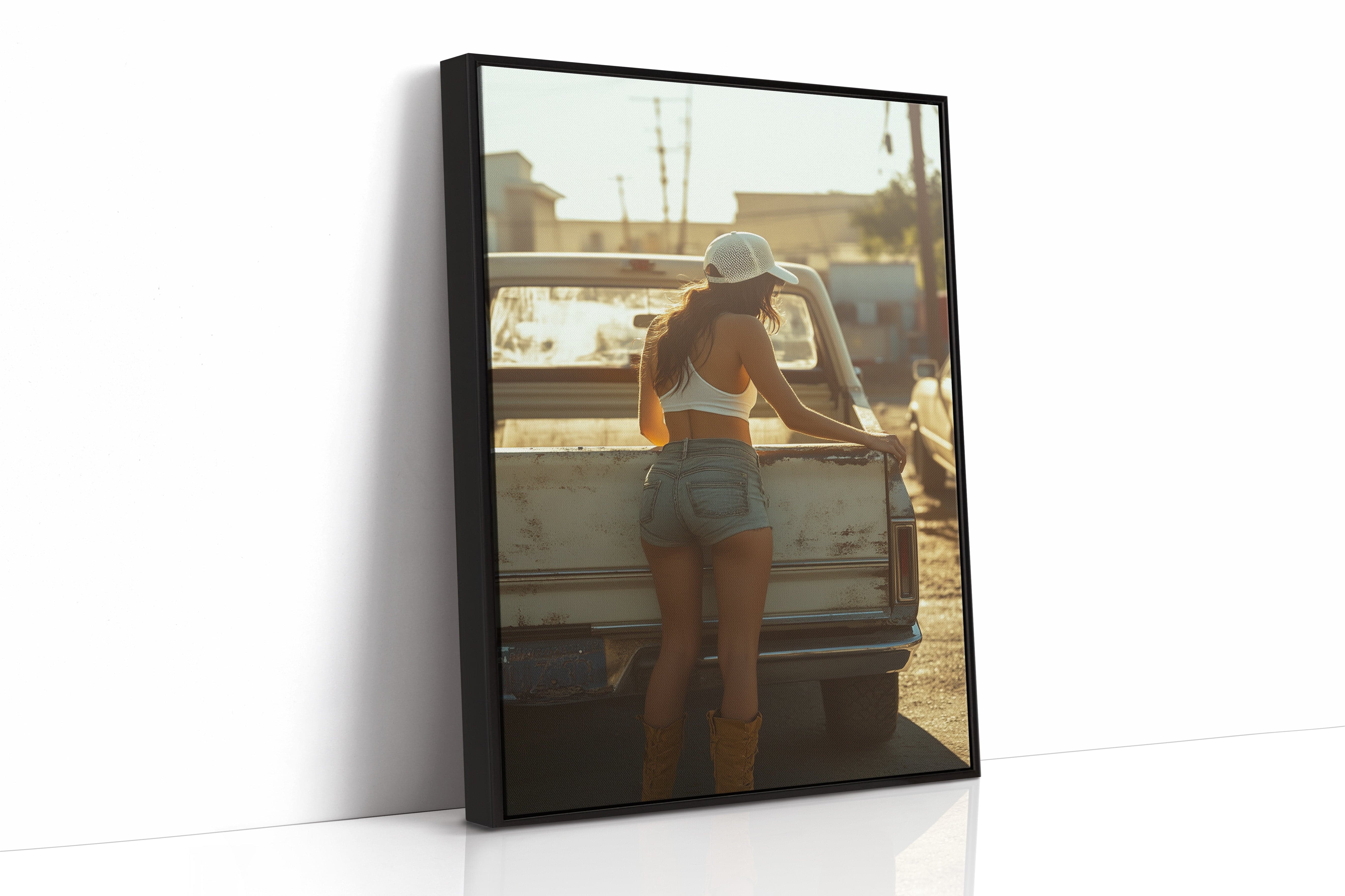 Radiating golden hour vibes and vintage attitude, this evocative photo captures the spirit of modern Americana. A confident woman leans against an old pickup truck in cutoff shorts, boots, and a crop top, her figure bathed in warm desert sunlight. The dusty truck, glowing light, and casual pose evoke summer heat, small-town stories, and a retro Western feel — perfect for lovers of rustic charm and vintage glam.