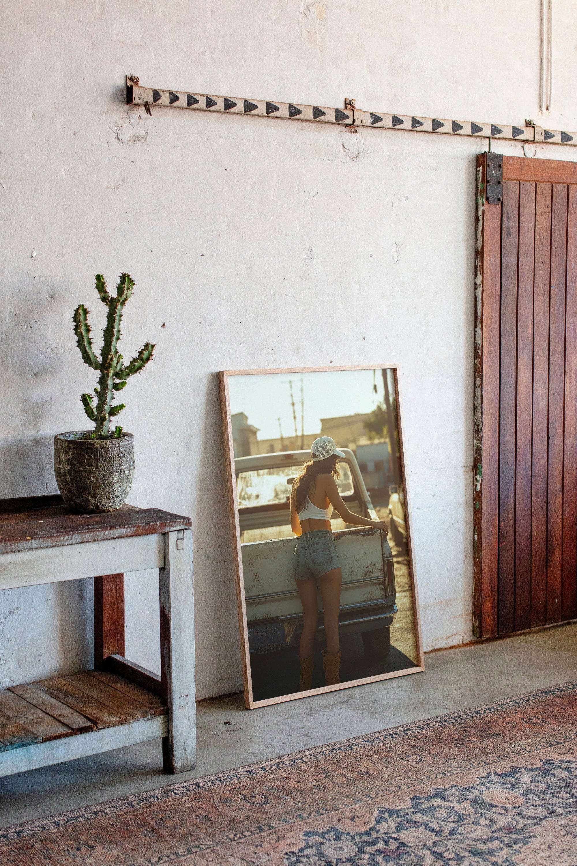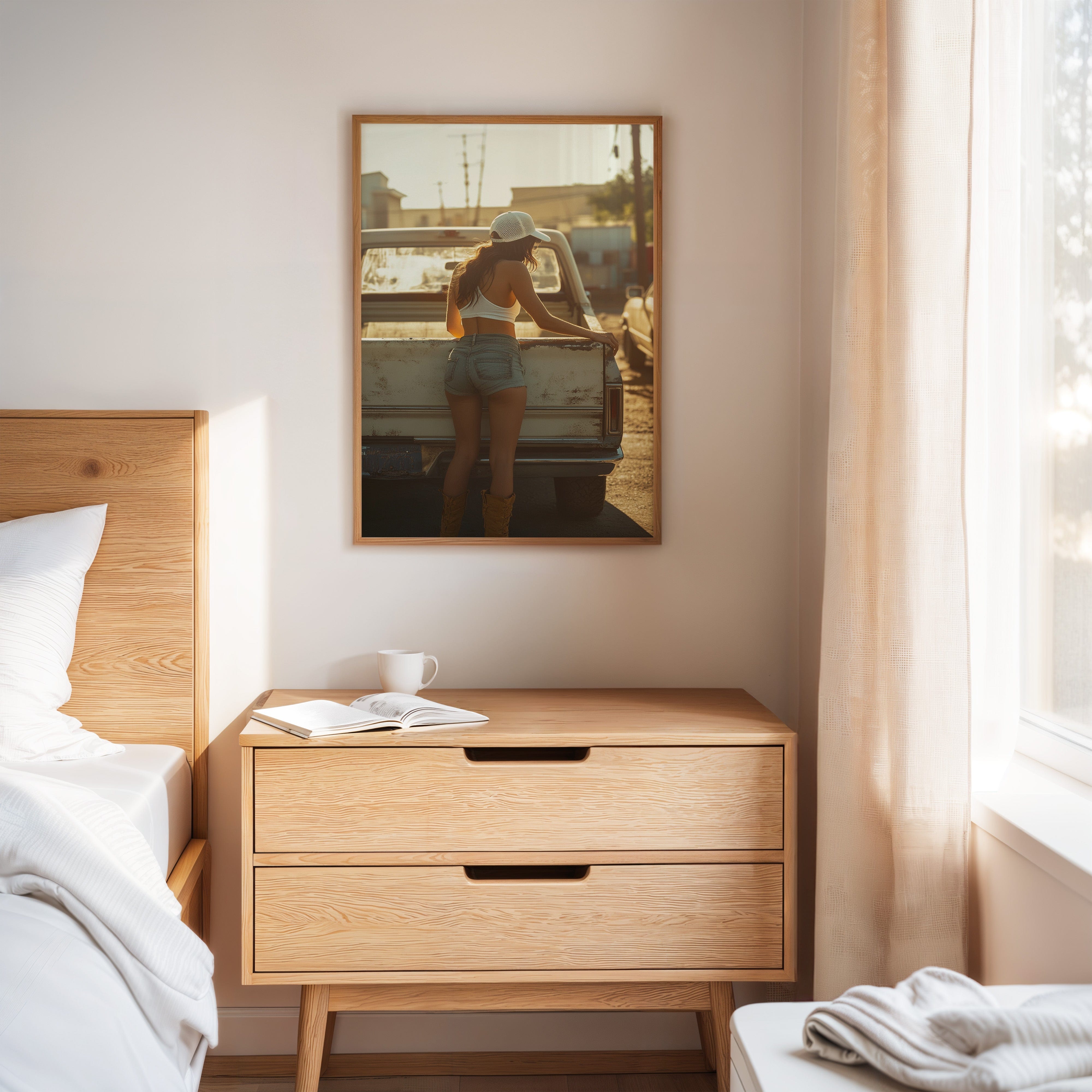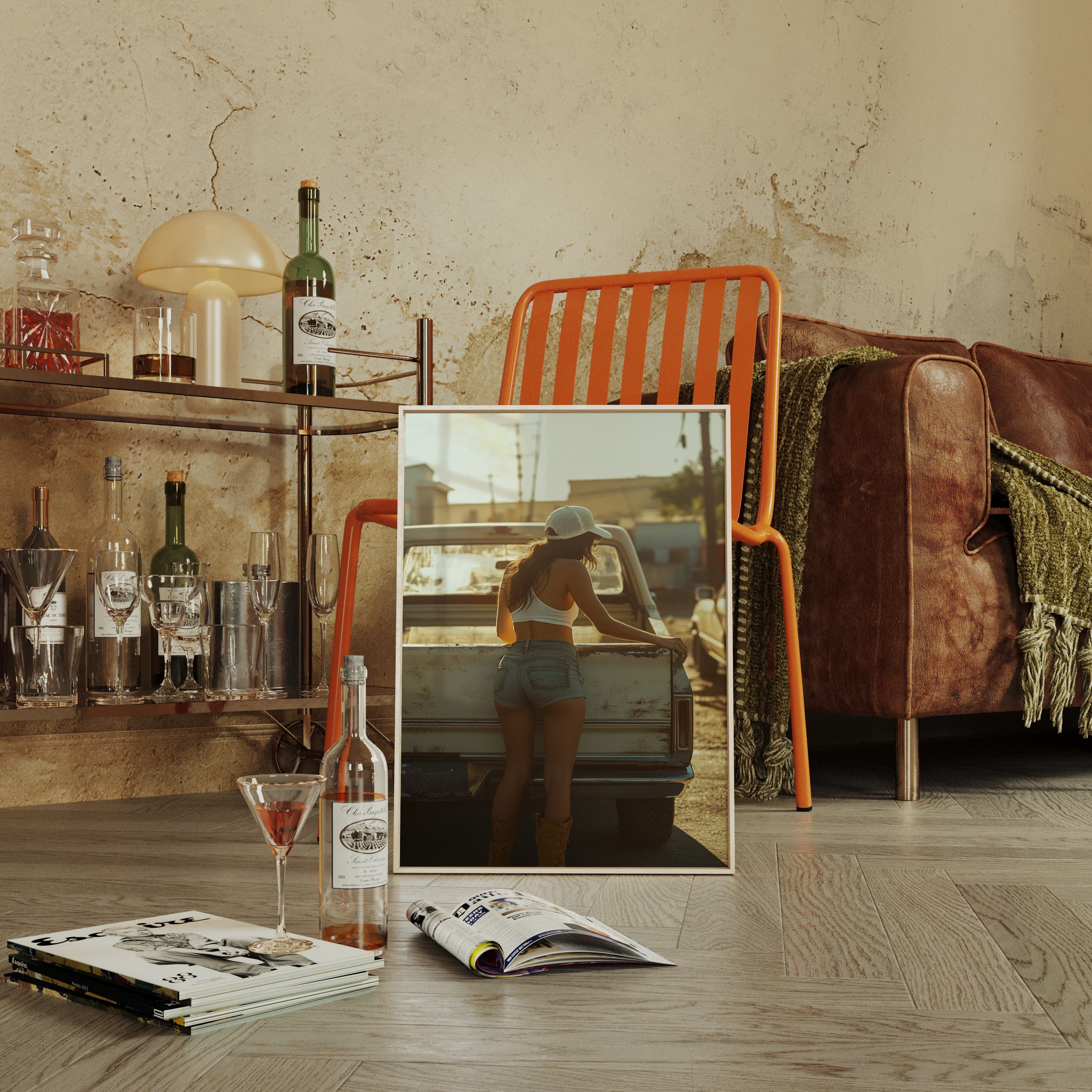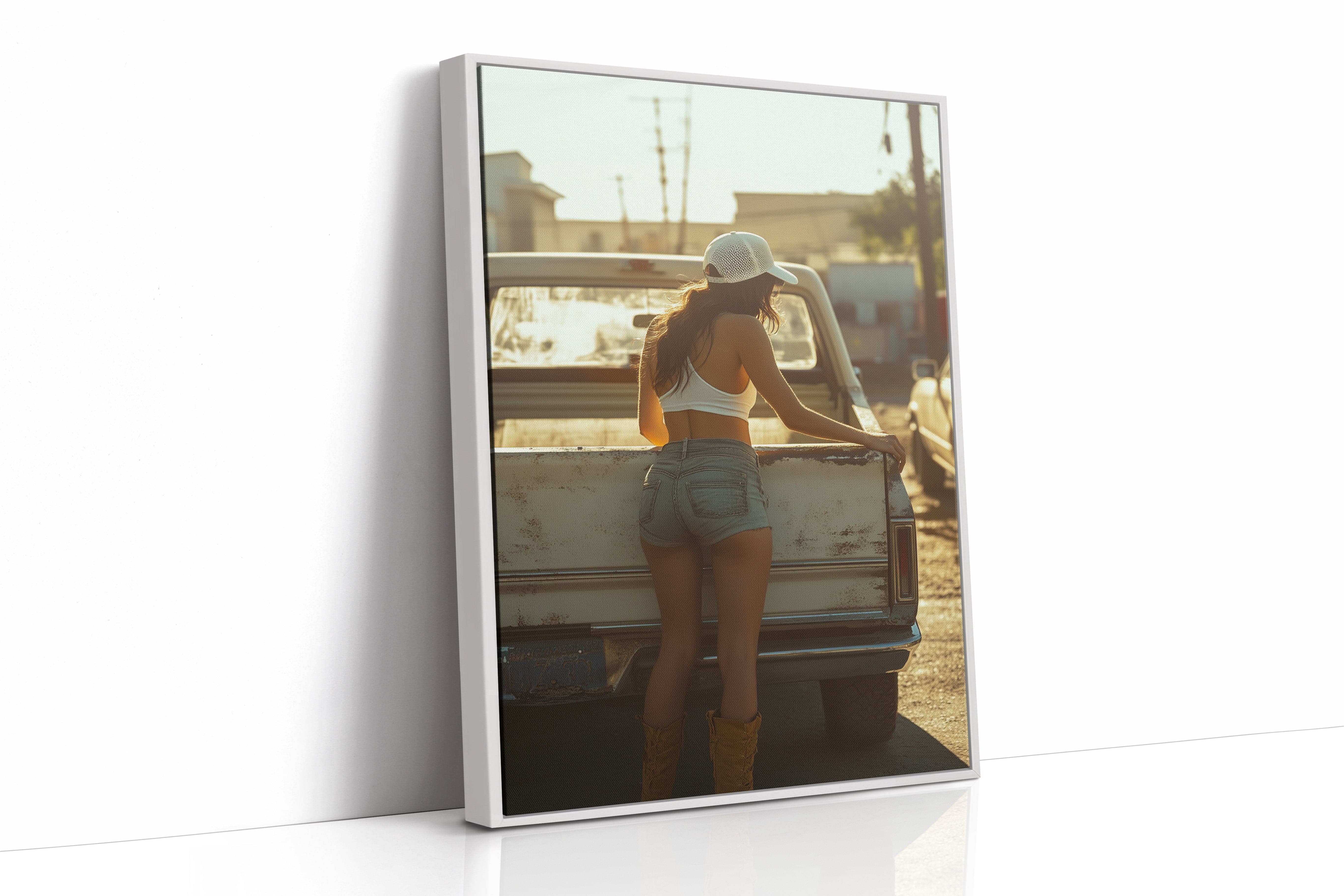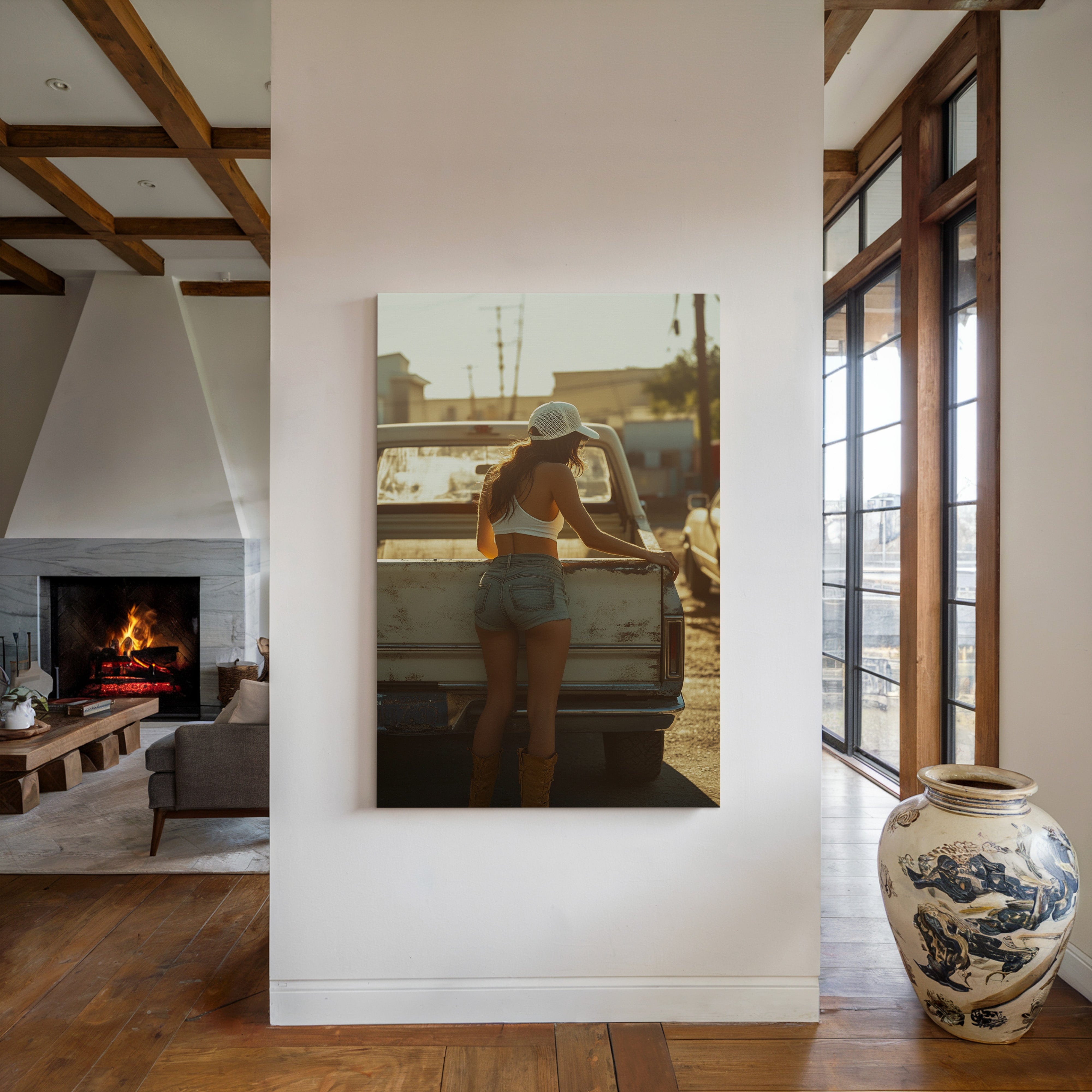 Radiating golden hour vibes and vintage attitude, this evocative photo captures the spirit of modern Americana. A confident woman leans against an old pickup truck in cutoff shorts, boots, and a crop top, her figure bathed in warm desert sunlight. The dusty truck, glowing light, and casual pose evoke summer heat, small-town stories, and a retro Western feel — perfect for lovers of rustic charm and vintage glam.