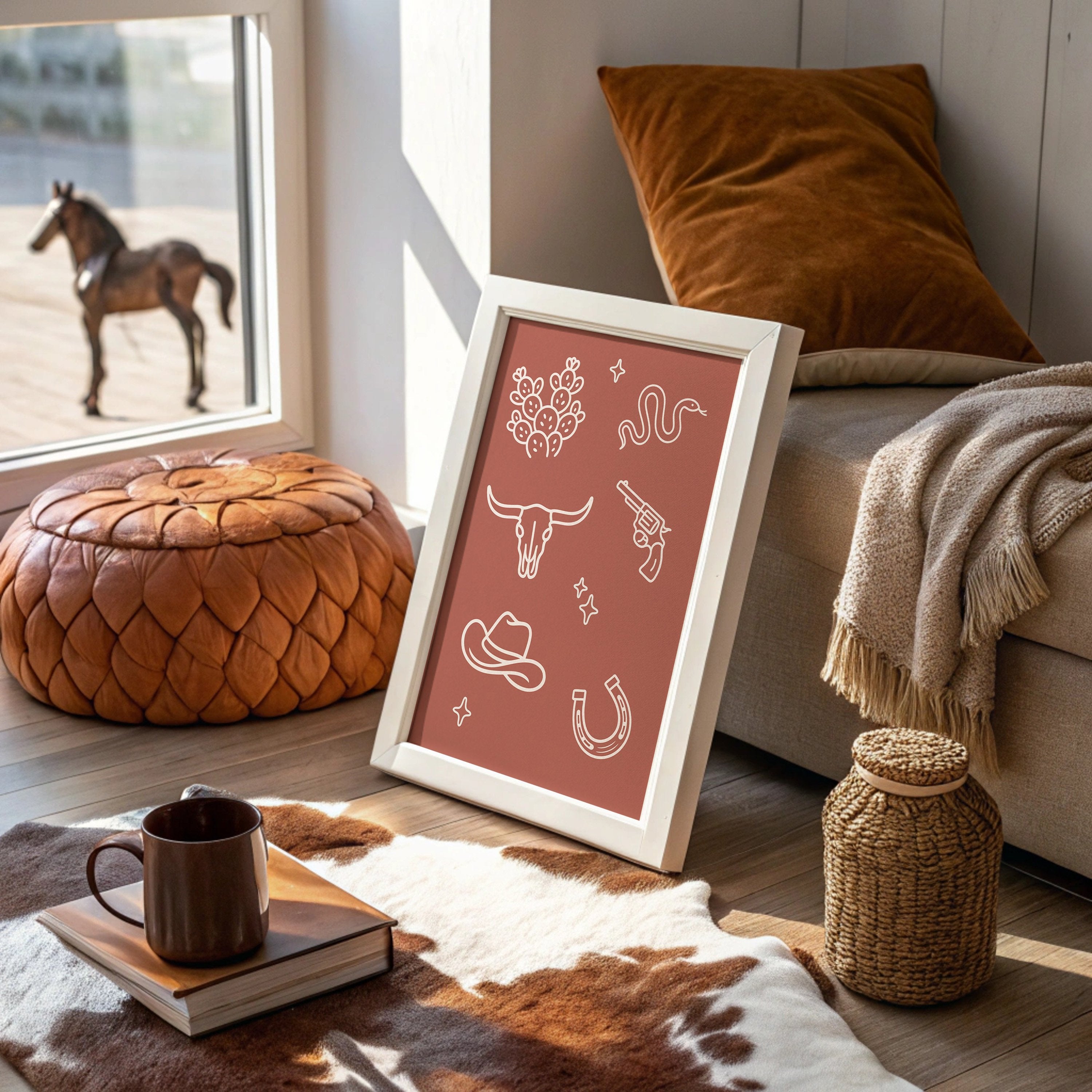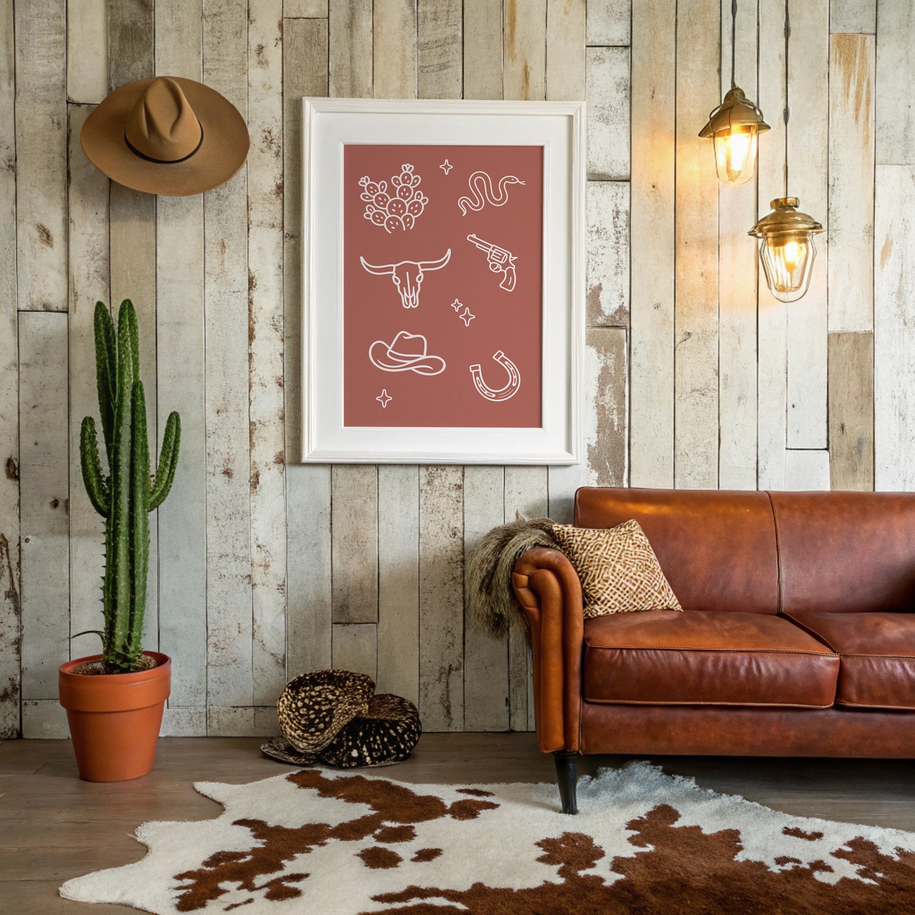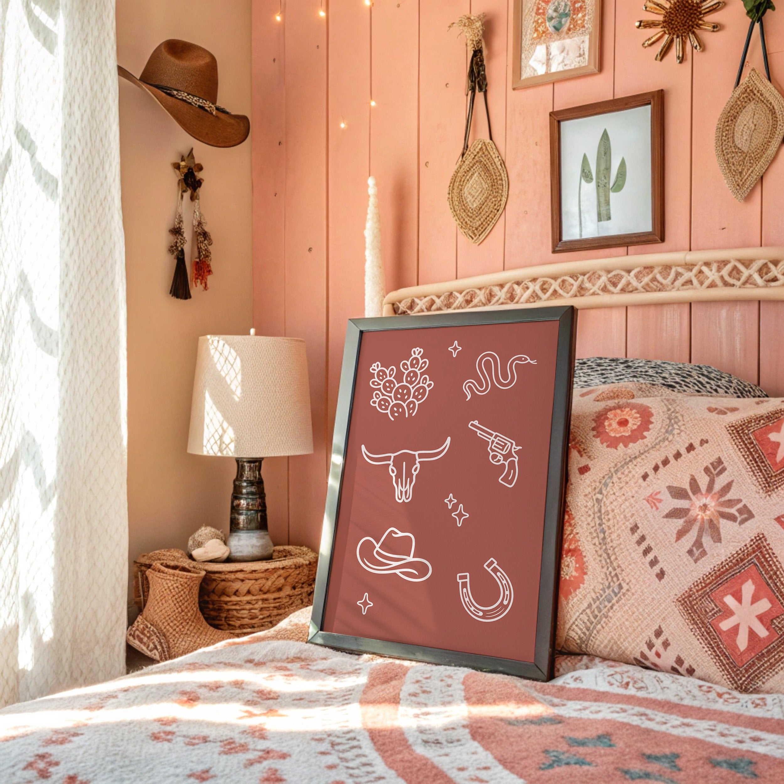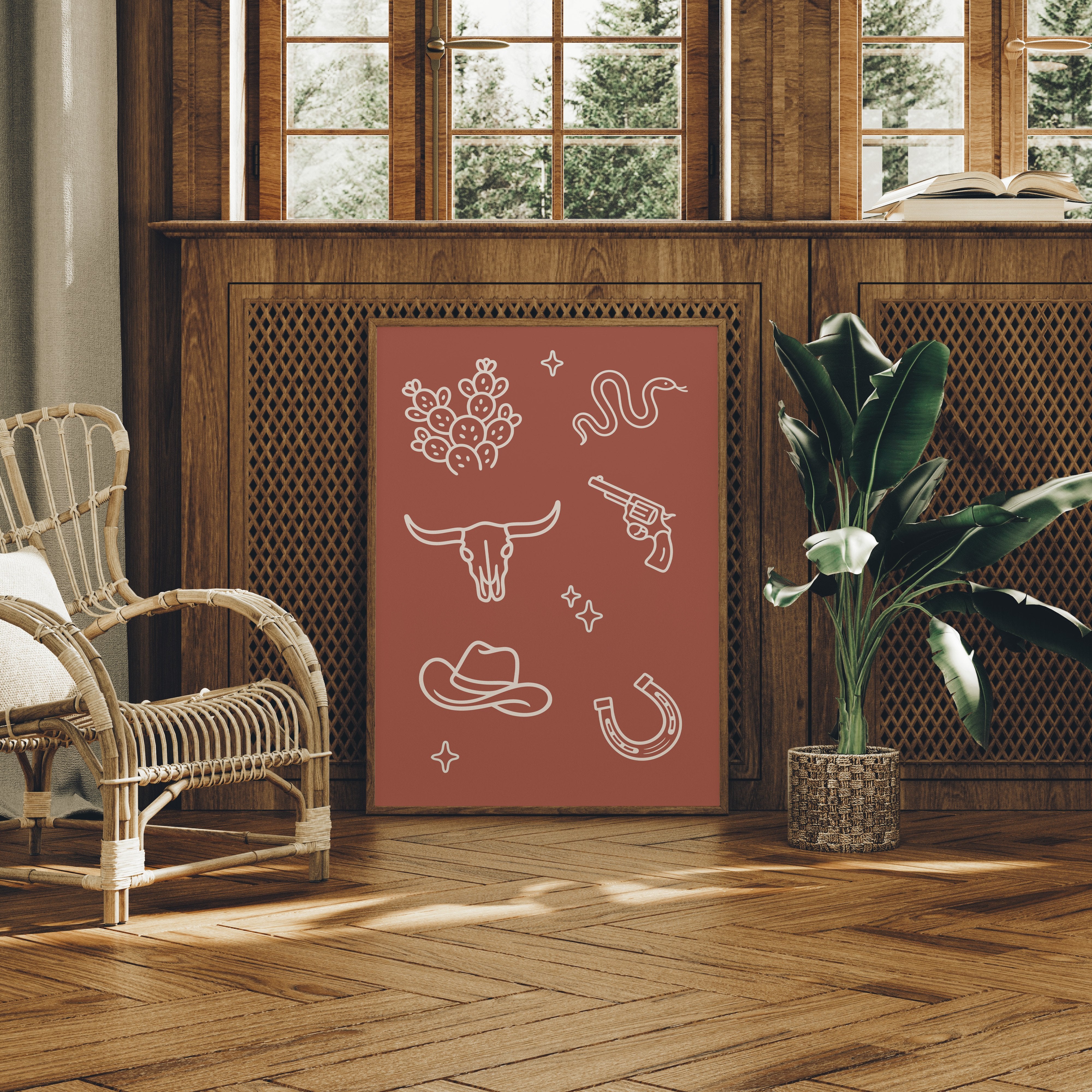 White line drawings float against a warm terracotta backdrop, each symbol telling a piece of the southwestern story. Cactus, snake, longhorn skull, and revolver mingle with cowboy hat and horseshoe, creating a modern interpretation of desert heritage. This minimalist collection of western motifs brings a contemporary southwestern vibe to any space.