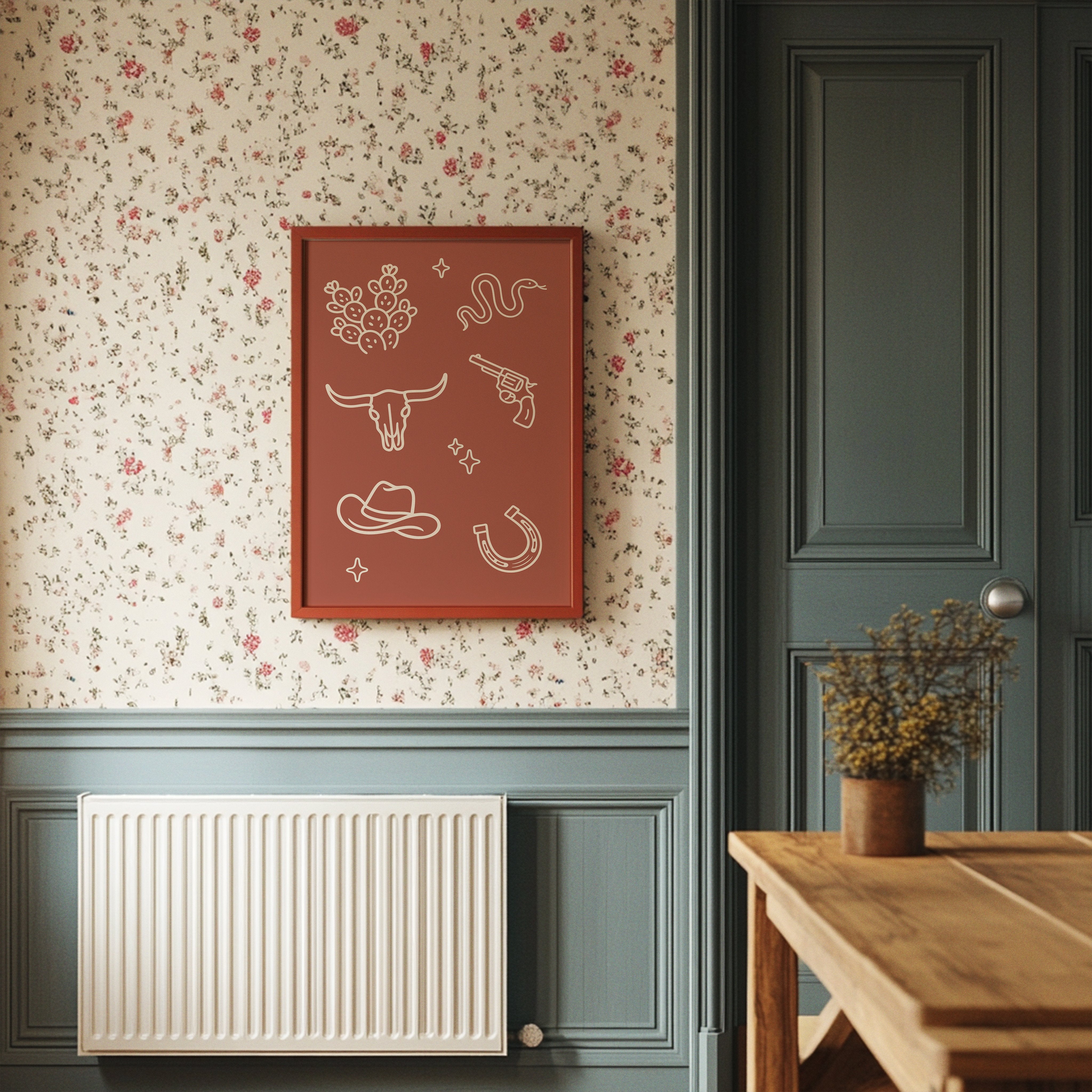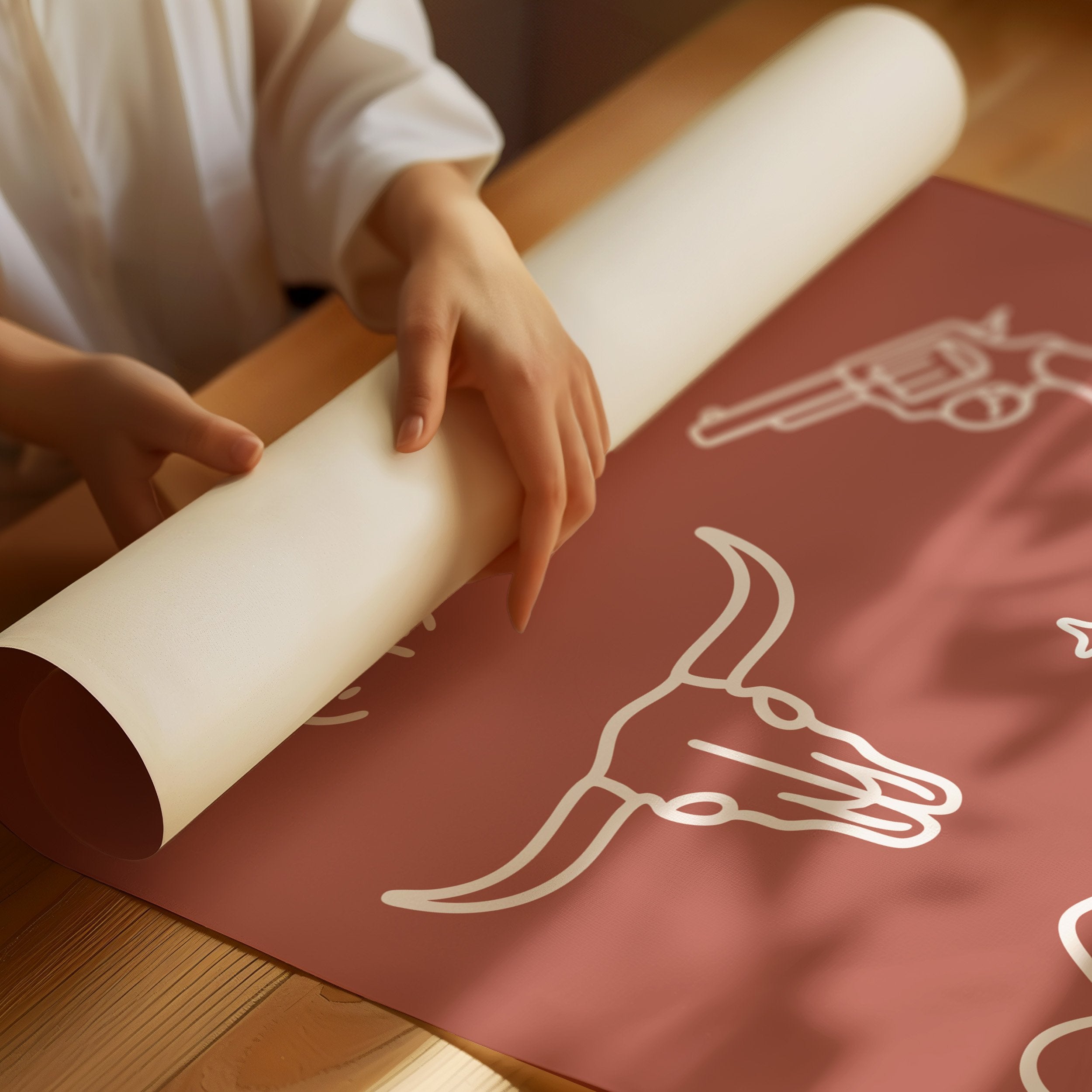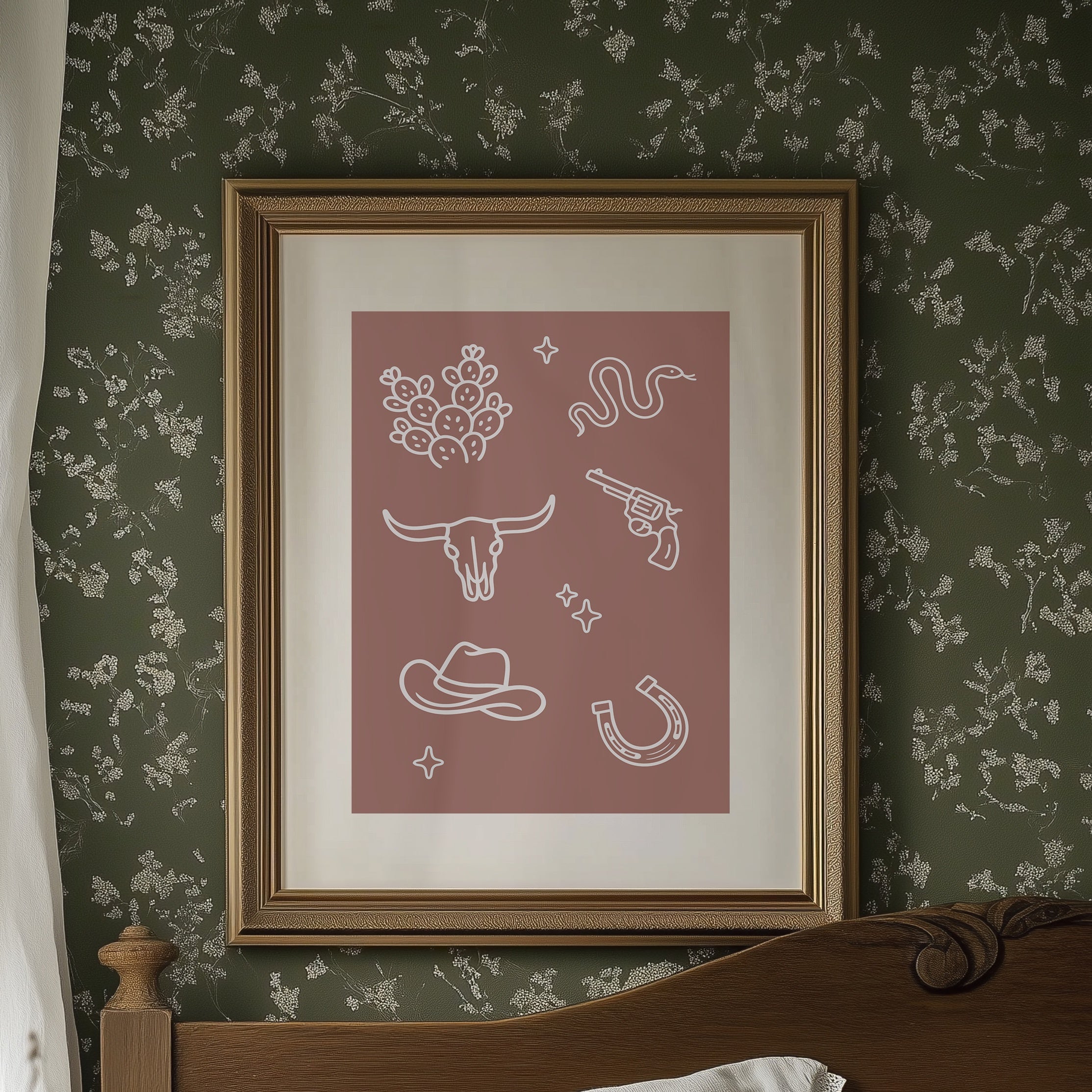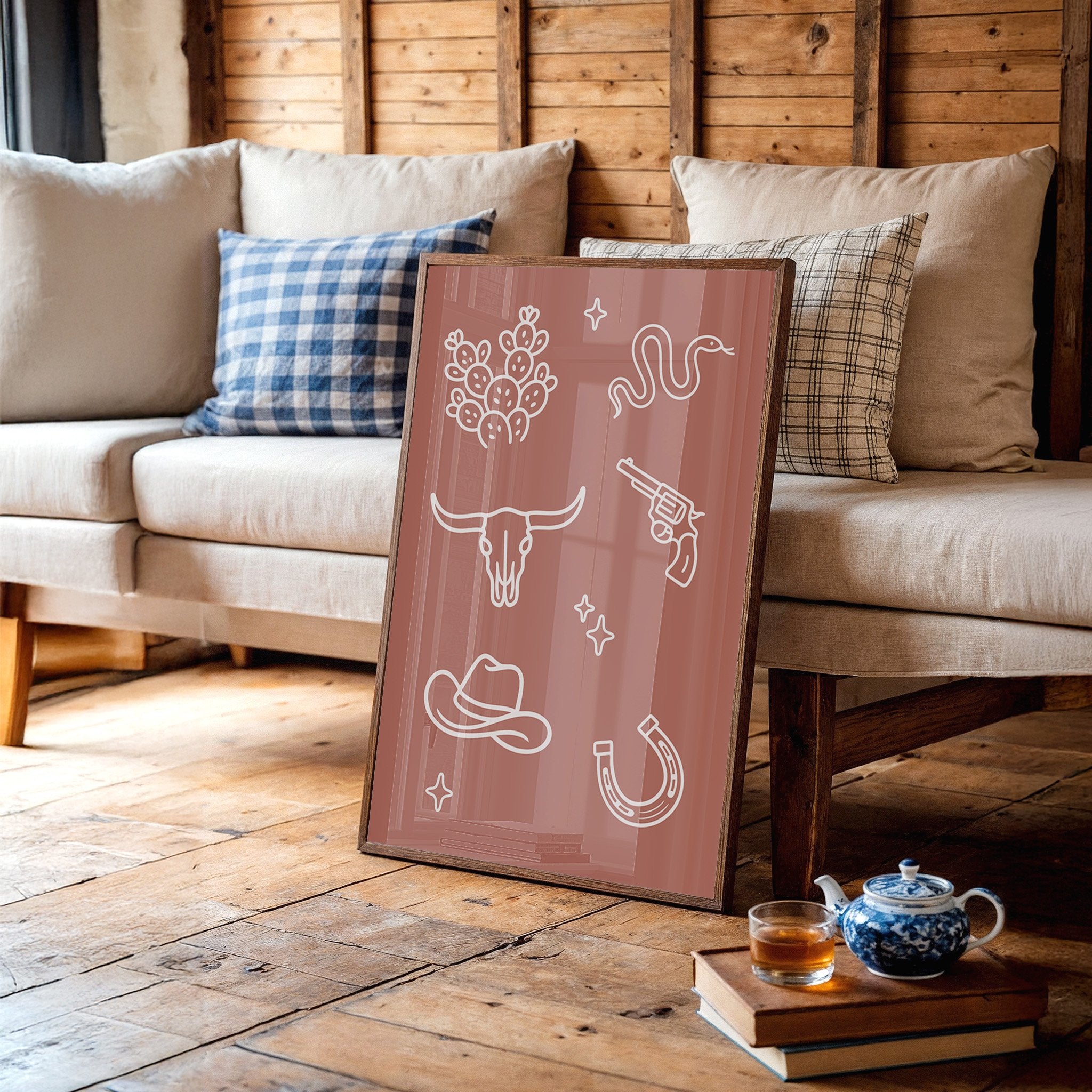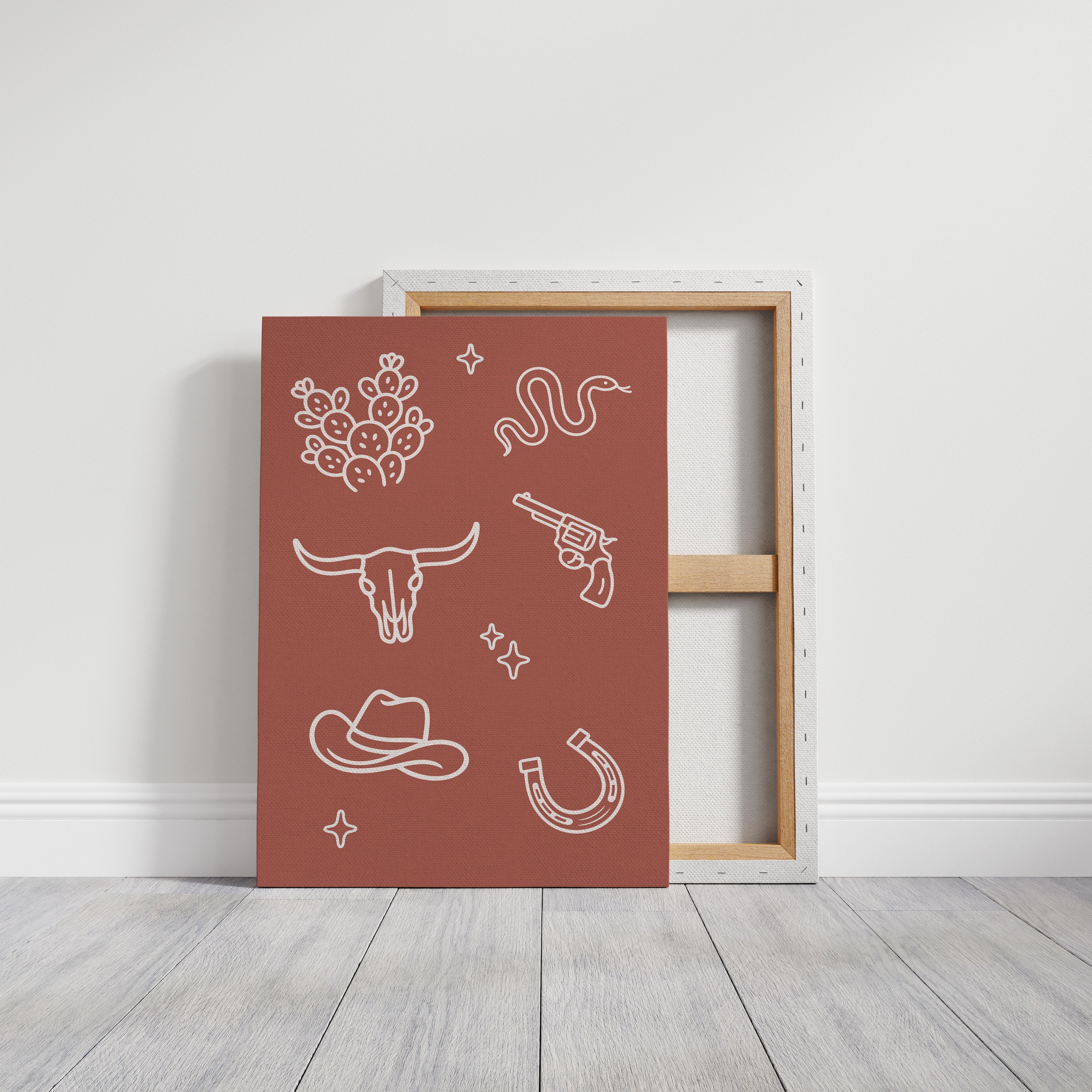 White line drawings float against a warm terracotta backdrop, each symbol telling a piece of the southwestern story. Cactus, snake, longhorn skull, and revolver mingle with cowboy hat and horseshoe, creating a modern interpretation of desert heritage. This minimalist collection of western motifs brings a contemporary southwestern vibe to any space.