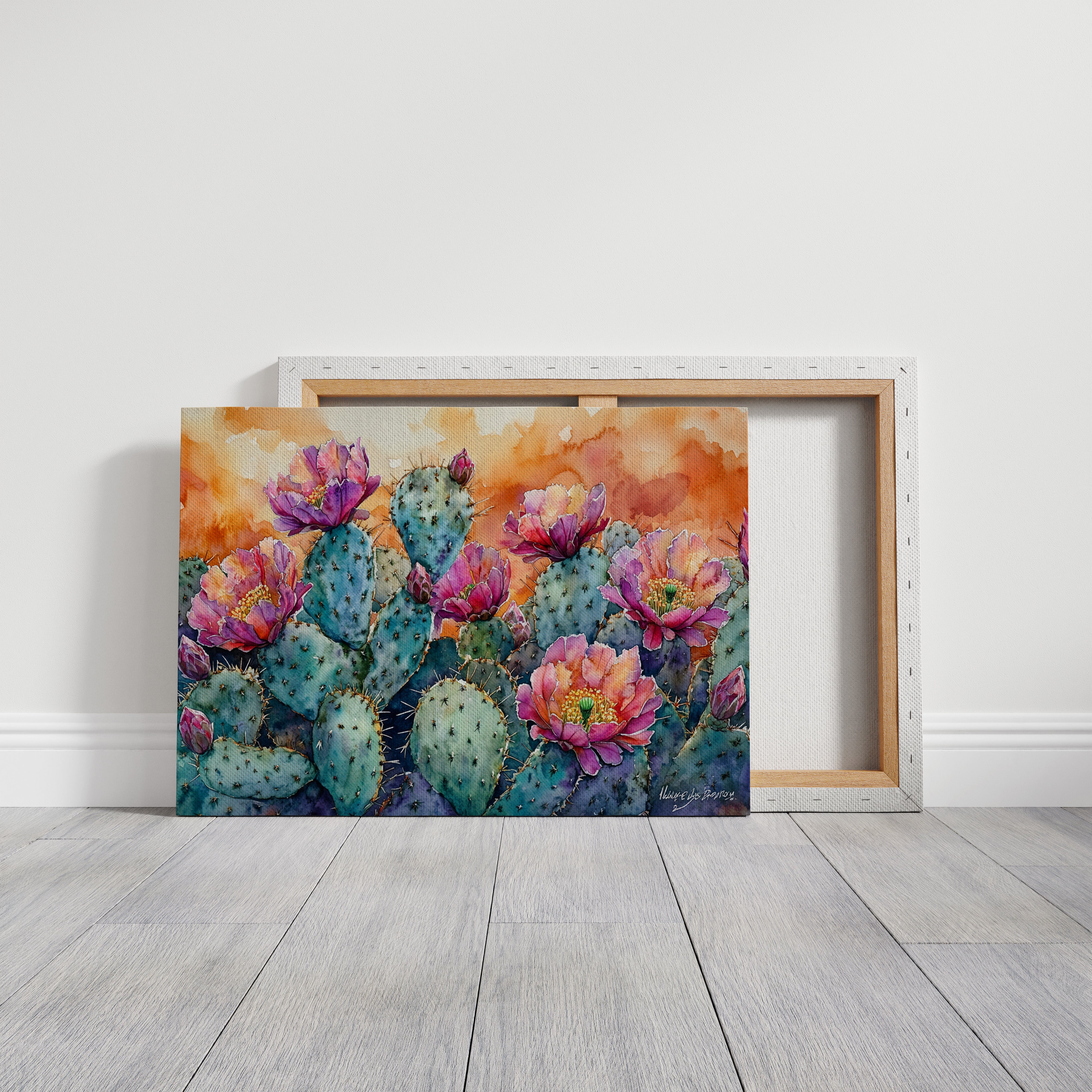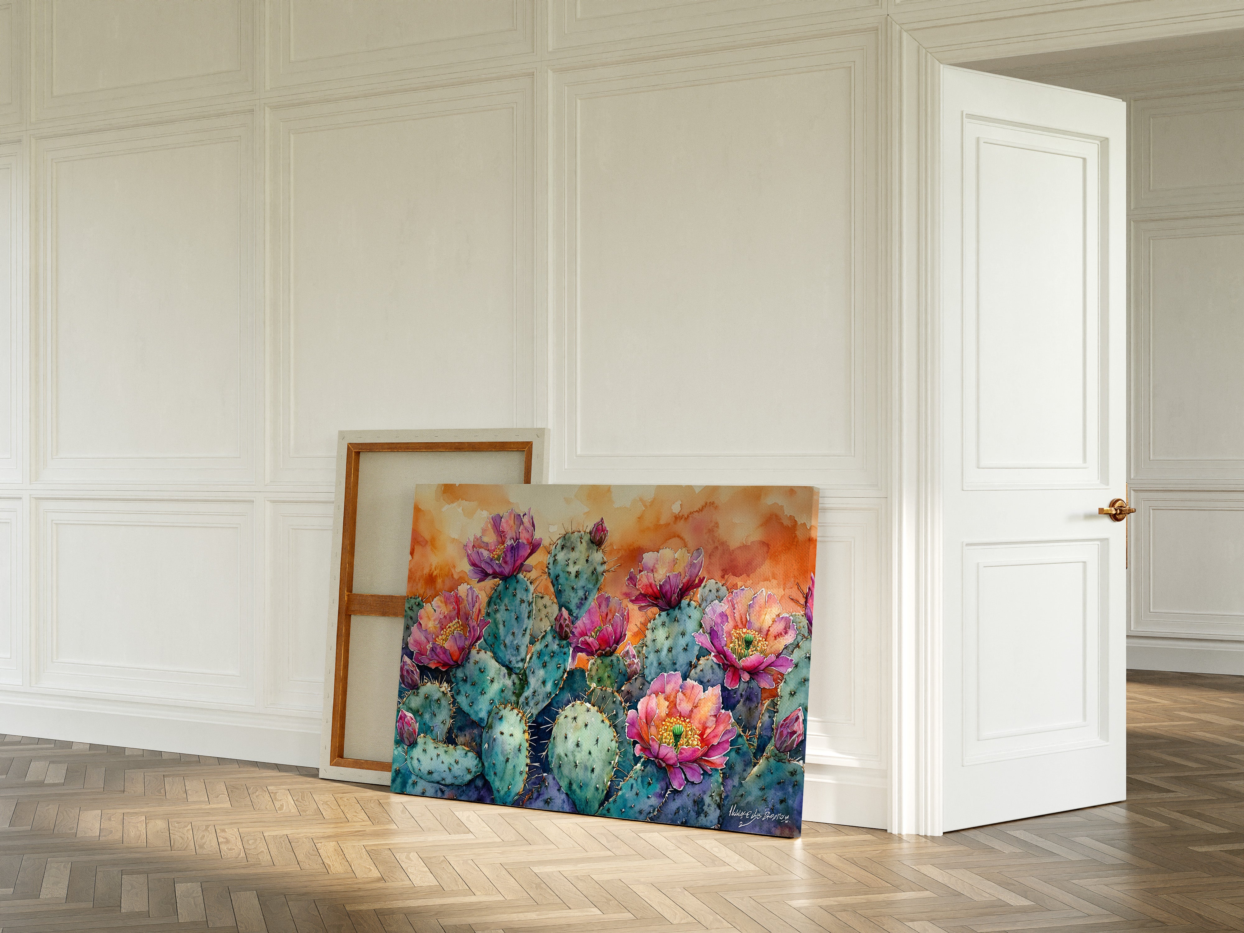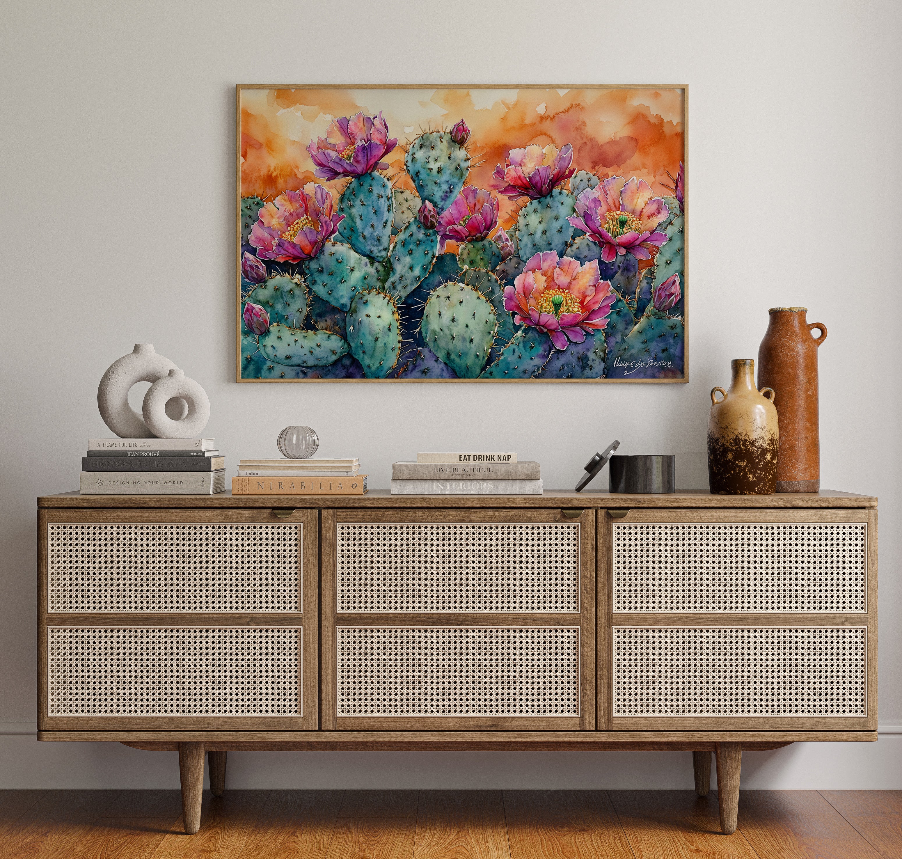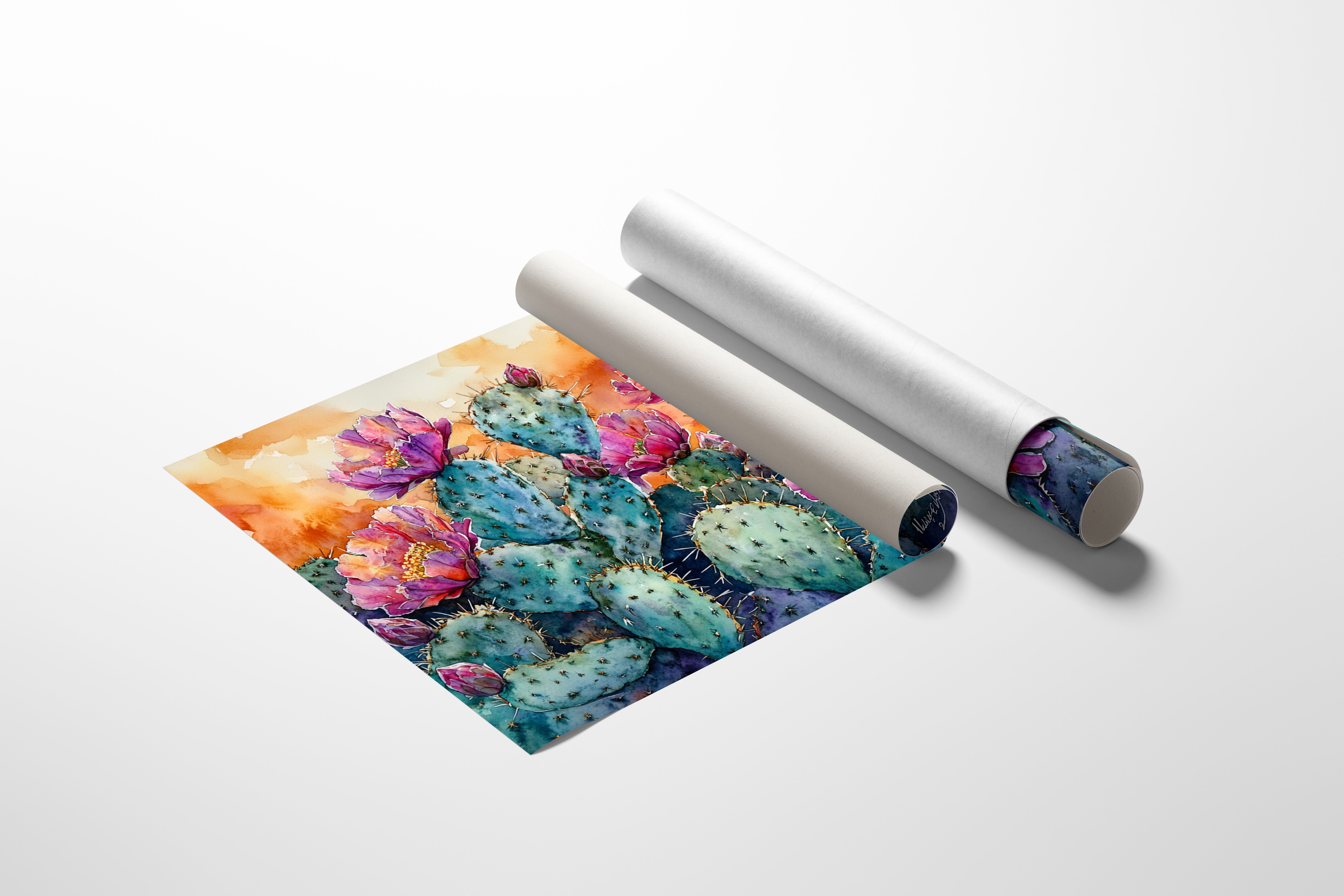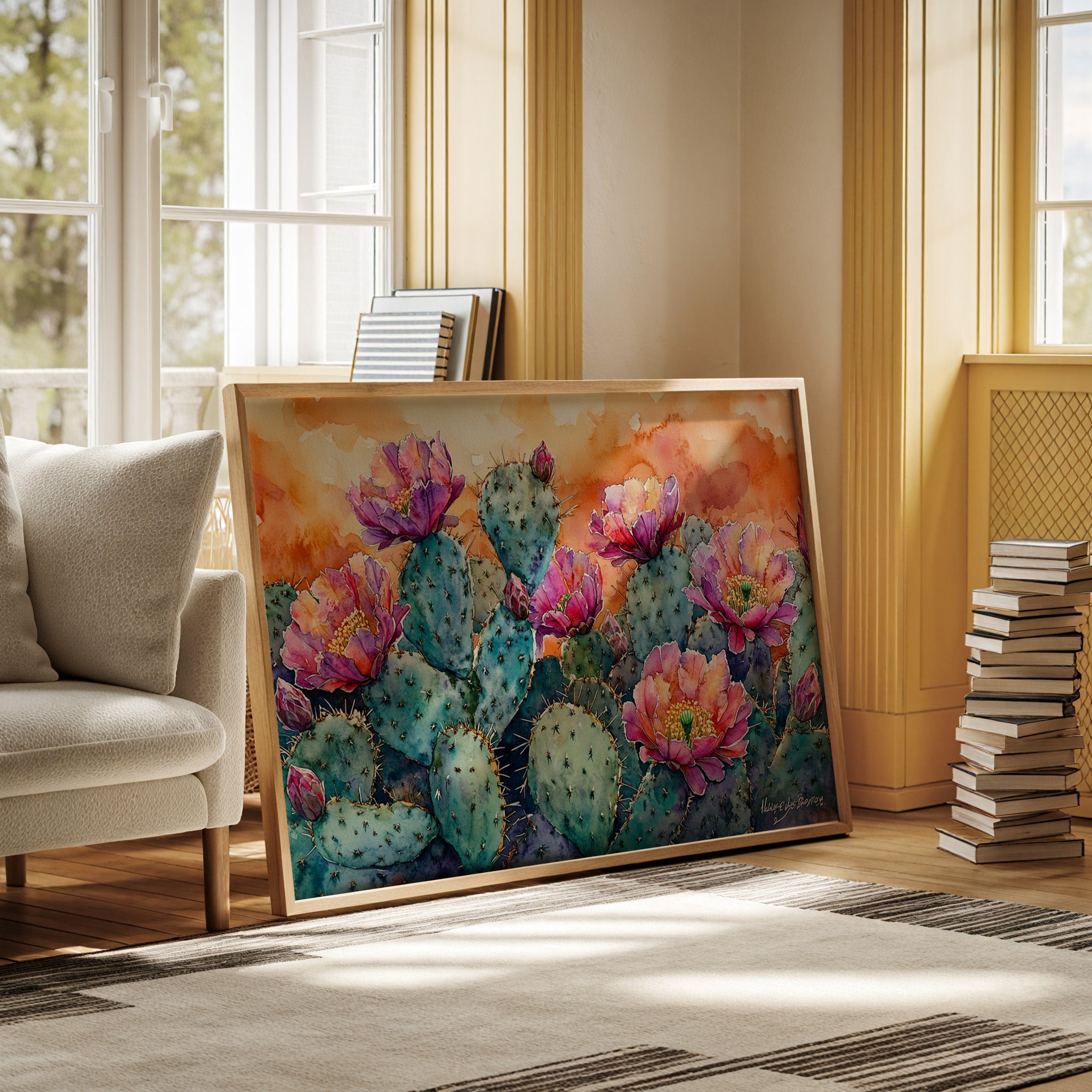 Vibrant prickly pear blossoms burst forth like nature's fireworks against a warm tangerine sky. Their magenta and purple petals unfold with delicate determination, creating a stunning contrast against the cool turquoise-blue cacti pads. The watercolor technique captures the desert's paradox - fierce protection and tender beauty existing in perfect harmony. Golden stamens peek from within each bloom, while subtle spines remind us of the plant's resilient spirit. This piece would bring sophisticated southwestern charm to a sun-filled breakfast nook or create an inspiring focal point in a home office.