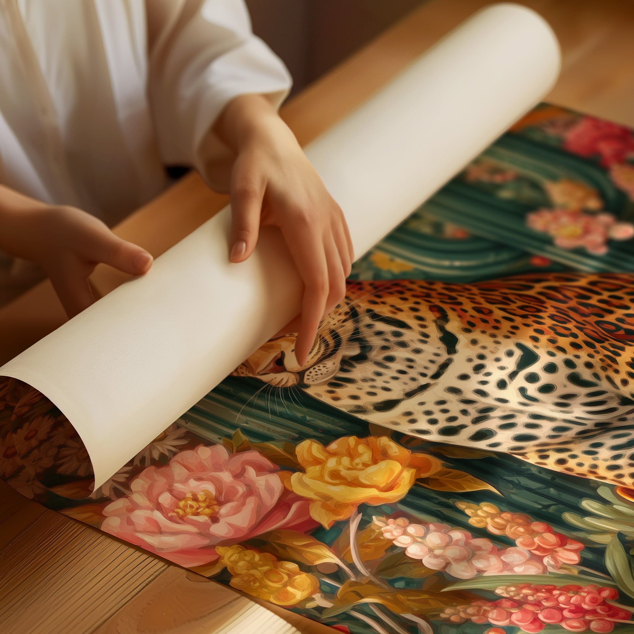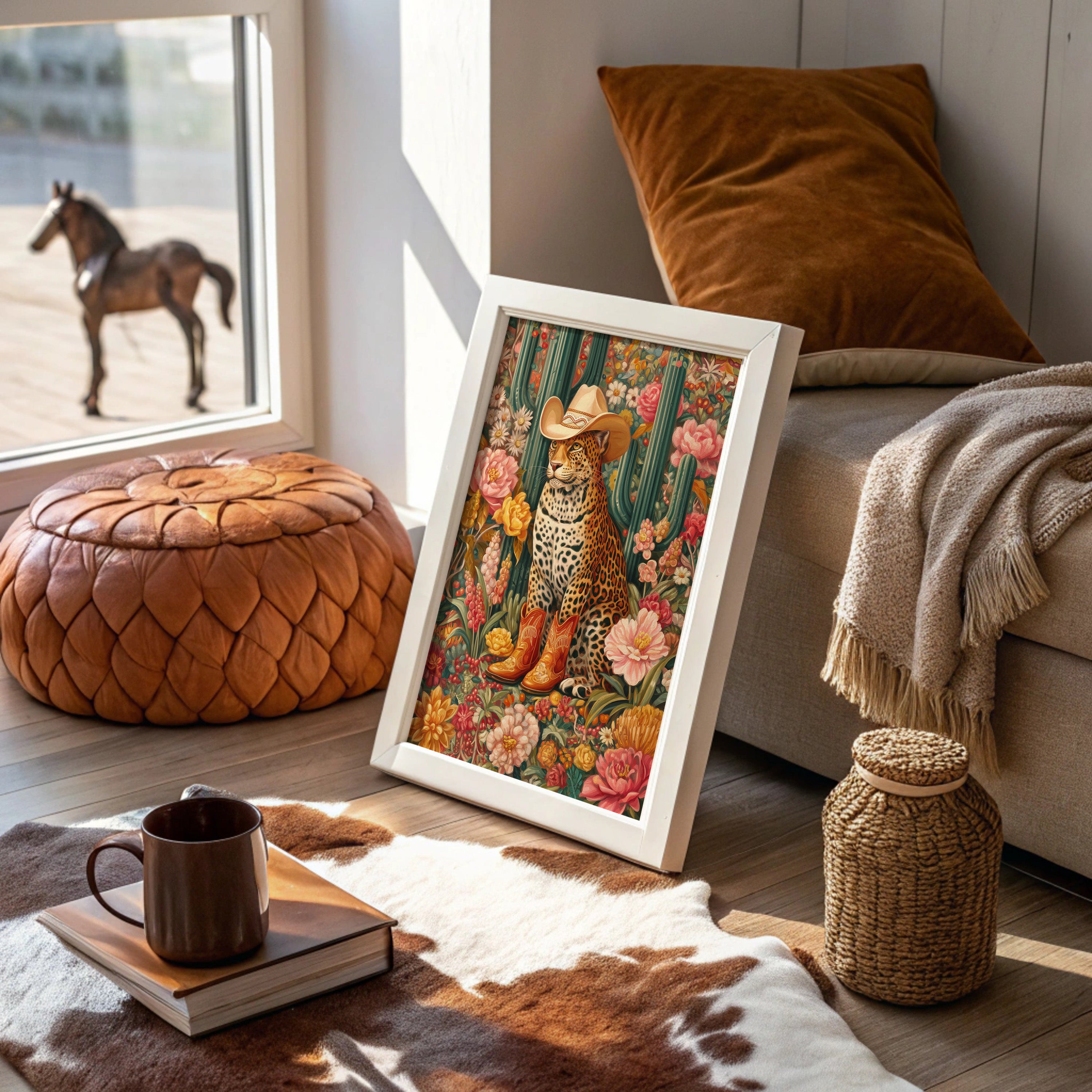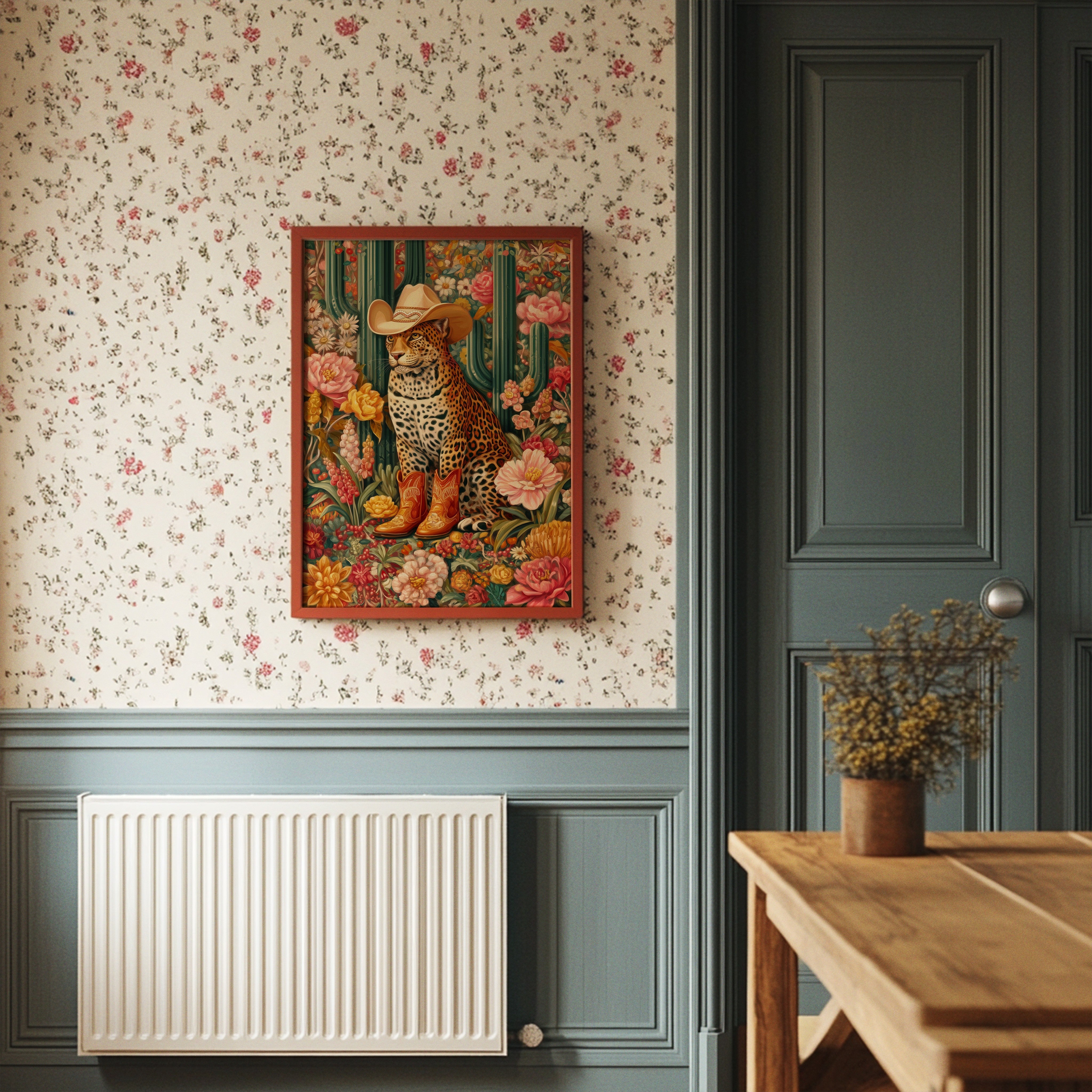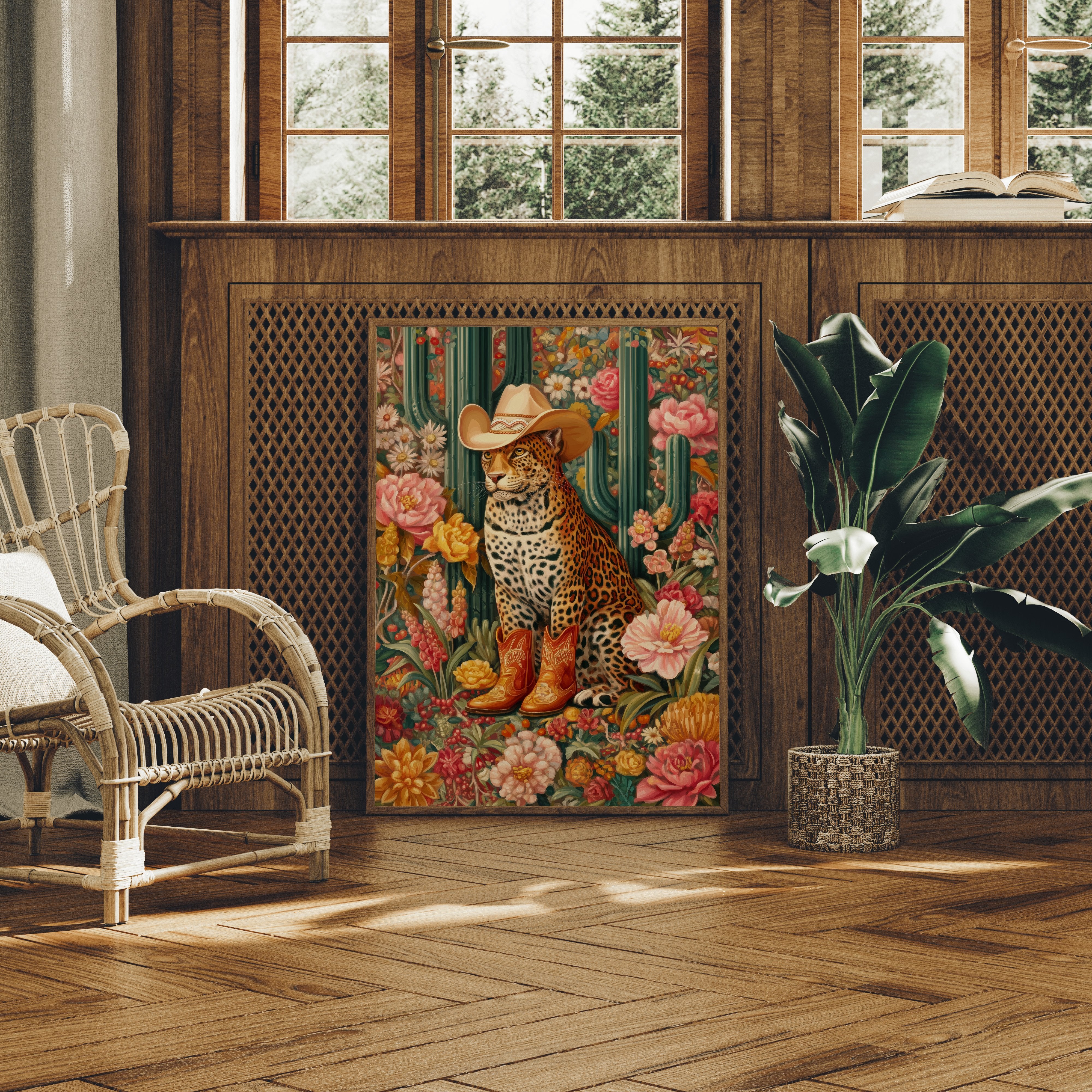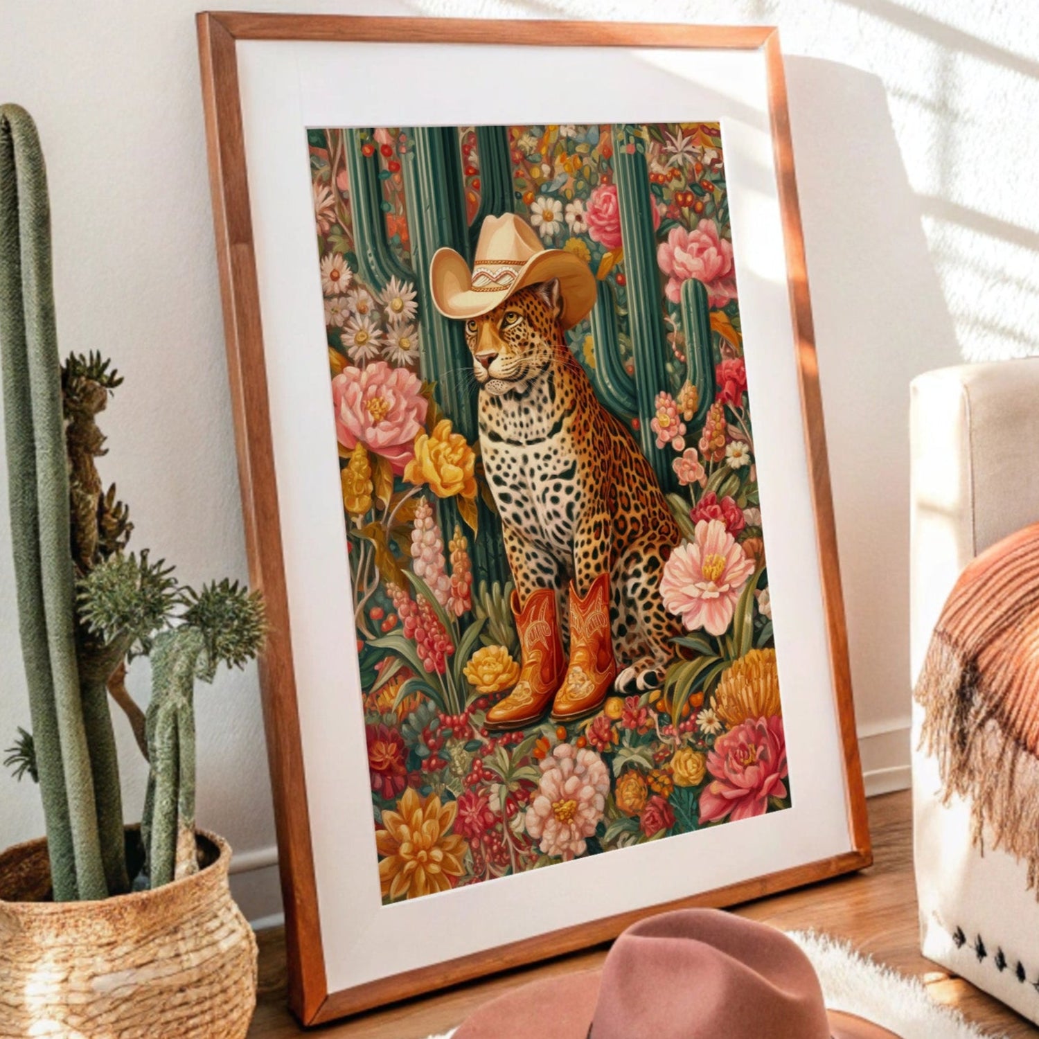 Among blooming desert roses and towering saguaros, a majestic leopard sits adorned in western finery, a cream cowboy hat tilted just so and burnished leather boots speaking of untold adventures. This whimsical piece from our Contemporary collection blends surreal charm with bold botanical beauty. Rich emerald cacti stand sentinel while coral and golden blooms create a lush garden paradise, framing our distinguished feline friend in a celebration of untamed elegance meets frontier spirit. The piece's playful sophistication makes it a stunning focal point for a modern dining room or an eclectic home office, where its vibrant energy can inspire creative thinking. Each viewing reveals new details in this magical merger of wild nature and western charm.