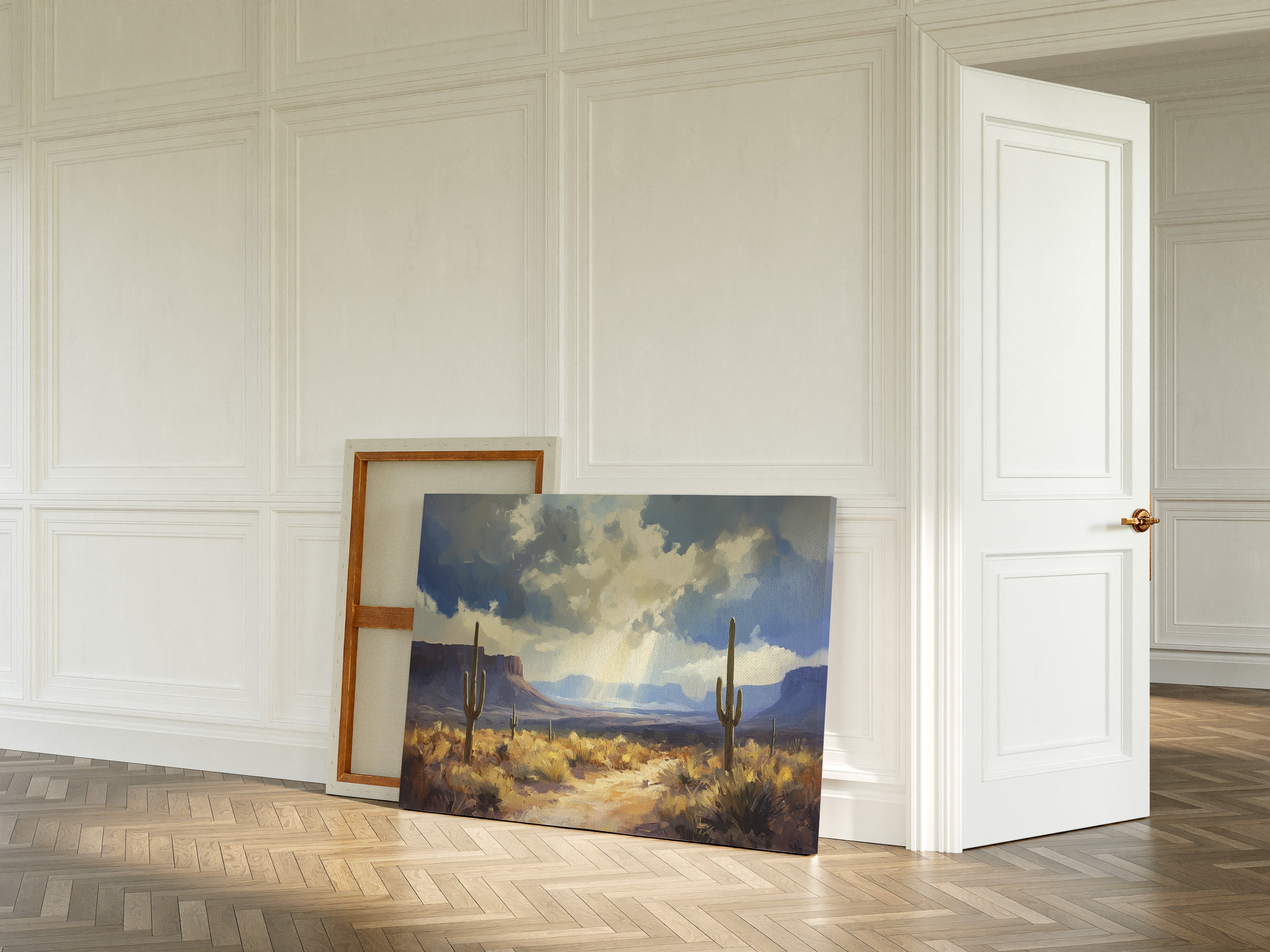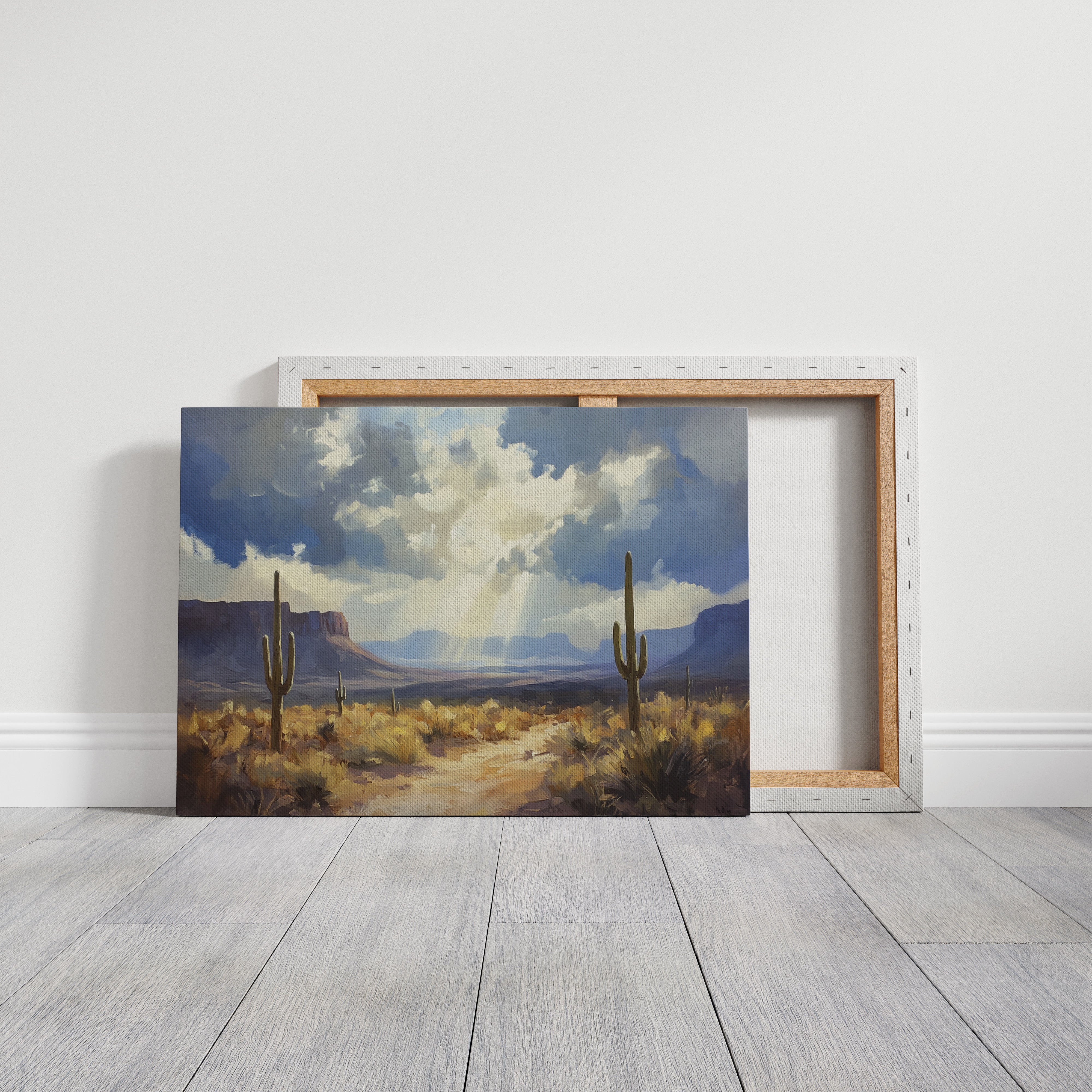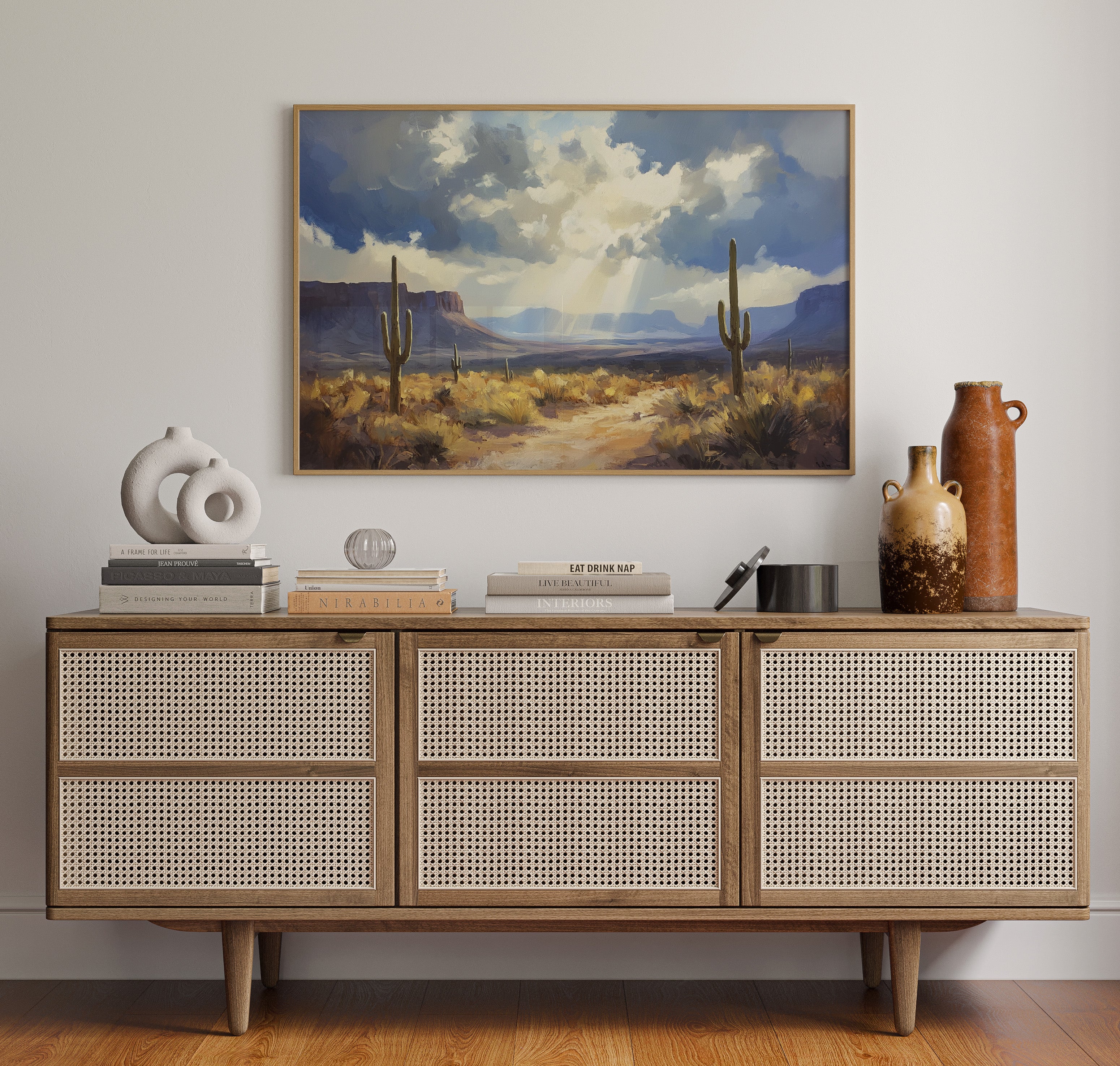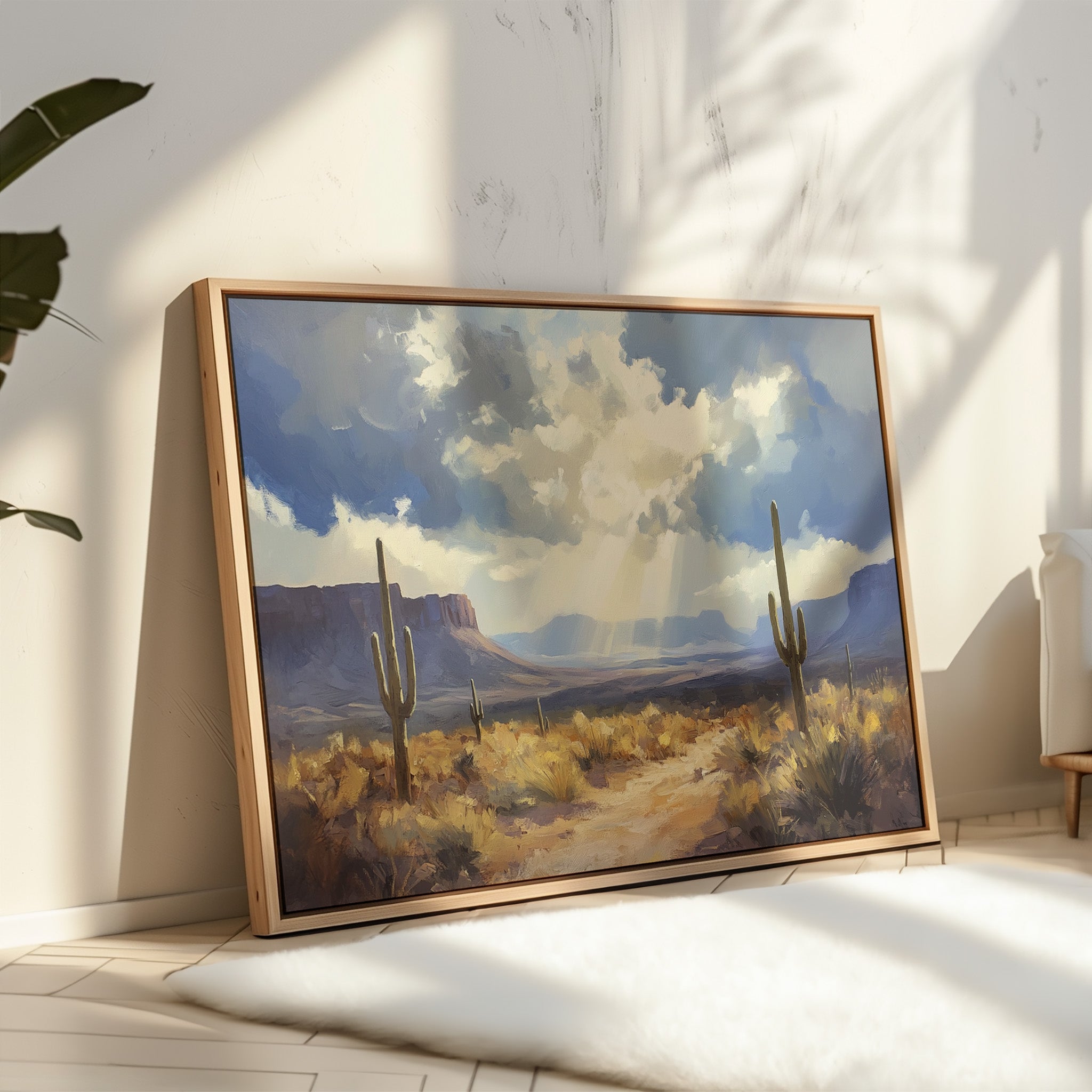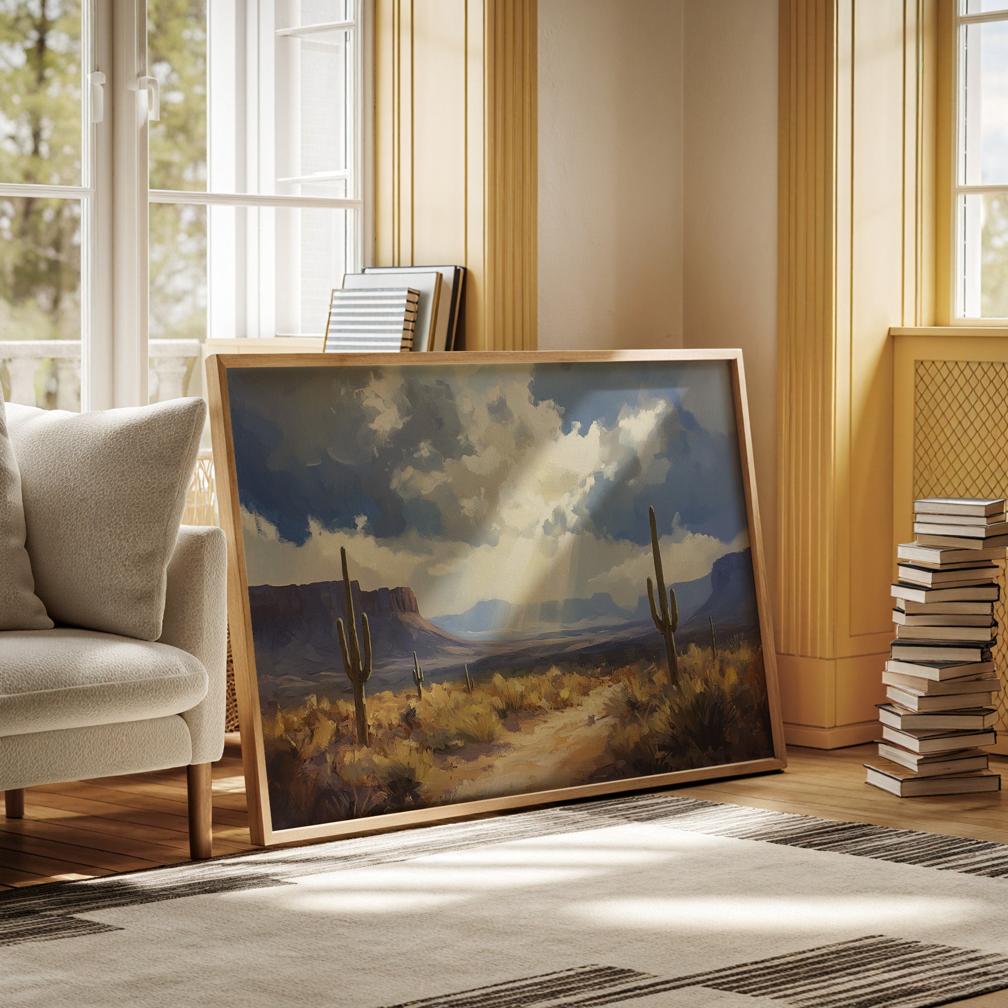 Sunbeams pierce through billowing clouds, casting divine spotlights across an expansive desert valley. Sentinel saguaros stand tall against a backdrop of purple-hued mesas, their silhouettes a testament to decades of desert perseverance. Golden brush carpets the foreground, painting the landscape in warm honey tones that contrast with the cool, distant mountains. The dramatic interplay of light and shadow creates a scene of timeless southwestern majesty. This piece would bring natural grandeur to a great room or dining space, its panoramic presence creating a window to wild places.