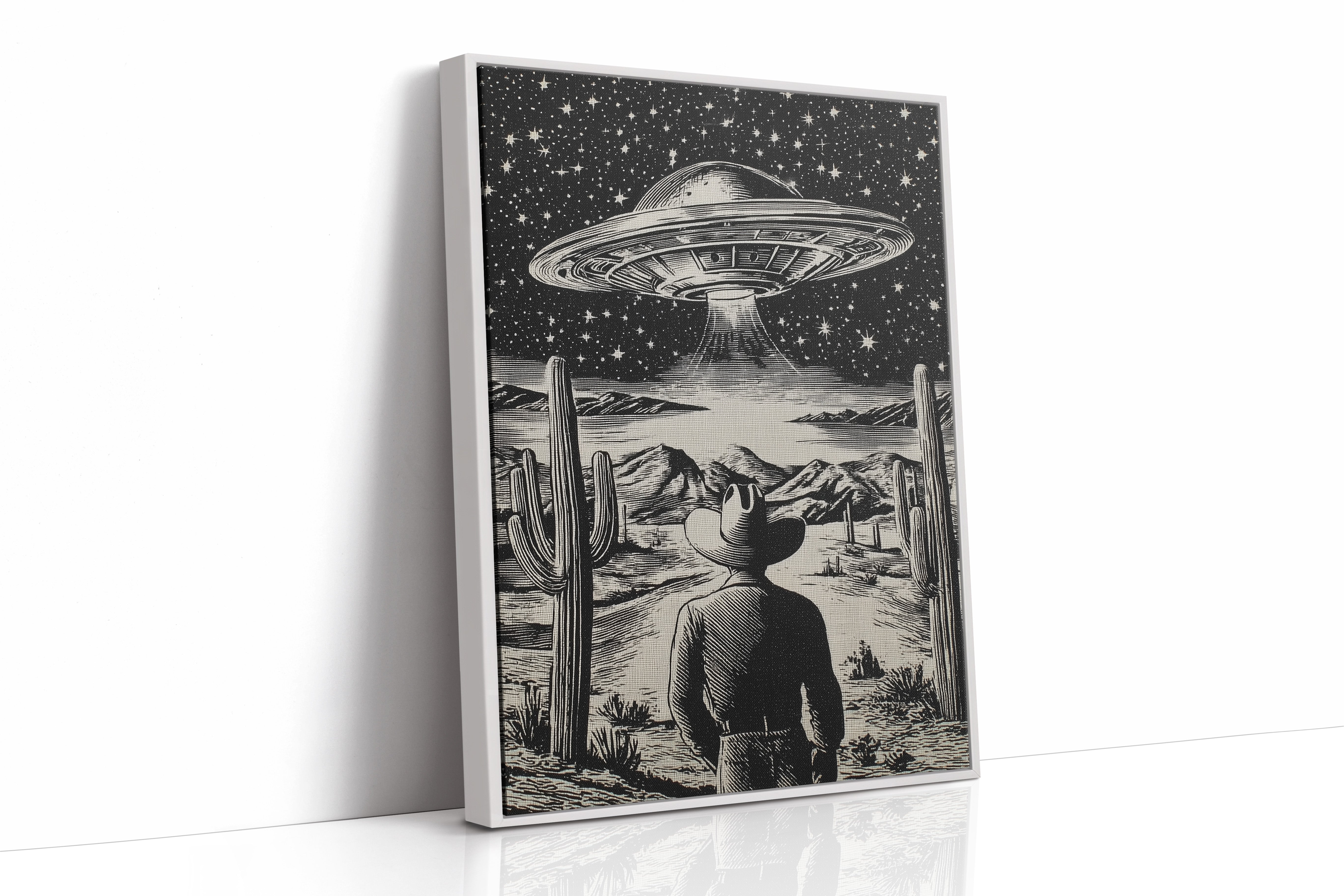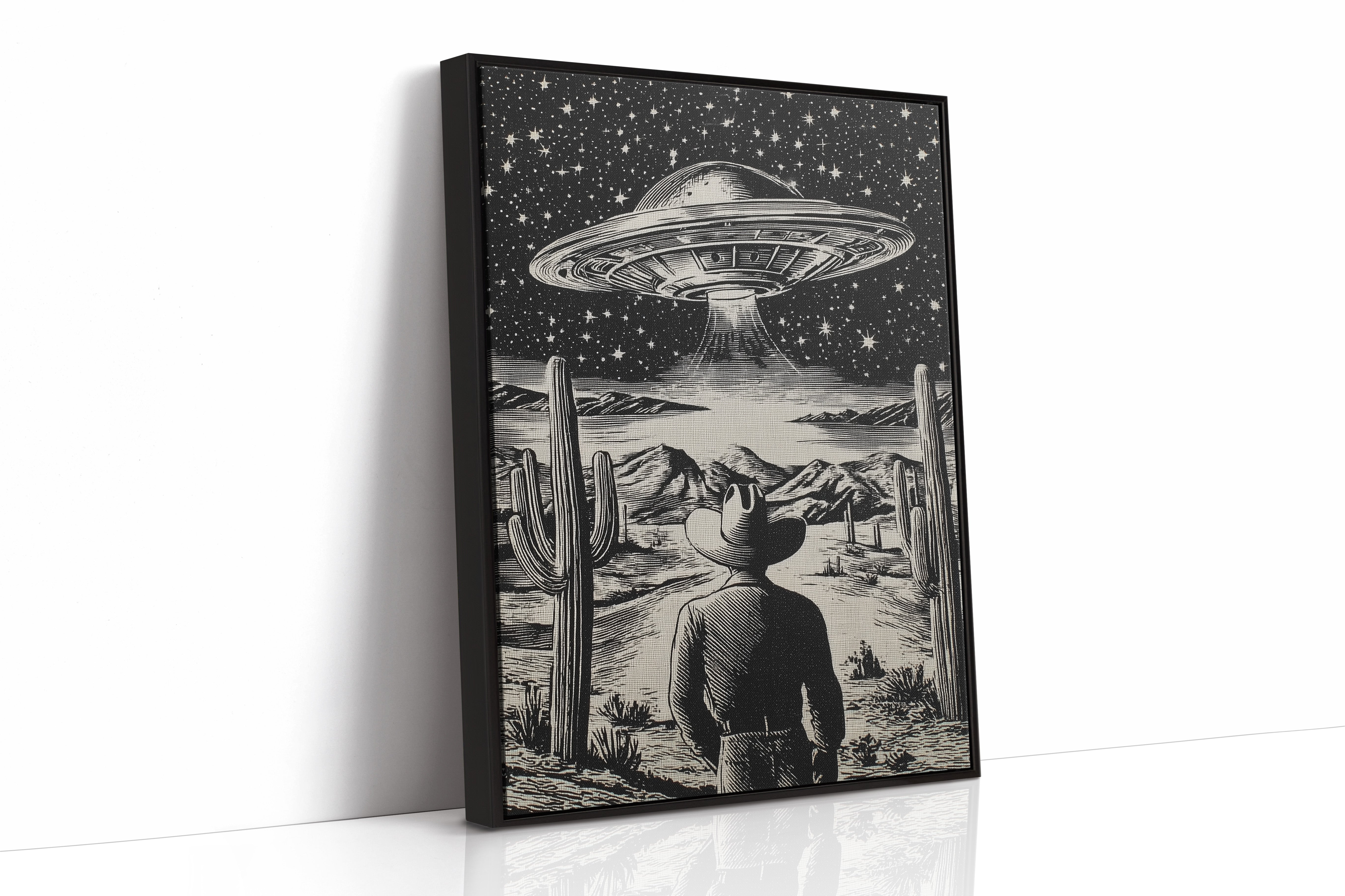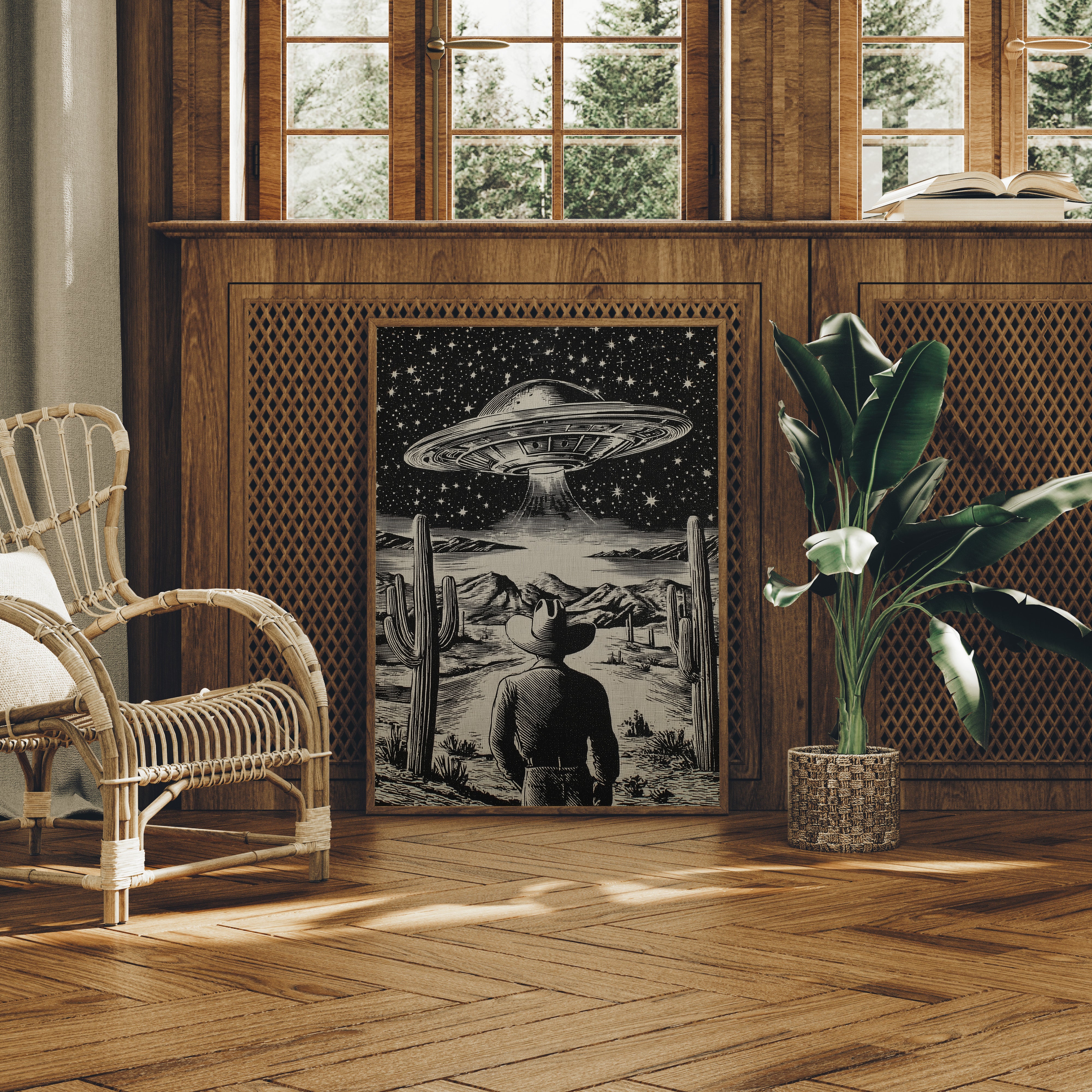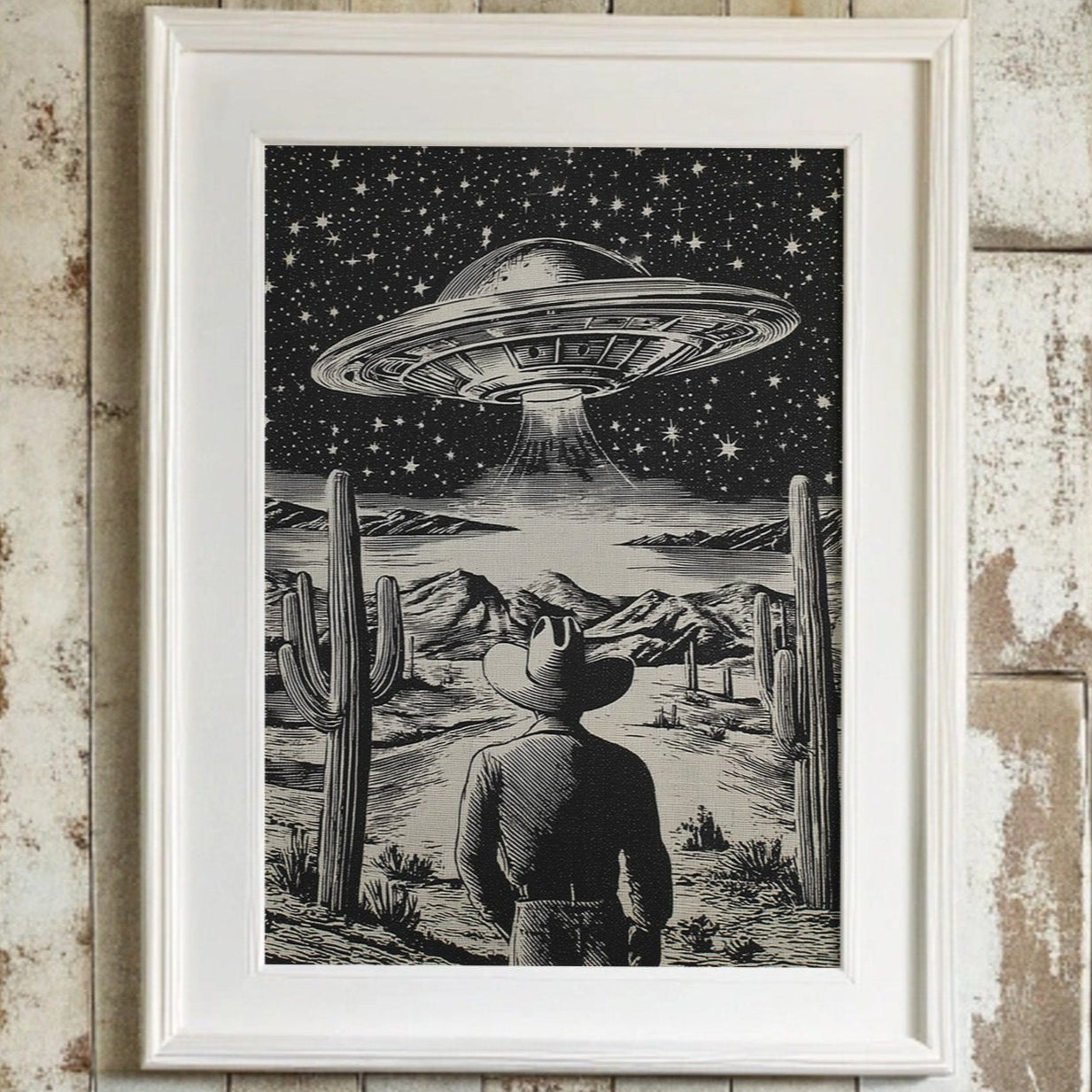 A lone cowboy stands transfixed beneath a starlit desert sky, witnessing an otherworldly encounter as a metallic disc hovers above ancient saguaros. This striking monochromatic piece from our Contemporary collection merges classic Western imagery with retro sci-fi elements. The detailed linework captures every ridge of the mountainous landscape and each gleaming star, while the contrast between the grounded earthly observer and the mysterious craft creates a compelling narrative tension. Perfect for a modern den, home office, or any space that celebrates the intersection of adventure and imagination. The piece invites viewers to ponder their own place in the vast cosmic story.