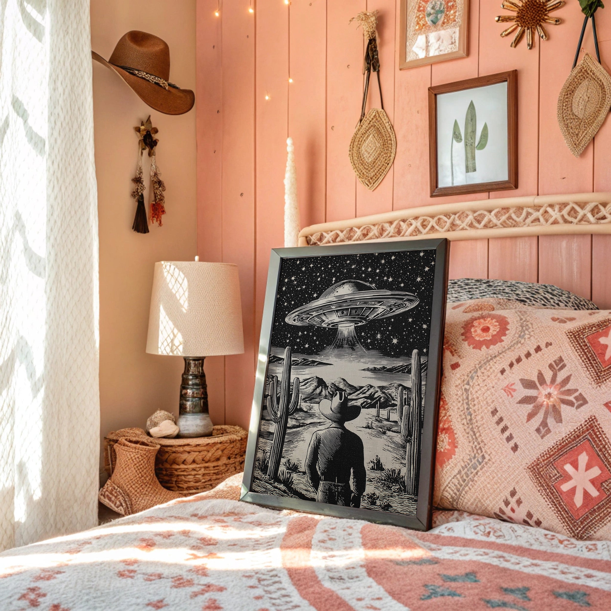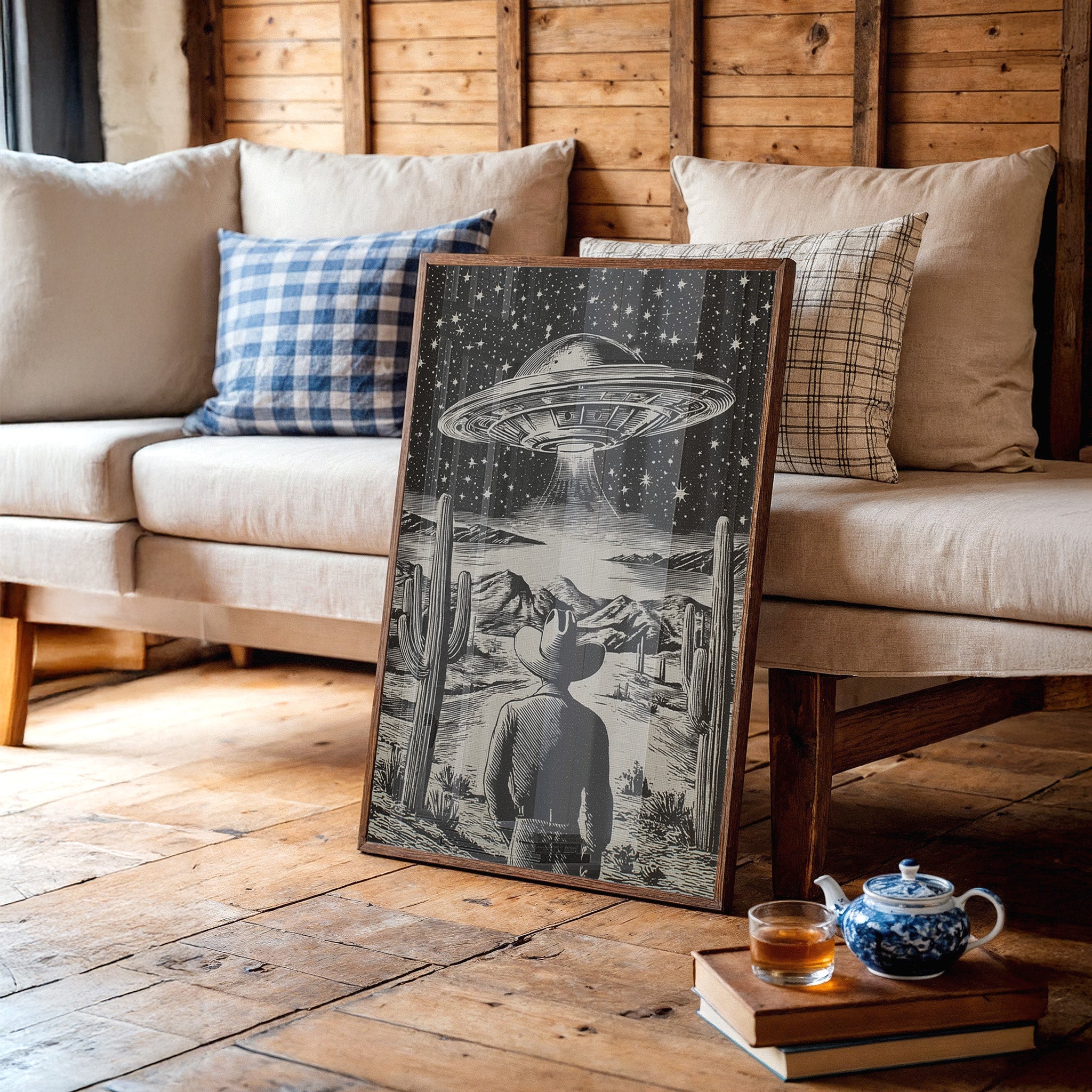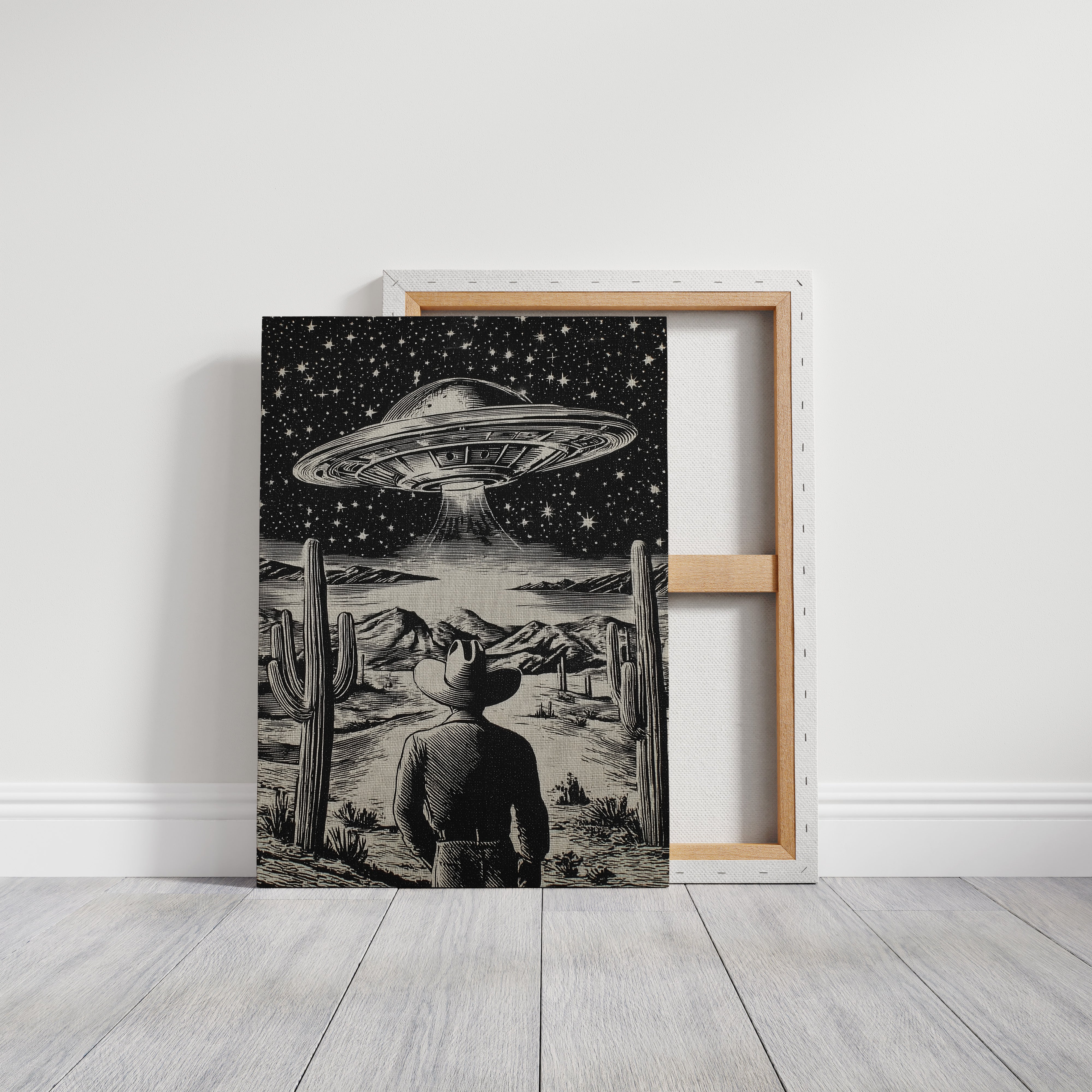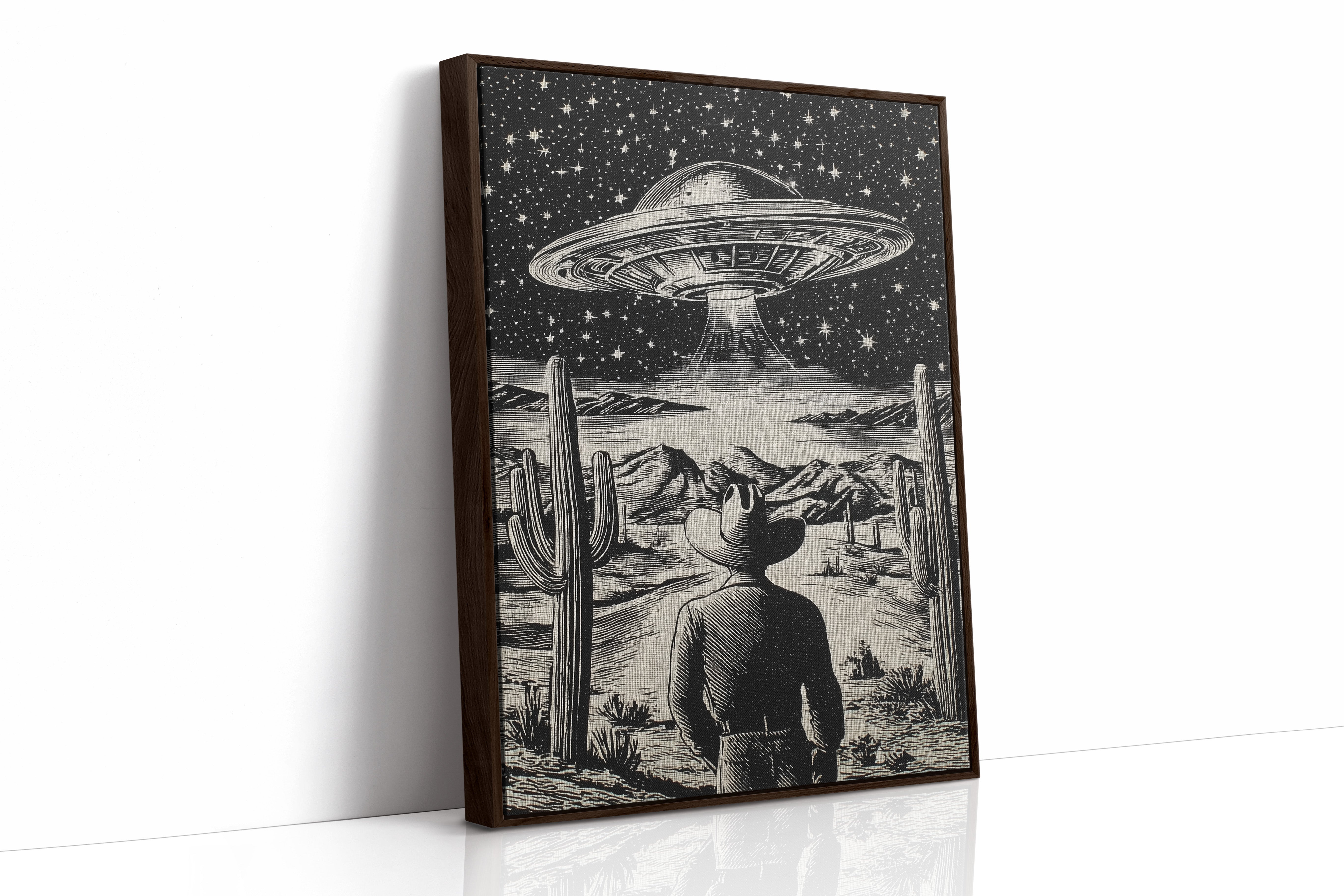 A lone cowboy stands transfixed beneath a starlit desert sky, witnessing an otherworldly encounter as a metallic disc hovers above ancient saguaros. This striking monochromatic piece from our Contemporary collection merges classic Western imagery with retro sci-fi elements. The detailed linework captures every ridge of the mountainous landscape and each gleaming star, while the contrast between the grounded earthly observer and the mysterious craft creates a compelling narrative tension. Perfect for a modern den, home office, or any space that celebrates the intersection of adventure and imagination. The piece invites viewers to ponder their own place in the vast cosmic story.