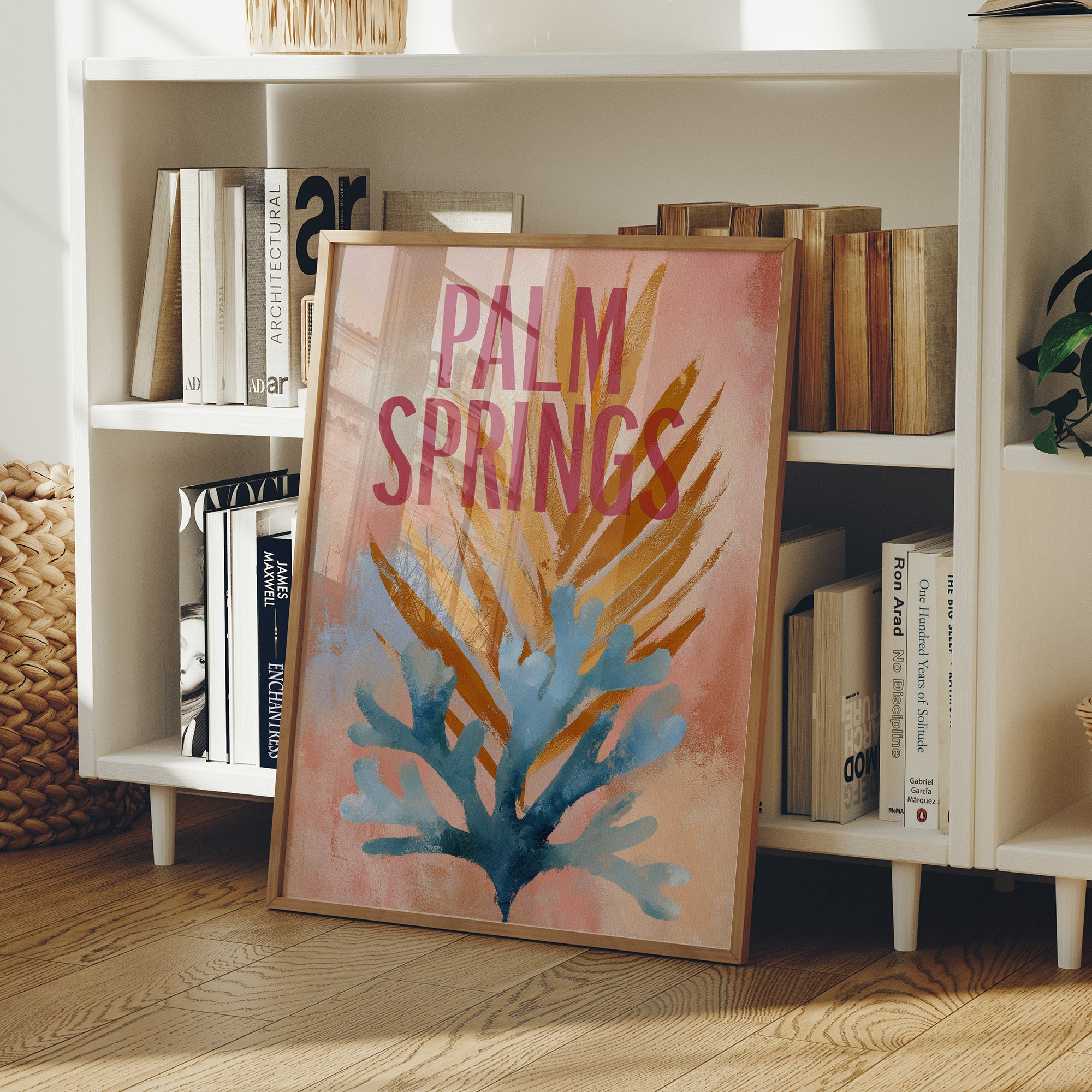 A stylish contemporary canvas featuring the words "PALM SPRINGS" prominently displayed in bold magenta lettering. The artwork showcases an abstract palm frond rendered in contrasting blue and golden amber hues against a dreamy coral pink background. The canvas is partially removed from its wooden mid-century modern aesthetic synonymous with Palm Springs design.