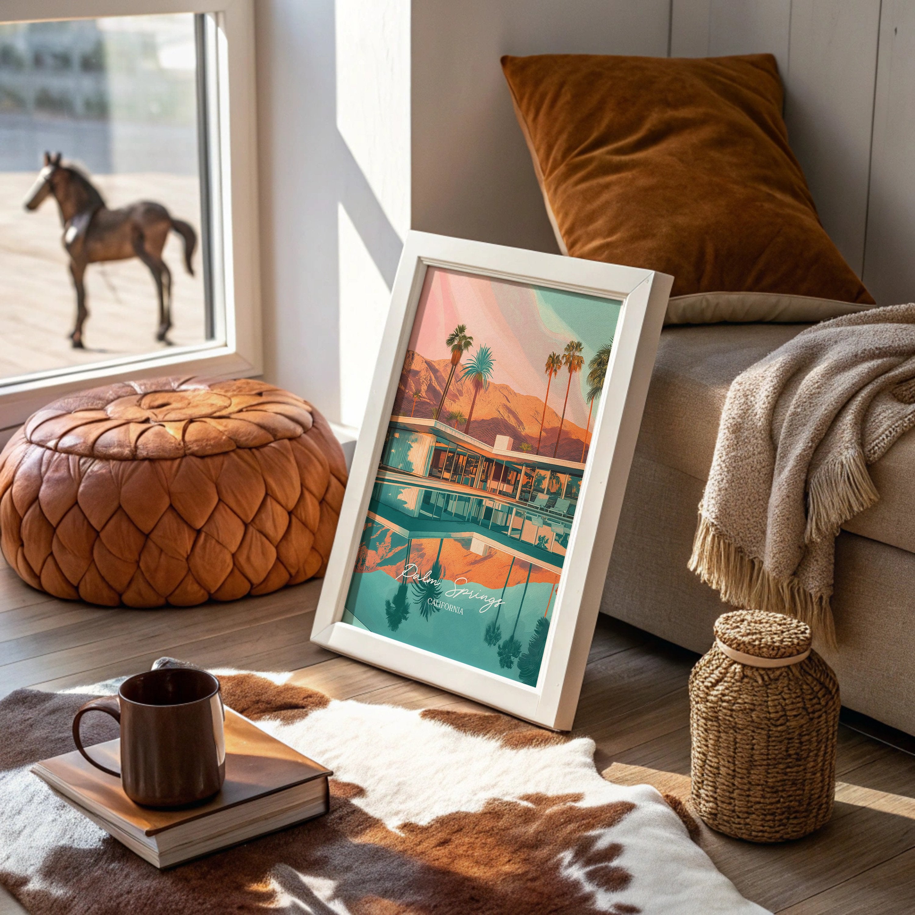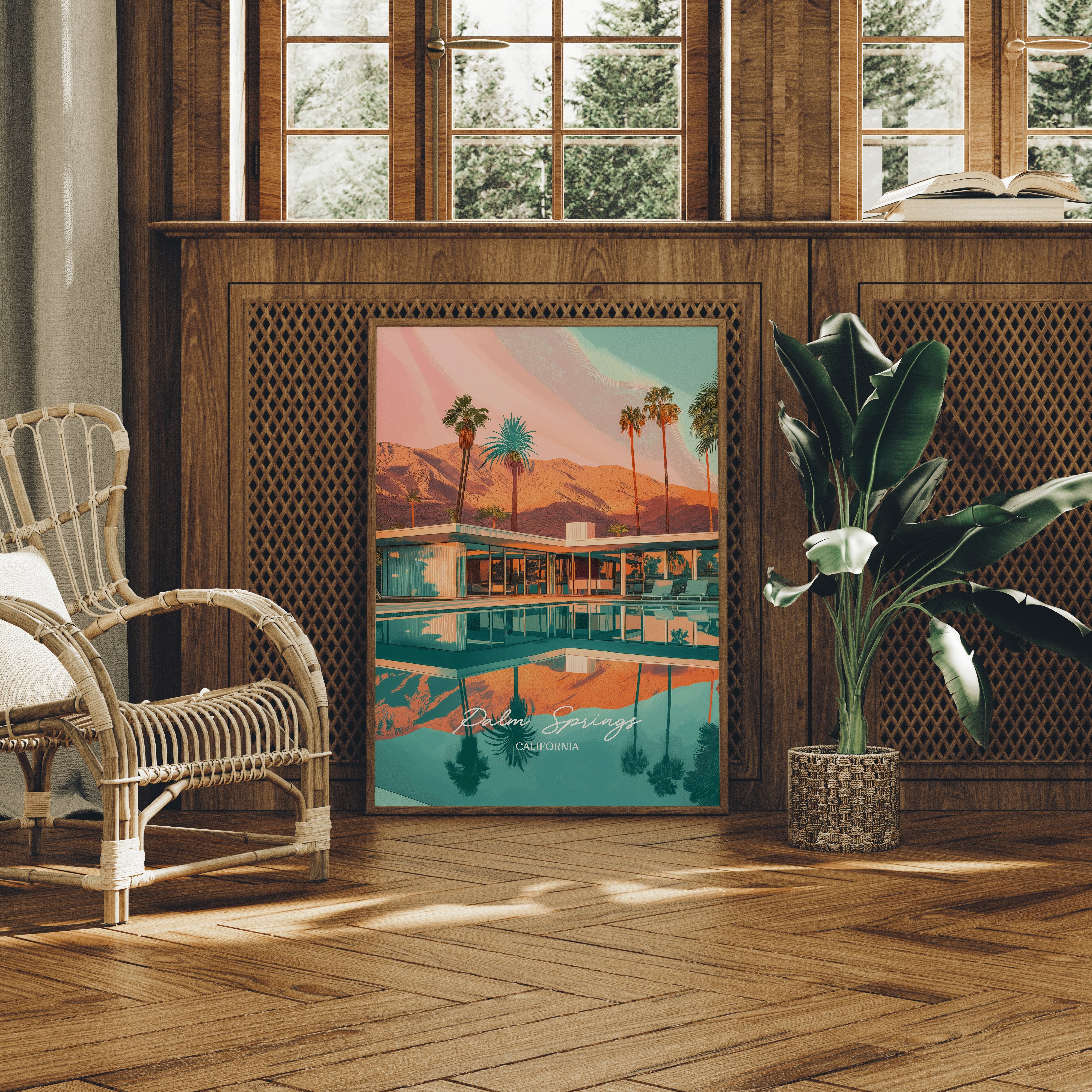 The afternoon sun paints the mountains in hues of amber and rose, while palm trees stand sentinel around a tranquil turquoise pool. The mid-century architecture creates perfect symmetry with its reflection, capturing that magical moment when day transitions toward evening in the desert. This Palm Springs scene evokes the timeless glamour of California's desert playground, where mountain vistas meet poolside leisure in a perfect harmony of color and calm.