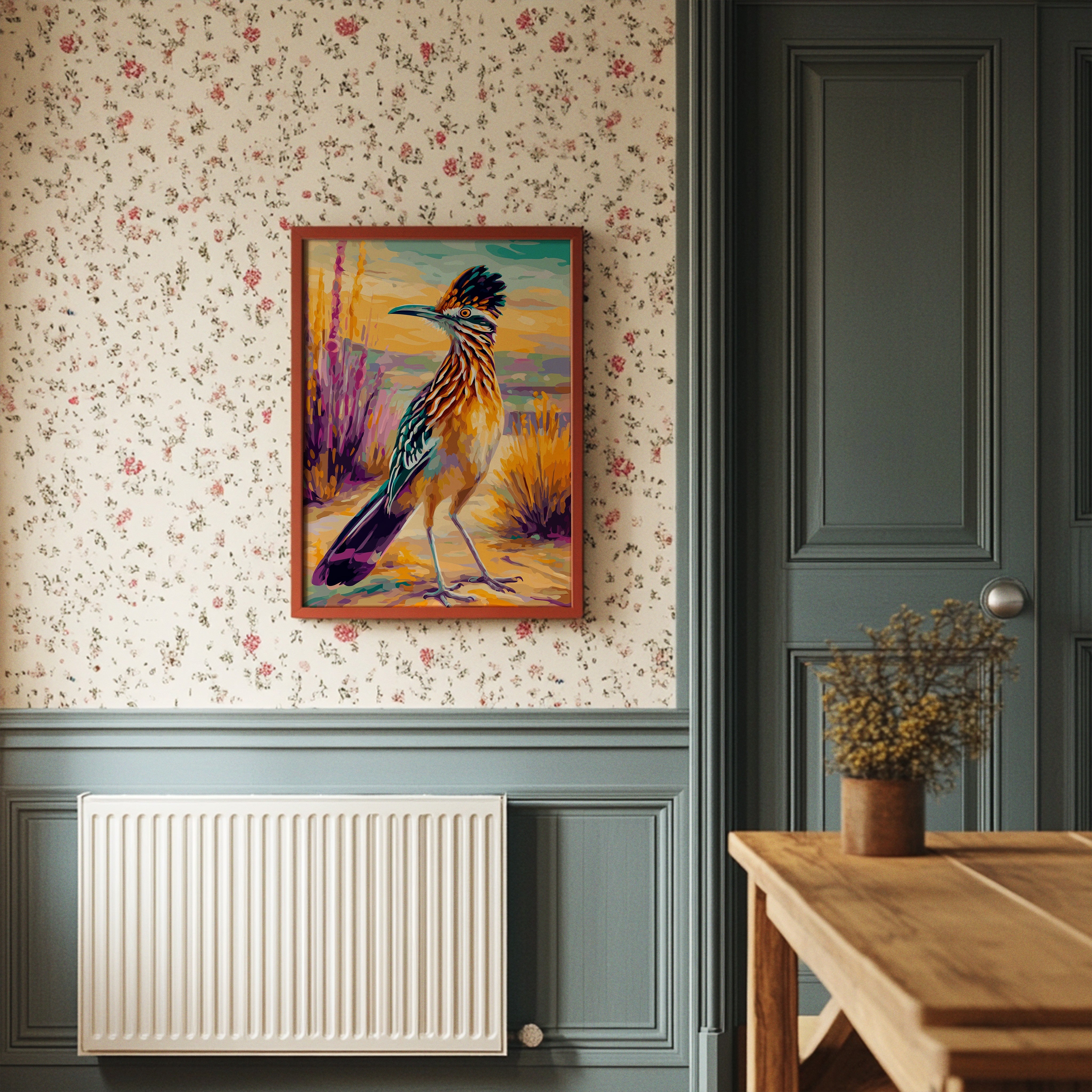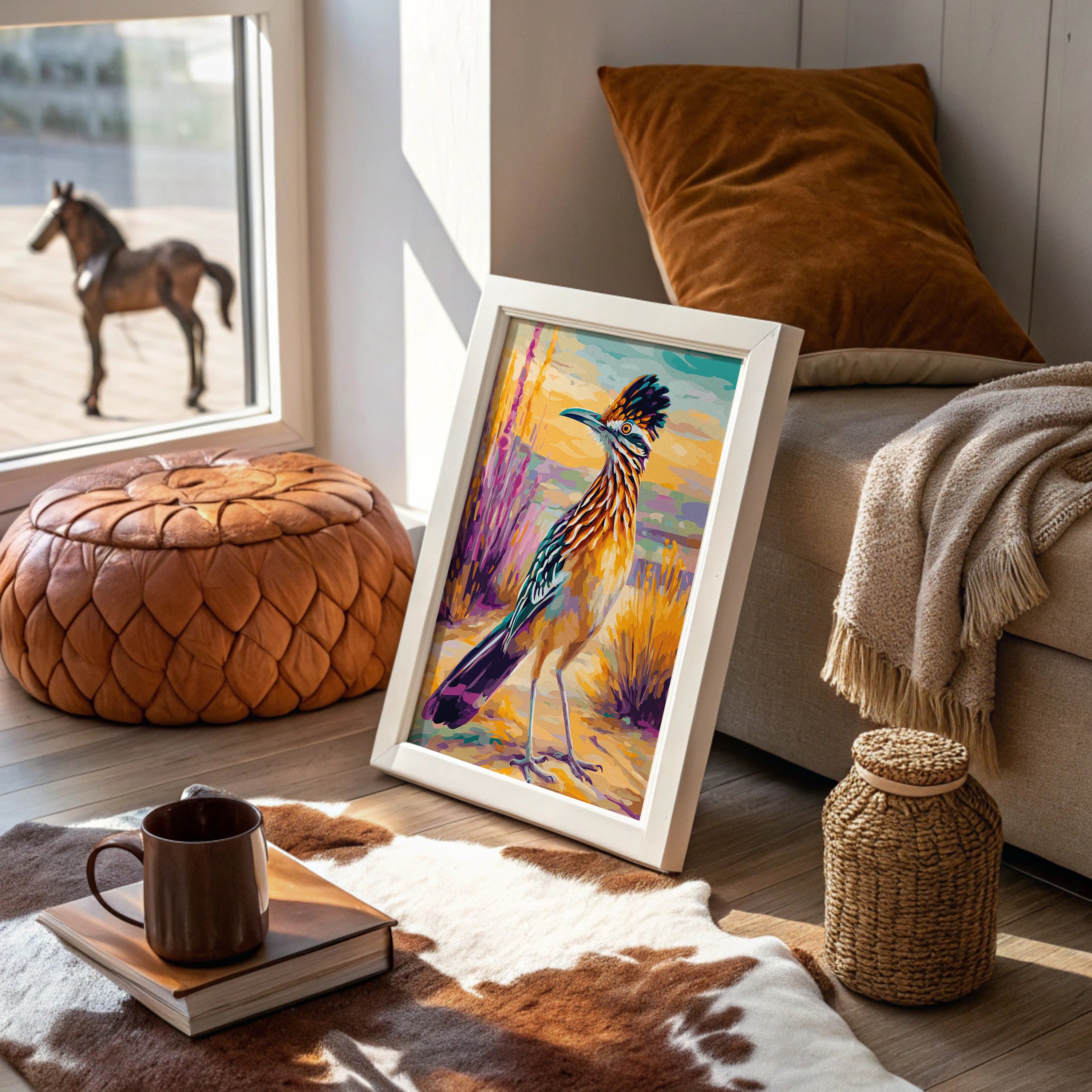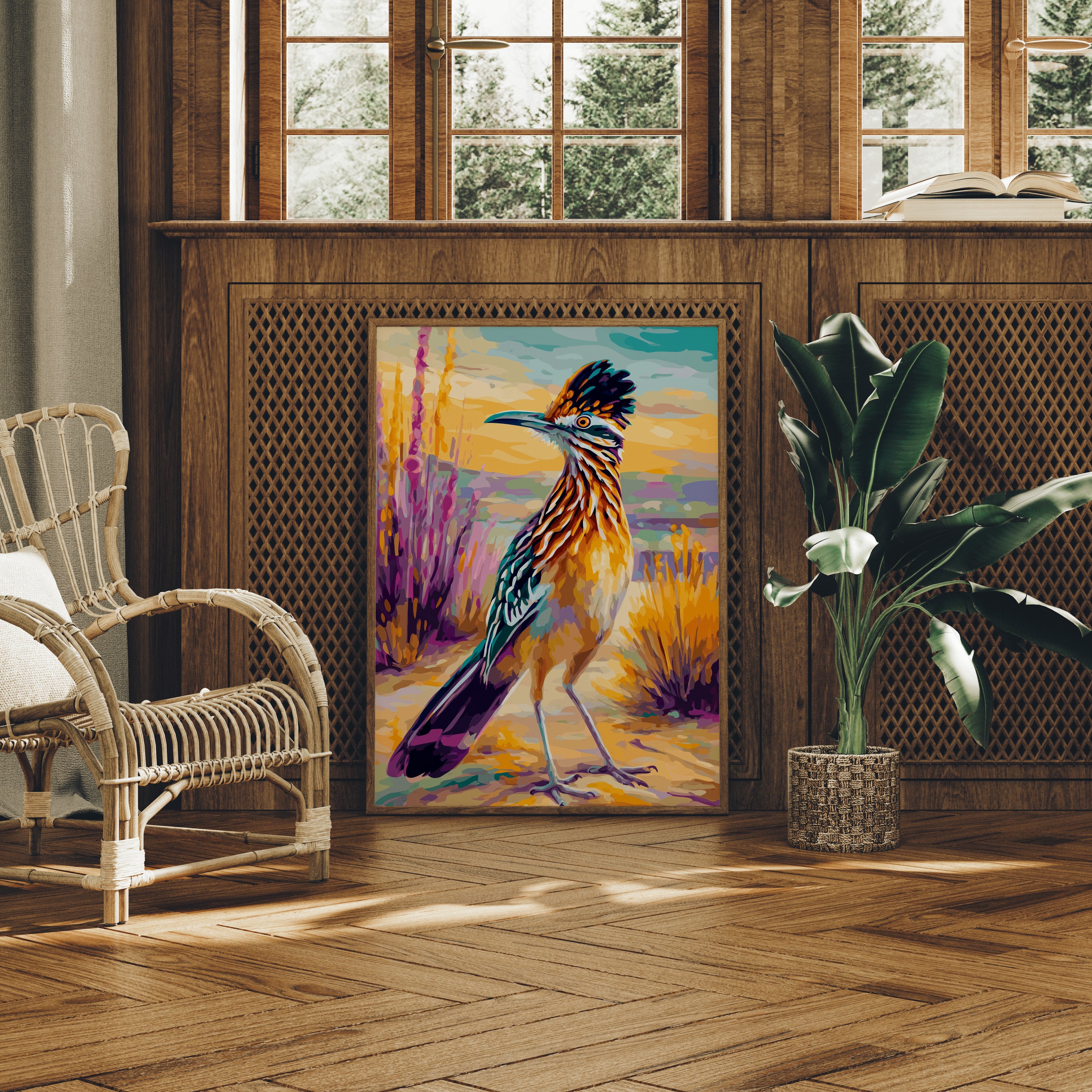 Against a golden desert sky, a proud roadrunner stands adorned in nature's finest regalia, its feathers painted in bold strokes of turquoise and amber. This vibrant piece from our Contemporary Southwest collection captures the wild spirit of desert wildlife through expressive brushwork and fearless color. The composition dances between realism and artistic interpretation, with purple sage and golden yucca creating a rhythmic backdrop that mirrors the bird's natural habitat. Warm hues and dynamic poses bring energy and movement to the scene, while maintaining the dignified presence of this iconic desert dweller. This statement piece creates an instant focal point in a modern ranch house, desert contemporary home, or any space seeking to capture the untamed beauty of the American Southwest.