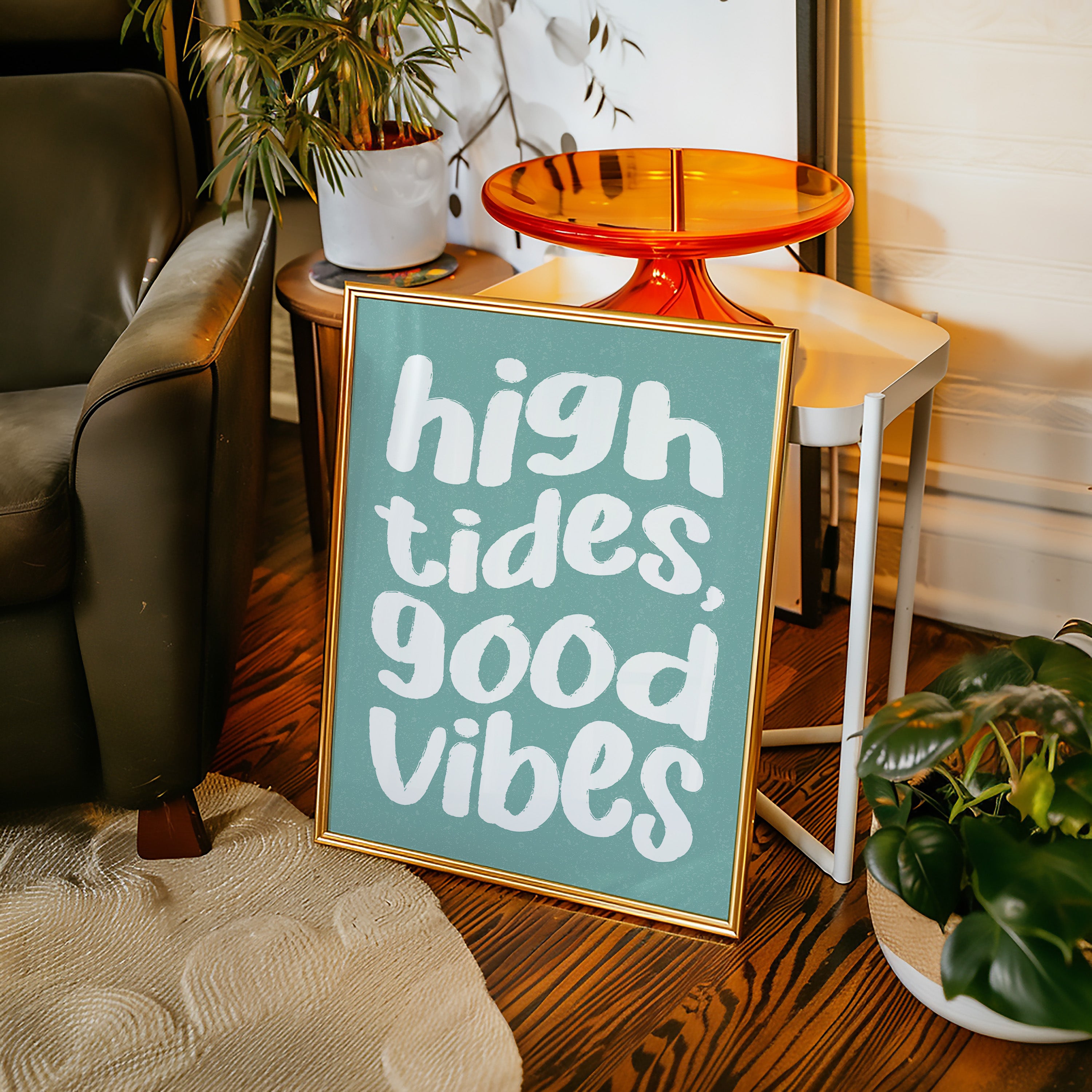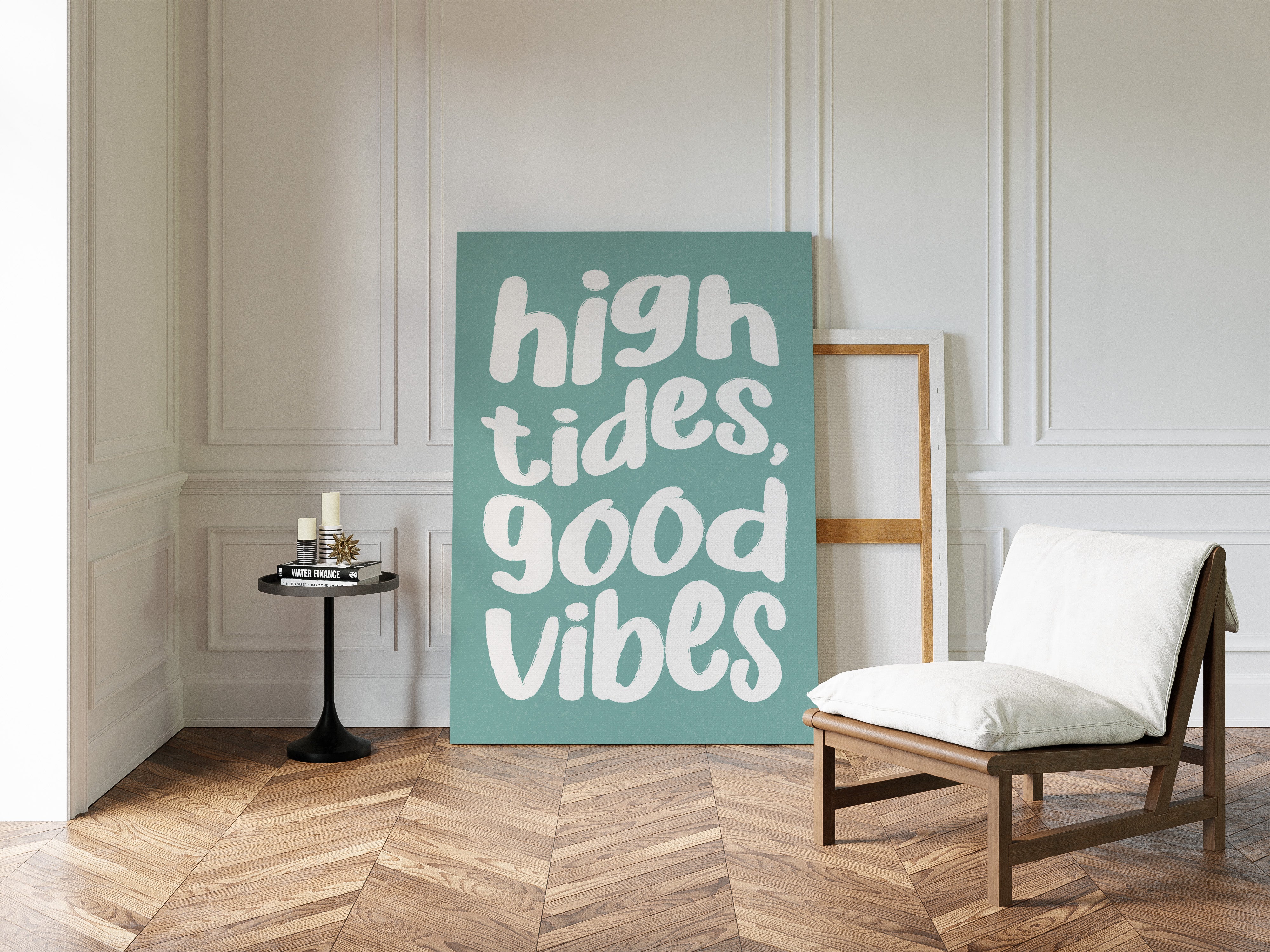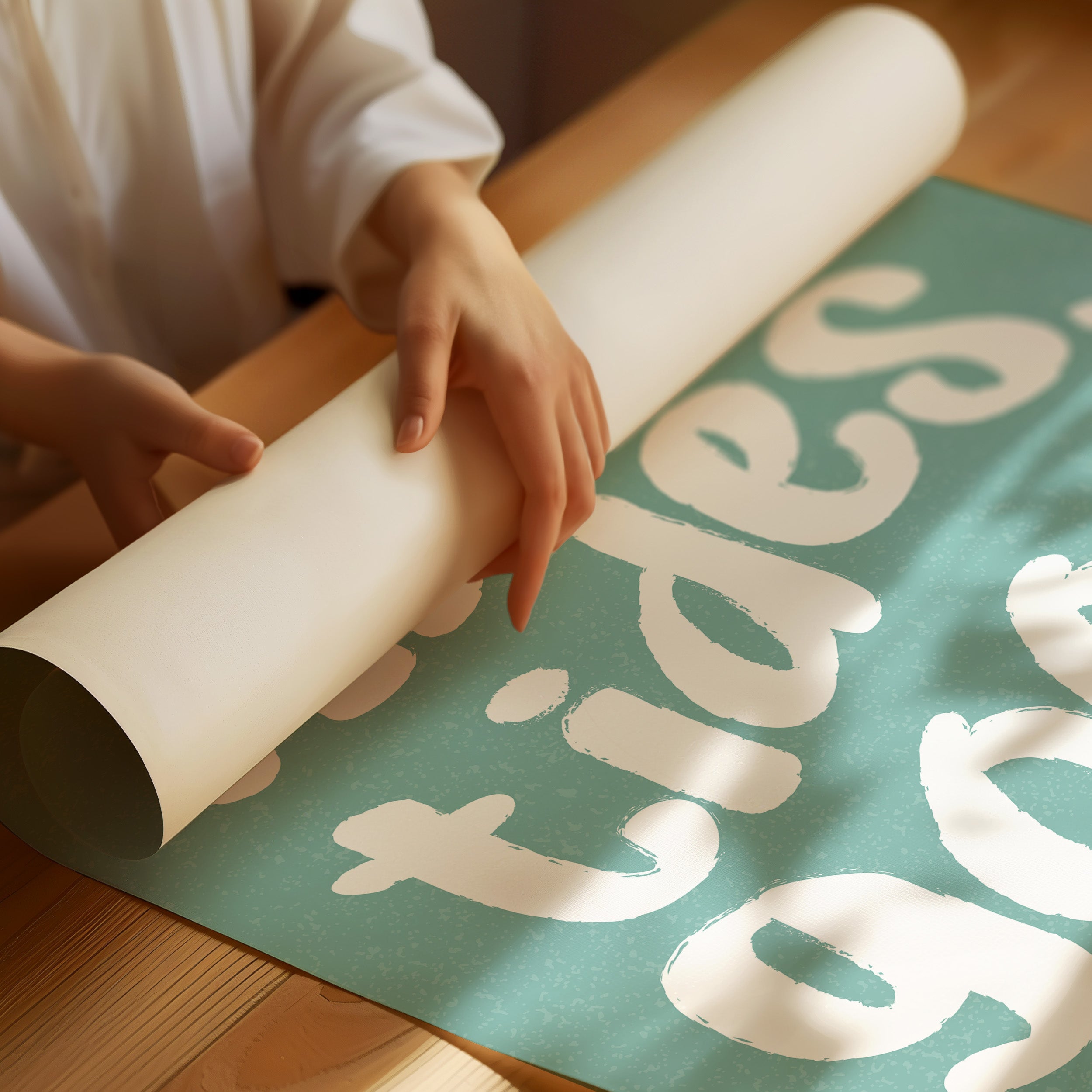 A harmonious blend of coastal charm and desert spirit comes alive in this scene, where a playful turquoise typography piece meets a hardy cactus companion. Part of our Contemporary collection, this composition speaks to the modern bohemian soul. The soft sage-green backdrop carries white hand-lettered words that dance with casual confidence, while the textured concrete wall and weathered wooden elements add industrial warmth to the setting. The minimal staging creates a perfect balance between urban edge and beachy ease. This piece brings instant personality to a home office, beach house living room, or any space seeking that perfect mix of laid-back sophistication.