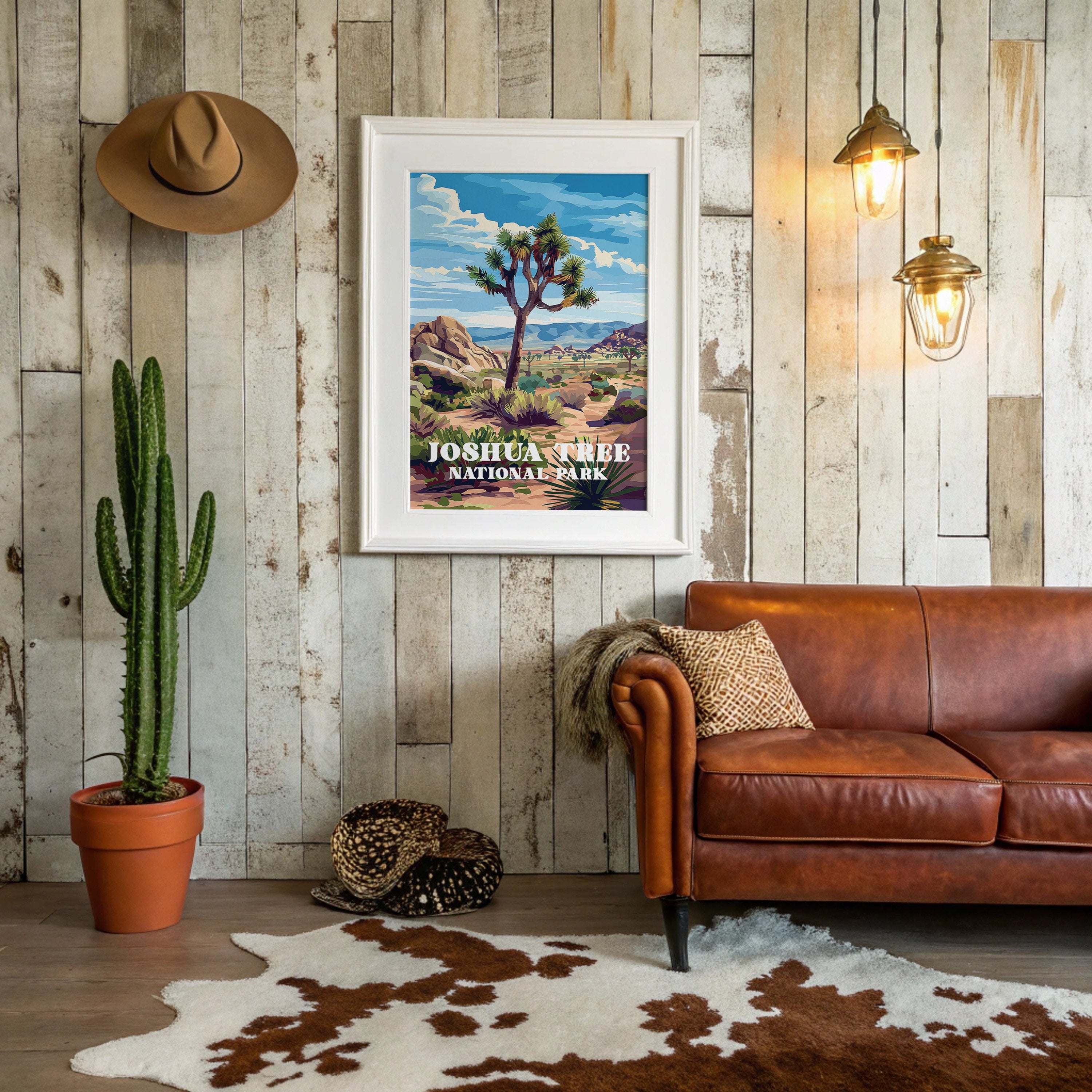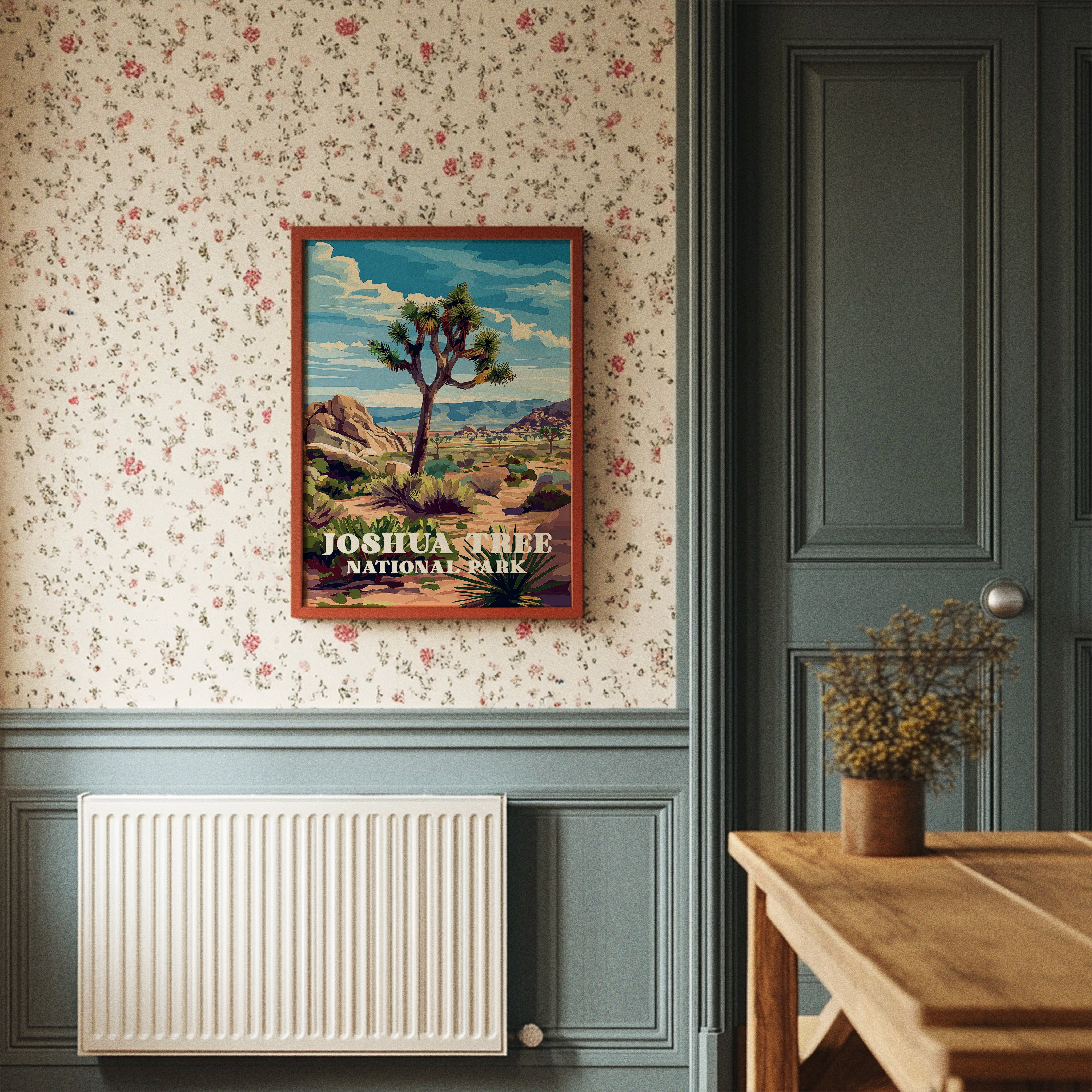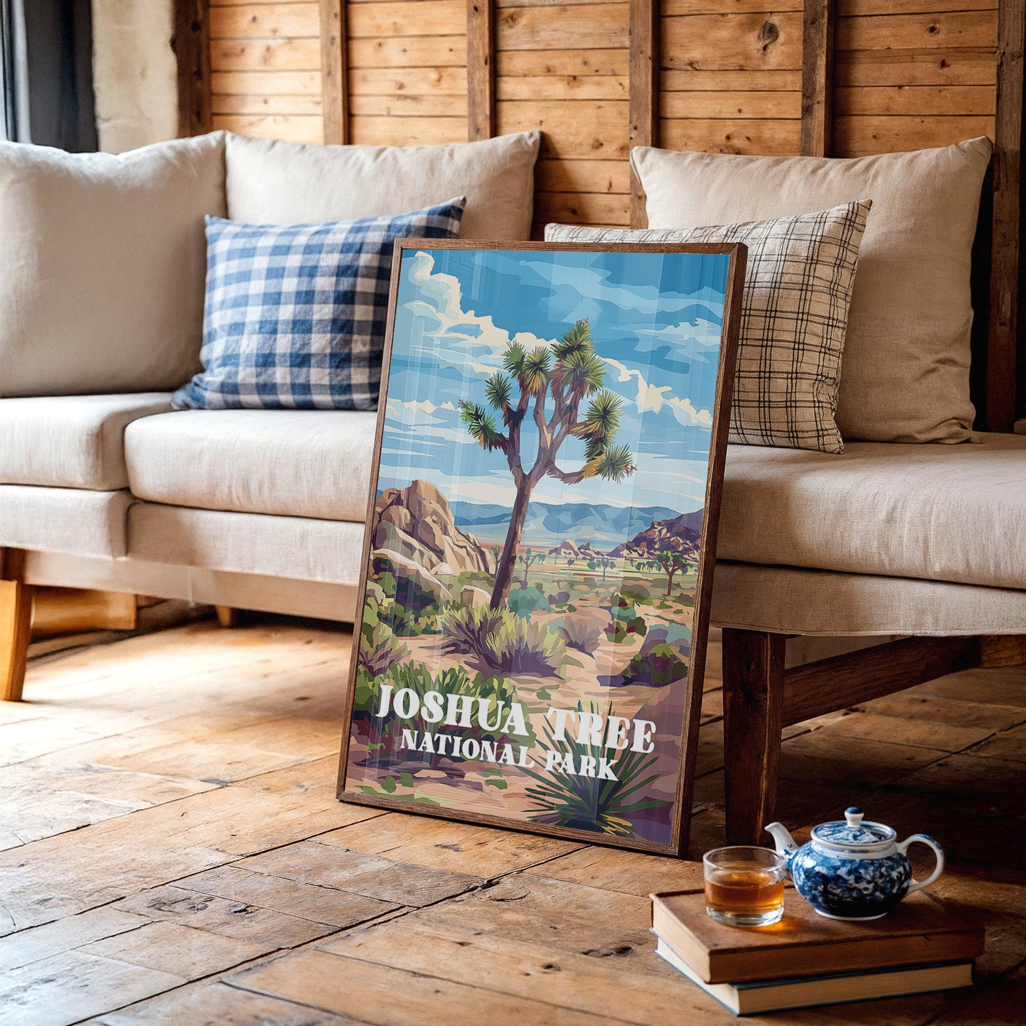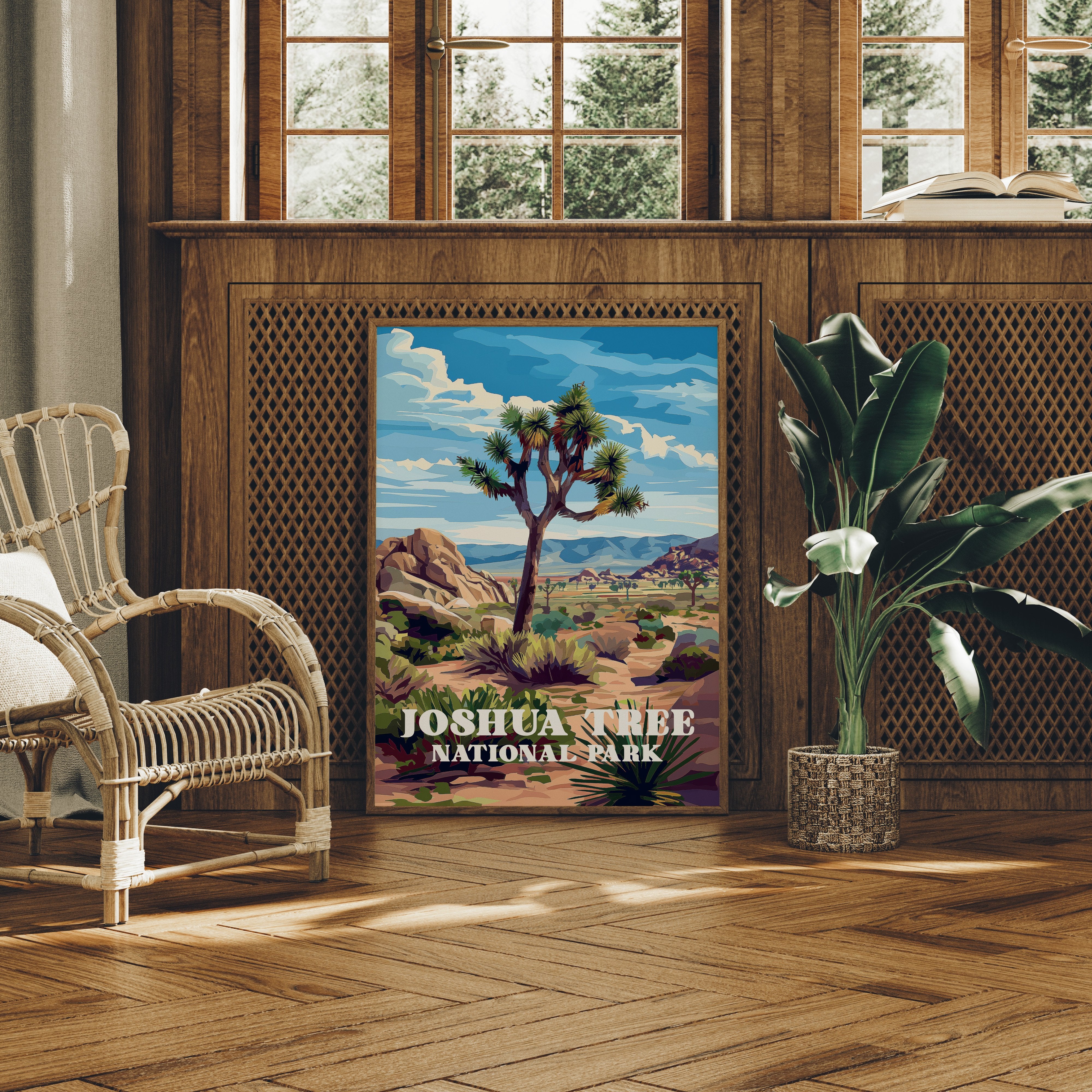Sunlight bathes the rugged landscape, where an iconic Joshua tree stands sentinel against a brilliant blue sky. The vivid illustration captures the raw beauty of the Mojave Desert with its distinctive rock formations and distant mountains rendered in warm ochres and purples. This vintage-inspired national park art celebrates the unique character of Joshua Tree, where ancient boulders and resilient desert flora create a timeless tableau.