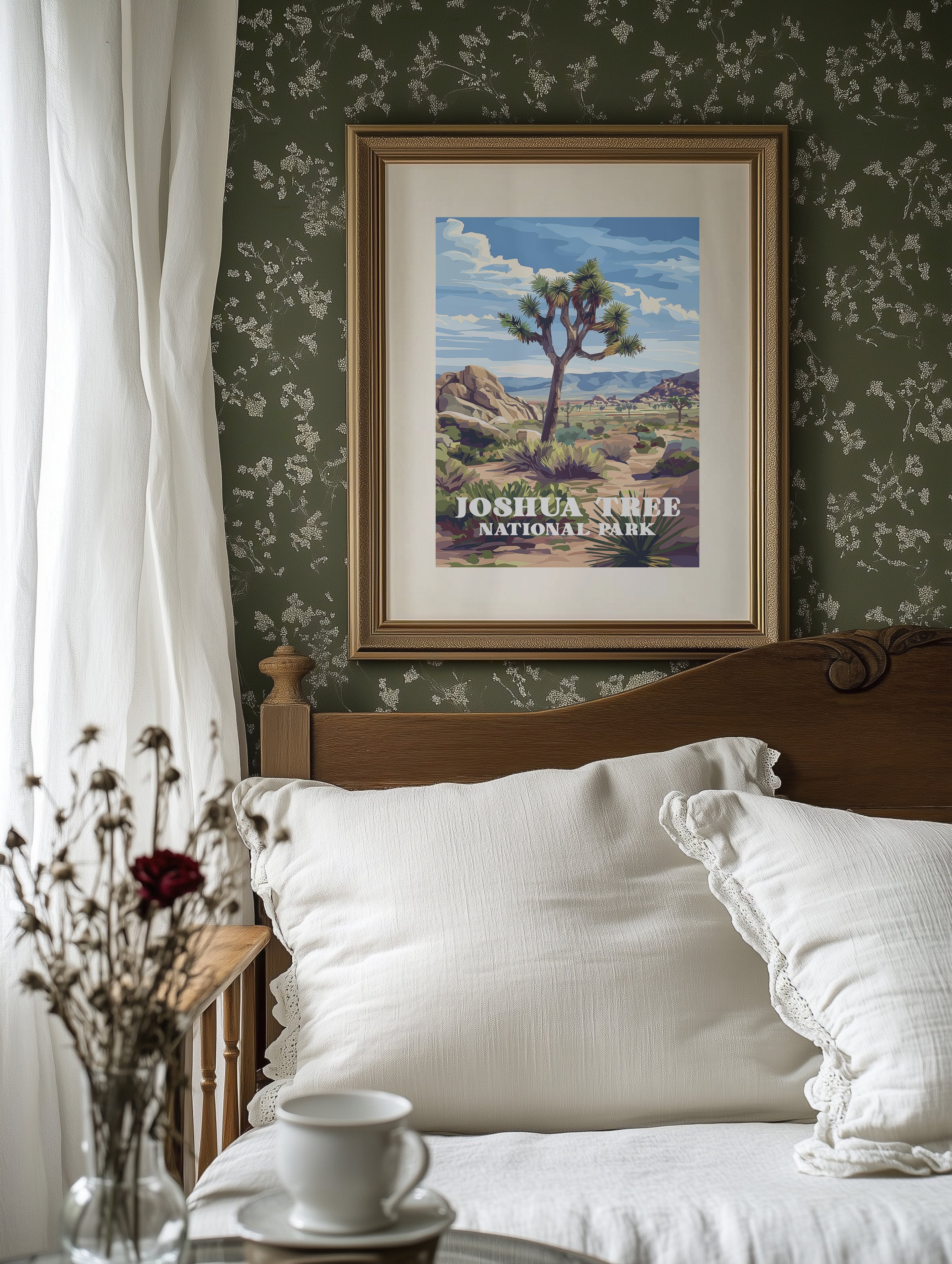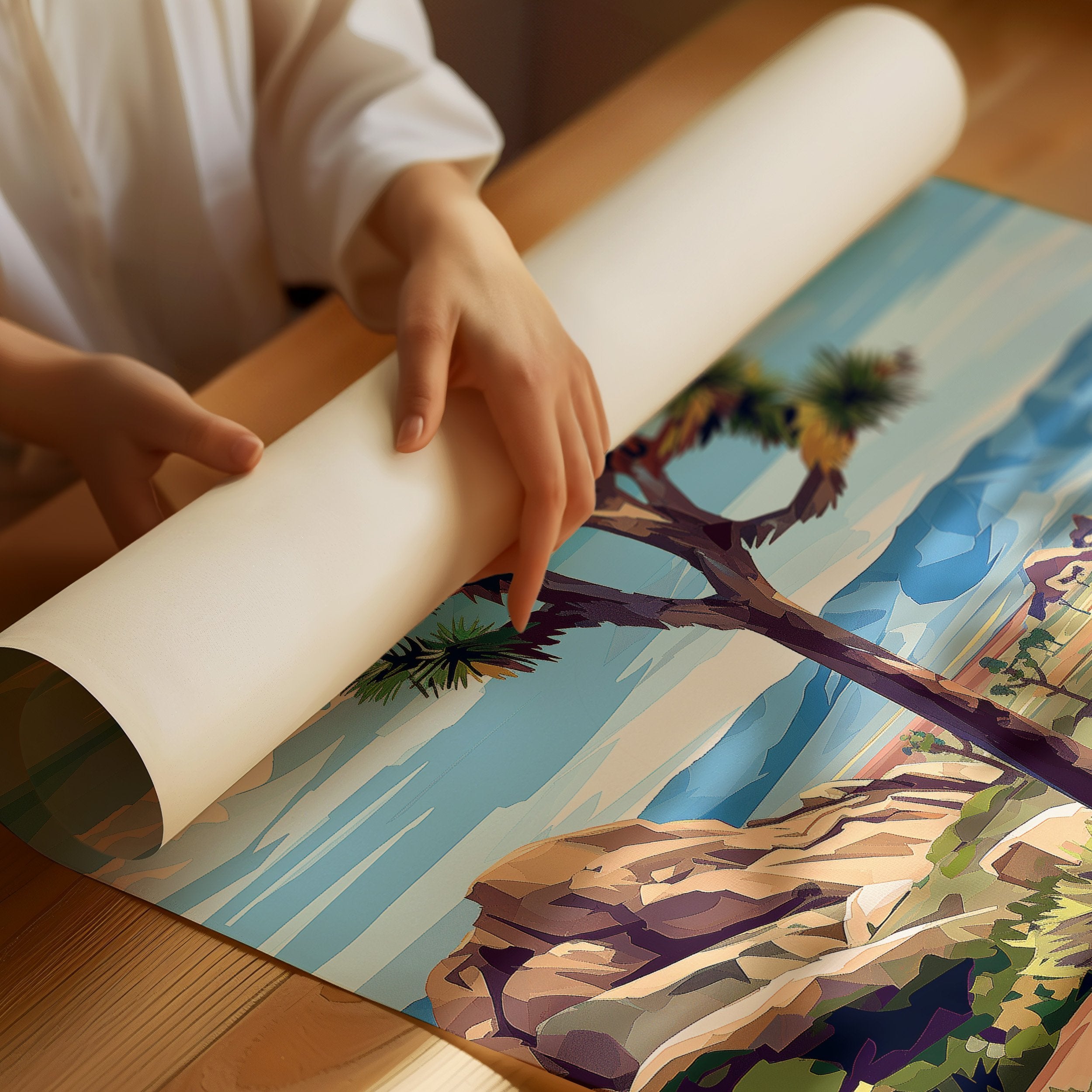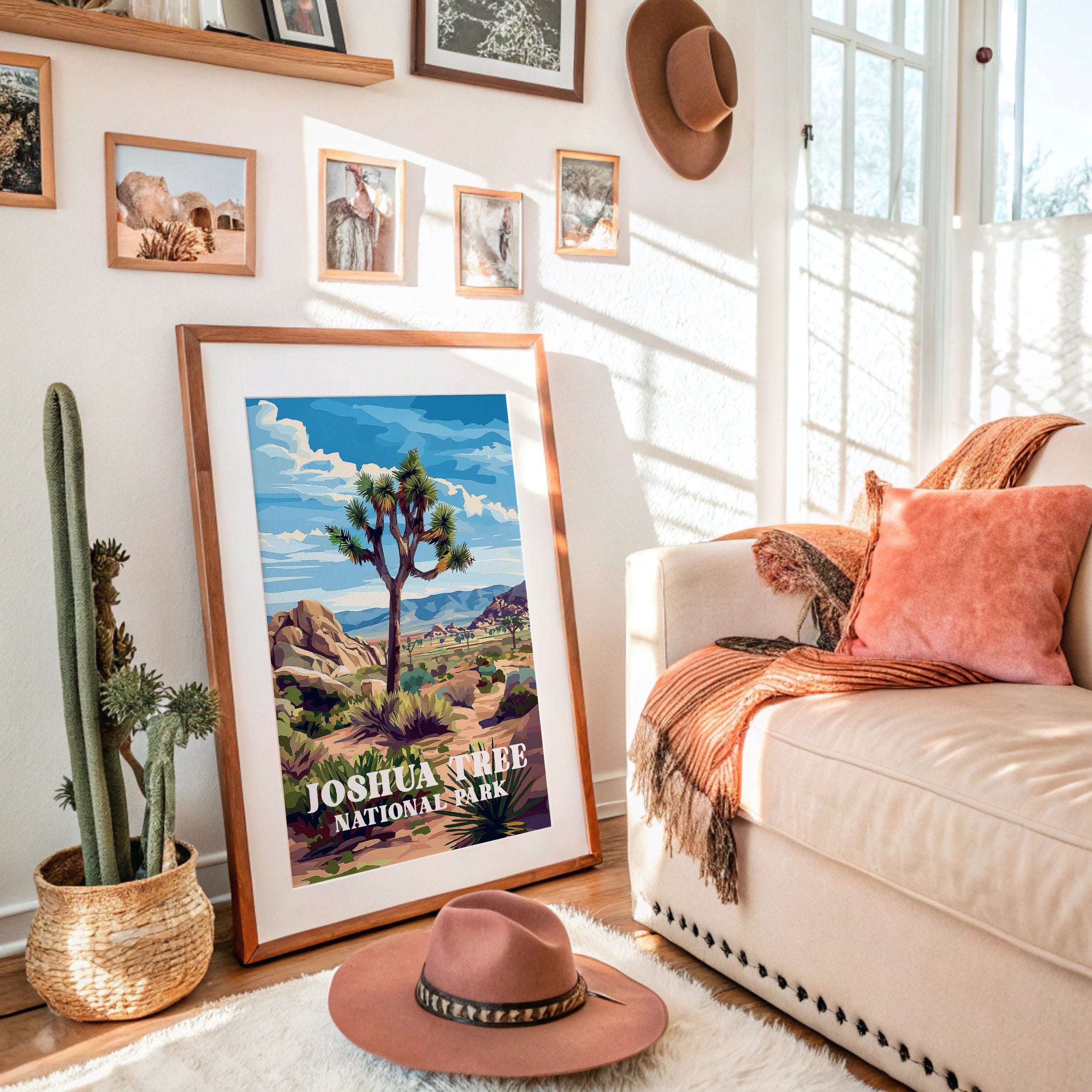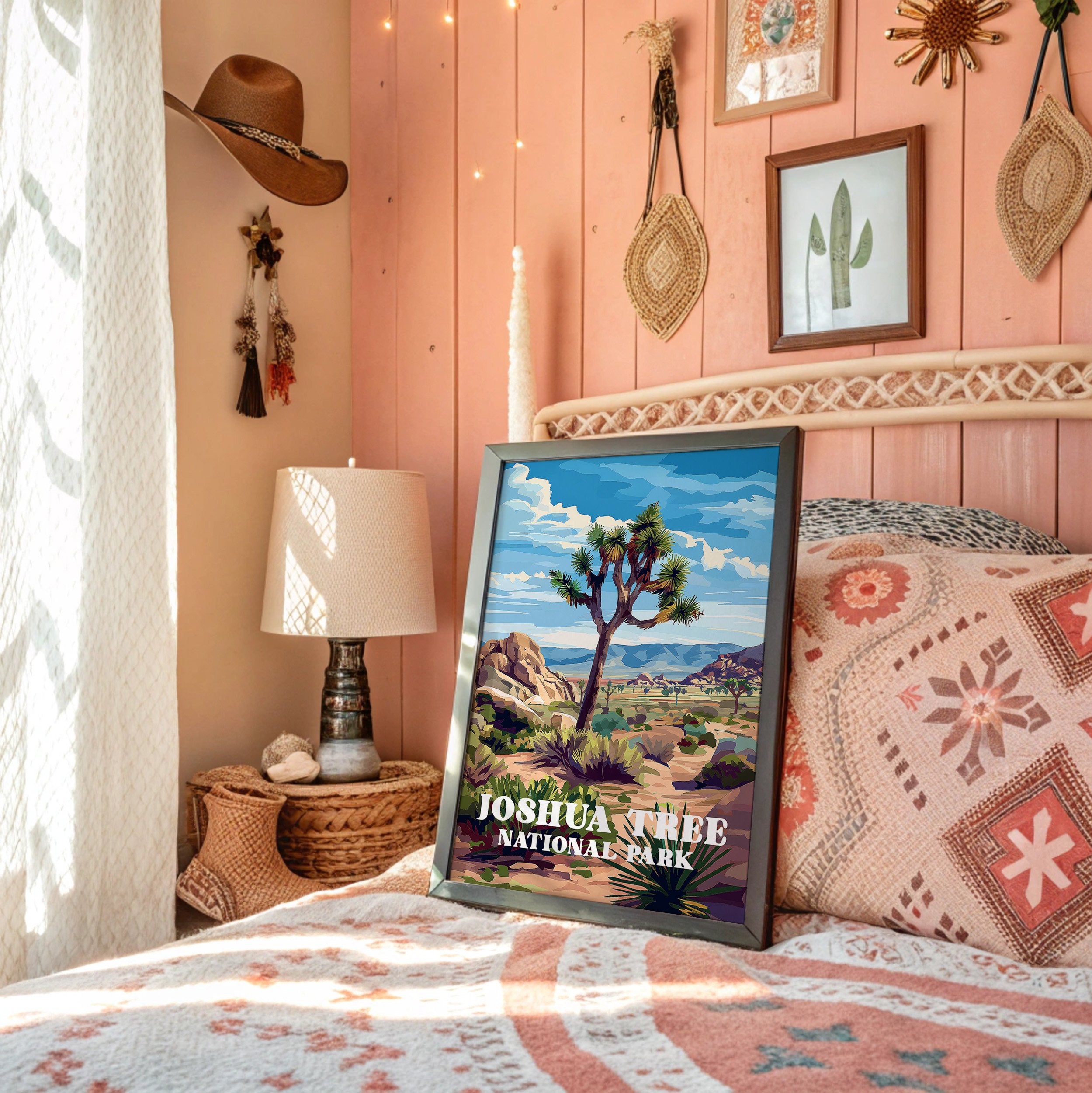 Sunlight bathes the rugged landscape, where an iconic Joshua tree stands sentinel against a brilliant blue sky. The vivid illustration captures the raw beauty of the Mojave Desert with its distinctive rock formations and distant mountains rendered in warm ochres and purples. This vintage-inspired national park art celebrates the unique character of Joshua Tree, where ancient boulders and resilient desert flora create a timeless tableau.