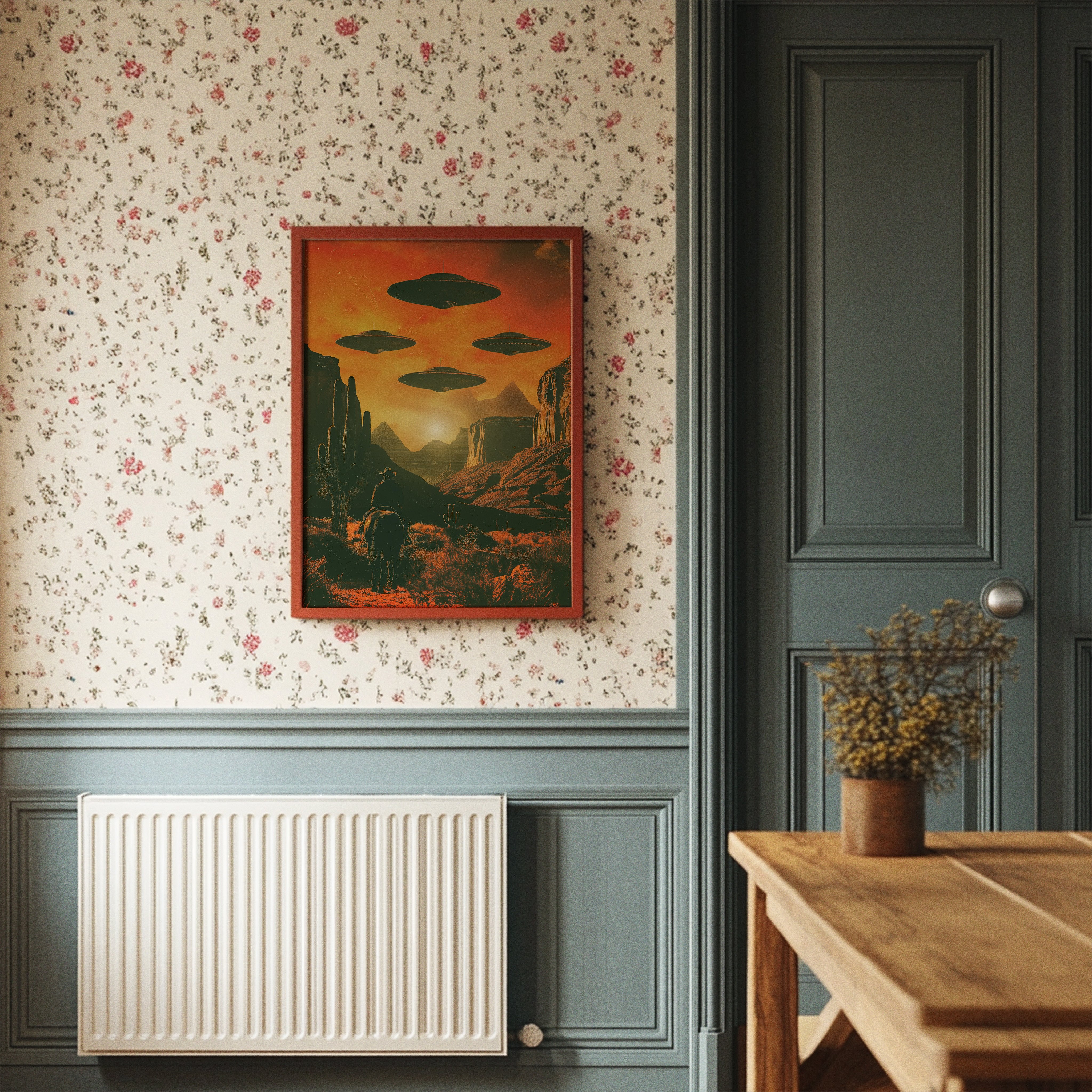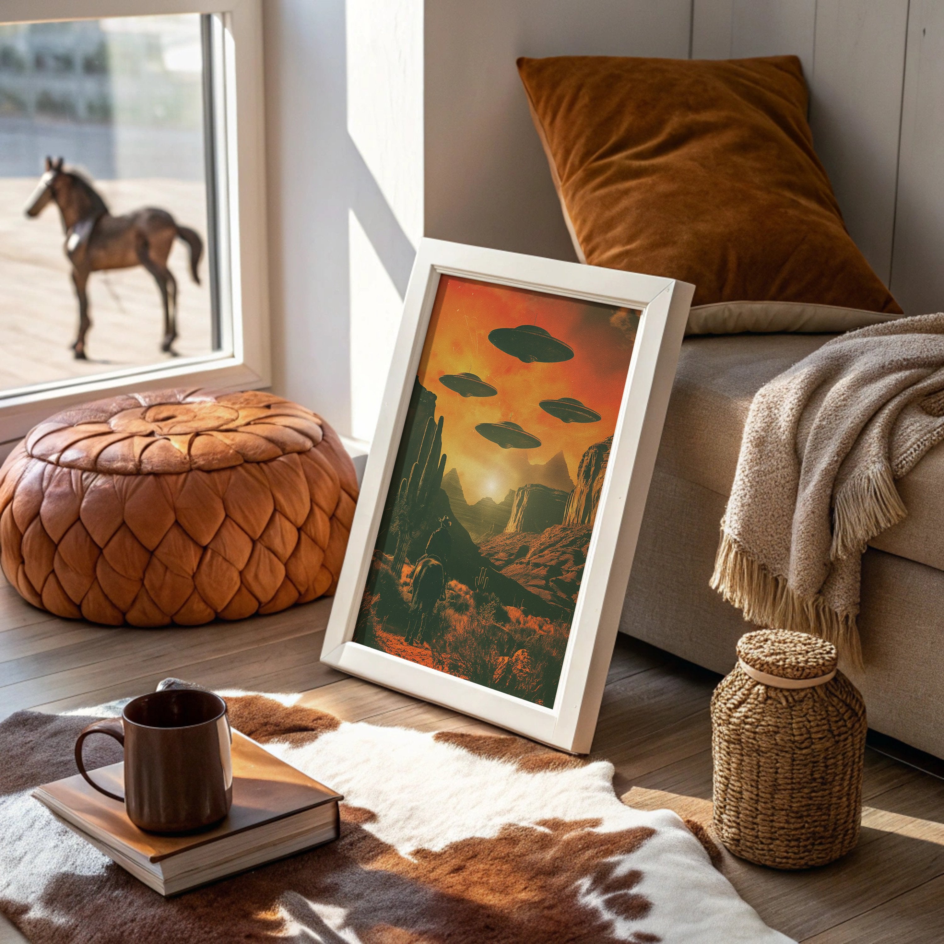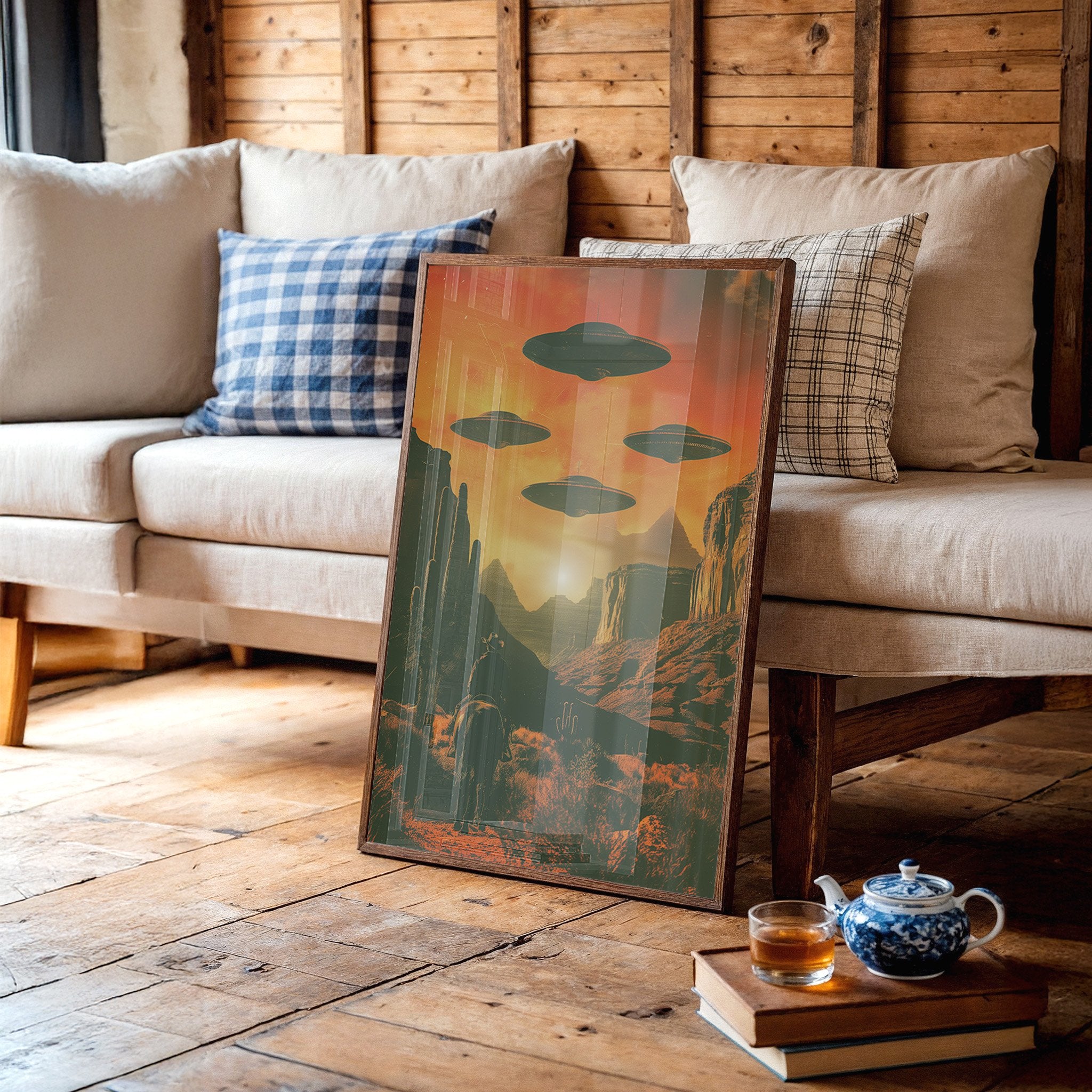 The amber glow of an otherworldly sunset bathes rugged canyon walls as mysterious craft hover silently above. Deep oranges and burnt sienna blend across a Martian-like landscape where reality and science fiction collide in spectacular harmony. The stark silhouettes of flying saucers against the fiery sky create a narrative of cosmic intrigue and unexplored frontiers. This statement piece brings retro sci-fi charm to rustic-modern spaces. Perfect for a home office, reading nook, or conversation-starting feature in a southwestern-inspired living room.