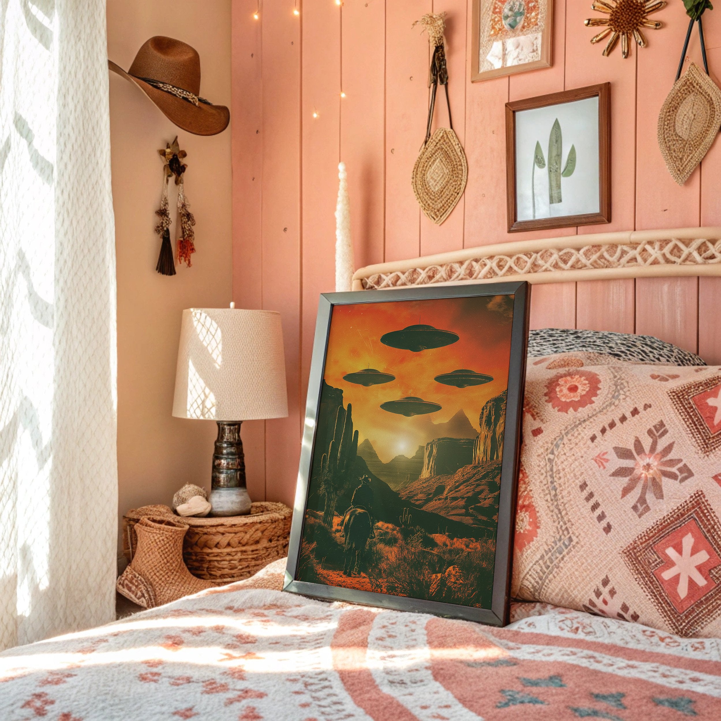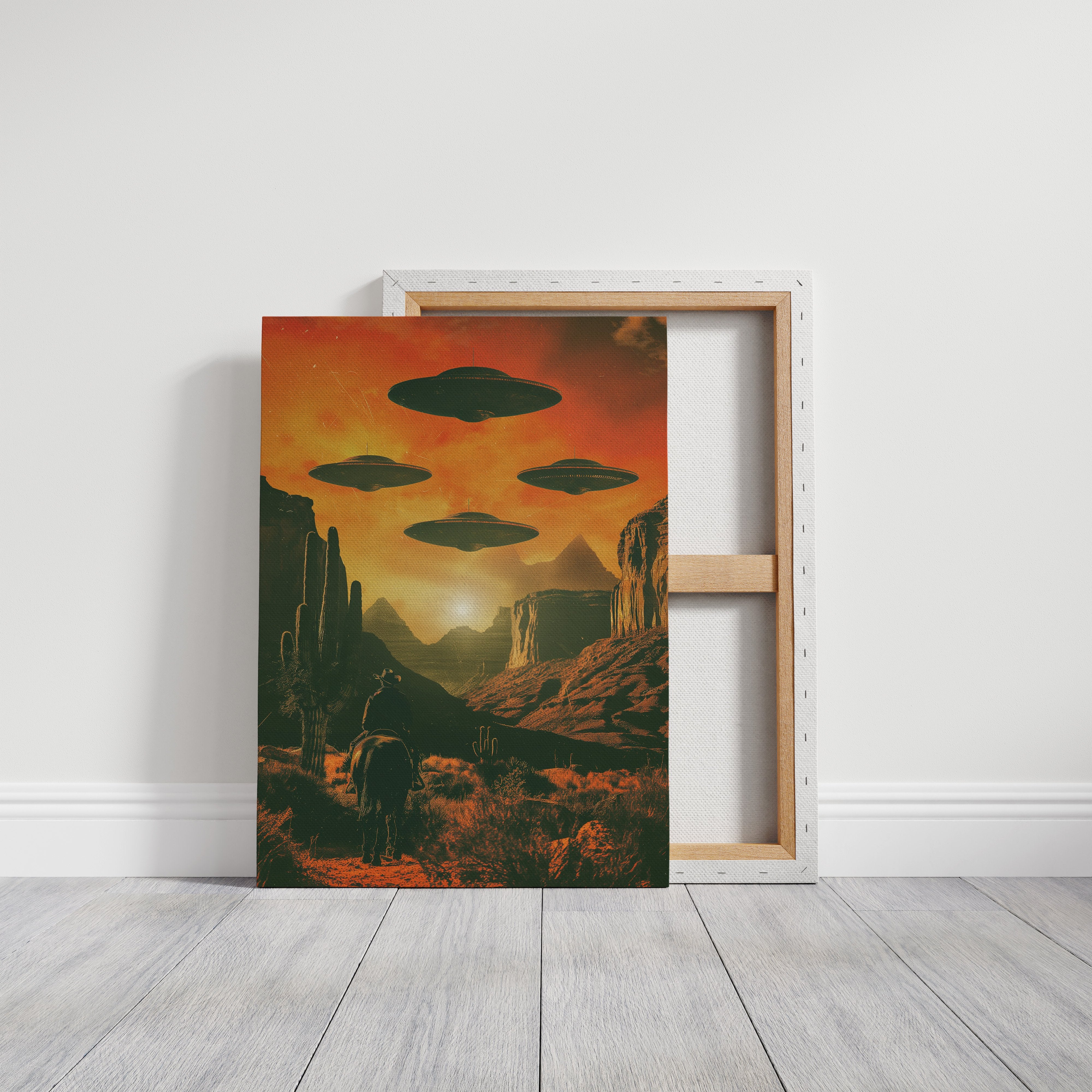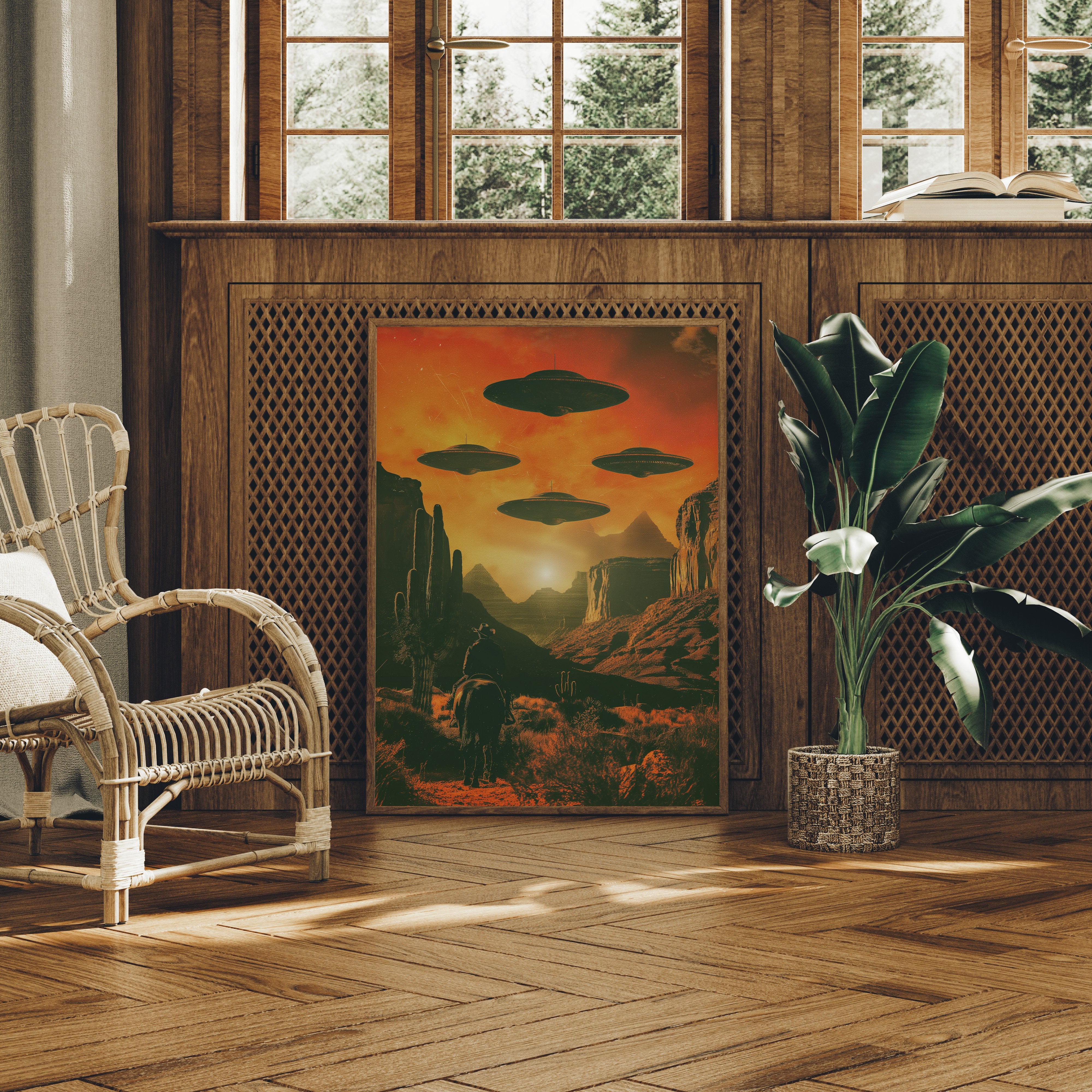 The amber glow of an otherworldly sunset bathes rugged canyon walls as mysterious craft hover silently above. Deep oranges and burnt sienna blend across a Martian-like landscape where reality and science fiction collide in spectacular harmony. The stark silhouettes of flying saucers against the fiery sky create a narrative of cosmic intrigue and unexplored frontiers. This statement piece brings retro sci-fi charm to rustic-modern spaces. Perfect for a home office, reading nook, or conversation-starting feature in a southwestern-inspired living room.