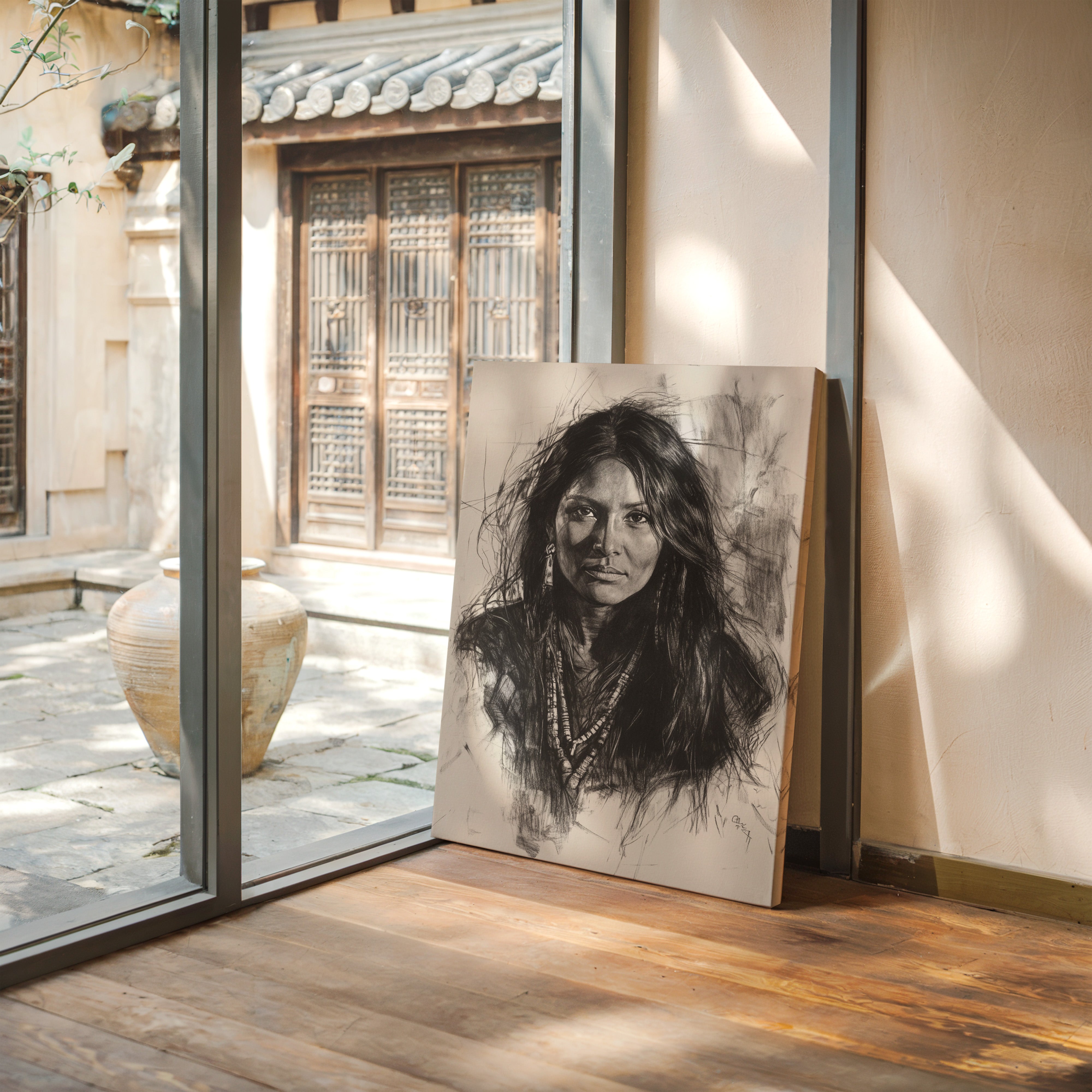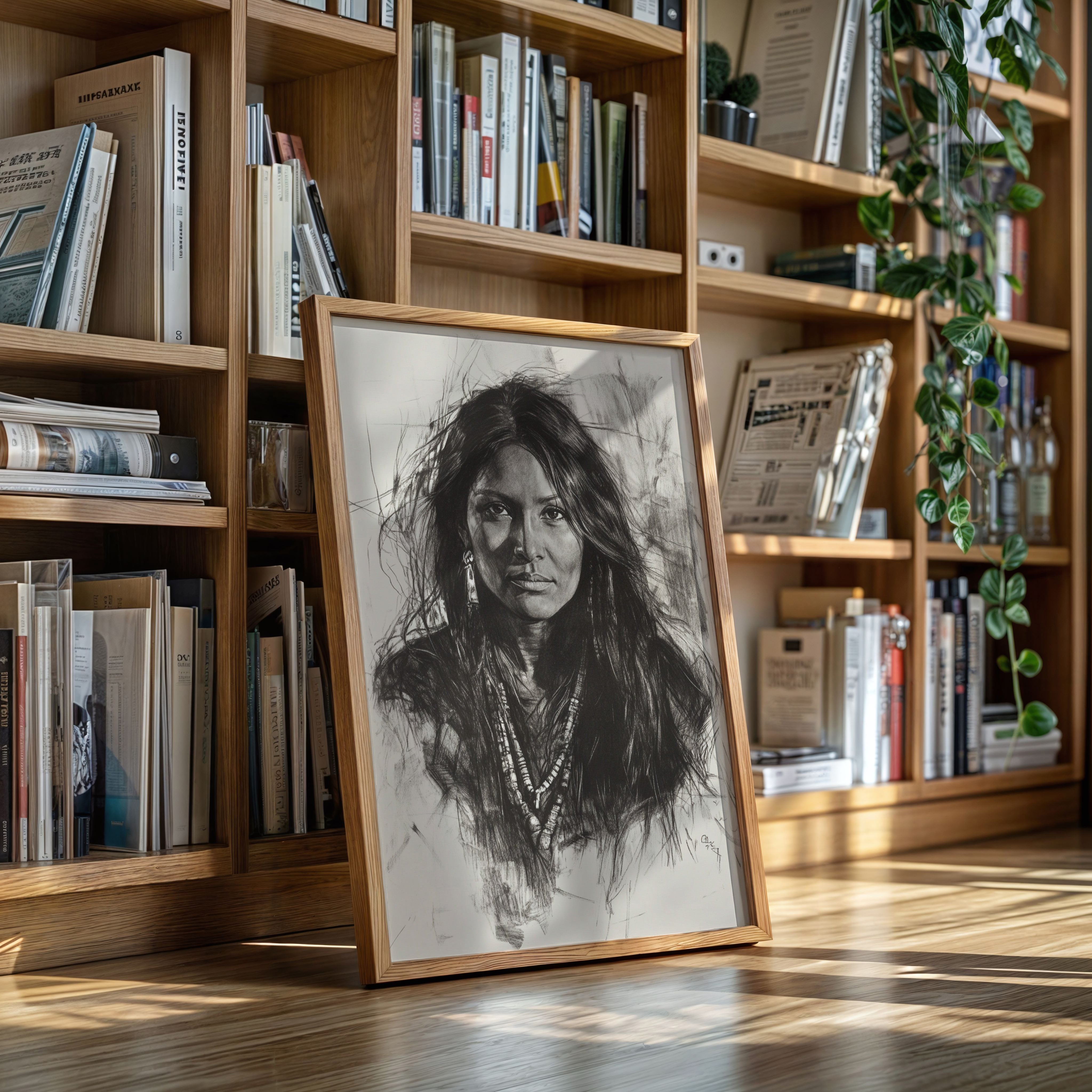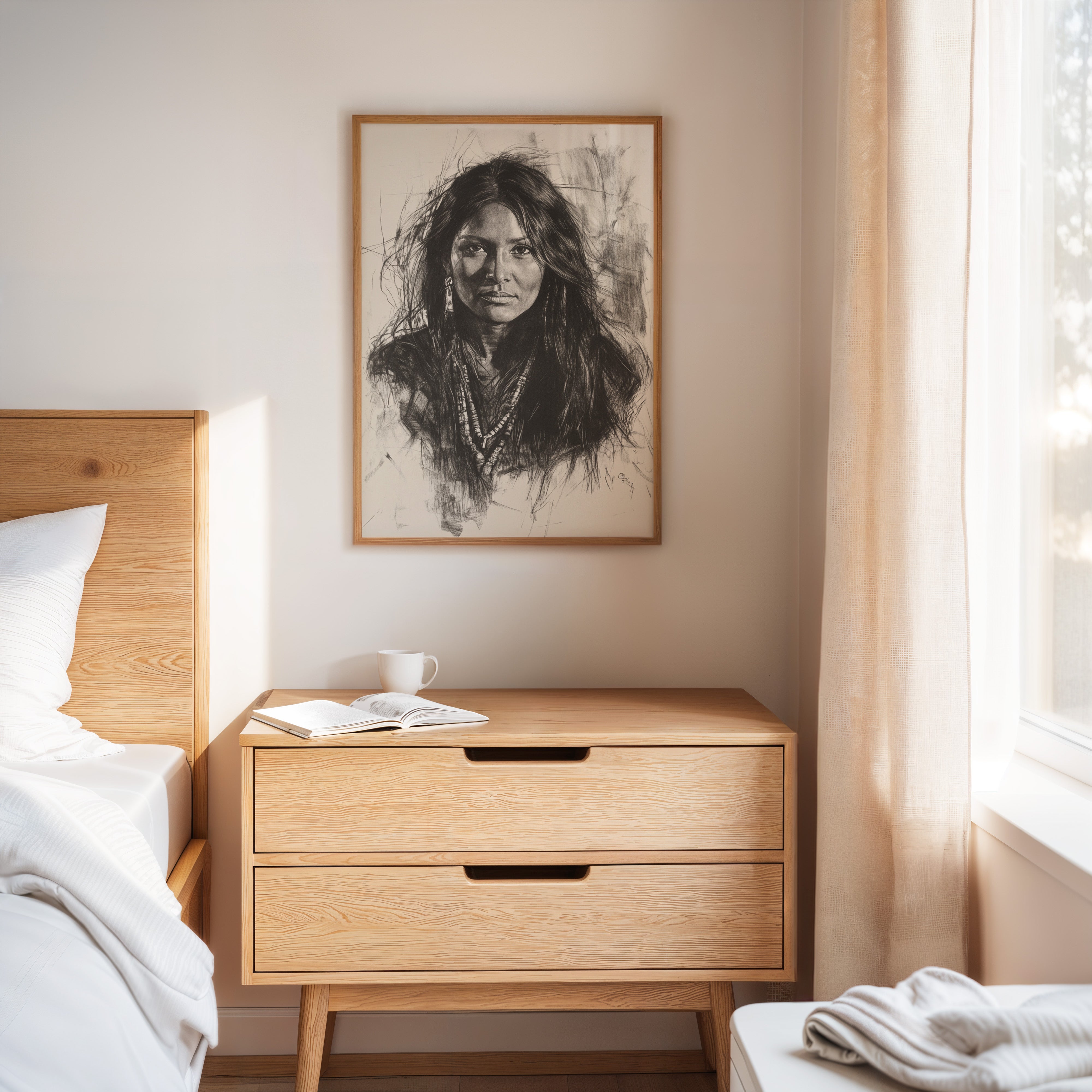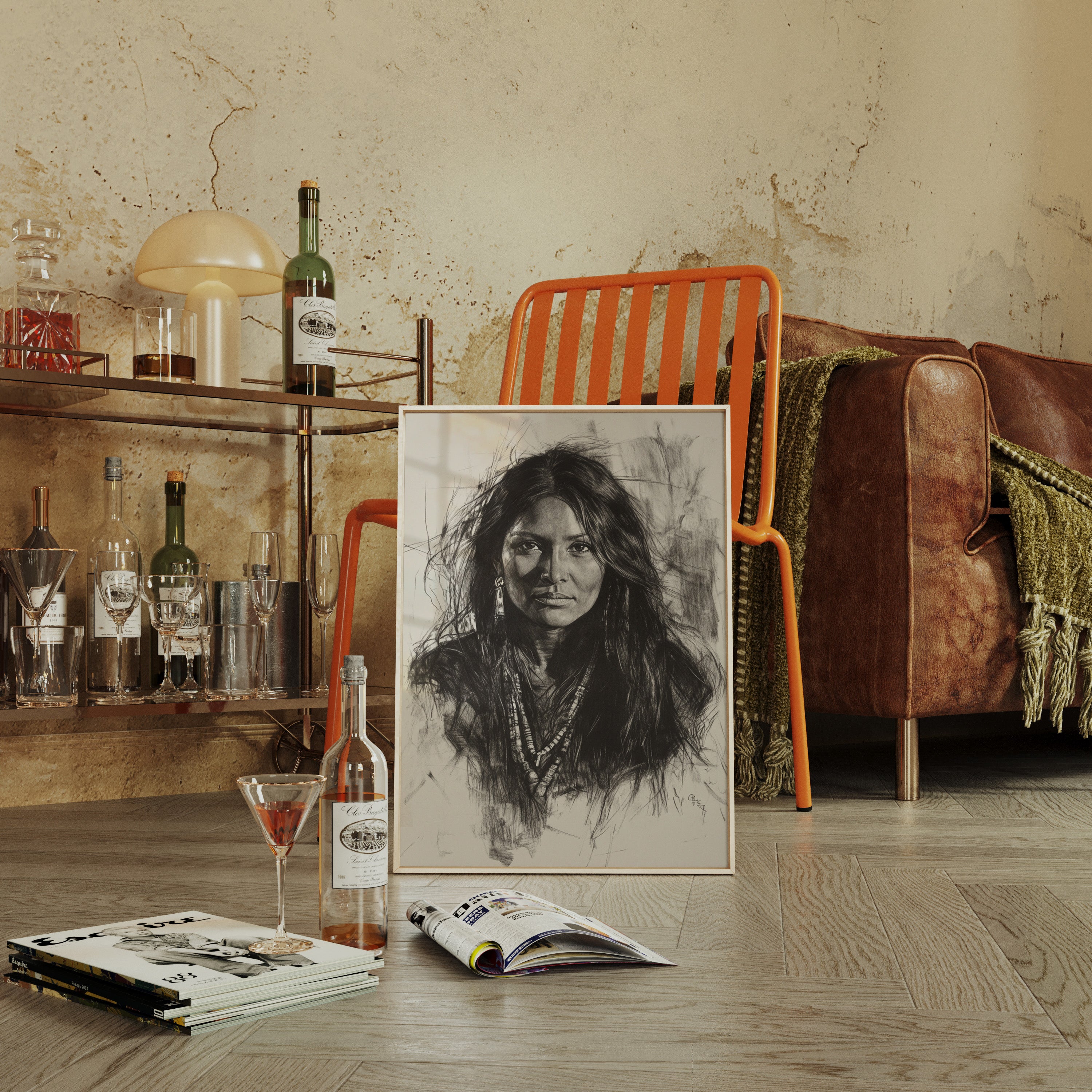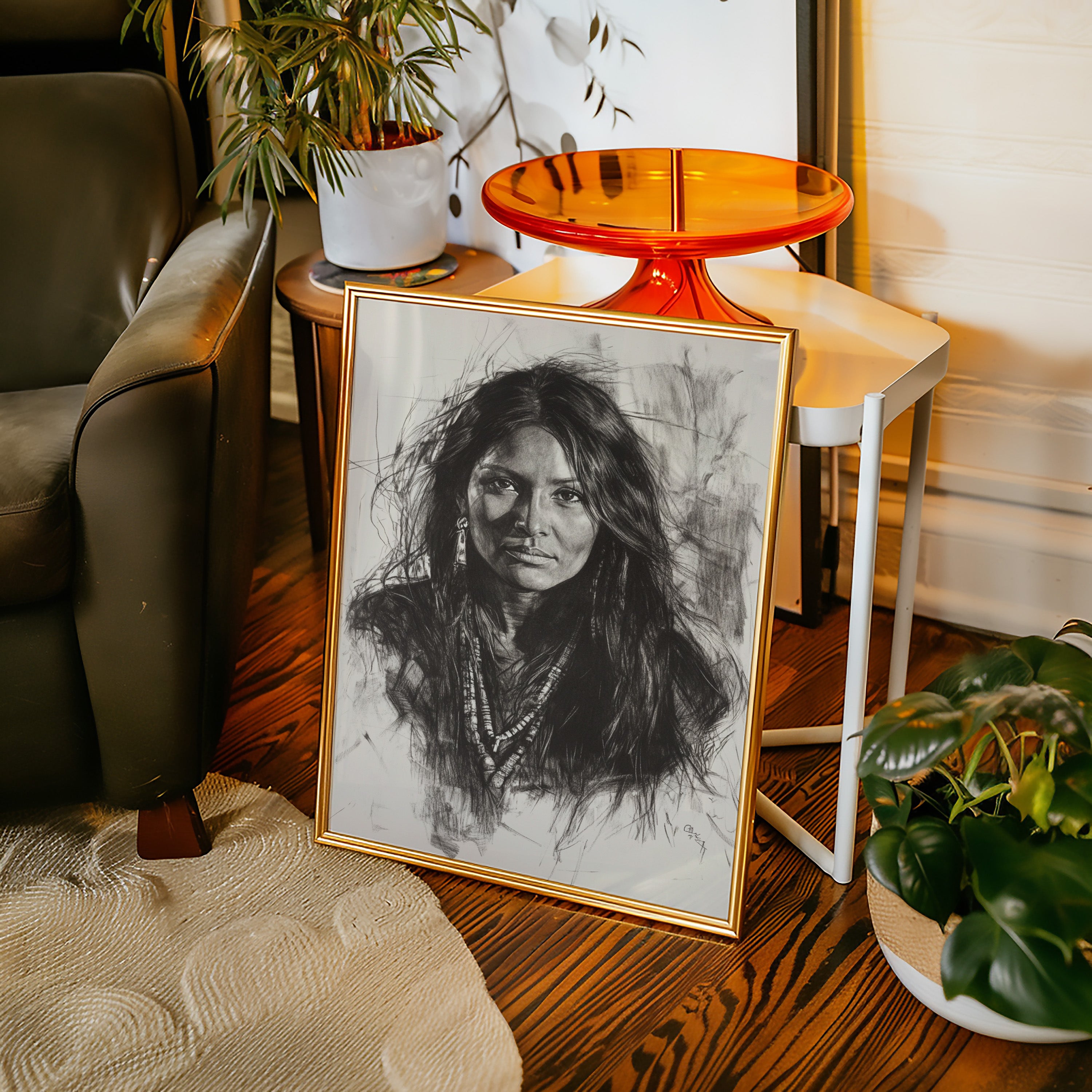 A powerful gaze meets the viewer with quiet strength in this raw, expressive charcoal portrait. The textured lines evoke spirit, heritage, and the enduring grace of the West.