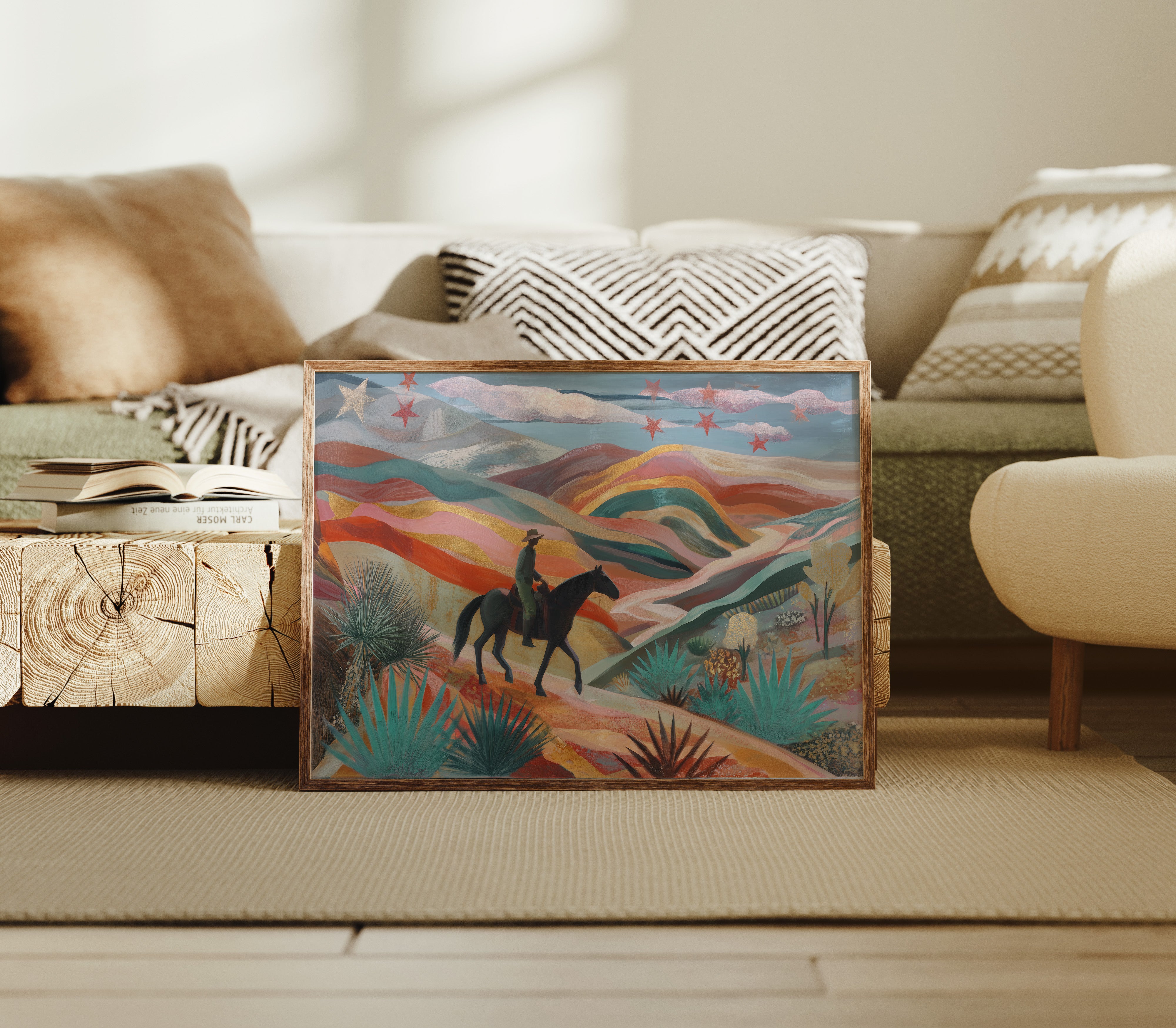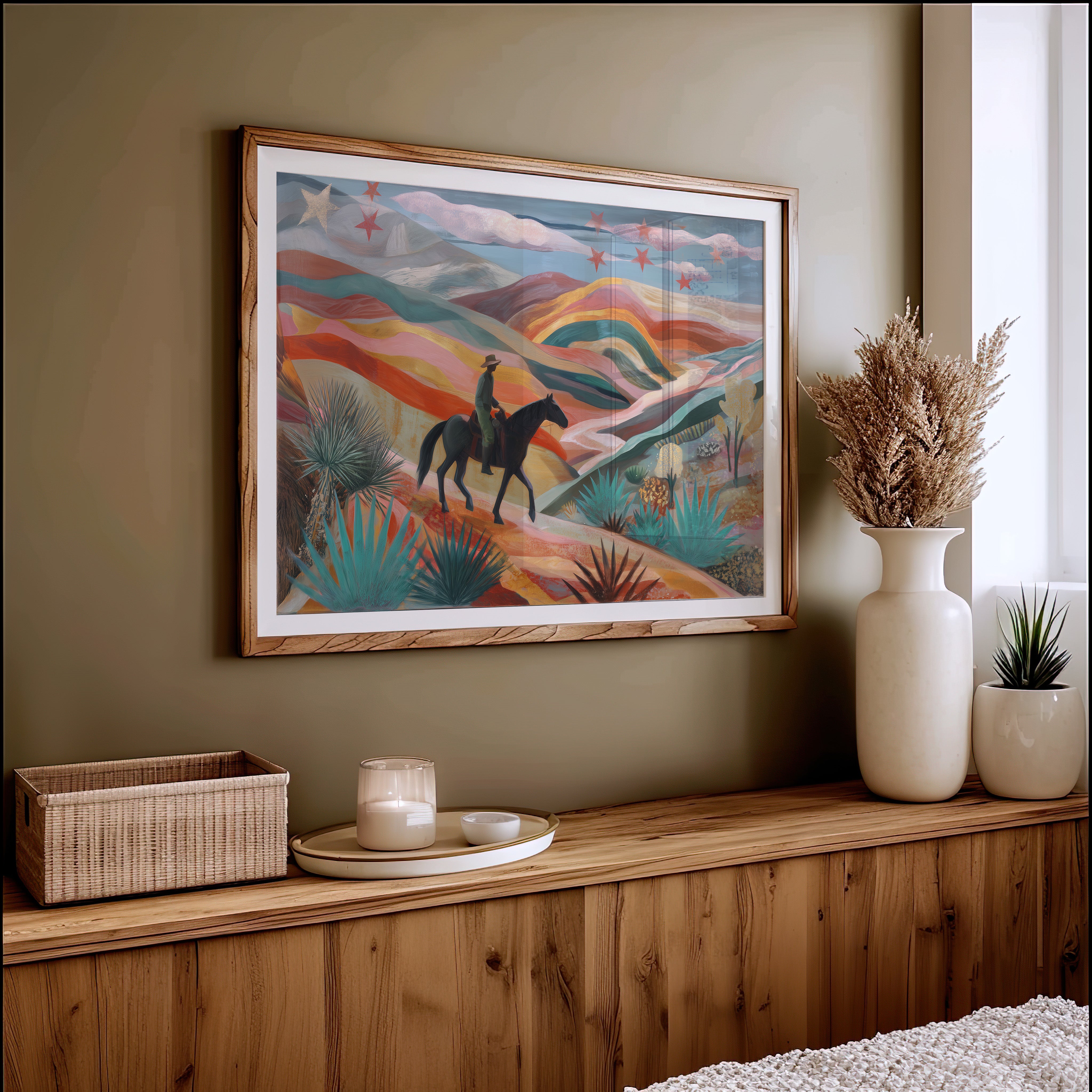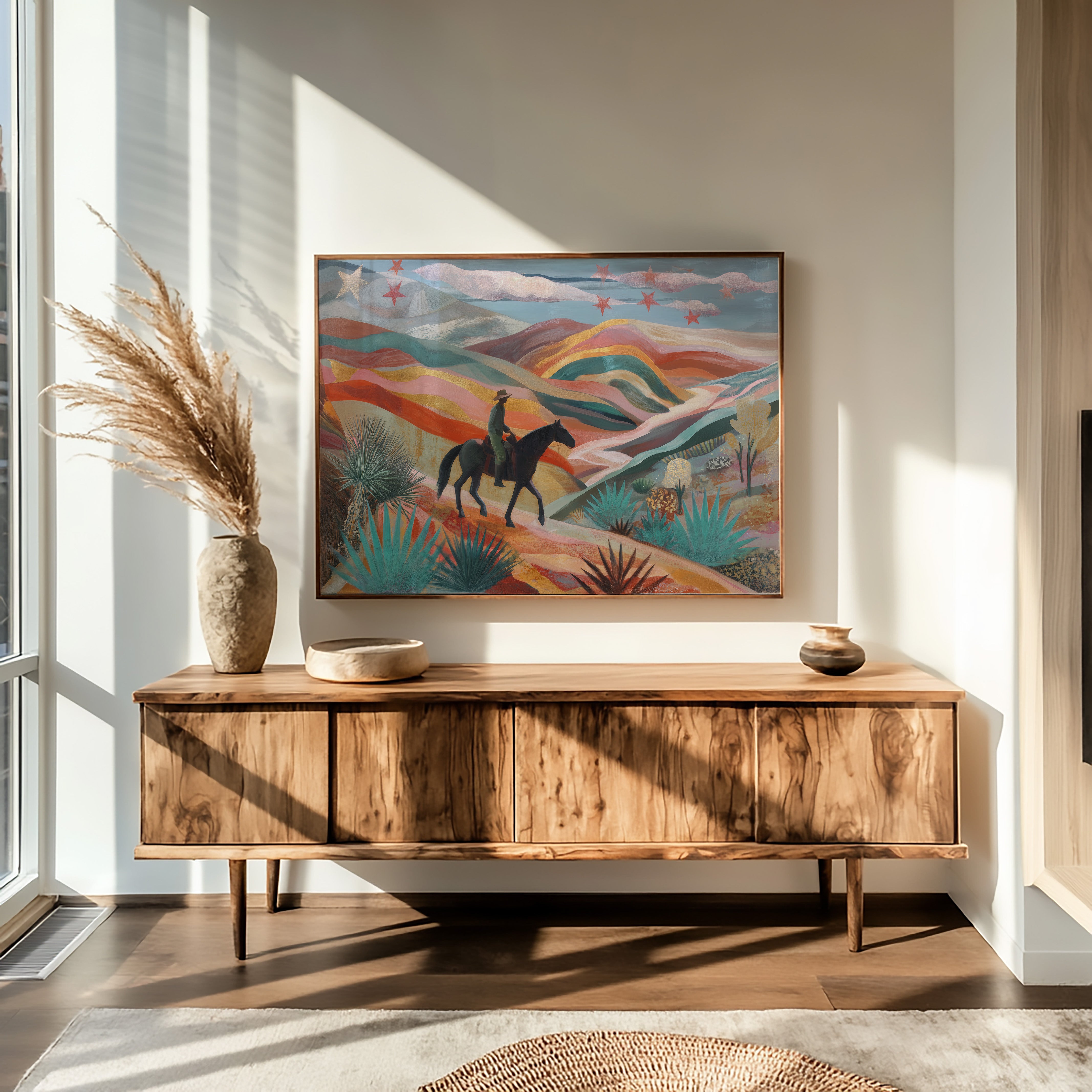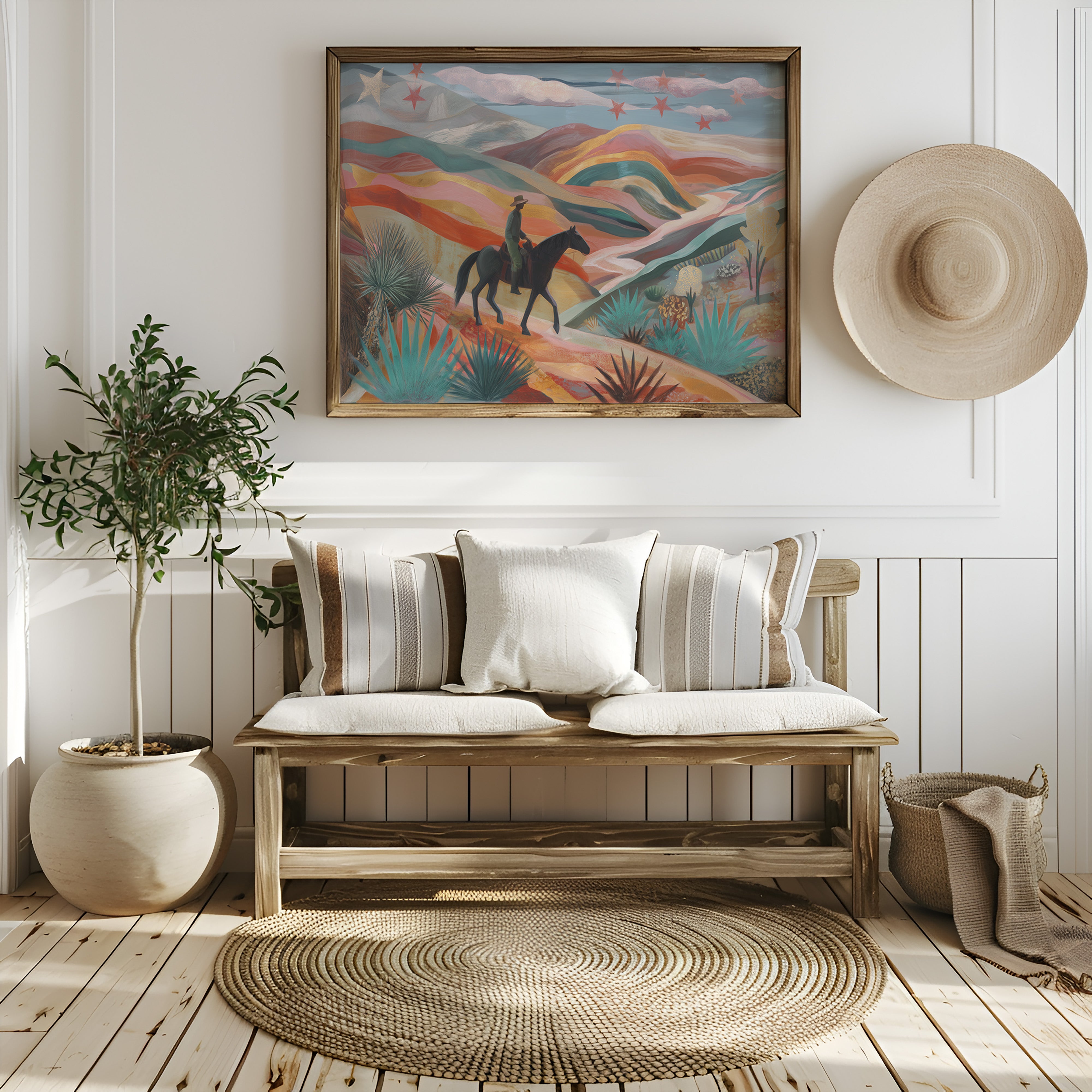 A lone rider traverses rolling desert hills painted in dreamy coral and turquoise hues, while crimson stars dust the twilight sky above. This piece from our Contemporary collection reimagines the classic American Southwest through a modern, ethereal lens. The undulating landscape unfolds in waves of warm terracotta, soft pink, and deep teal, punctuated by graphic agave plants and yucca in the foreground. The silhouetted horseback figure moves through this enchanted terrain like a character in a desert fairytale. Perfect for adding a touch of modern southwestern charm to a living room or bringing bold, artistic energy to an office space. The piece invites viewers to explore their own journey through this magical landscape.