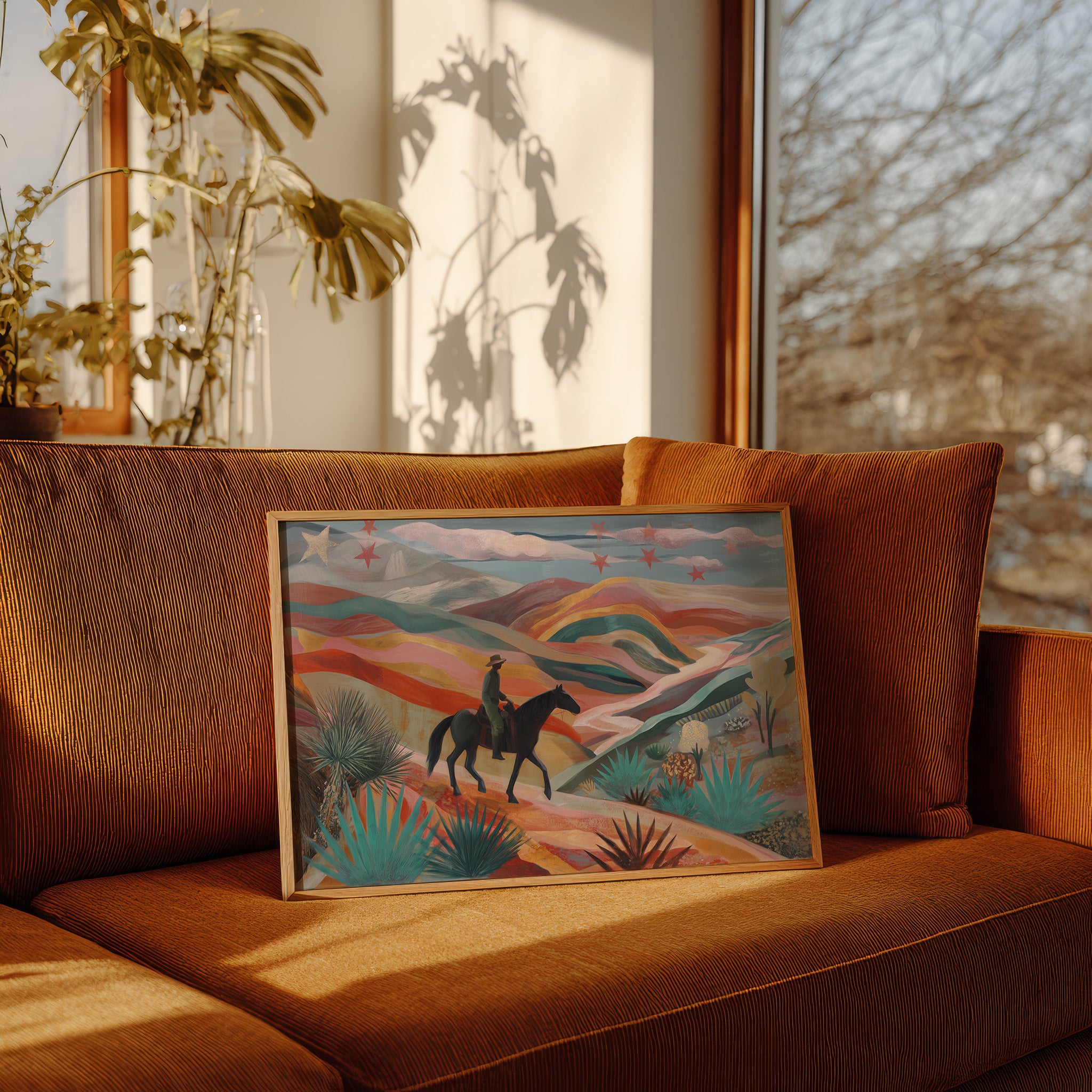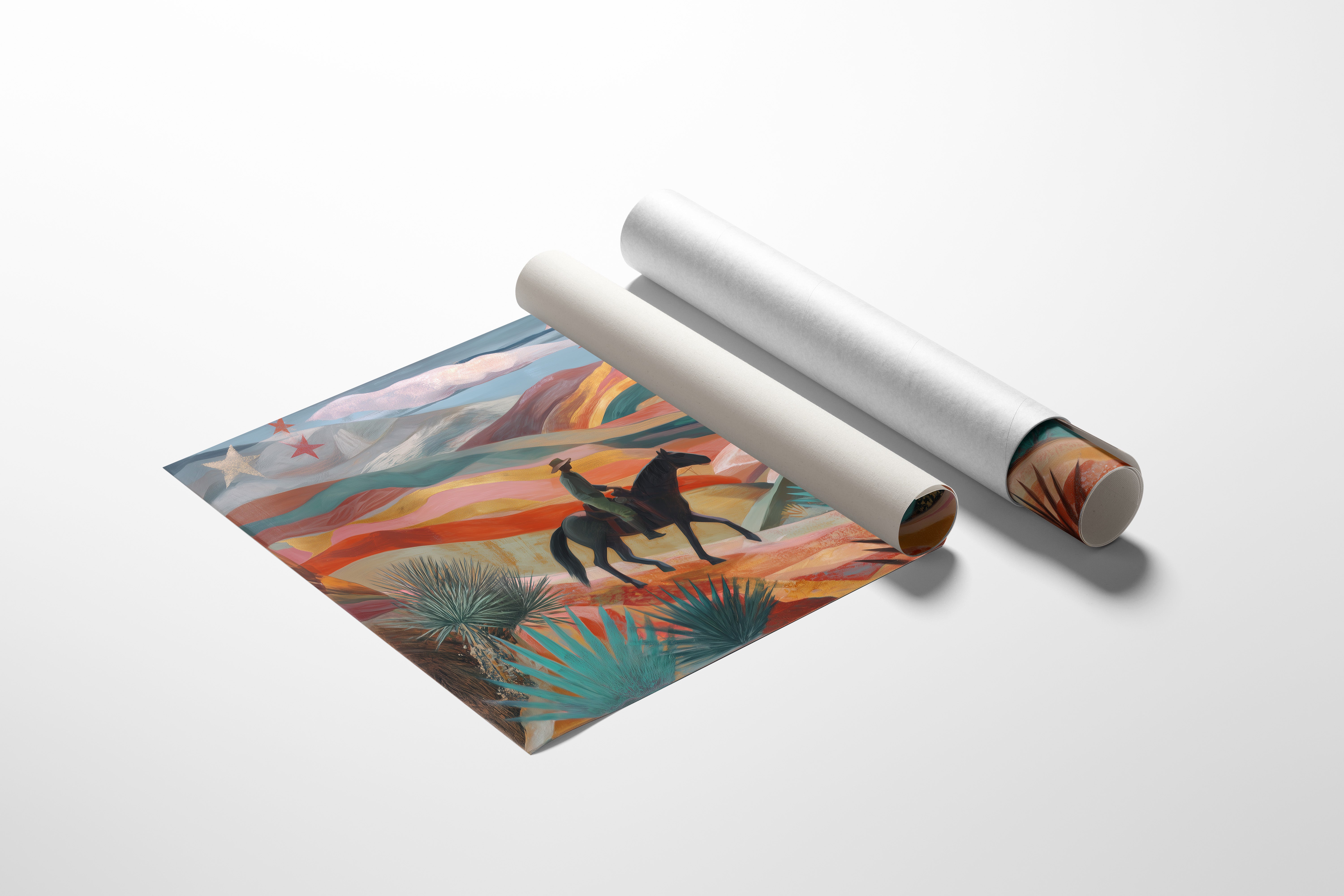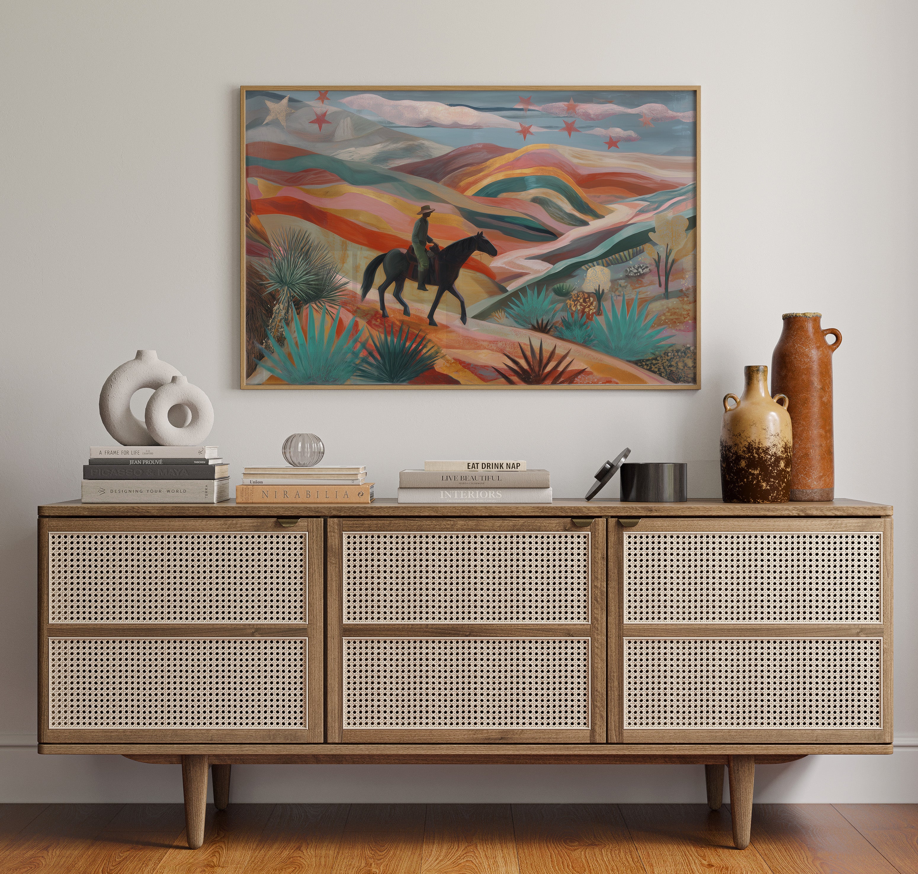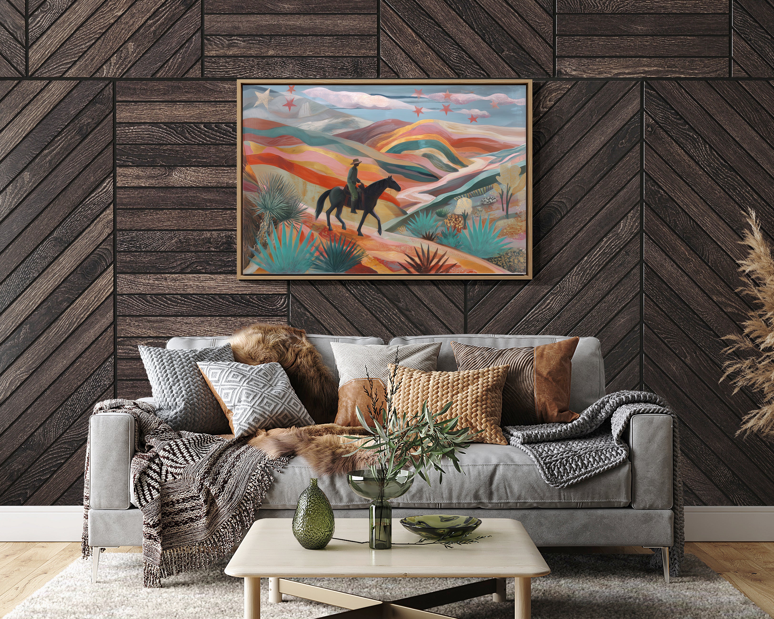 A lone rider traverses rolling desert hills painted in dreamy coral and turquoise hues, while crimson stars dust the twilight sky above. This piece from our Contemporary collection reimagines the classic American Southwest through a modern, ethereal lens. The undulating landscape unfolds in waves of warm terracotta, soft pink, and deep teal, punctuated by graphic agave plants and yucca in the foreground. The silhouetted horseback figure moves through this enchanted terrain like a character in a desert fairytale. Perfect for adding a touch of modern southwestern charm to a living room or bringing bold, artistic energy to an office space. The piece invites viewers to explore their own journey through this magical landscape.