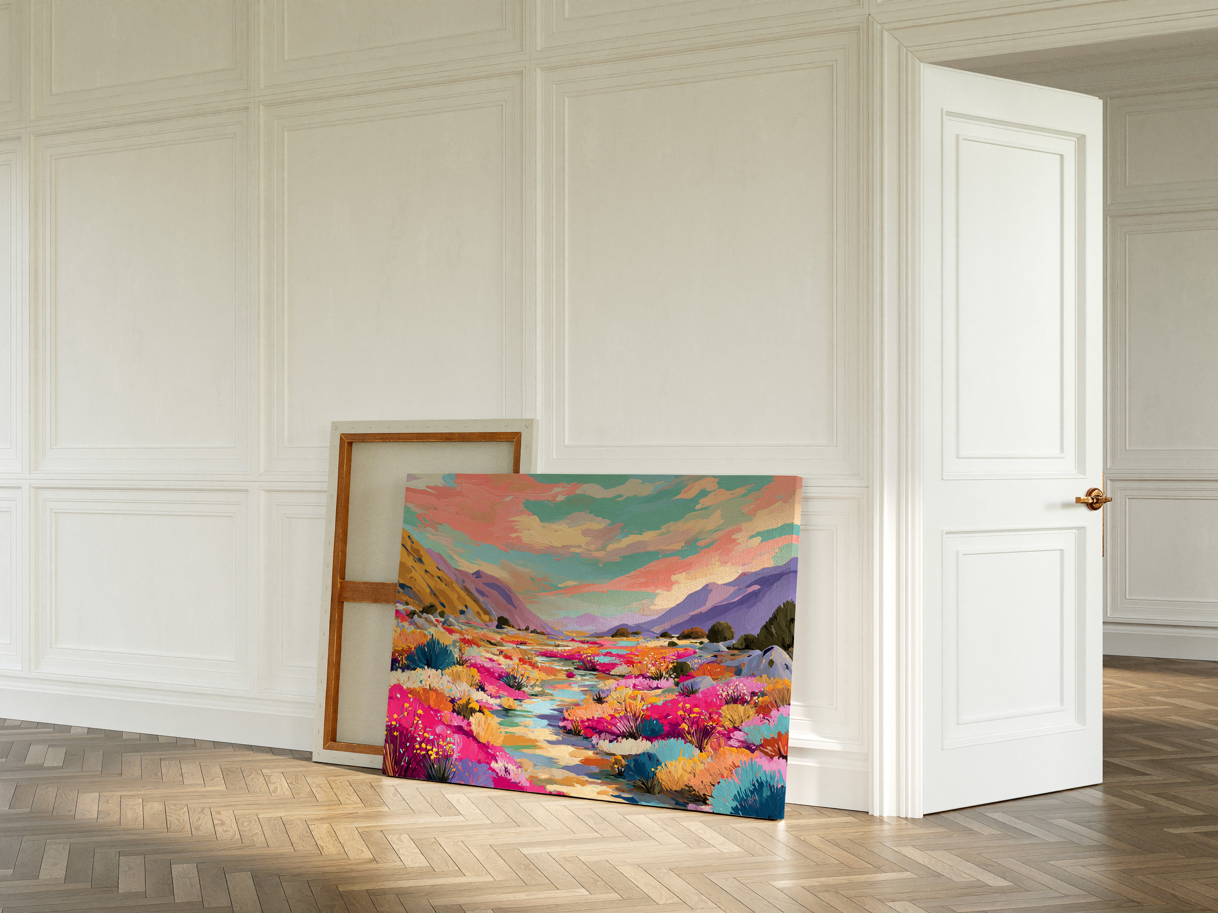 A ribbon of clear water winds through an explosion of desert wildflowers, their vibrant pinks and oranges dancing against turquoise sky. Bold brushstrokes capture the raw energy of a hidden desert oasis, where nature paints with uninhibited joy. Mountains rise in gentle purples and golds, their slopes embracing this secret garden while cotton-candy clouds drift overhead in a dreamy display of coral and mint. Perfect for bringing a sense of wild beauty and adventure to a living room or bedroom, this piece celebrates nature's most audacious color palette.