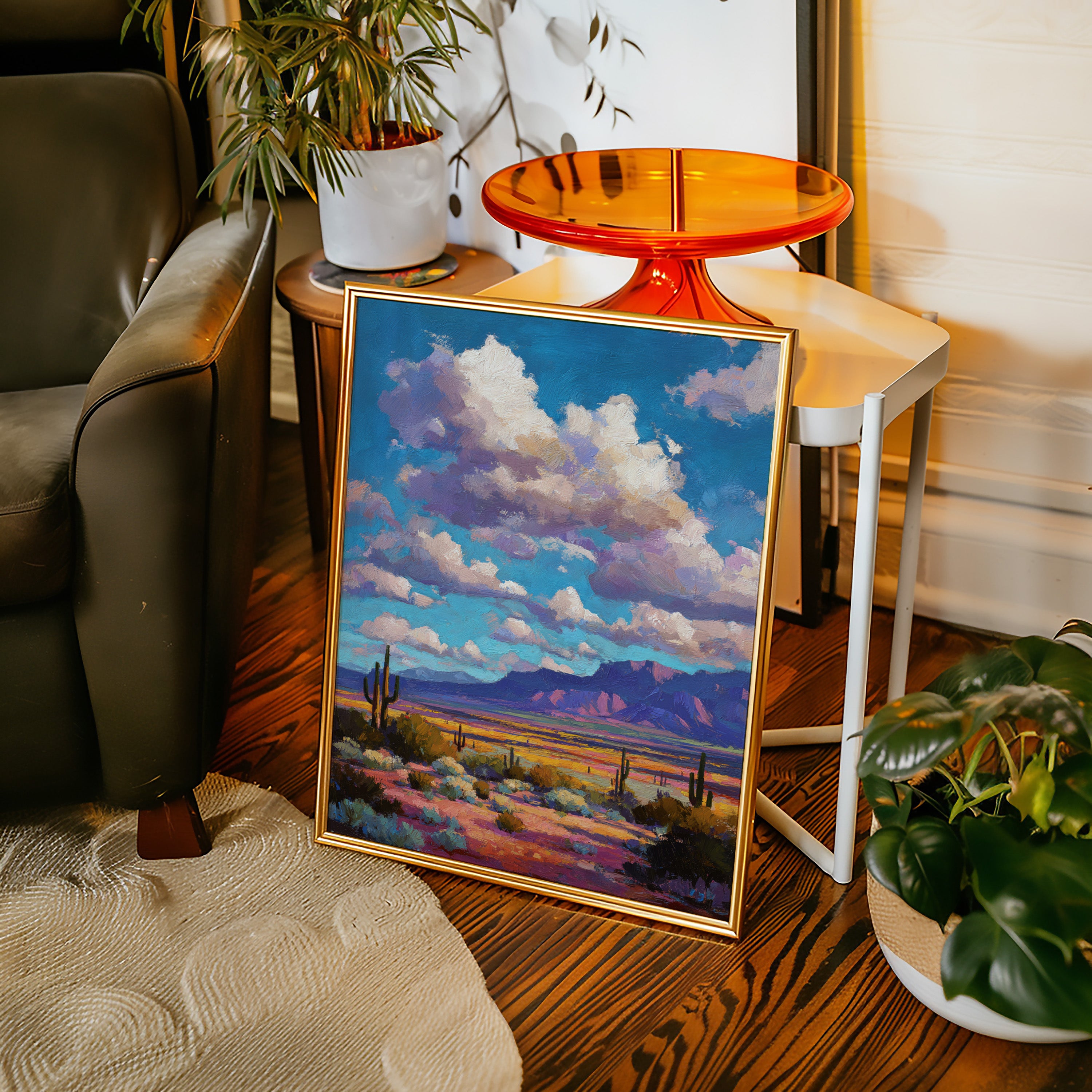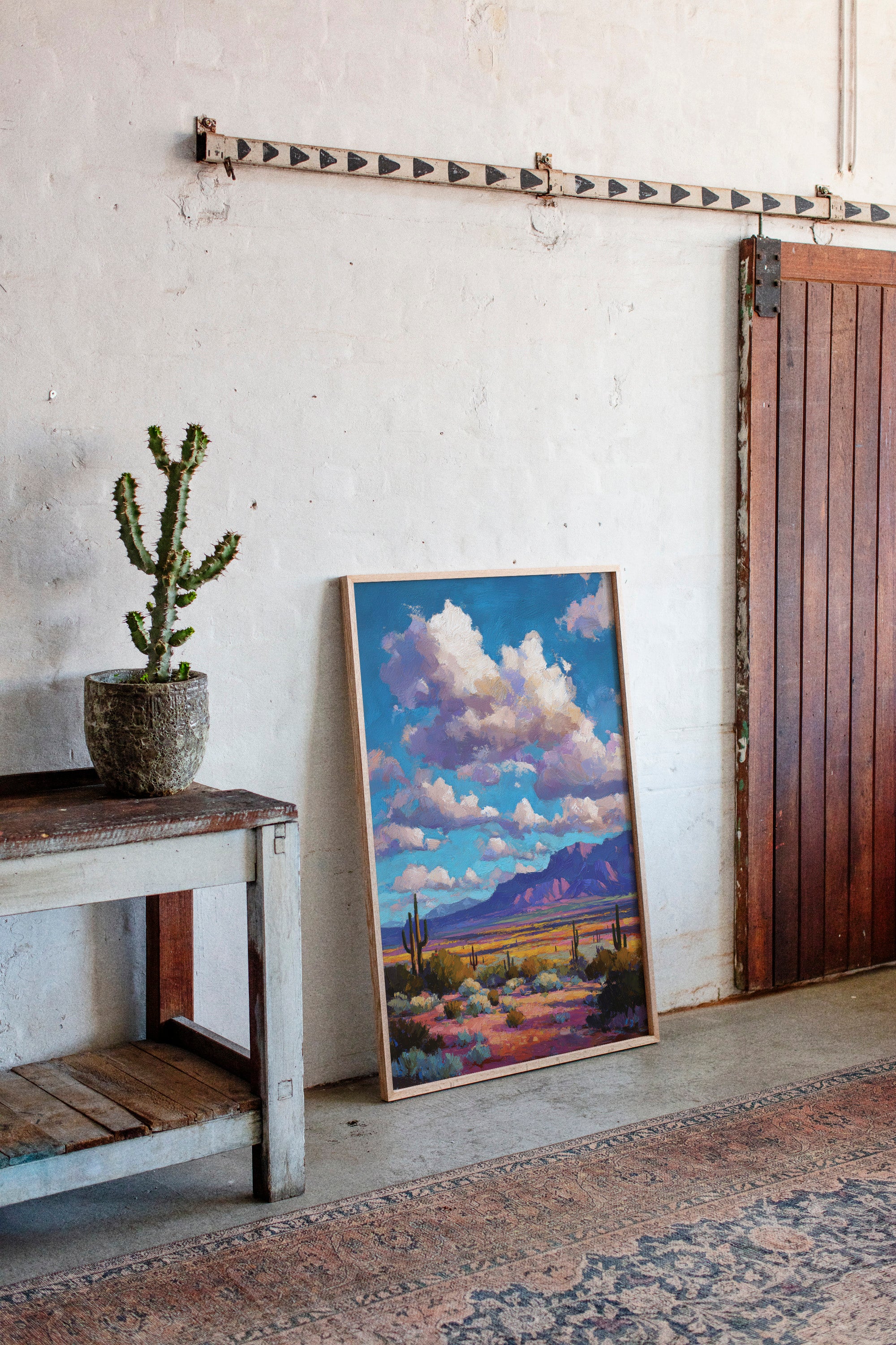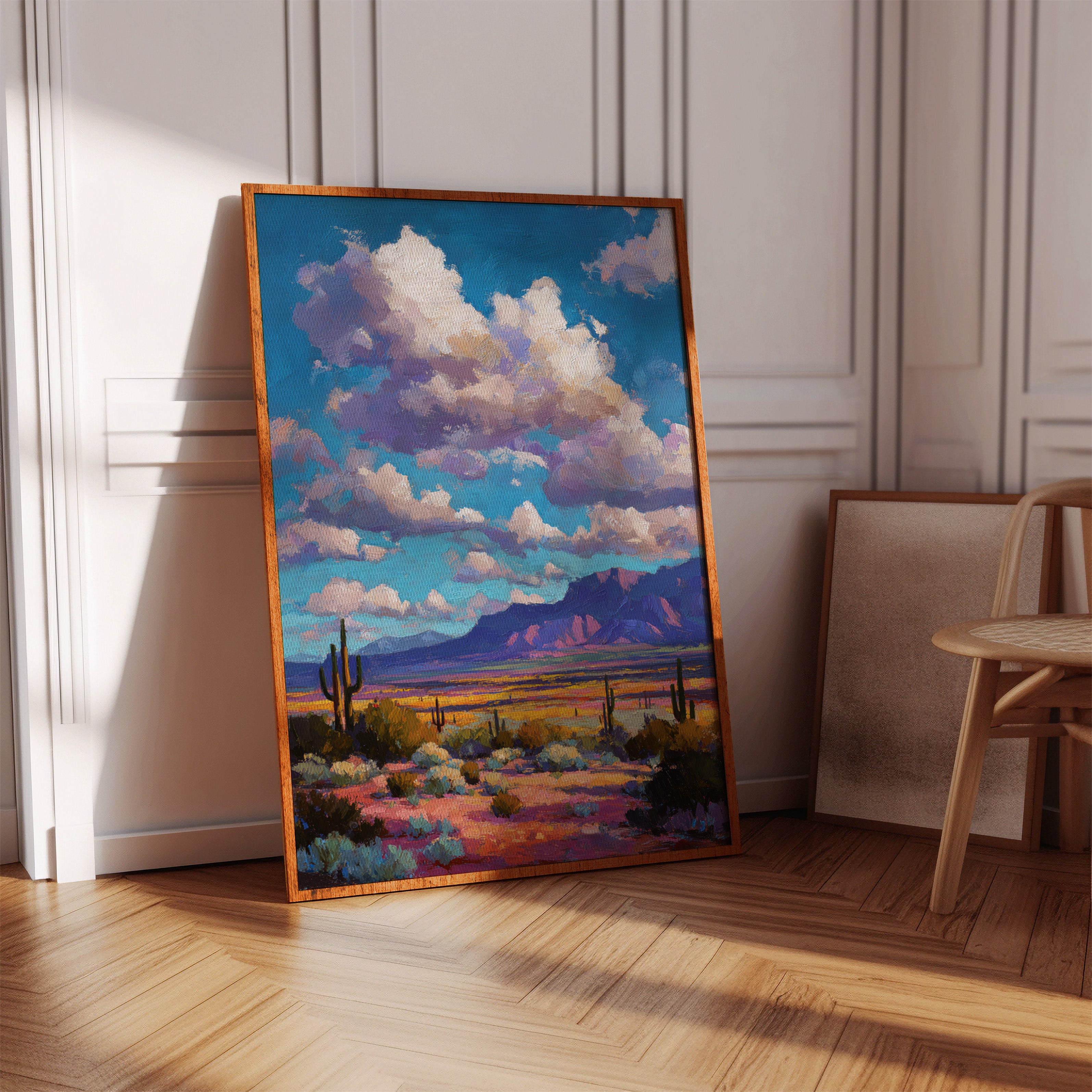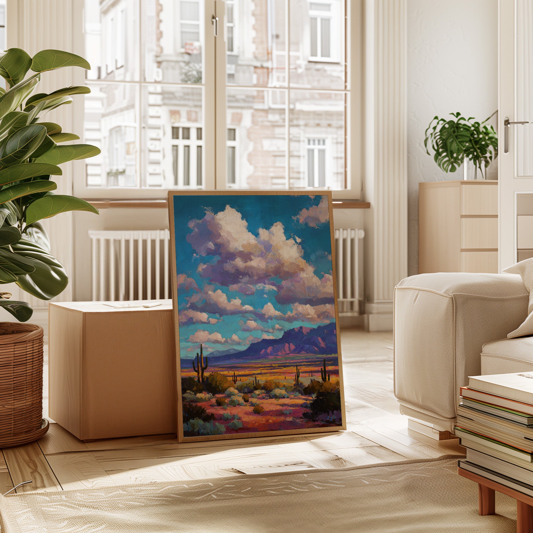 Towering cumulus clouds drift like celestial dancers above the Sonoran landscape, their purple-tinged forms casting ever-changing shadows below. The scene unfolds in a masterful interplay of color - deep azure skies, majestic purple mountains, and sun-kissed desert floor painted in vibrant oranges and pinks. Sentinel saguaros stand guard across the terrain, while desert scrub and sage create a textural tapestry that stretches toward distant peaks. This piece captures the raw beauty of the American Southwest, perfect for bringing dramatic desert energy into a great room or creating a stunning focal point in a modern dining space.
