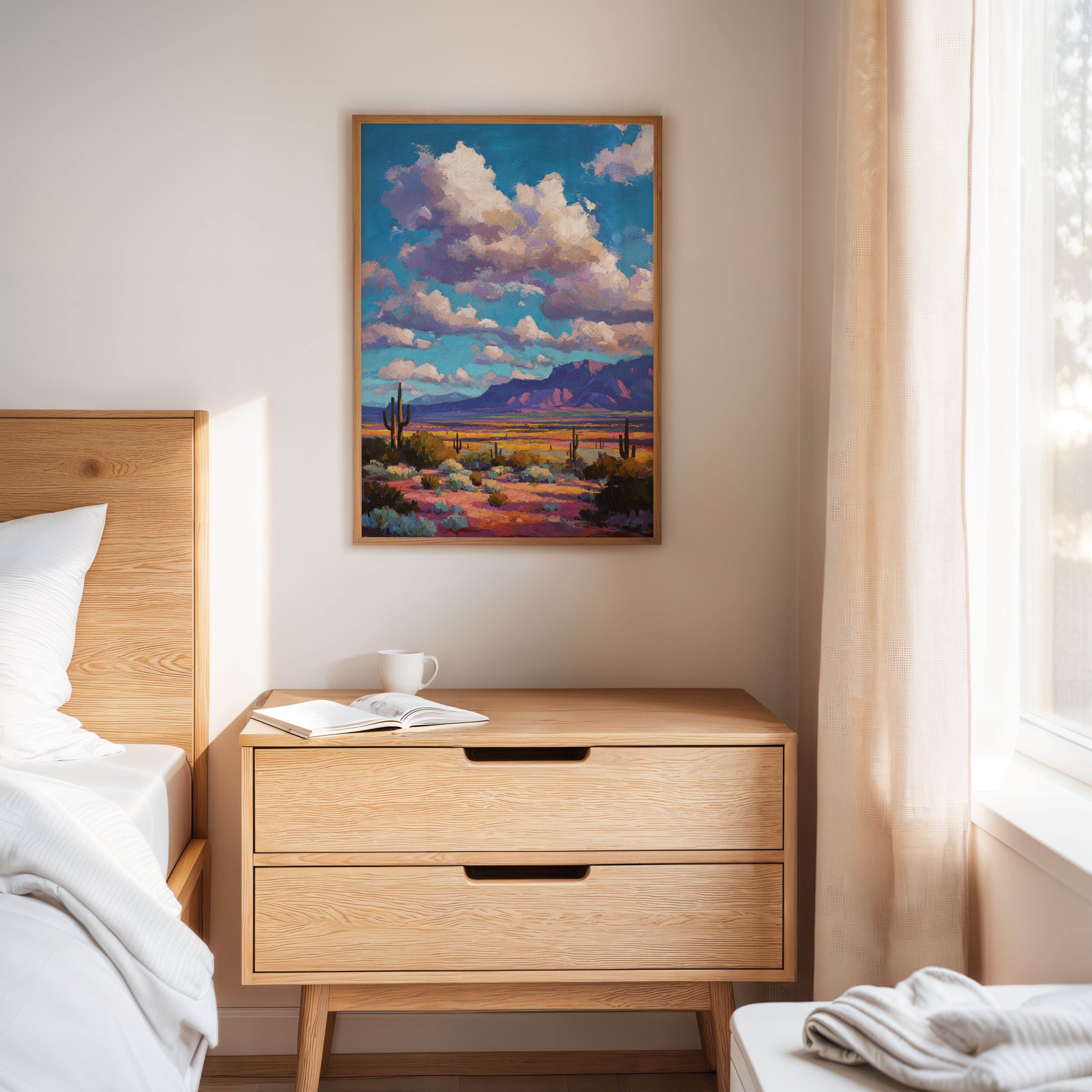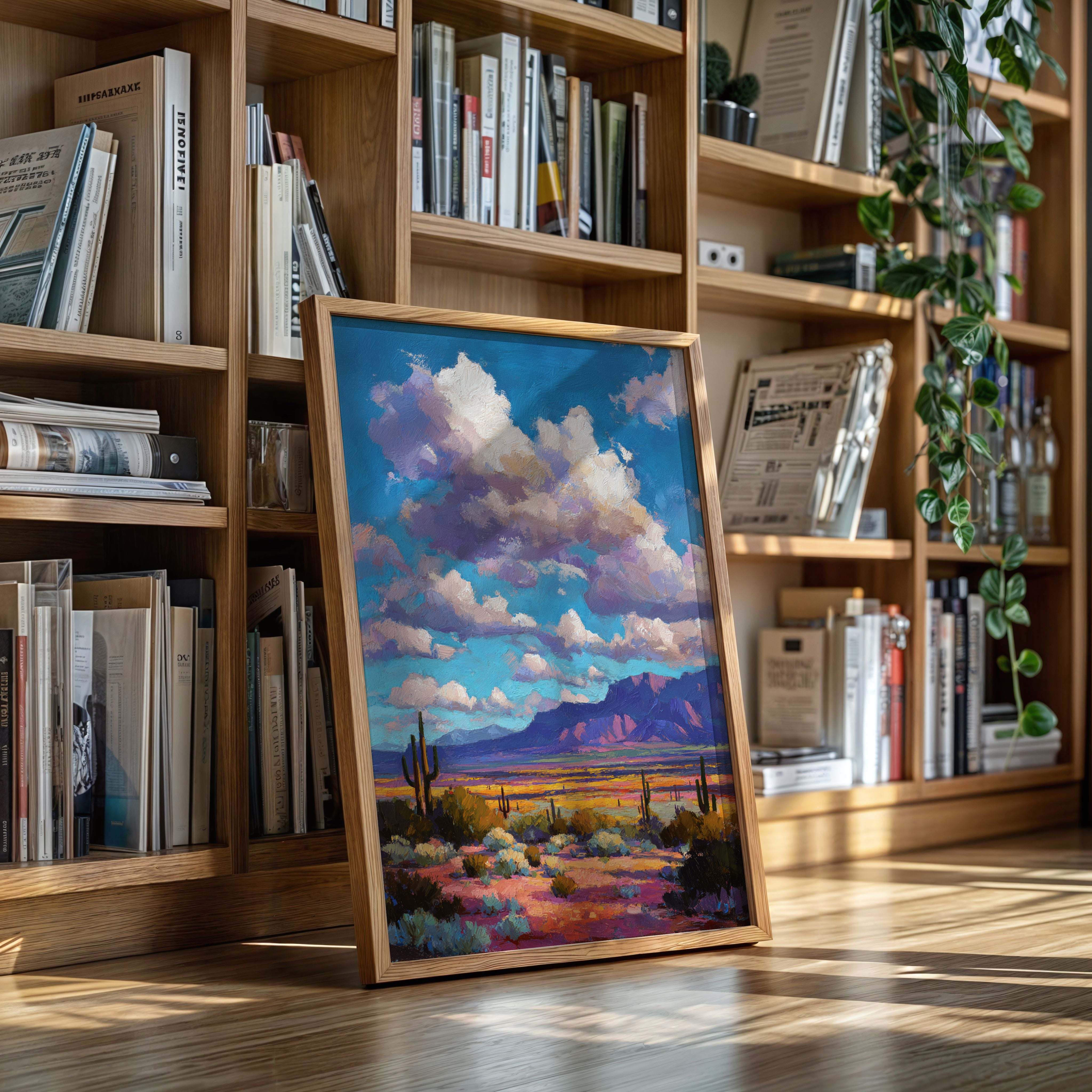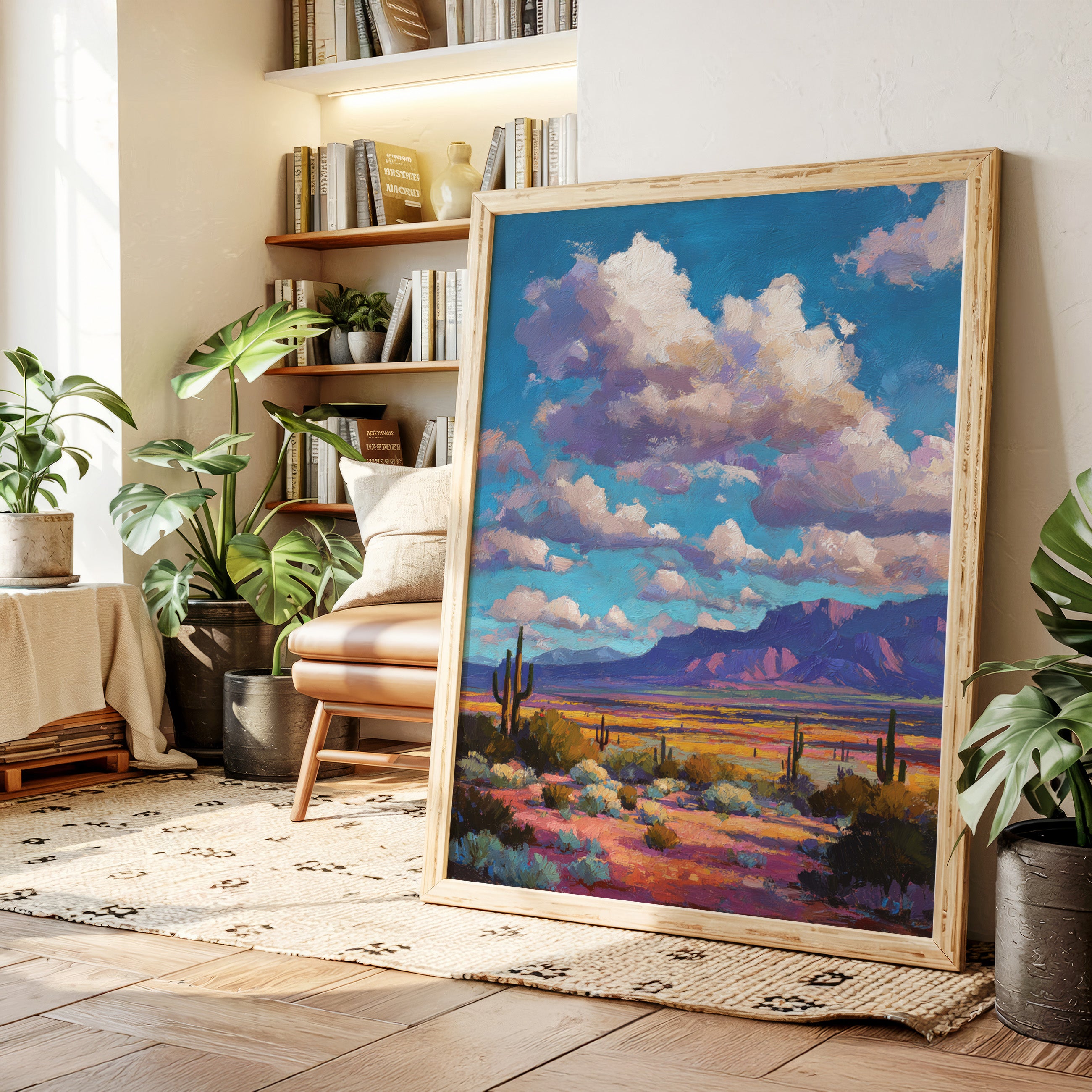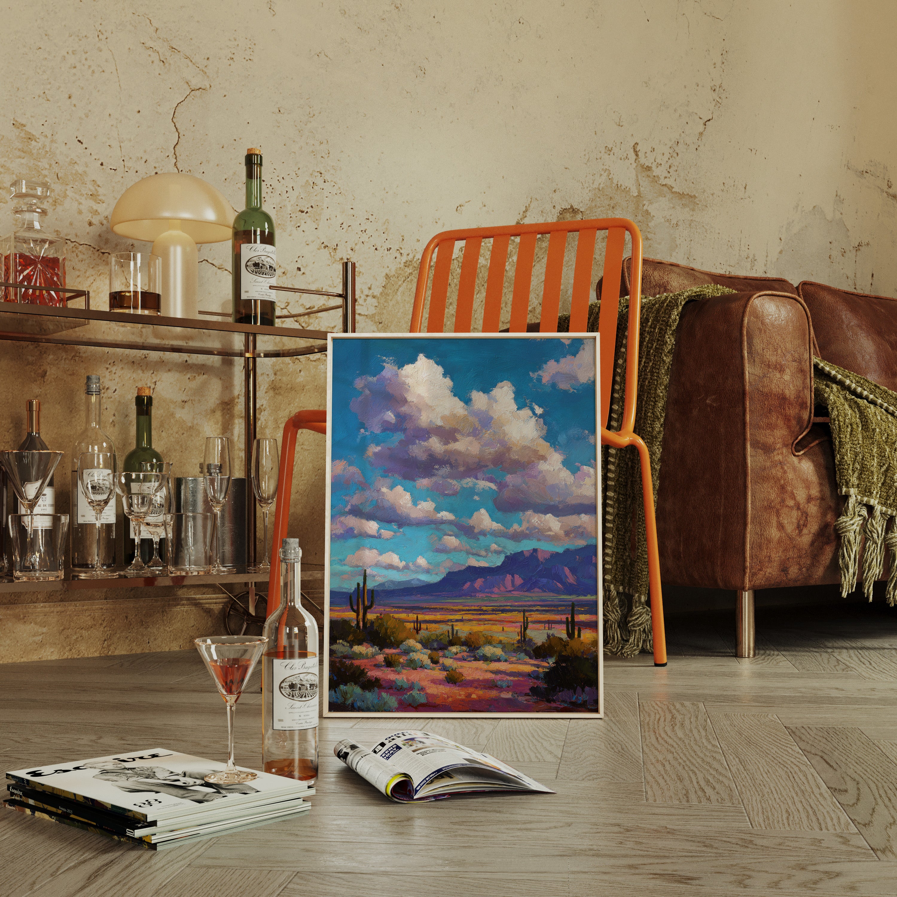 Towering cumulus clouds drift like celestial dancers above the Sonoran landscape, their purple-tinged forms casting ever-changing shadows below. The scene unfolds in a masterful interplay of color - deep azure skies, majestic purple mountains, and sun-kissed desert floor painted in vibrant oranges and pinks. Sentinel saguaros stand guard across the terrain, while desert scrub and sage create a textural tapestry that stretches toward distant peaks. This piece captures the raw beauty of the American Southwest, perfect for bringing dramatic desert energy into a great room or creating a stunning focal point in a modern dining space.