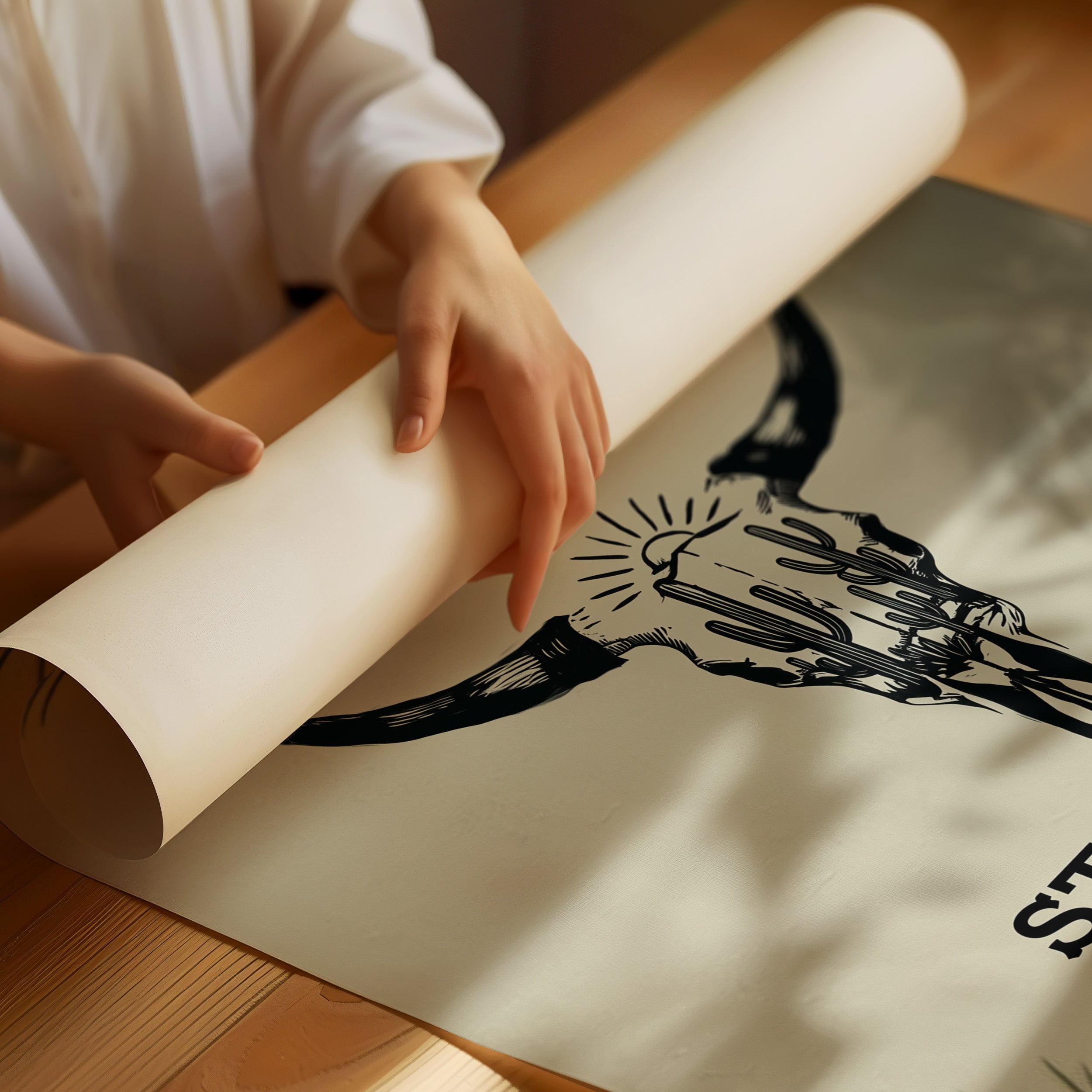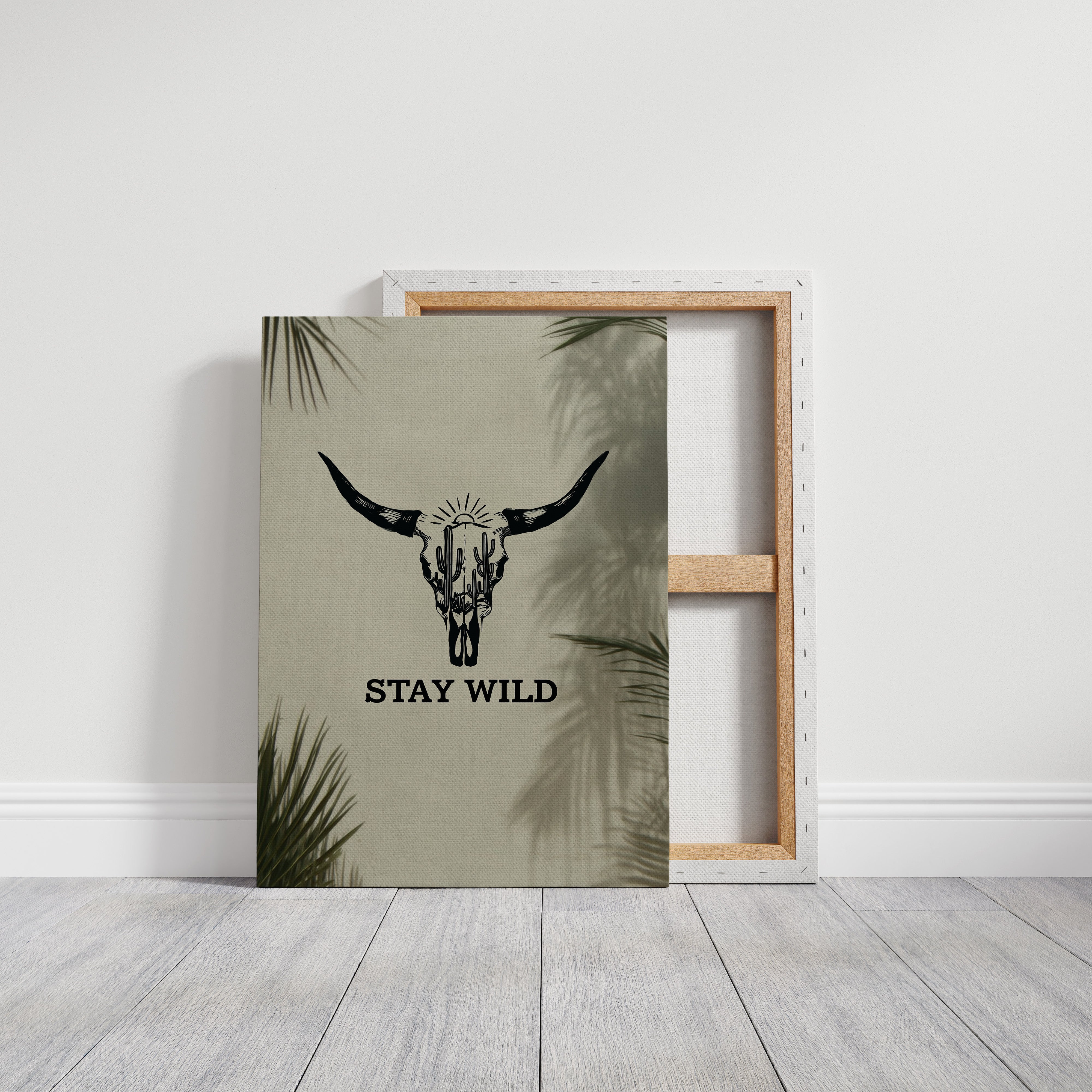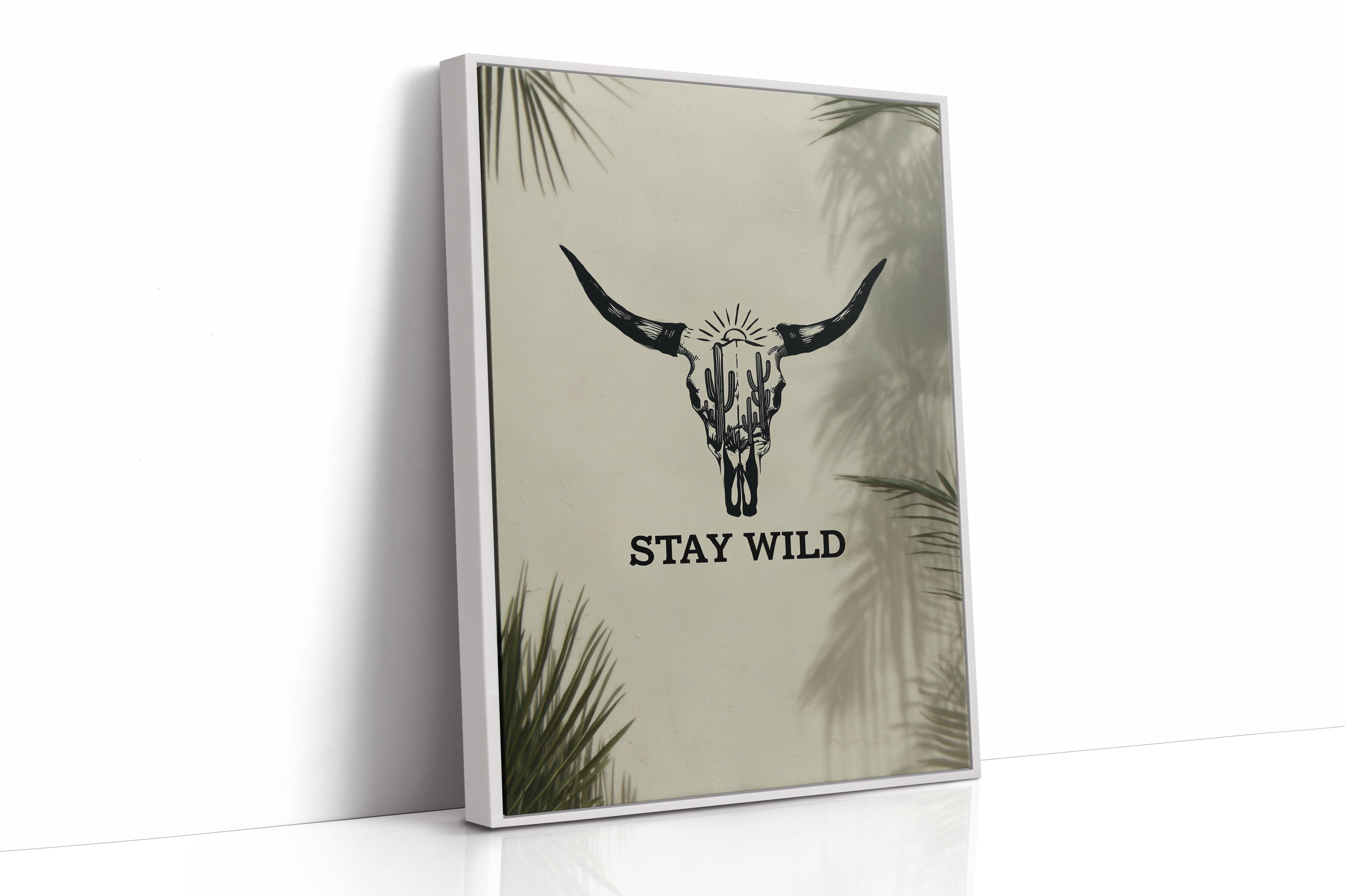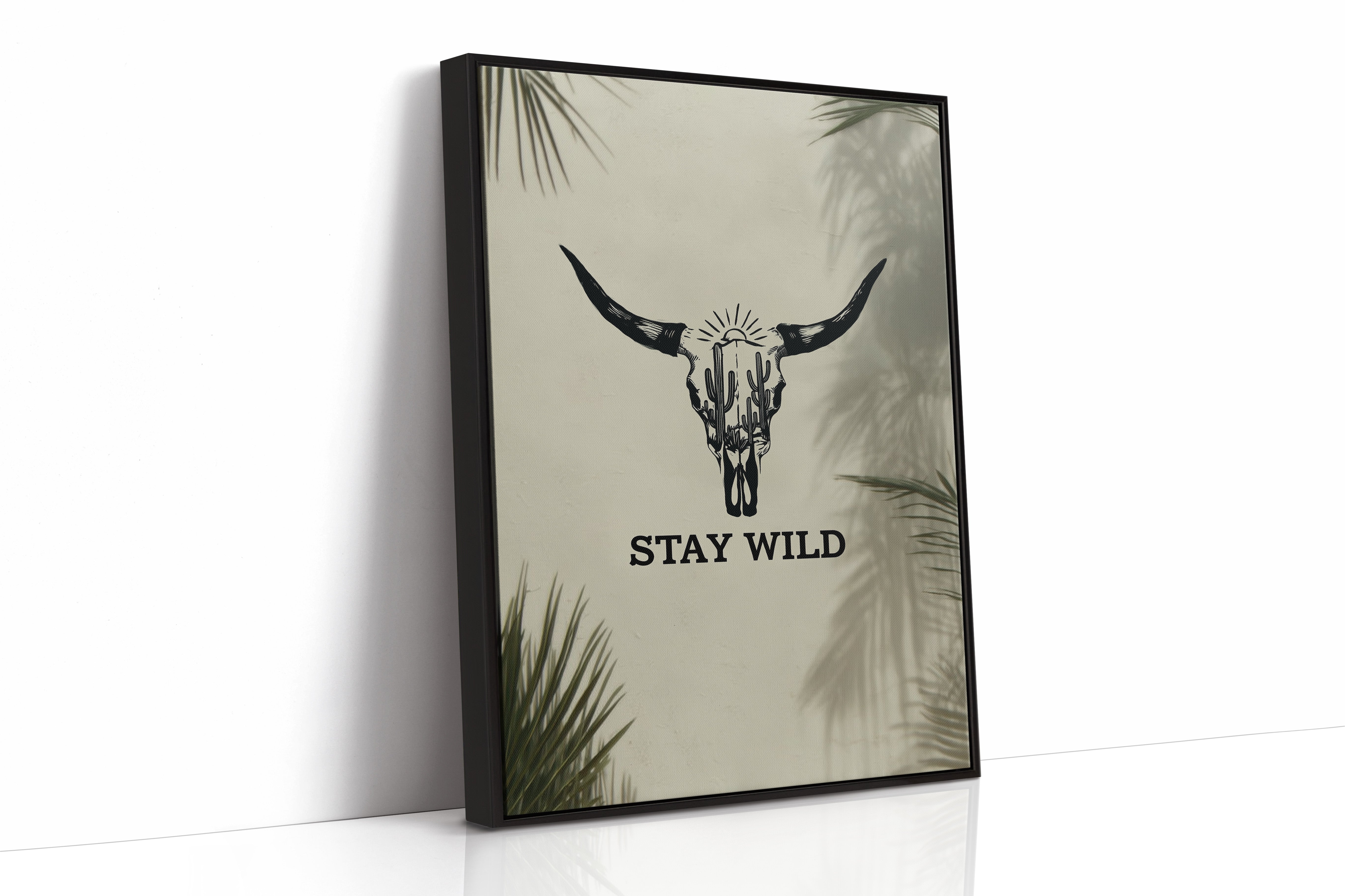Sunlight filters through palm fronds, casting ethereal shadows around a striking bull skull silhouette that tells stories of untamed landscapes. This contemporary piece captures the essence of modern southwestern artistry with bold, graphic conviction. Within the skull's outline, saguaro cacti reach skyward beneath a radiant sun, creating a window into wild desert scenes. The monochromatic design plays with negative space and clean lines, while palm leaf shadows add organic movement to the composition. This statement piece commands attention in a modern living room or adds character to a minimalist home office, embodying both strength and artistic sophistication.