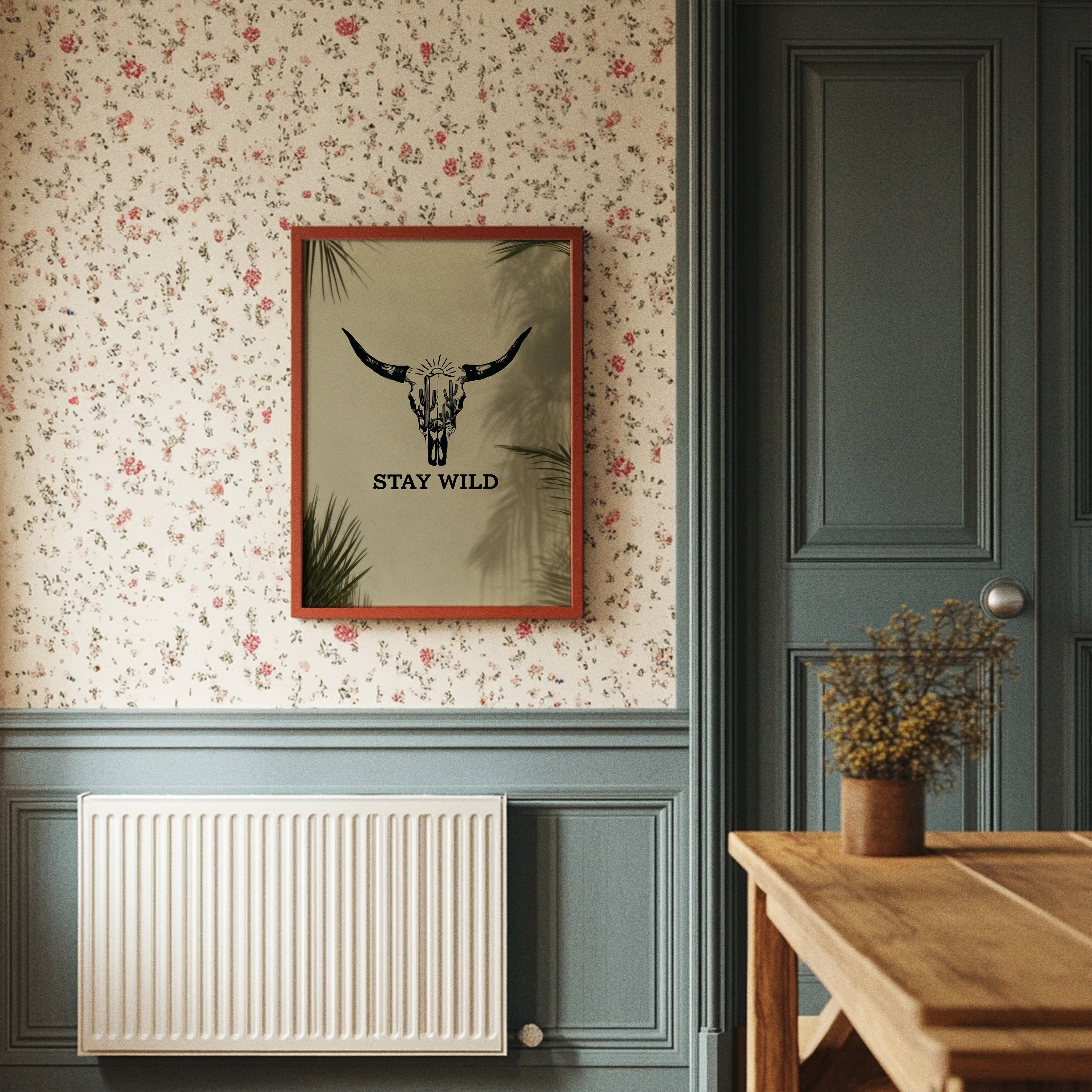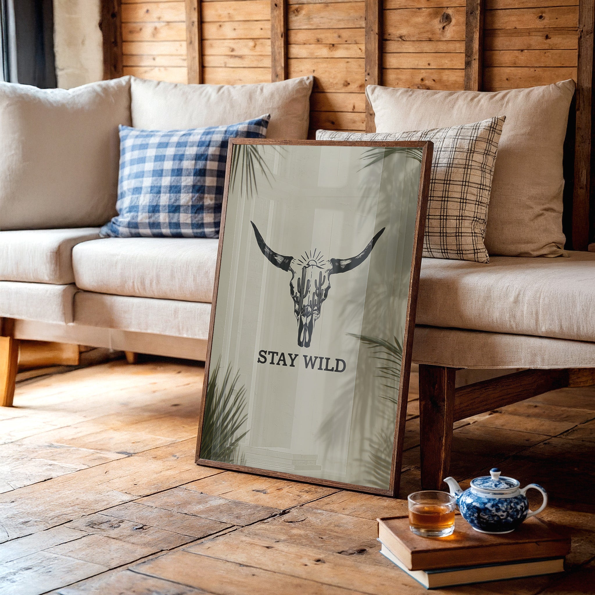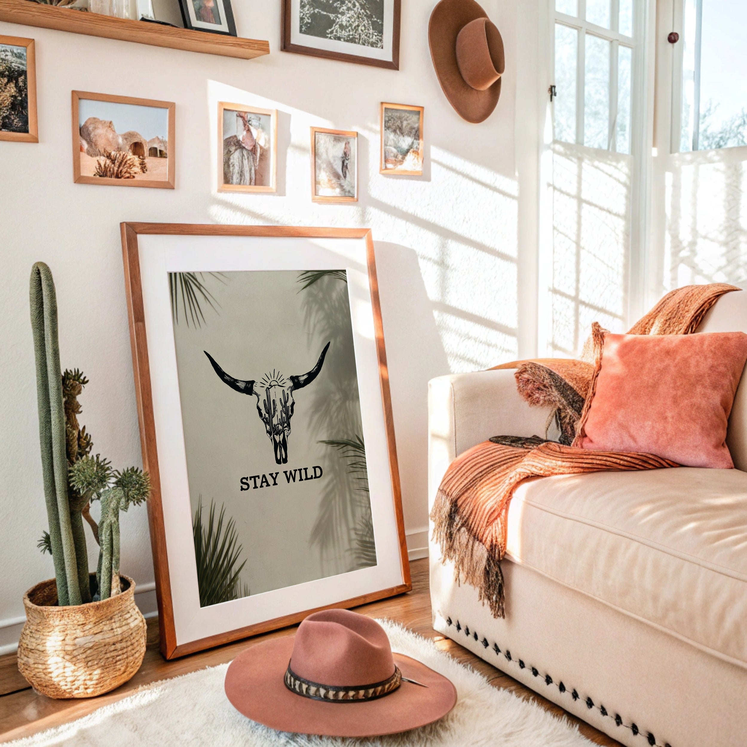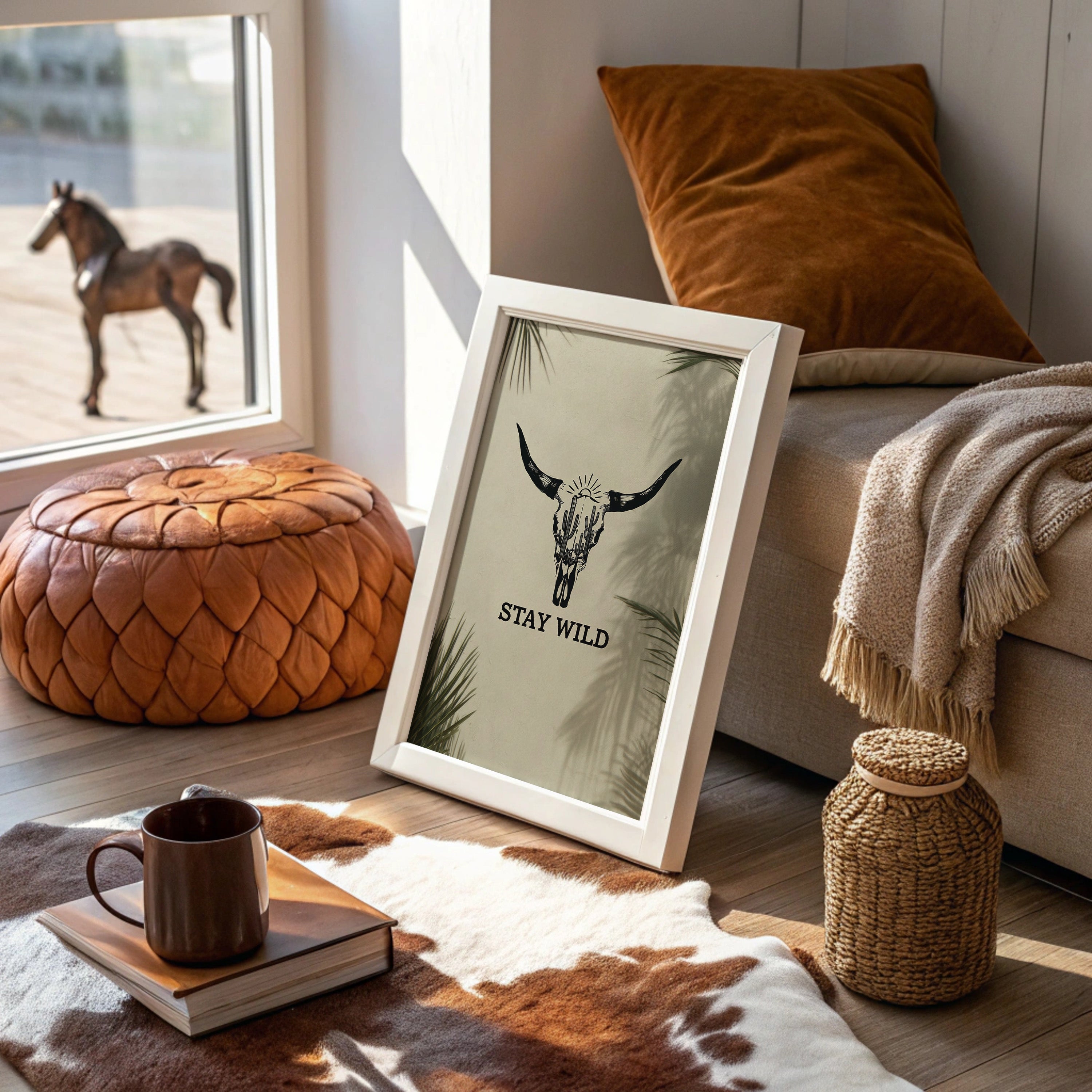 Sunlight filters through palm fronds, casting ethereal shadows around a striking bull skull silhouette that tells stories of untamed landscapes. This contemporary piece captures the essence of modern southwestern artistry with bold, graphic conviction. Within the skull's outline, saguaro cacti reach skyward beneath a radiant sun, creating a window into wild desert scenes. The monochromatic design plays with negative space and clean lines, while palm leaf shadows add organic movement to the composition. This statement piece commands attention in a modern living room or adds character to a minimalist home office, embodying both strength and artistic sophistication.
