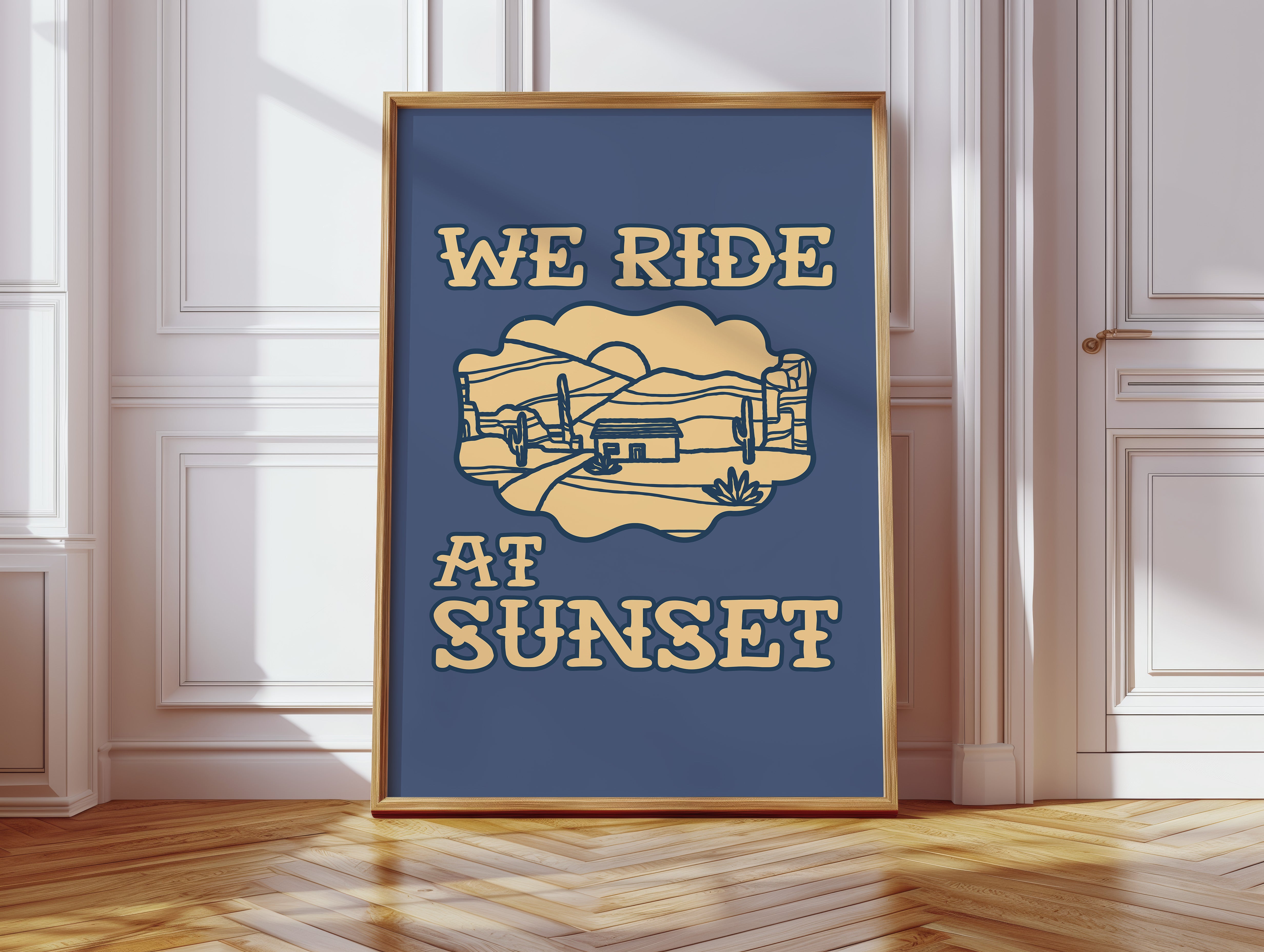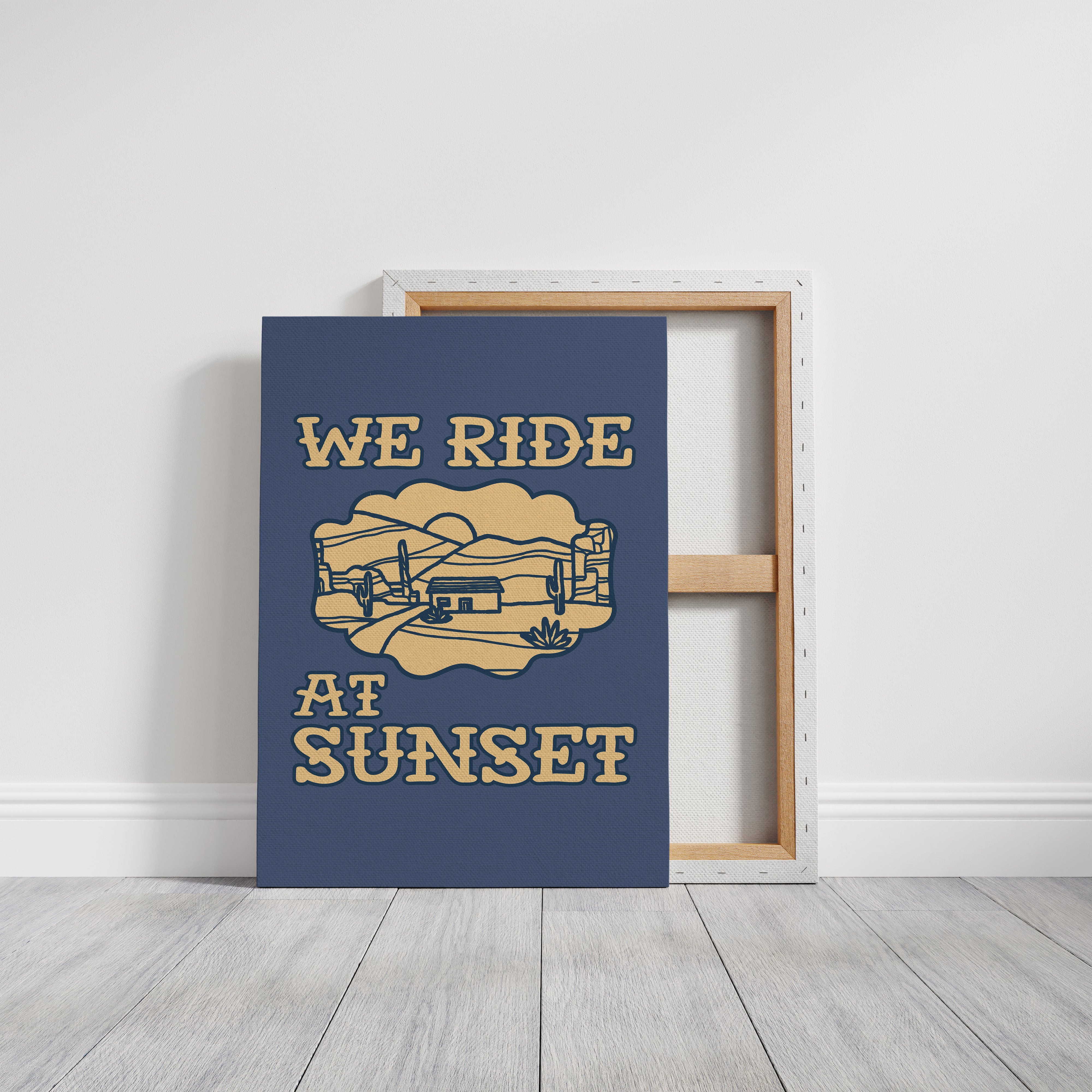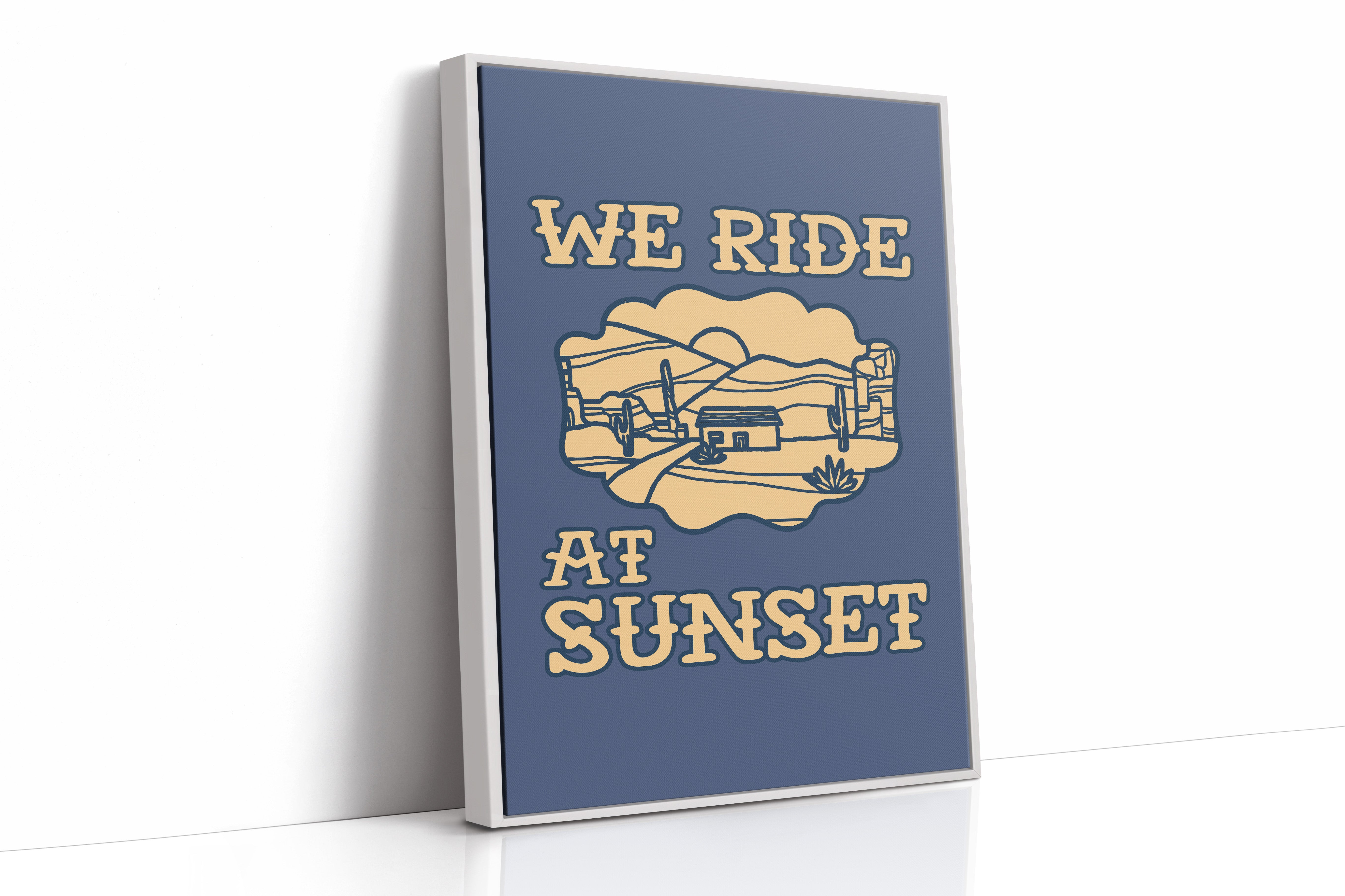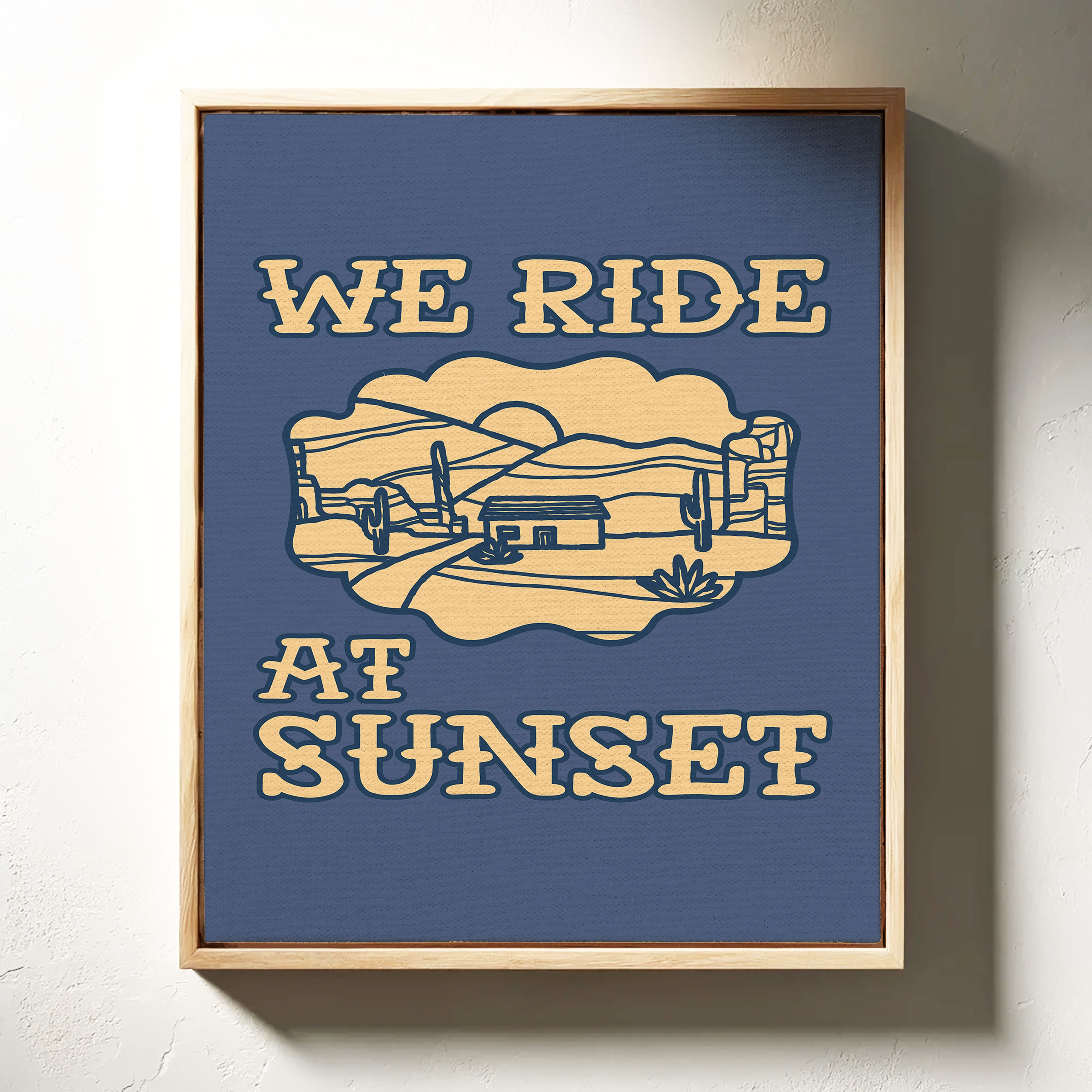 Dusty paths wind through golden sands, where cacti stand sentinel against a deepening sky. This contemporary southwestern piece captures the essence of desert living with its minimalist line art style. Rolling hills embrace a lone adobe dwelling, while saguaros dot the landscape like ancient storytellers sharing tales of the wild west. The warm cream tones against deep navy create a striking contrast that speaks to both modern design sensibilities and timeless desert narratives. Perfect for adding a touch of adventure to a home office or creating a focal point in a modern southwestern living space. Each viewing reveals new details in the peaceful desert scene, inviting moments of contemplation and wanderlust.