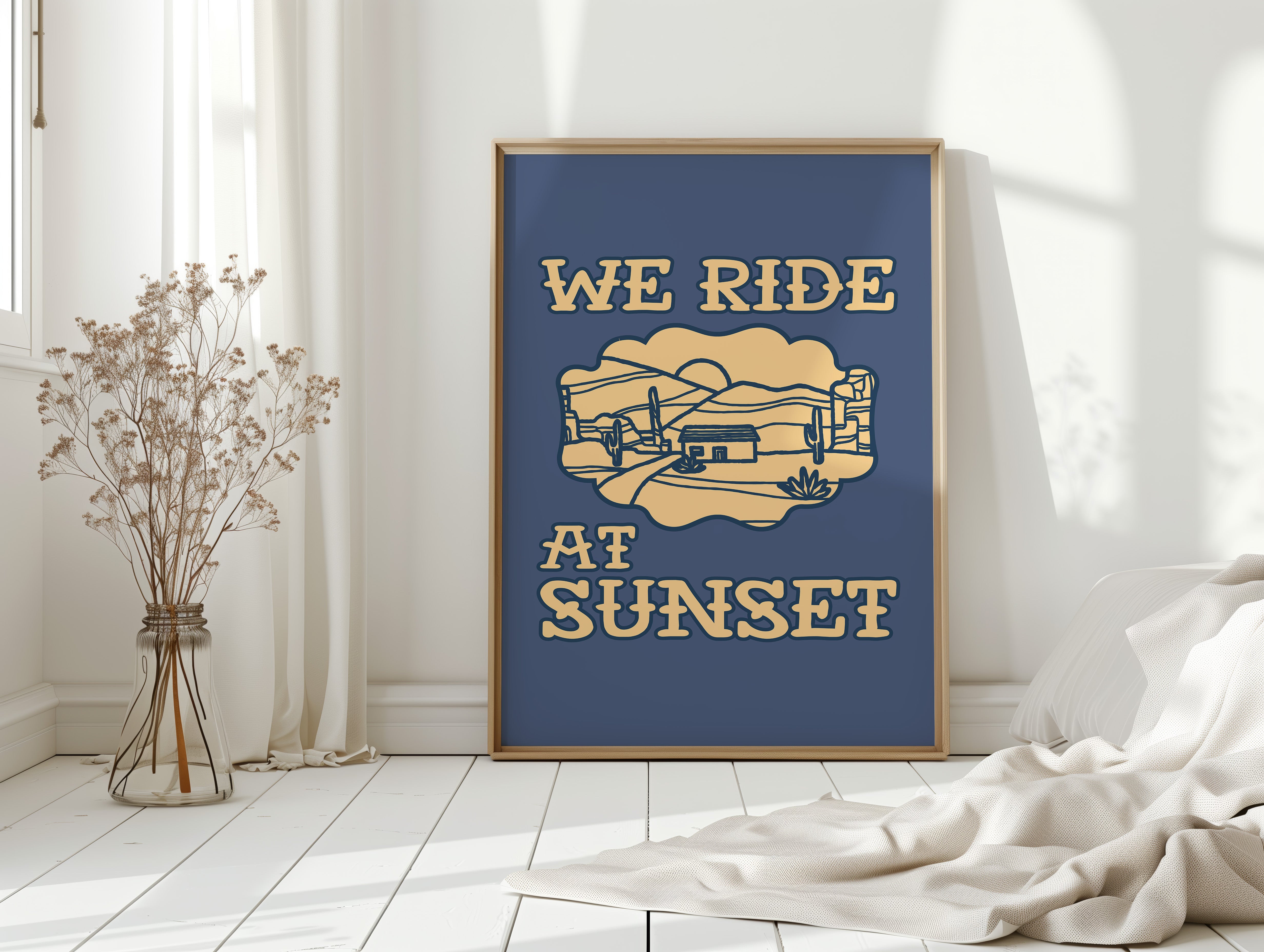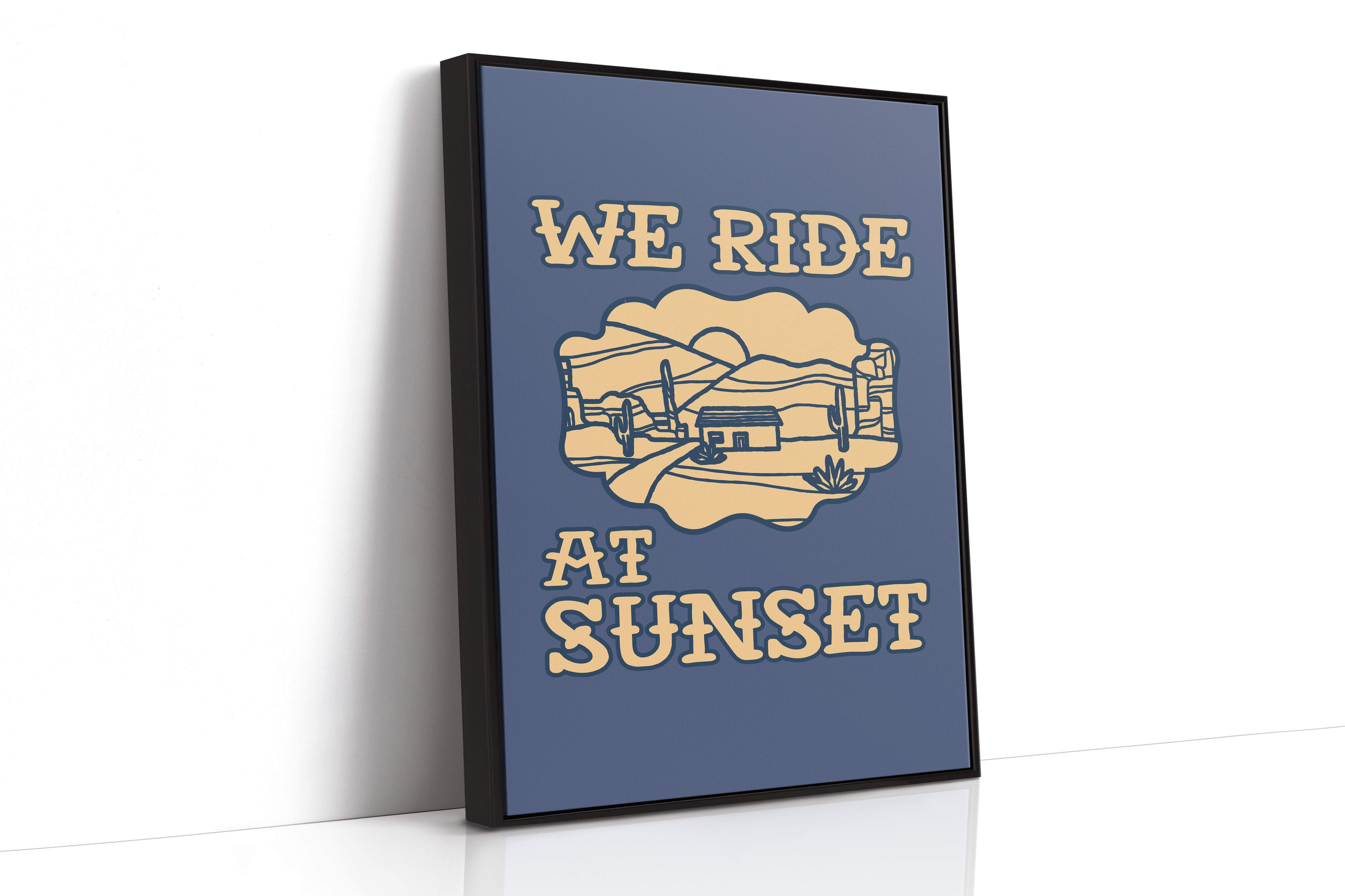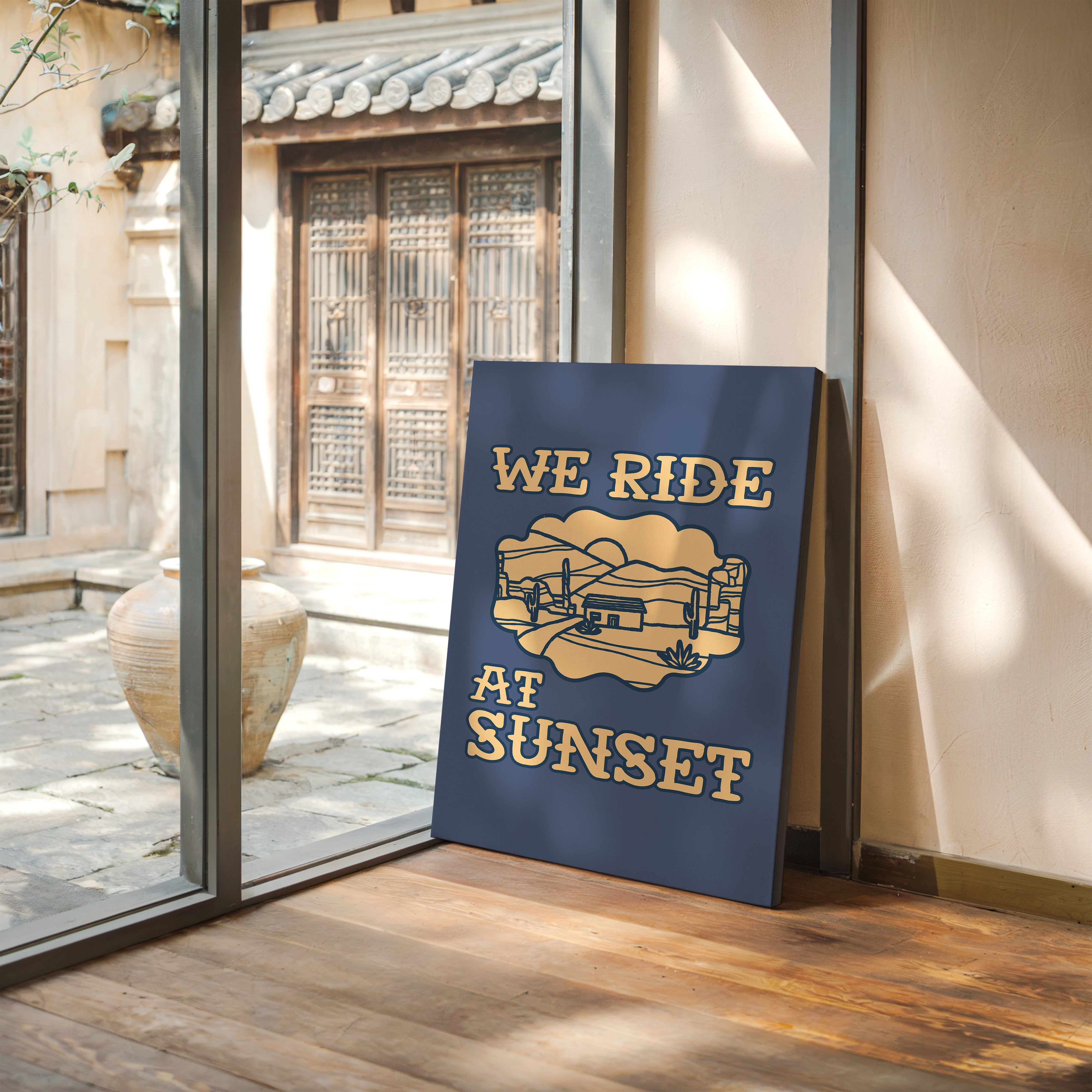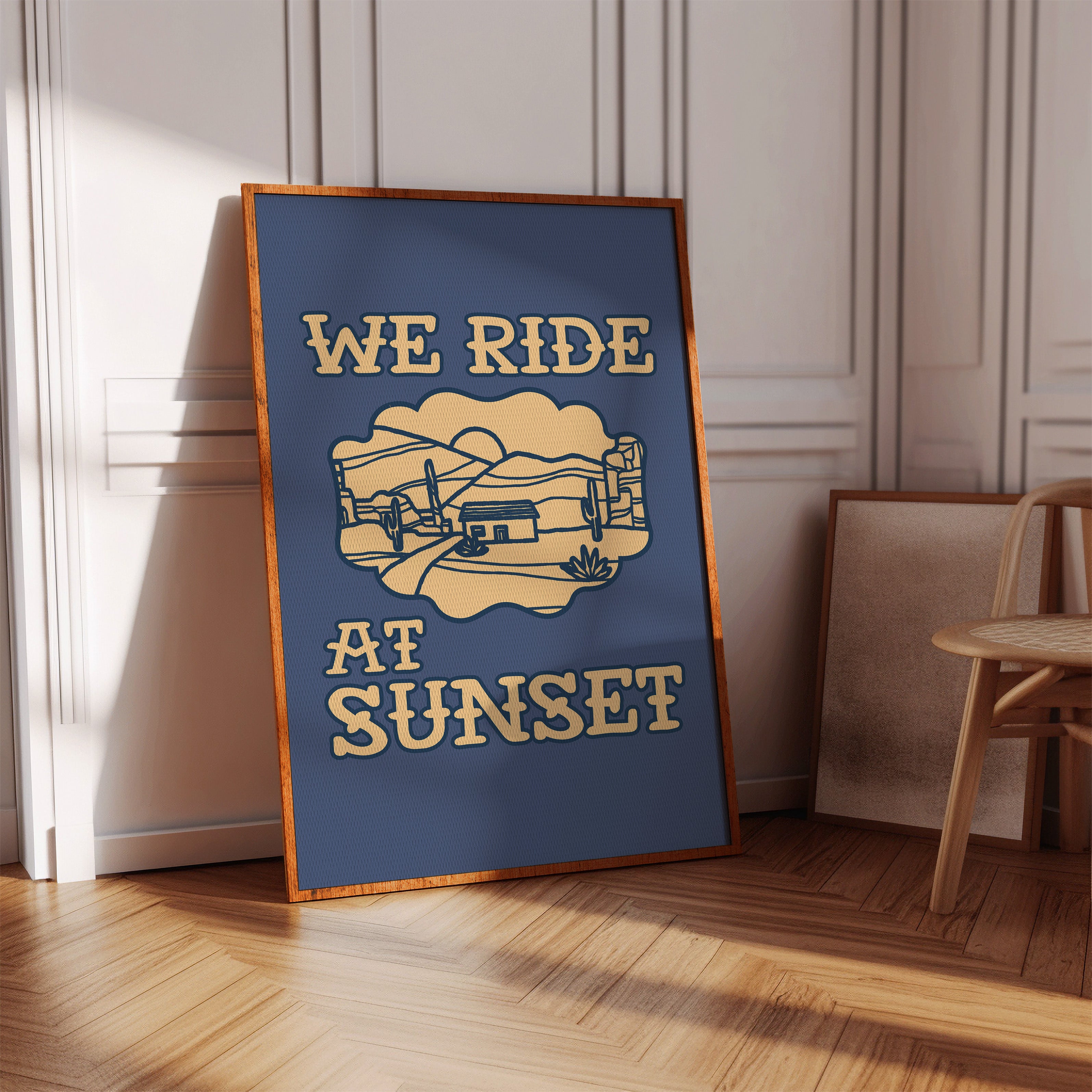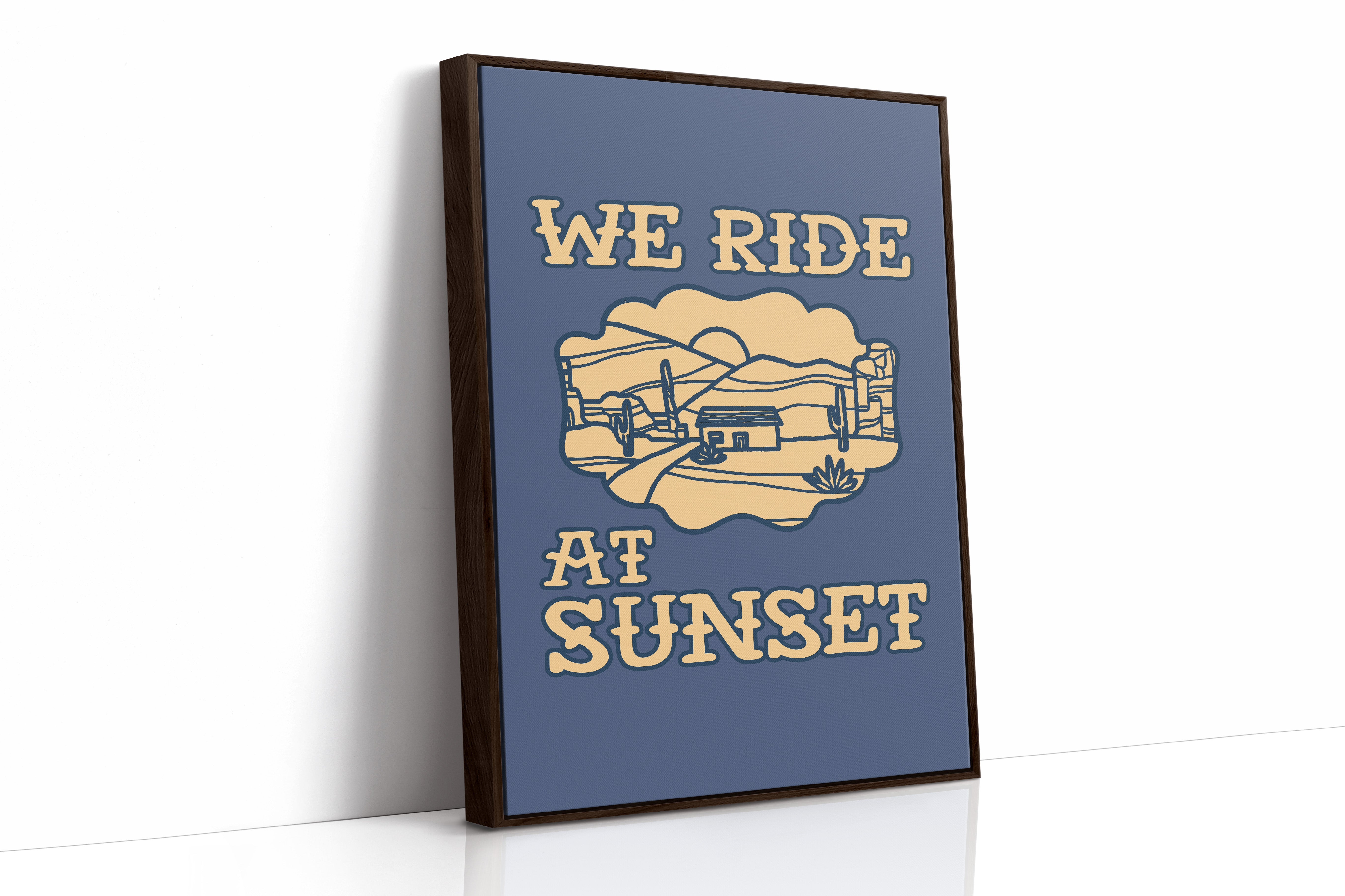 Dusty paths wind through golden sands, where cacti stand sentinel against a deepening sky. This contemporary southwestern piece captures the essence of desert living with its minimalist line art style. Rolling hills embrace a lone adobe dwelling, while saguaros dot the landscape like ancient storytellers sharing tales of the wild west. The warm cream tones against deep navy create a striking contrast that speaks to both modern design sensibilities and timeless desert narratives. Perfect for adding a touch of adventure to a home office or creating a focal point in a modern southwestern living space. Each viewing reveals new details in the peaceful desert scene, inviting moments of contemplation and wanderlust.