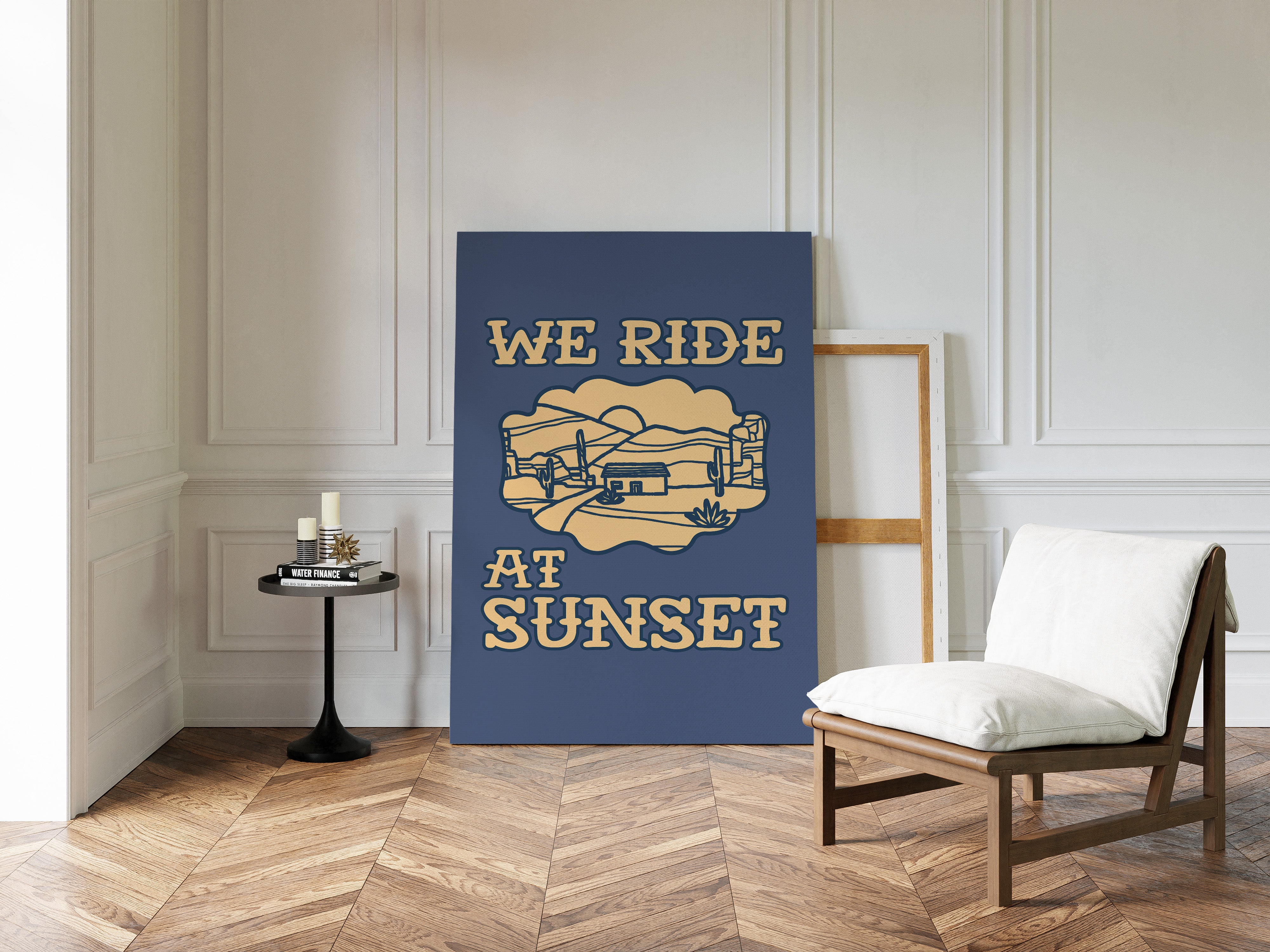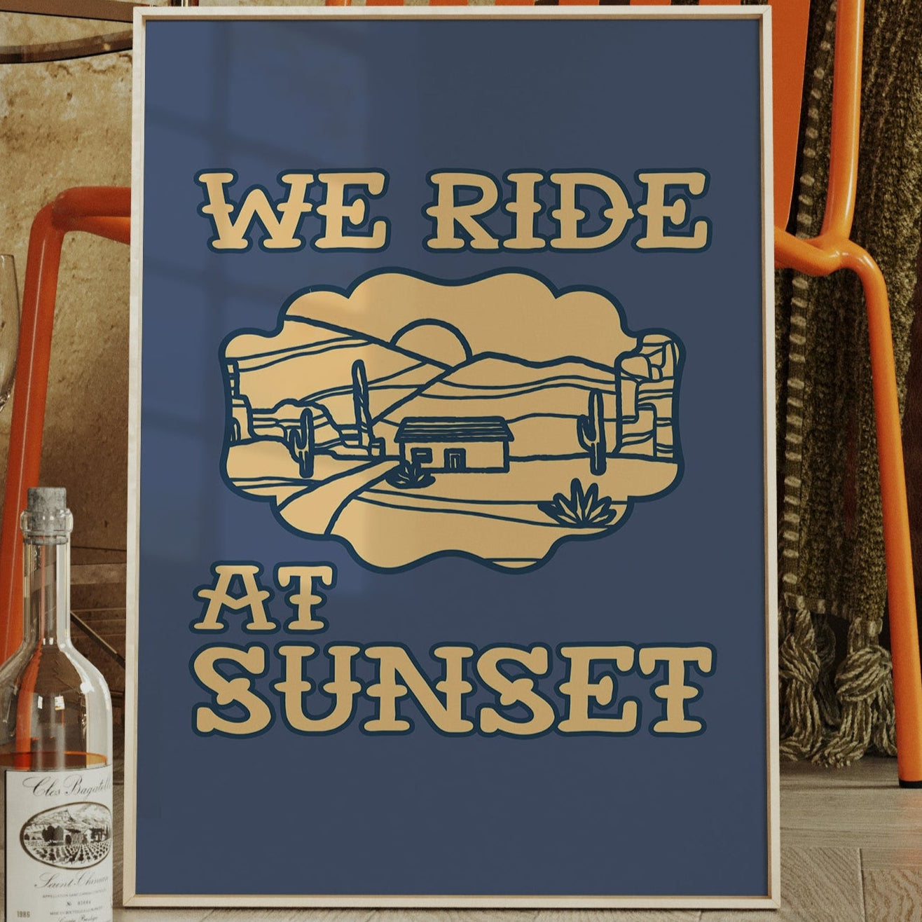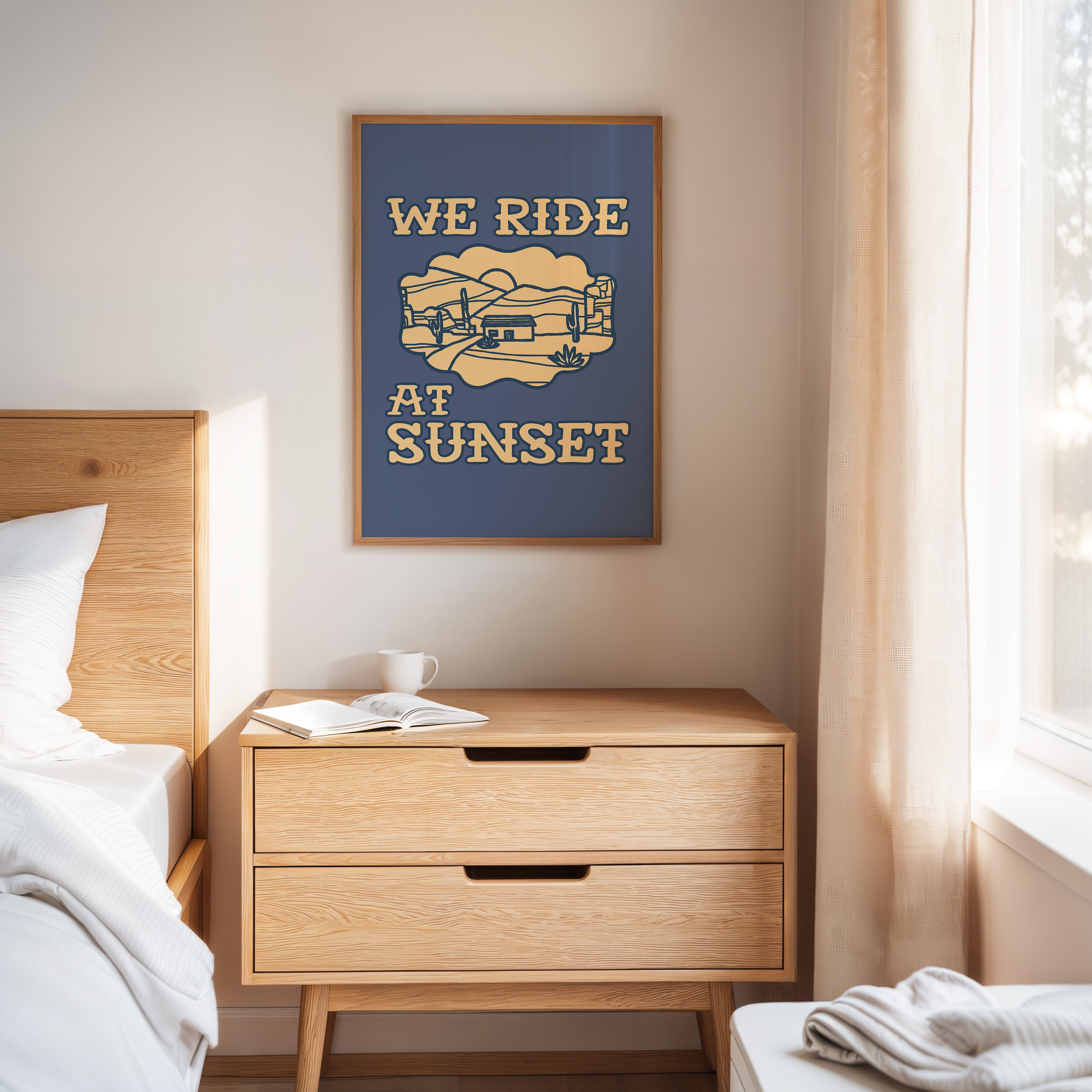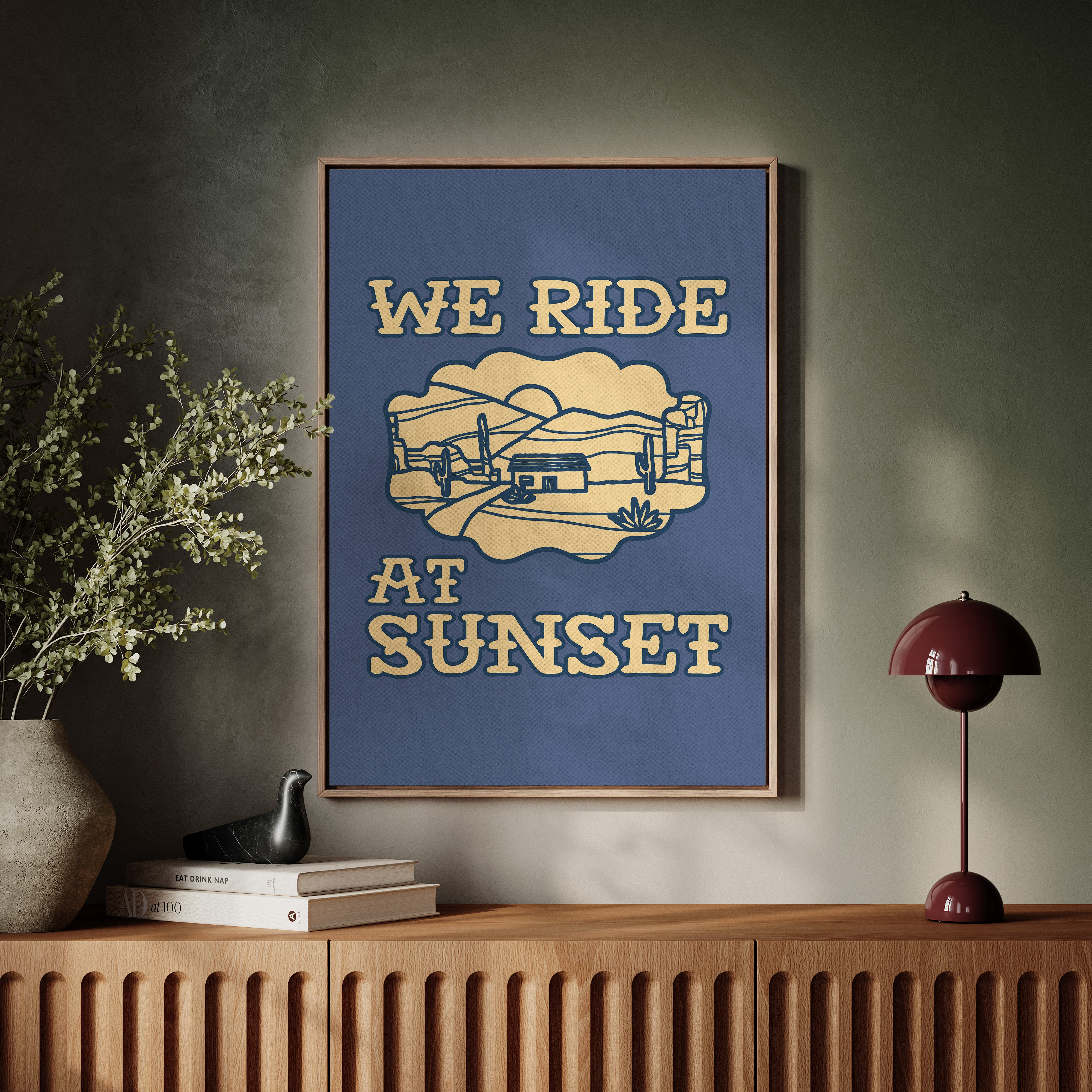 Dusty paths wind through golden sands, where cacti stand sentinel against a deepening sky. This contemporary southwestern piece captures the essence of desert living with its minimalist line art style. Rolling hills embrace a lone adobe dwelling, while saguaros dot the landscape like ancient storytellers sharing tales of the wild west. The warm cream tones against deep navy create a striking contrast that speaks to both modern design sensibilities and timeless desert narratives. Perfect for adding a touch of adventure to a home office or creating a focal point in a modern southwestern living space. Each viewing reveals new details in the peaceful desert scene, inviting moments of contemplation and wanderlust.