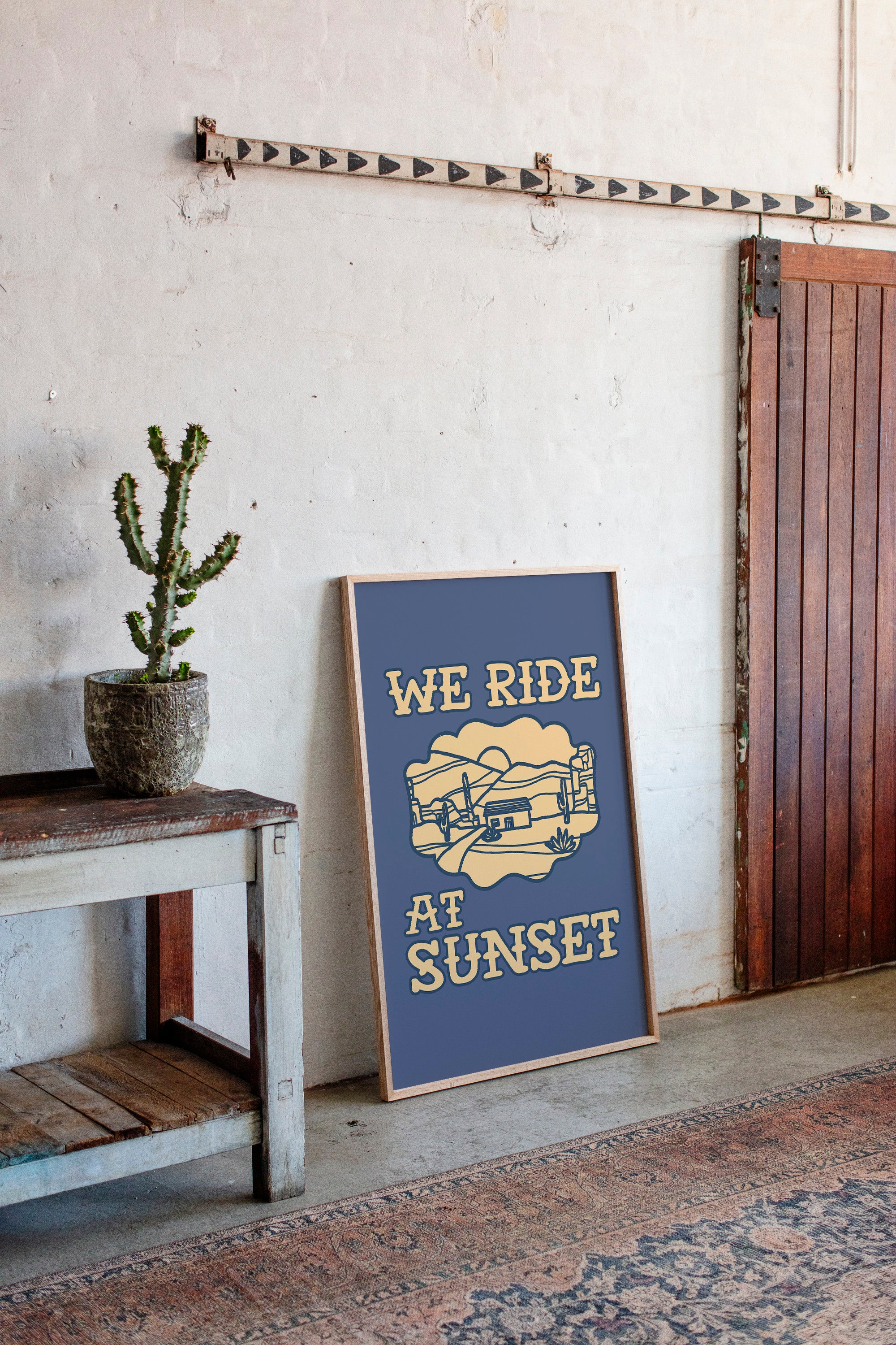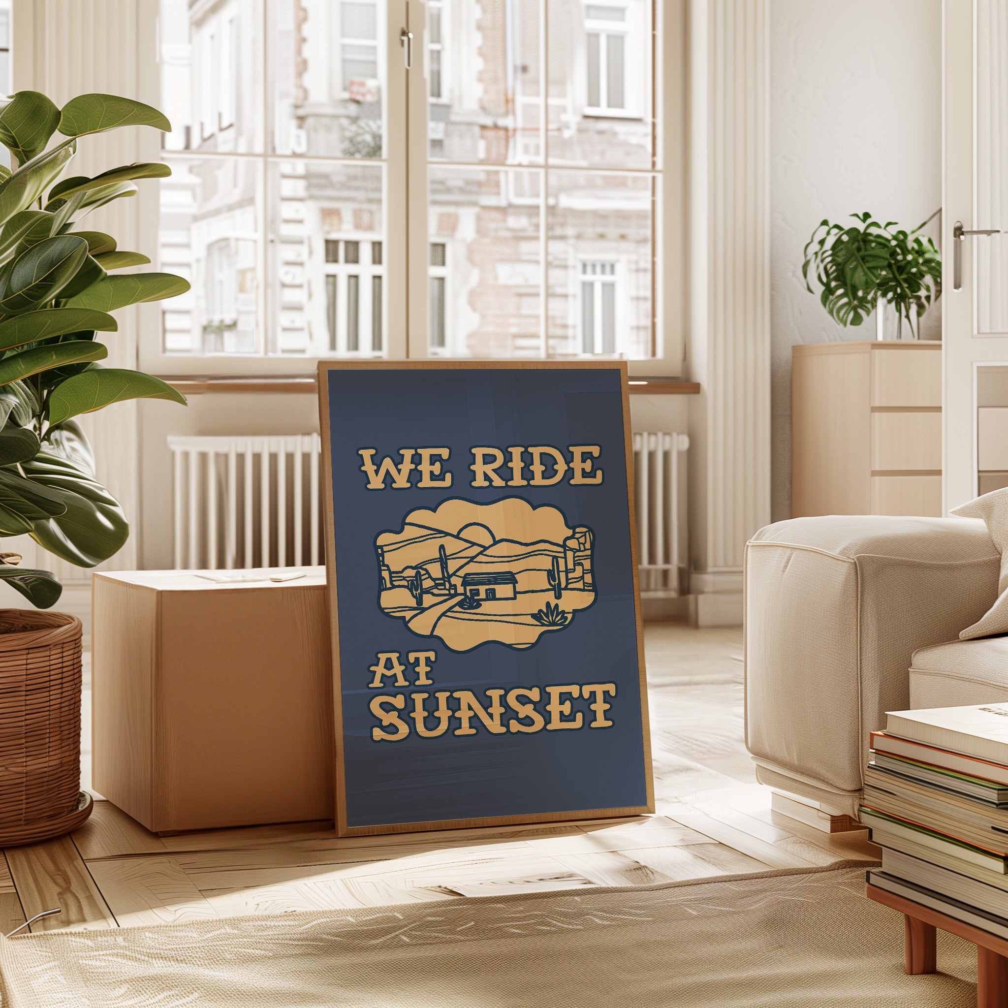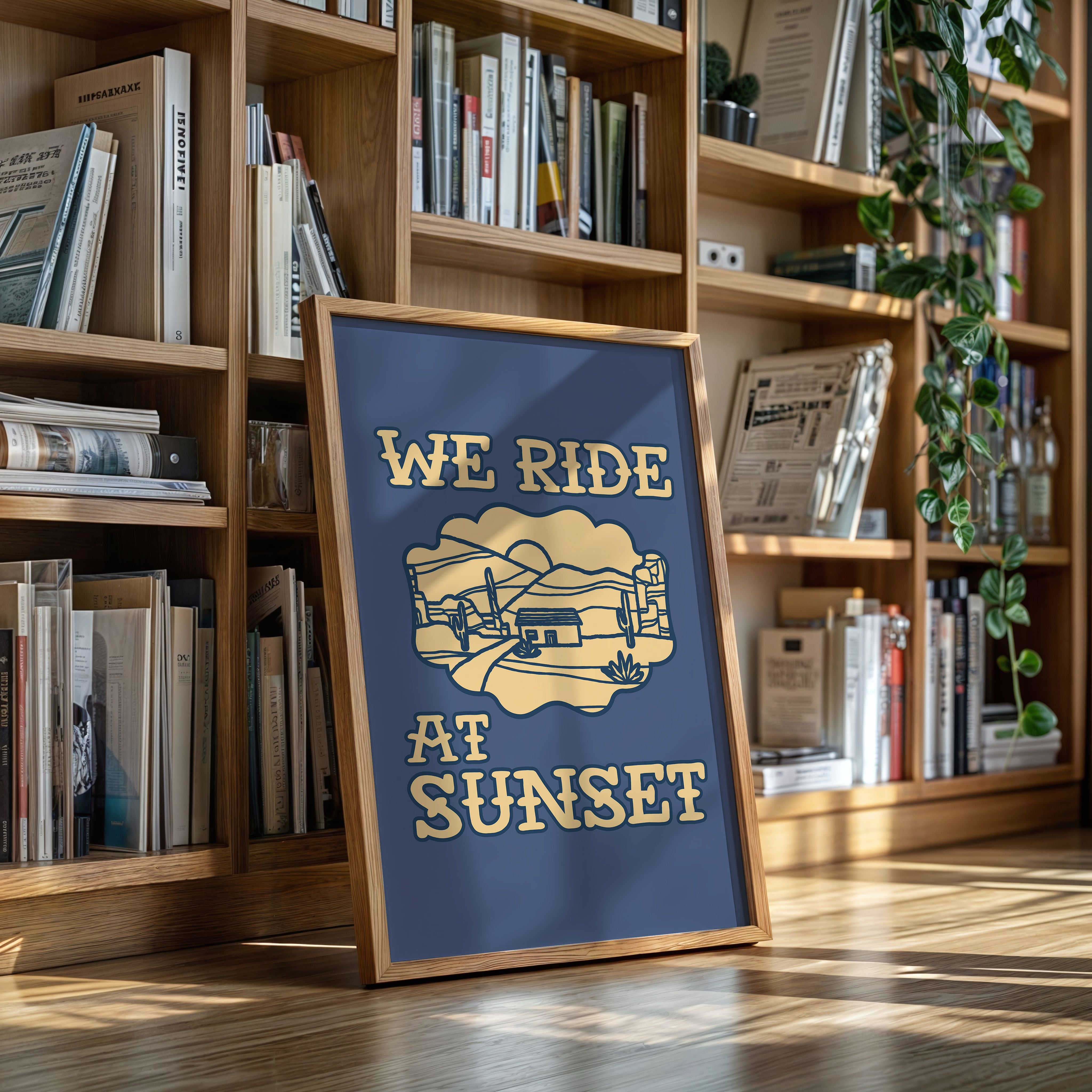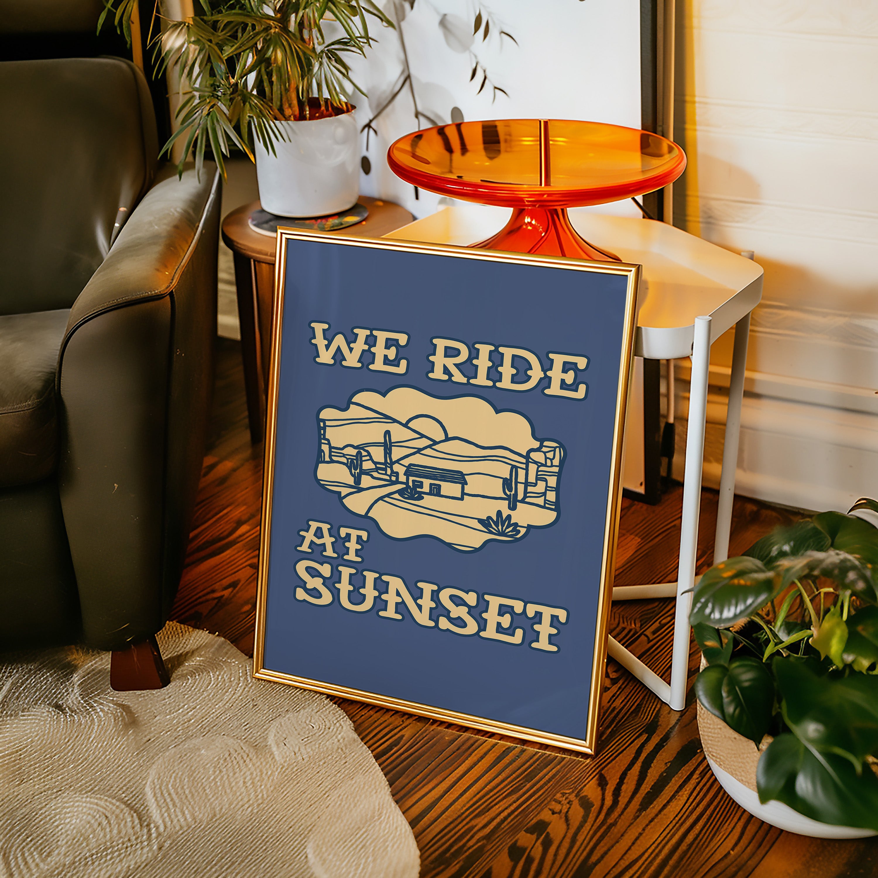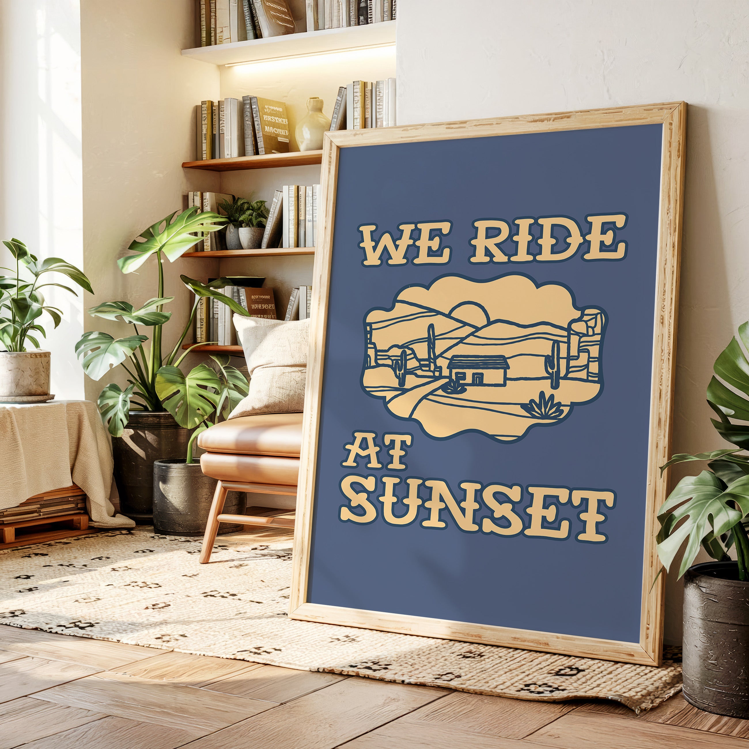 Dusty paths wind through golden sands, where cacti stand sentinel against a deepening sky. This contemporary southwestern piece captures the essence of desert living with its minimalist line art style. Rolling hills embrace a lone adobe dwelling, while saguaros dot the landscape like ancient storytellers sharing tales of the wild west. The warm cream tones against deep navy create a striking contrast that speaks to both modern design sensibilities and timeless desert narratives. Perfect for adding a touch of adventure to a home office or creating a focal point in a modern southwestern living space. Each viewing reveals new details in the peaceful desert scene, inviting moments of contemplation and wanderlust.