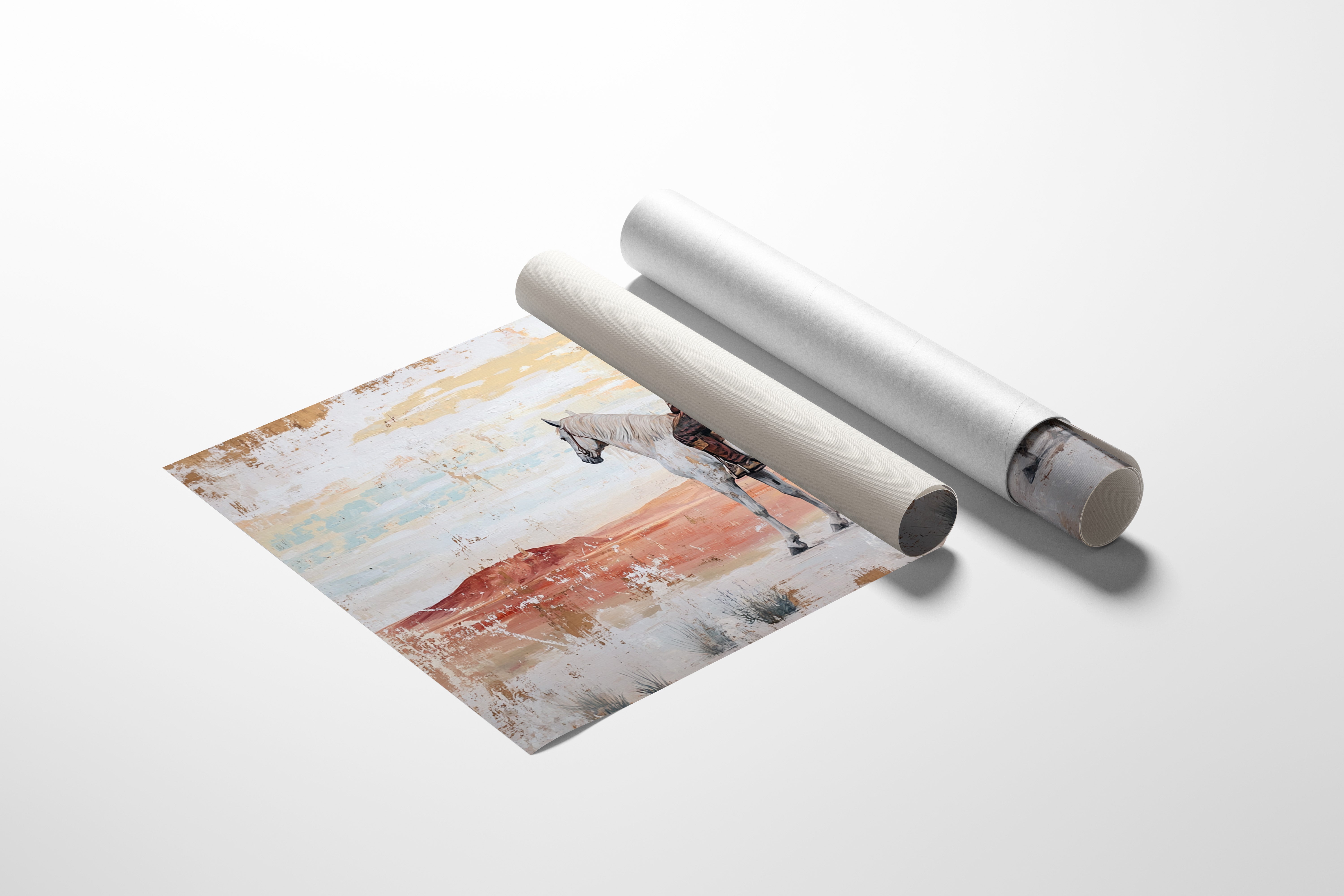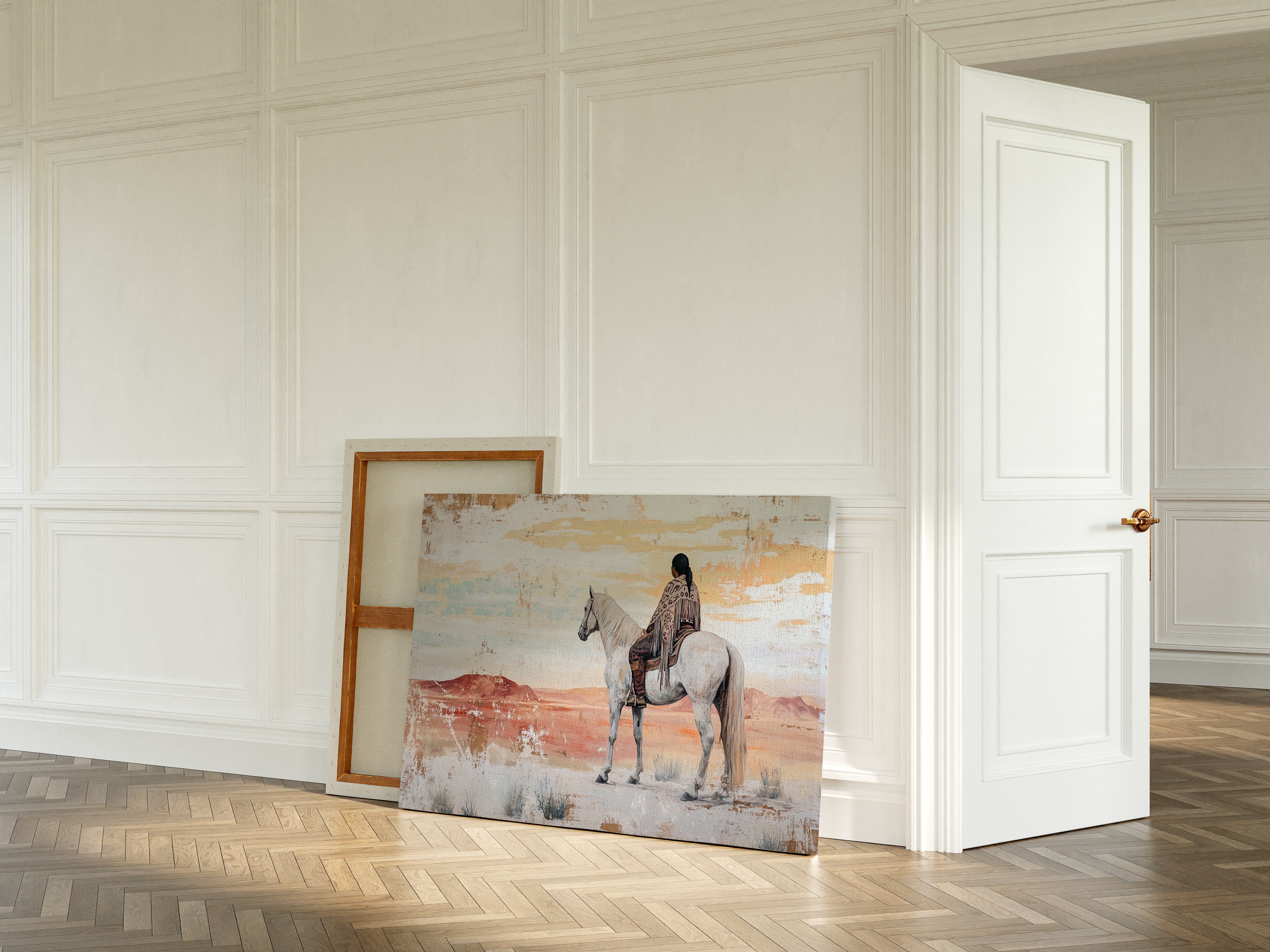 Wrapped in stillness and dawn light, a lone figure gazes across the painted desert from atop a pale horse. This textured western painting blends quiet power with weathered beauty.