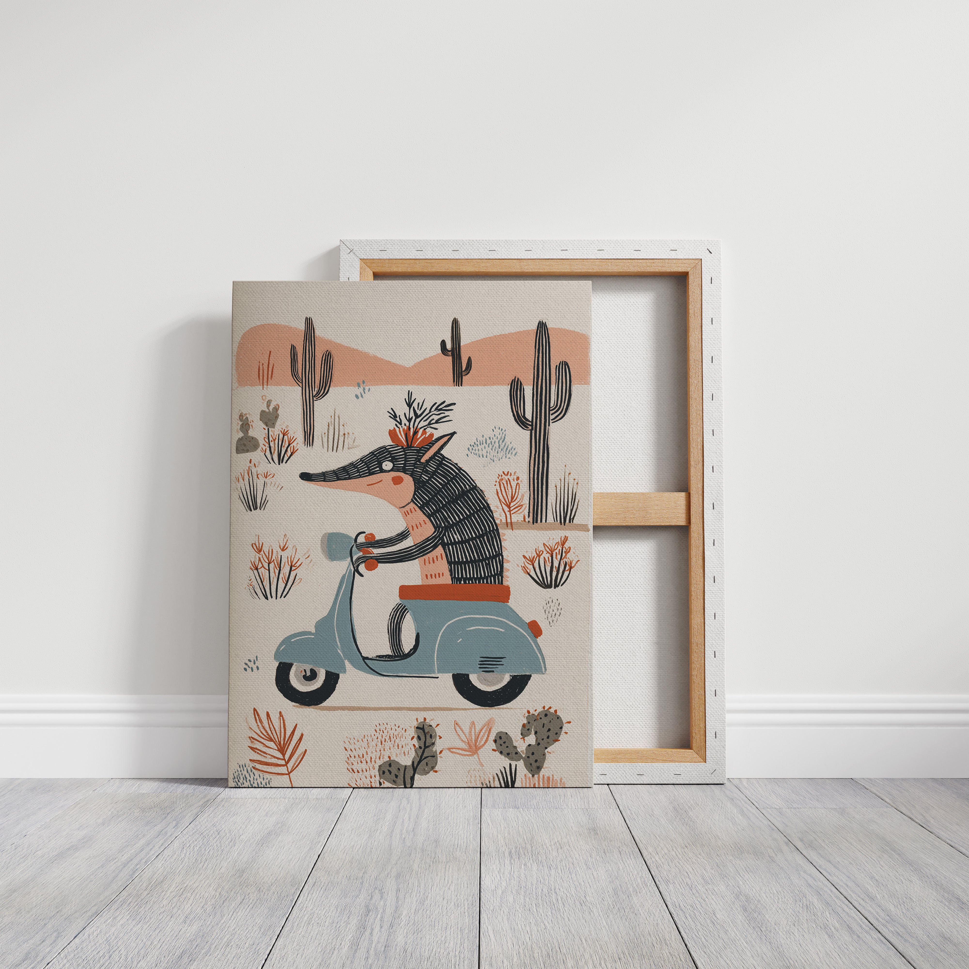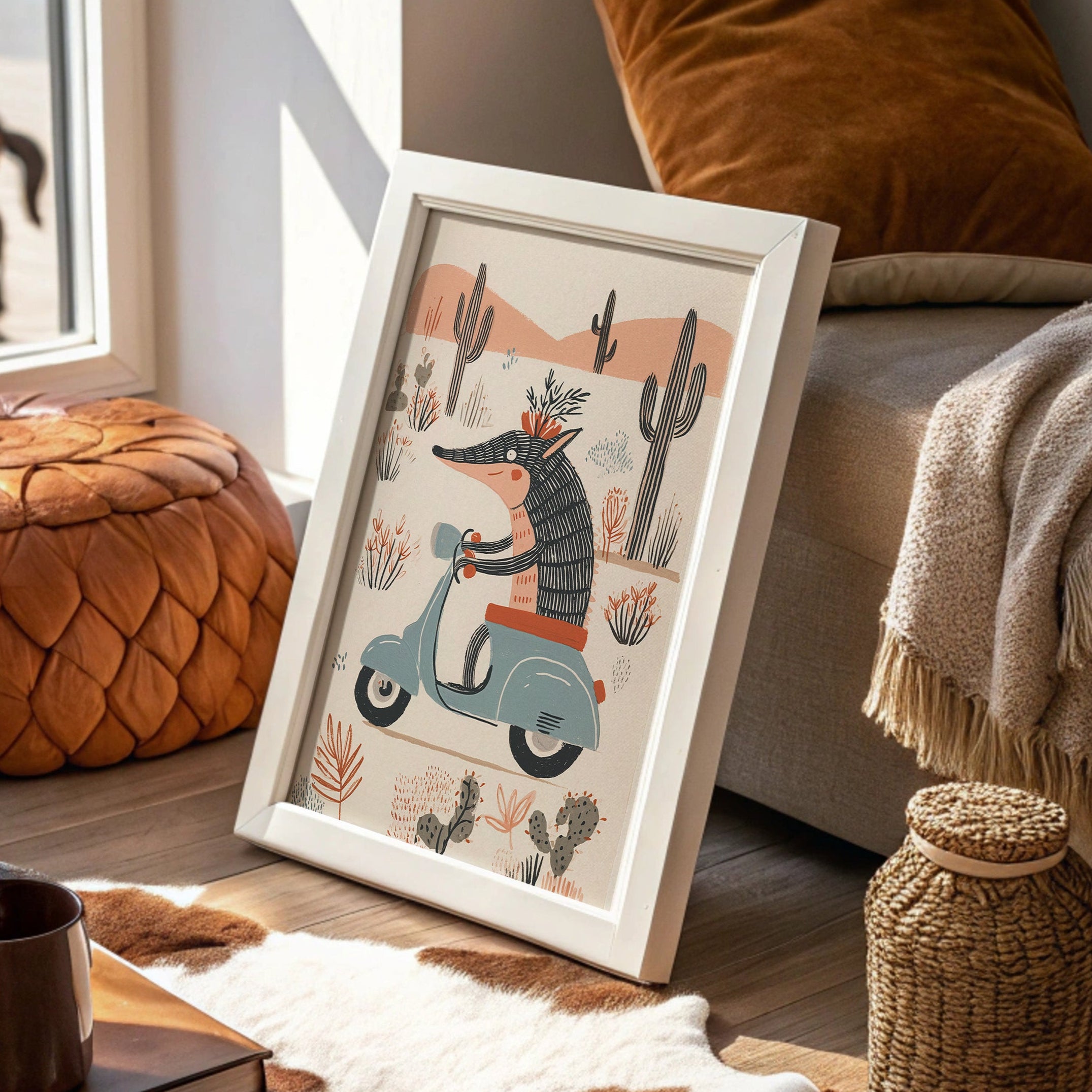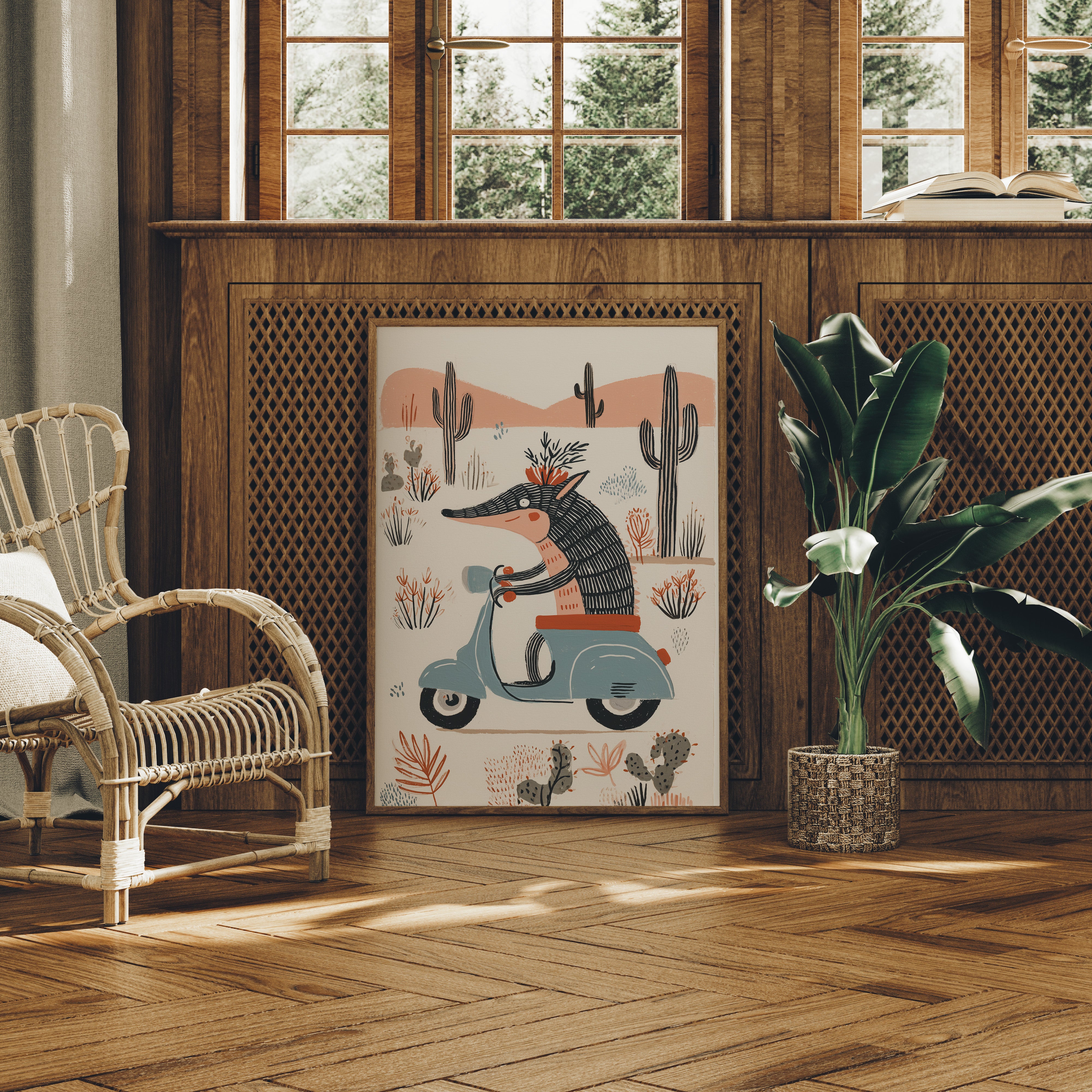 A whimsical scene unfolds as a charming wolf character cruises through a stylized desert landscape on a powder blue Vespa. The illustration captures a perfect blend of playful sophistication with its muted coral, grey, and blue palette against a gentle desert backdrop. Desert flora including towering saguaros and delicate brush create a harmonious composition while maintaining a contemporary aesthetic. This delightful piece brings character and warmth to modern interiors, perfect for a nursery, playroom, or any space needing a touch of southwestern charm.