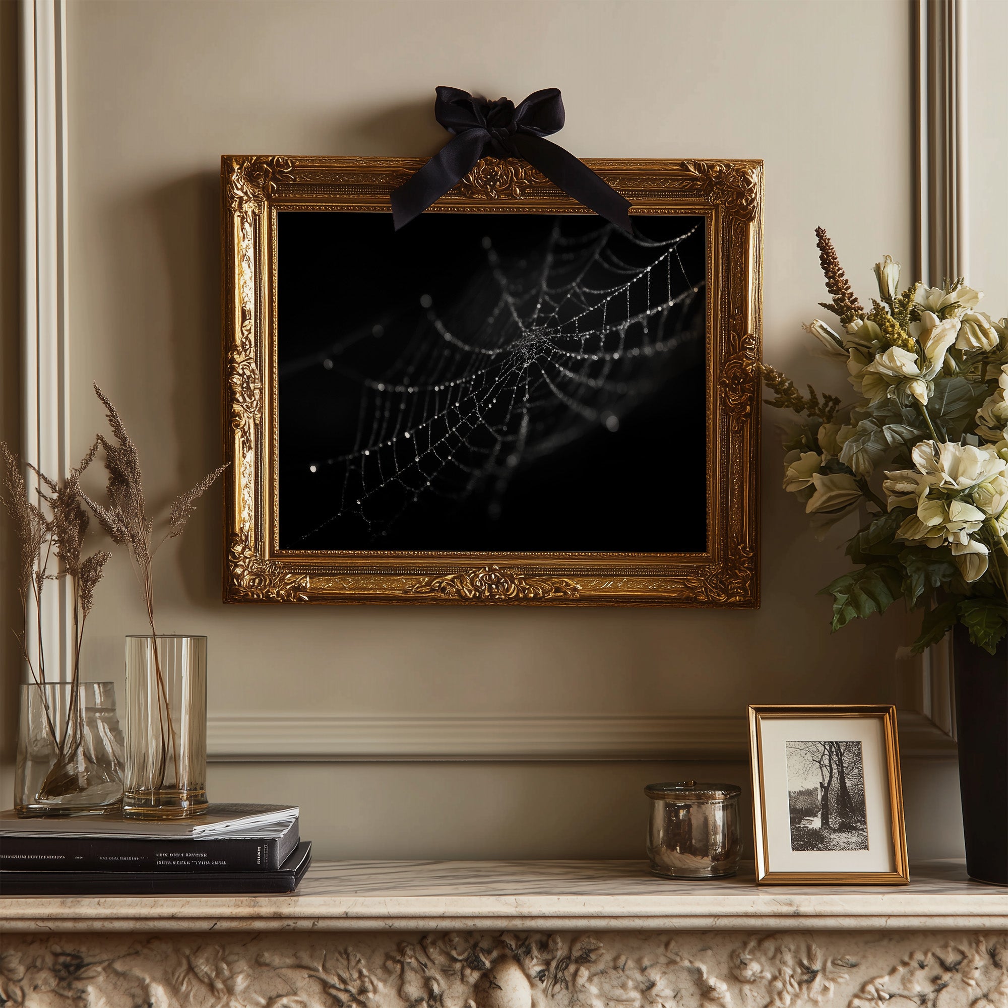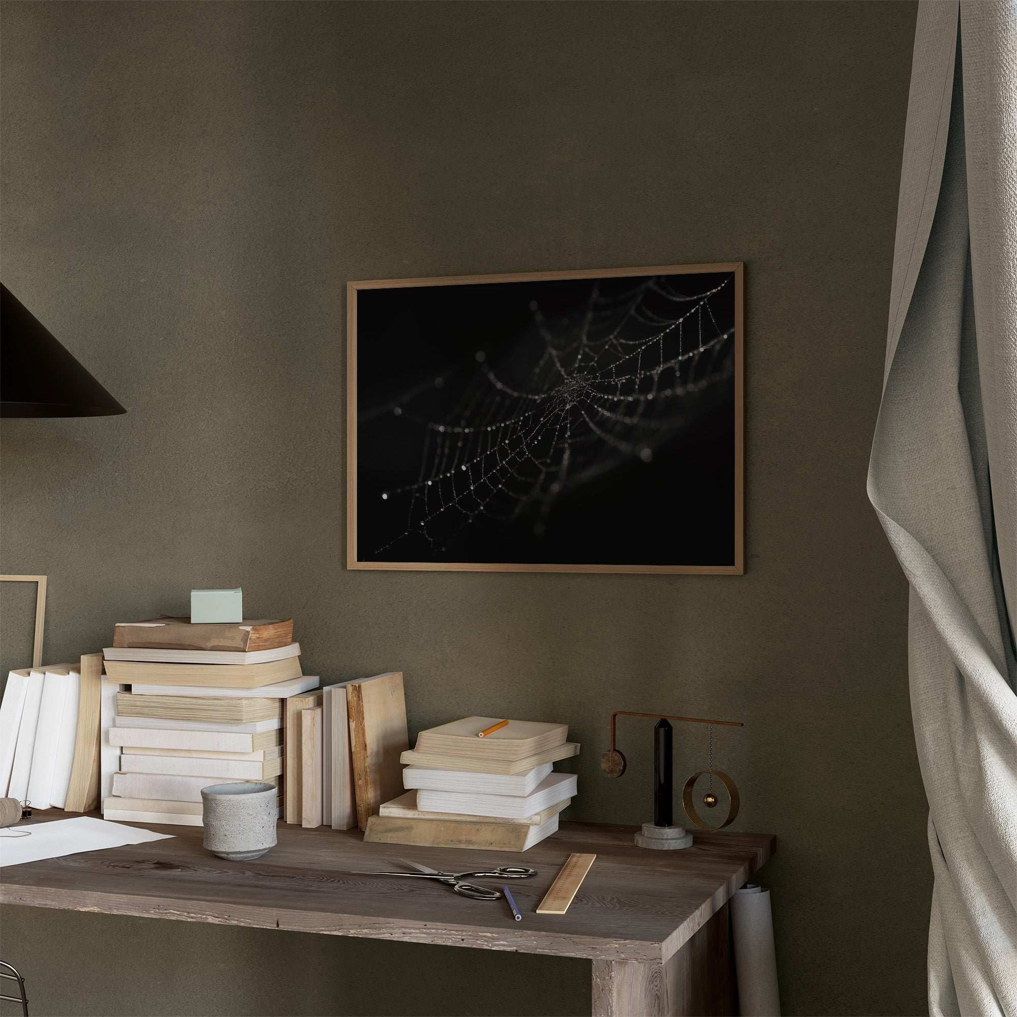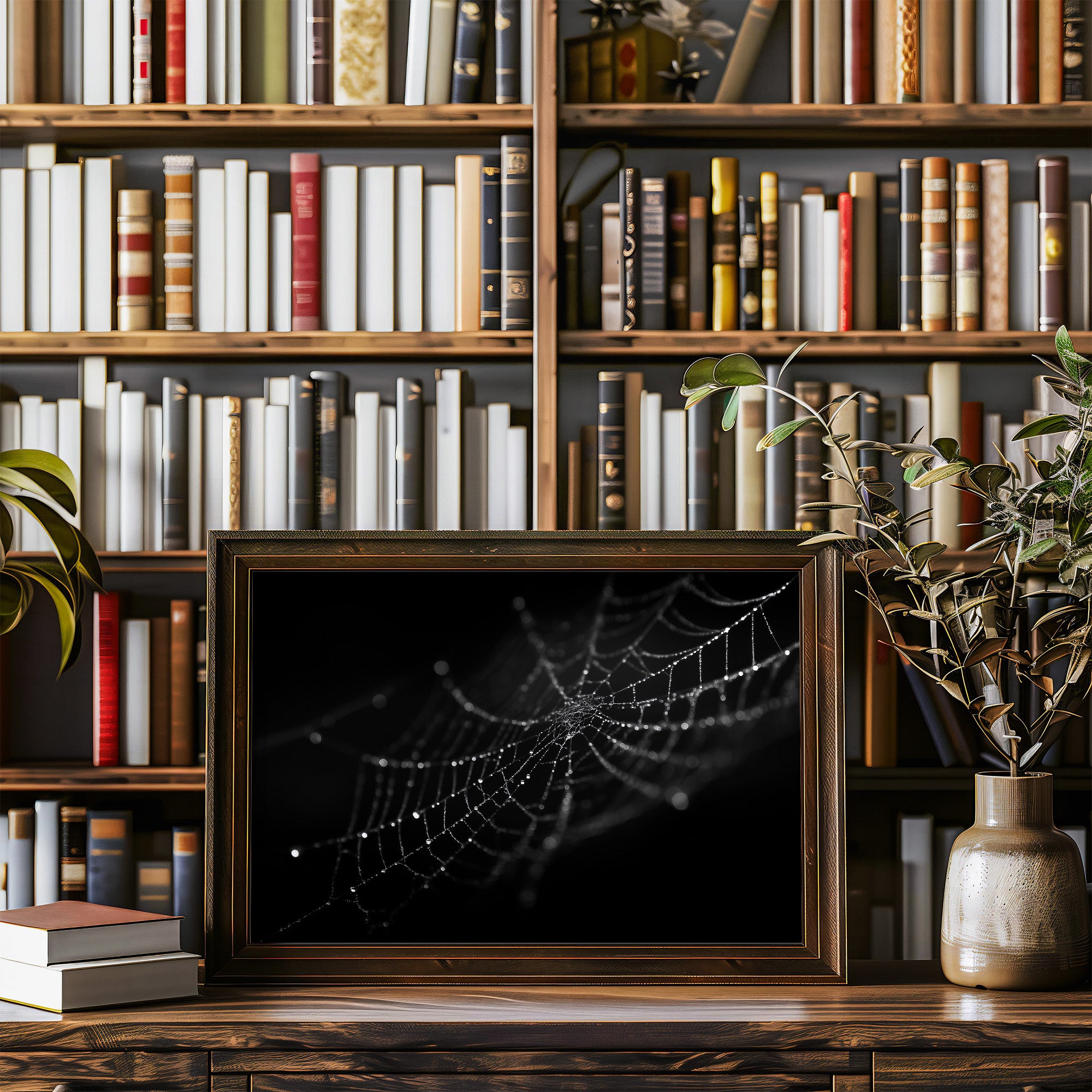 Droplets of morning light cling to an intricate web, suspended in darkness like stars in a miniature galaxy. The delicate silk architecture glistens with moisture, each intersection a perfect bead of light against the deep black backdrop. This contemplative piece brings the often-overlooked beauty of nature's geometry into focus, framed elegantly against a scholarly backdrop of well-loved books and quiet greenery.