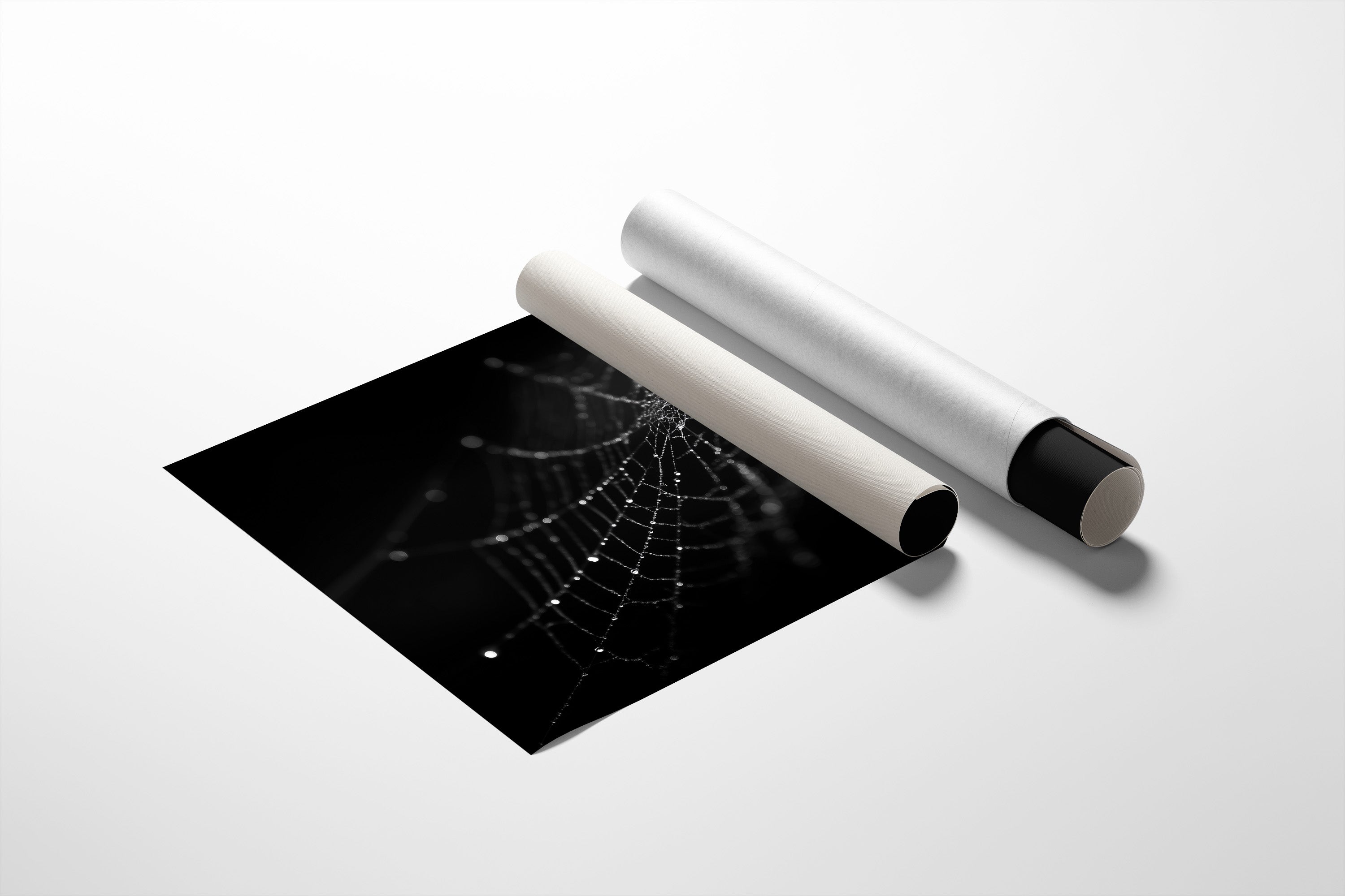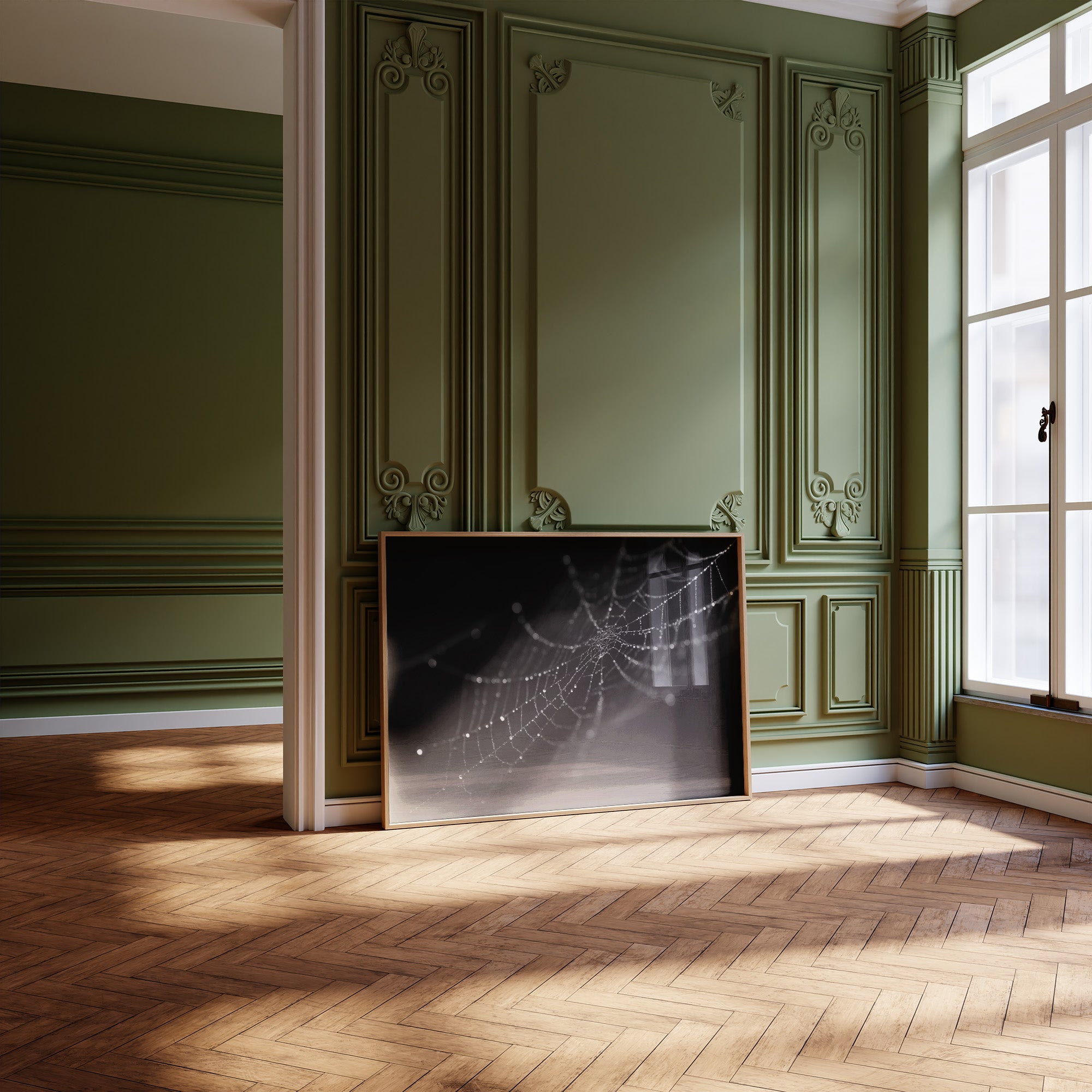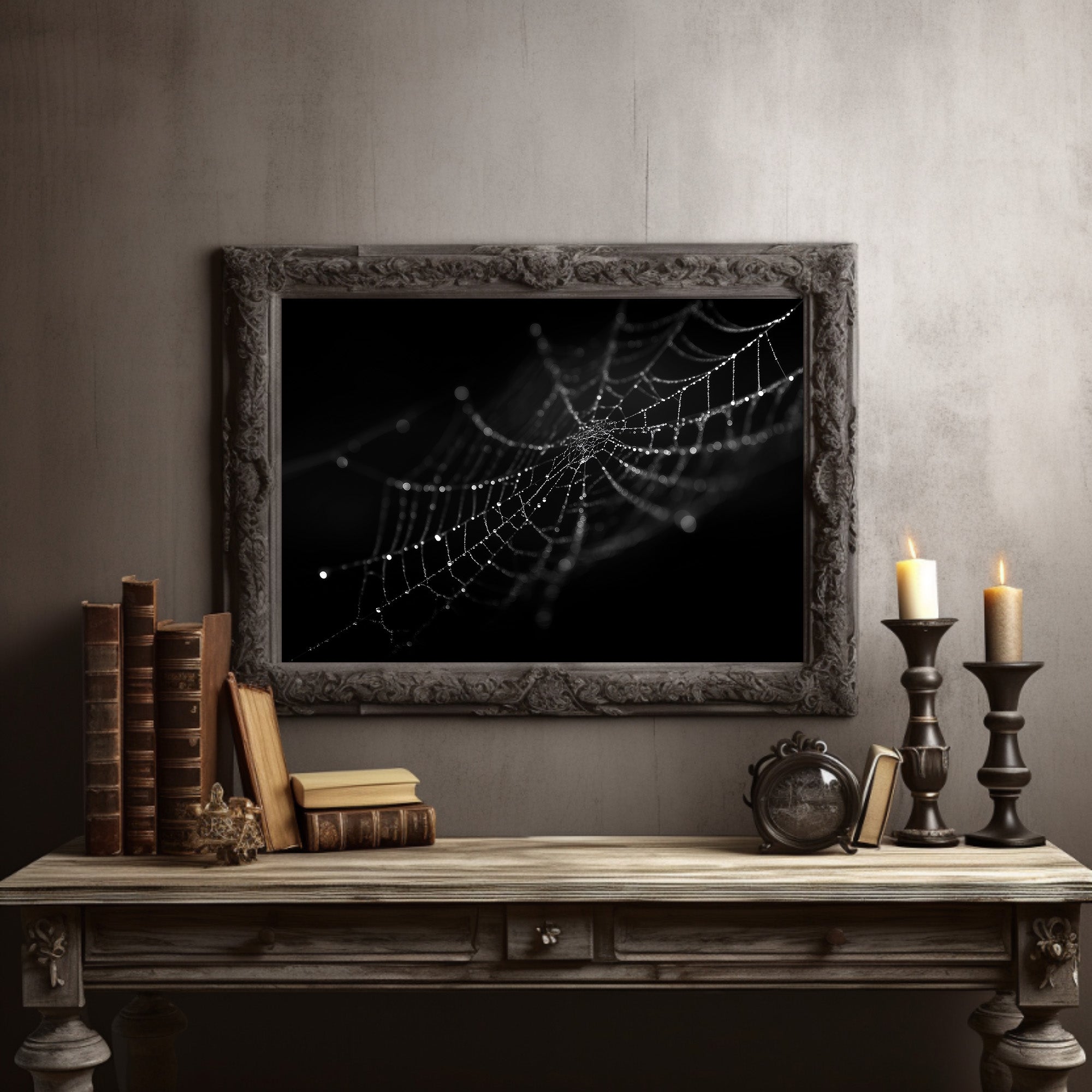 Droplets of morning light cling to an intricate web, suspended in darkness like stars in a miniature galaxy. The delicate silk architecture glistens with moisture, each intersection a perfect bead of light against the deep black backdrop. This contemplative piece brings the often-overlooked beauty of nature's geometry into focus, framed elegantly against a scholarly backdrop of well-loved books and quiet greenery.