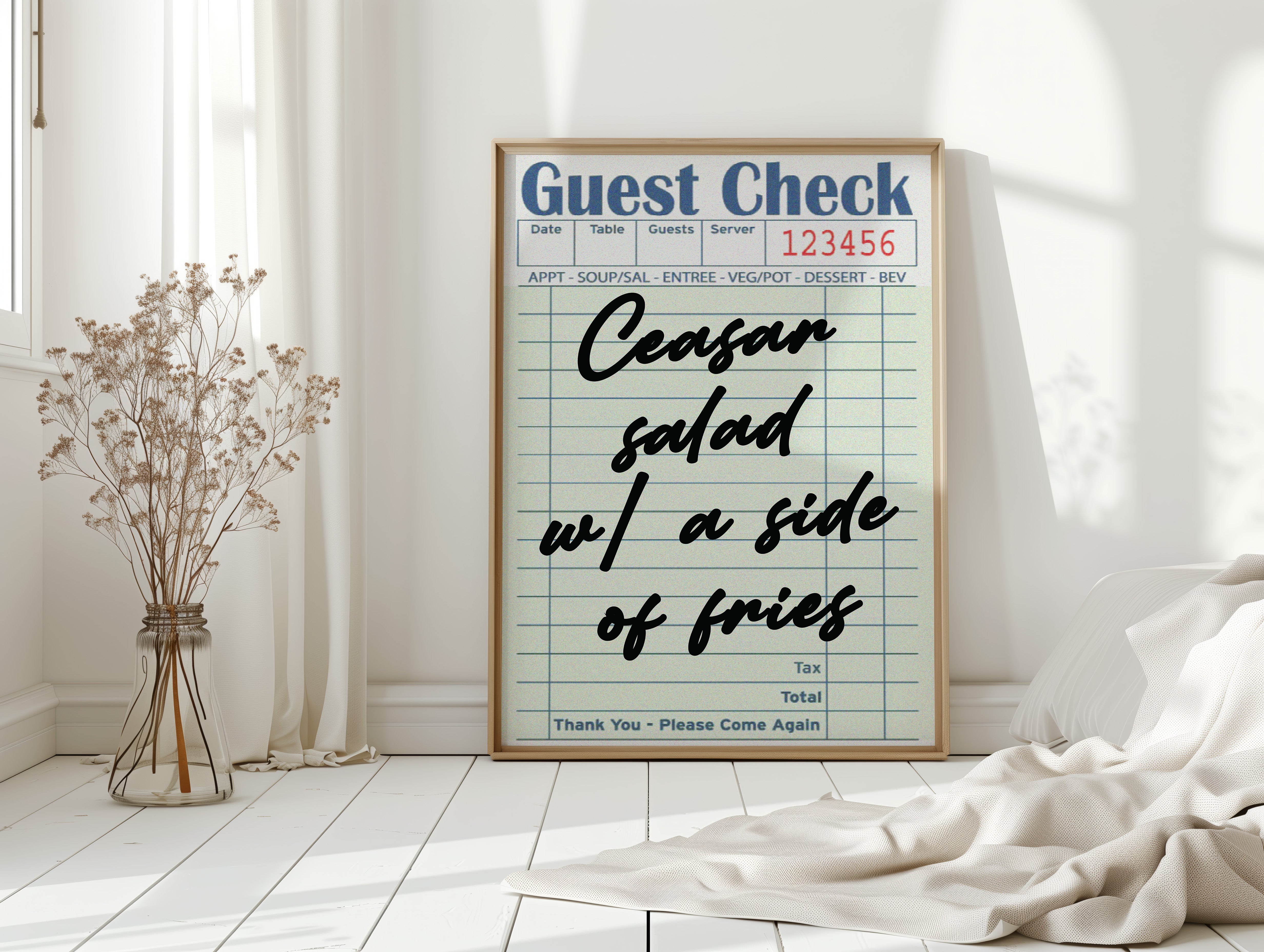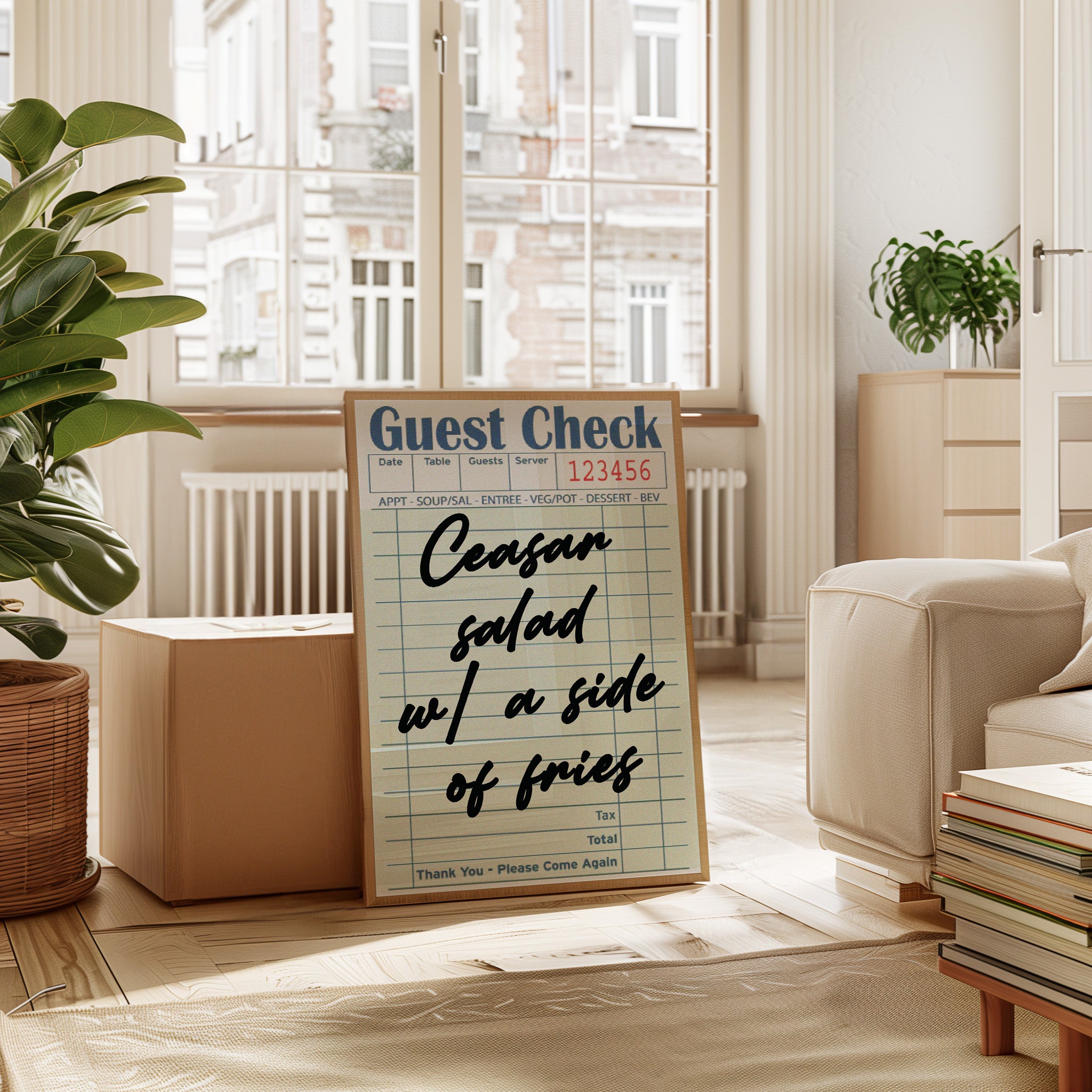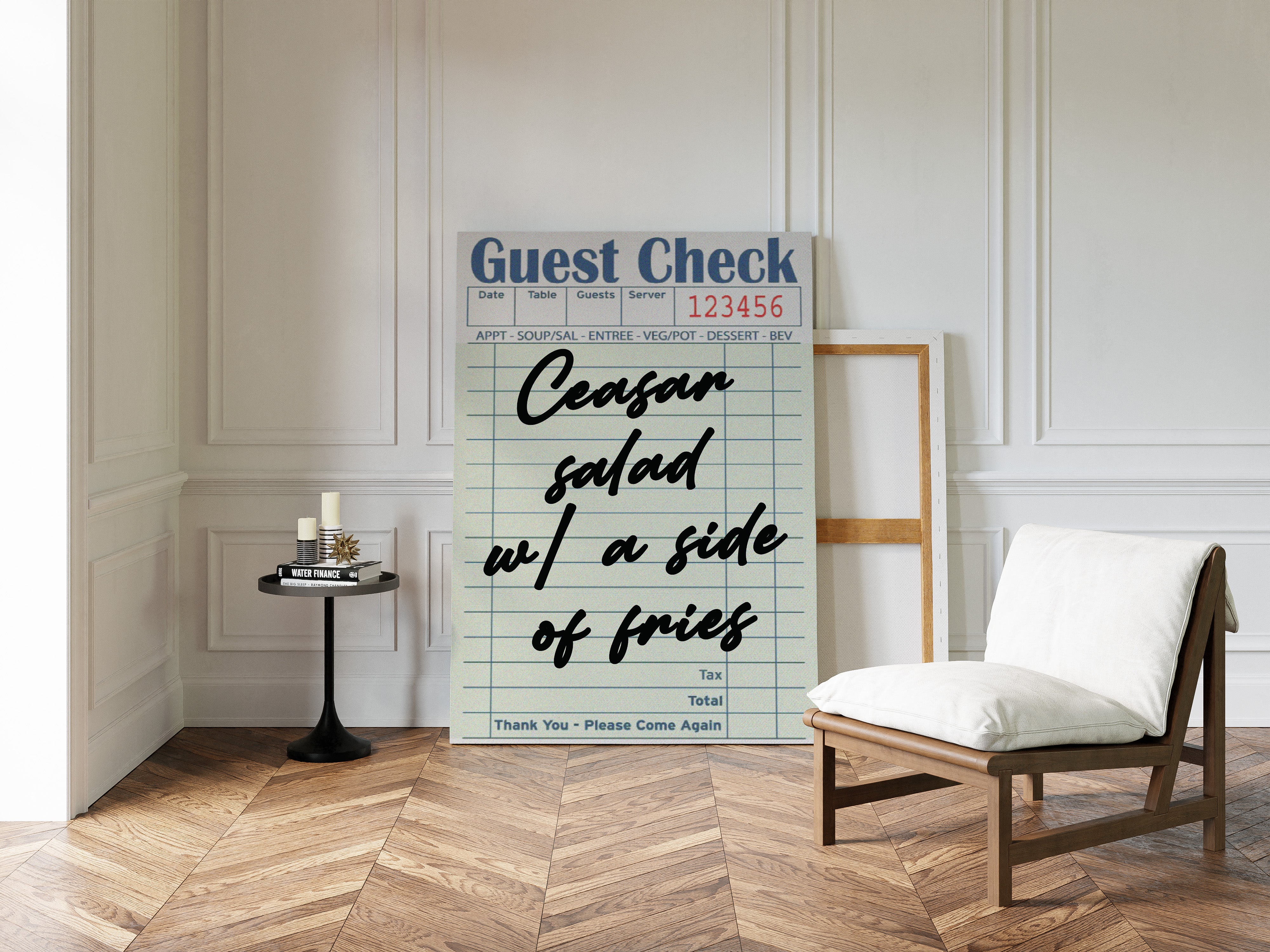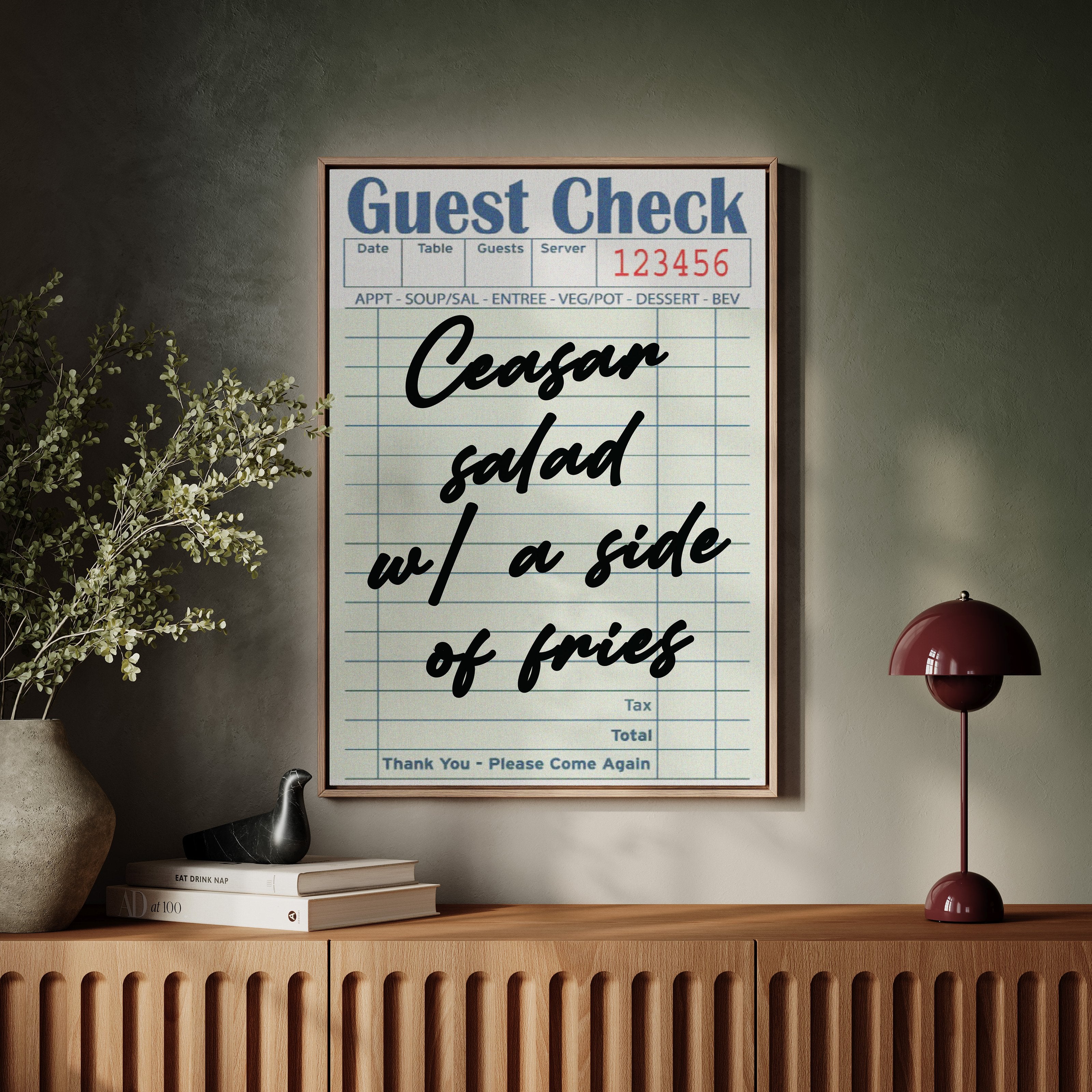 Sunlight streams across a vintage guest check, casting long shadows that dance with handwritten cursive on mint-green paper. This piece from our Contemporary Typography collection transforms everyday restaurant ephemera into striking modern art. Bold black script contrasts against the delicate lined paper, while the golden frame and classic guest check header create a nostalgic narrative about casual dining culture. The composition speaks to shared meals and simple pleasures, elevated through clean design and thoughtful presentation. Perfect for adding personality to a dining room, kitchen, or restaurant-inspired space, this piece celebrates the beauty found in life's casual moments.